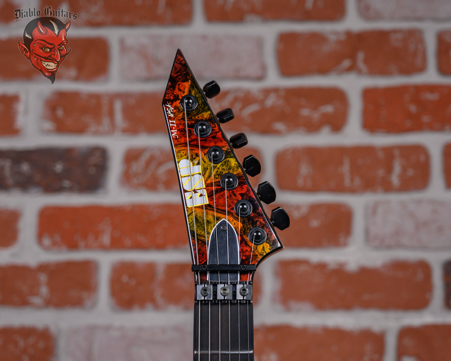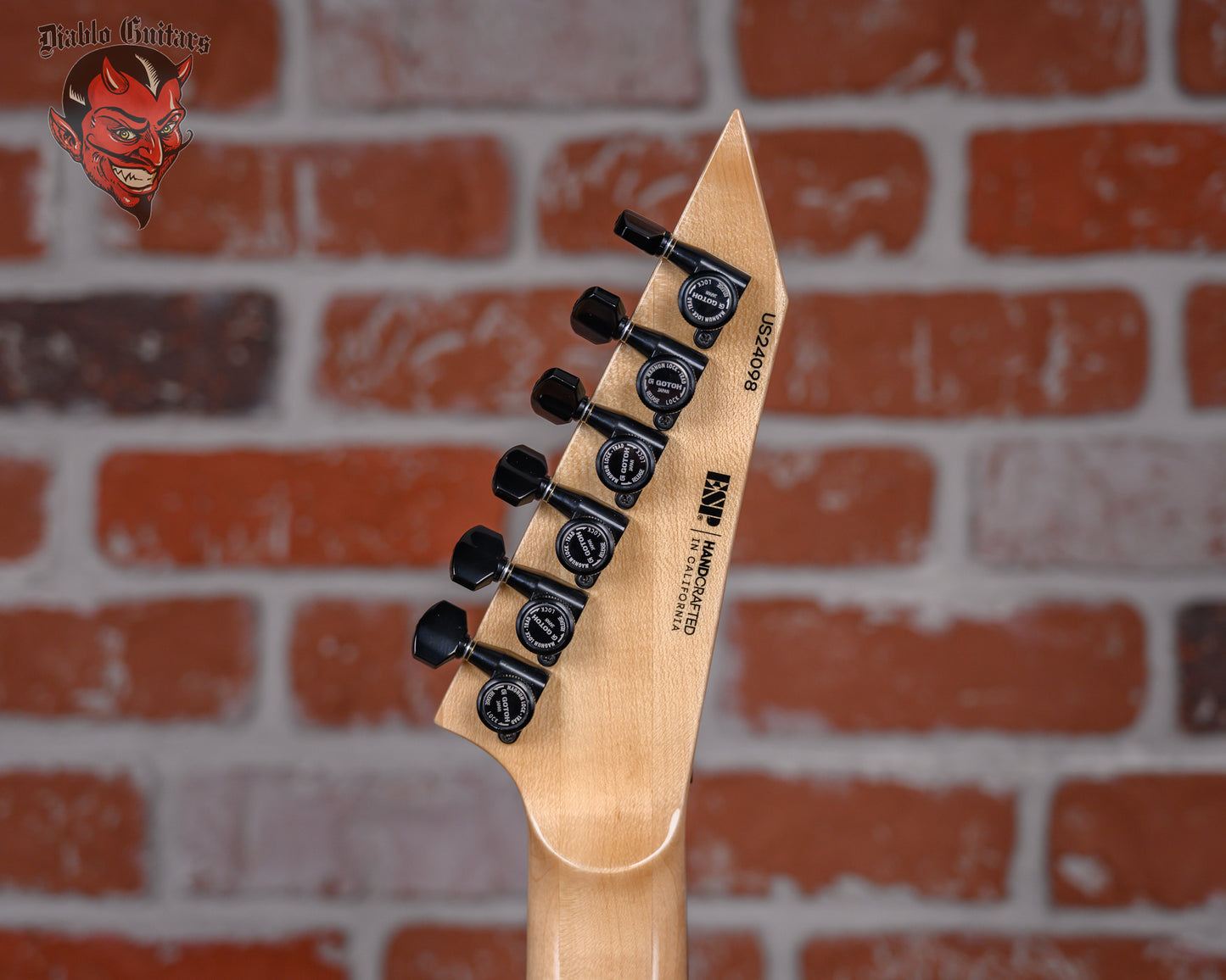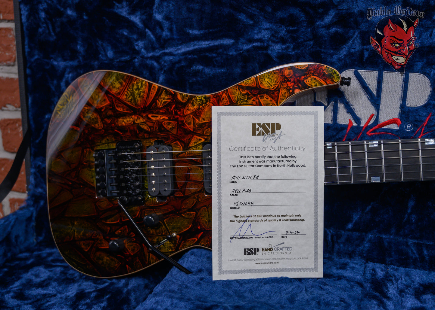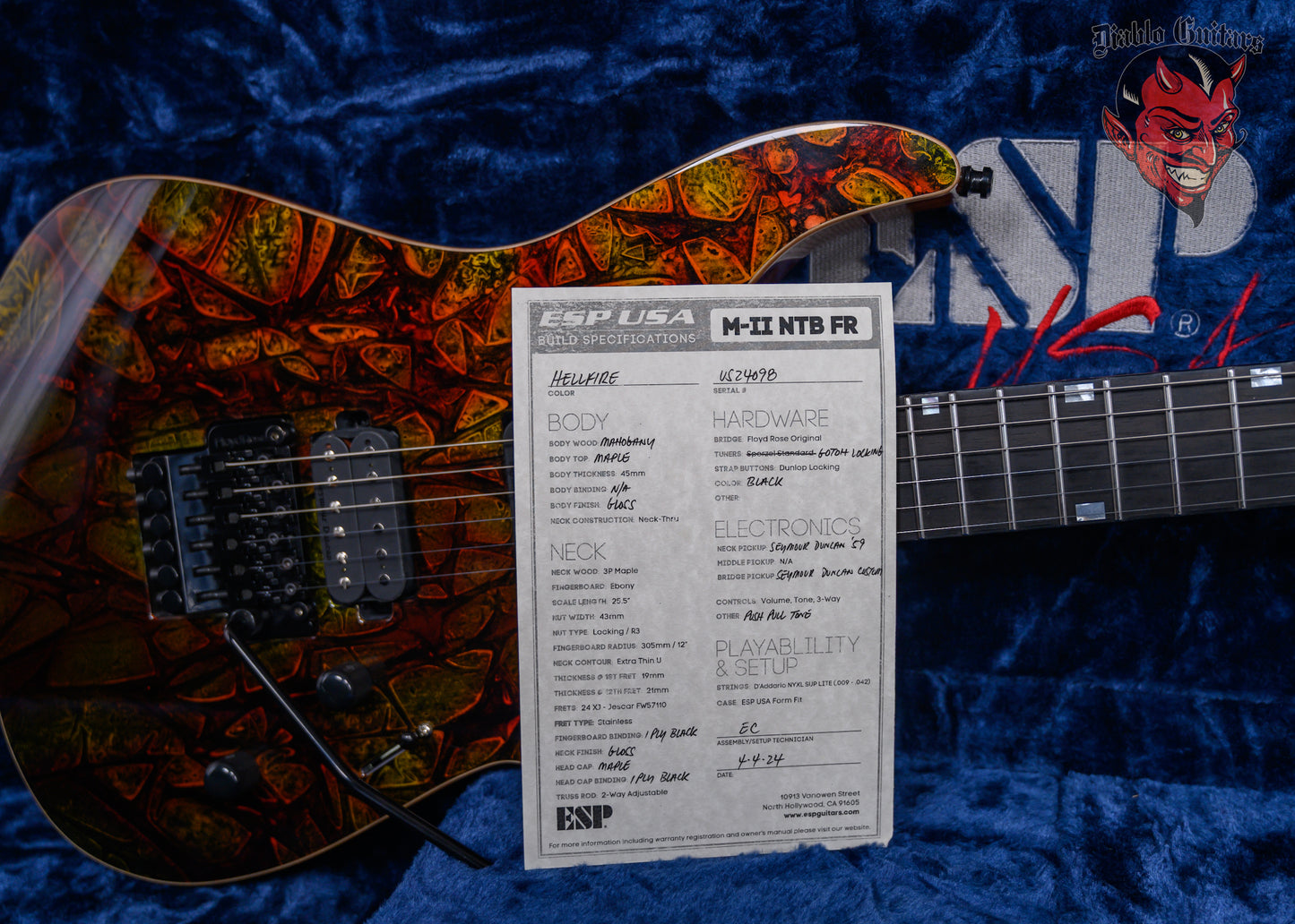 ESP USA Custom Shop M-II NTB FR in Hellfire finish made in 2024 with Original Hard Shell Case. This guitar features a solid mahogany body with a maple top, 3-Piece maple neck-thru and bound ebony fingerboard with a reverse, bound & color matched headstock. Equipped with a Seymour Duncan SH-1 '59 Model in the neck position and a Seymour Duncan Custom in the bridge position. Controlled by 1 volume, 1 tone pot with push/pull coil tap and a 3-Way blade switch. The 25.5" scale length neck has mother of pearl offset block inlays and white side markers with 24 extra jumbo stainless steel frets on a 305mm radius with a extra thin U profile. The hardware is comprised of black Gotoh Magnum Lock-Trad tuning machines with cloche heads, a Floyd Rose Locking nut, a Floyd Rose Original Double Locking Tremolo bridge and black knurled dome knobs.