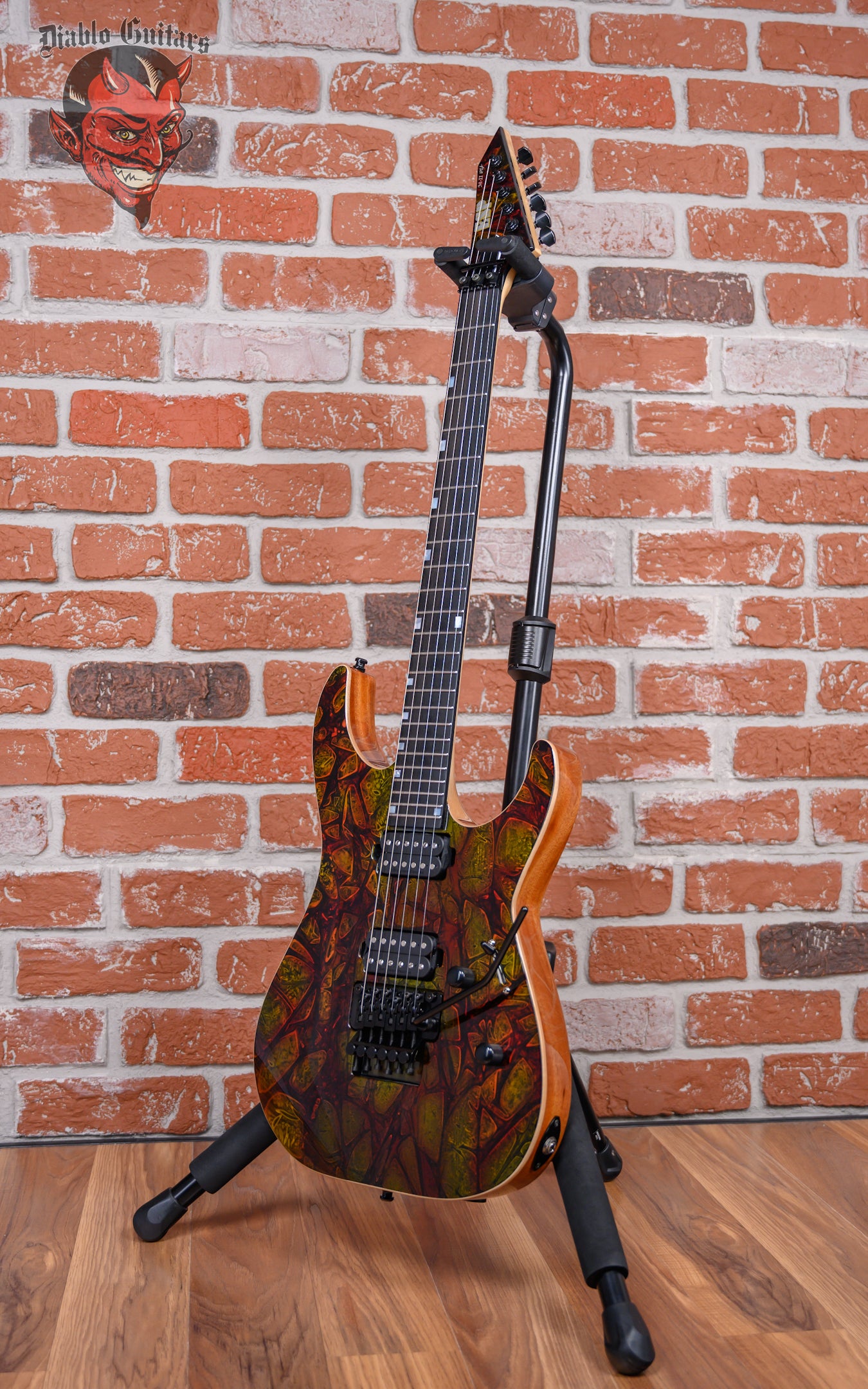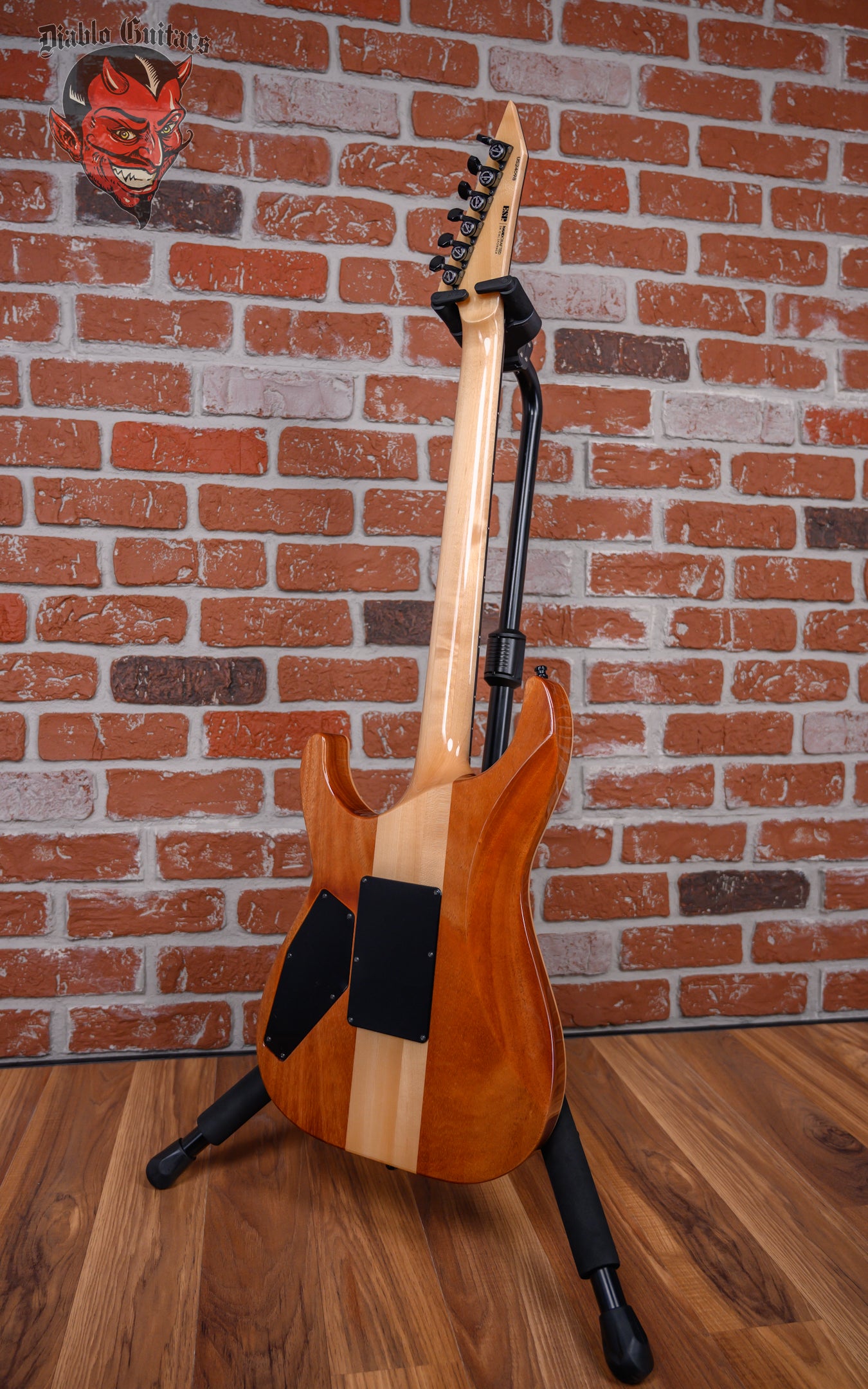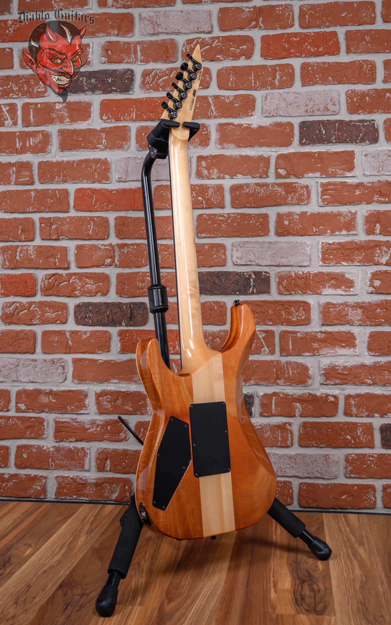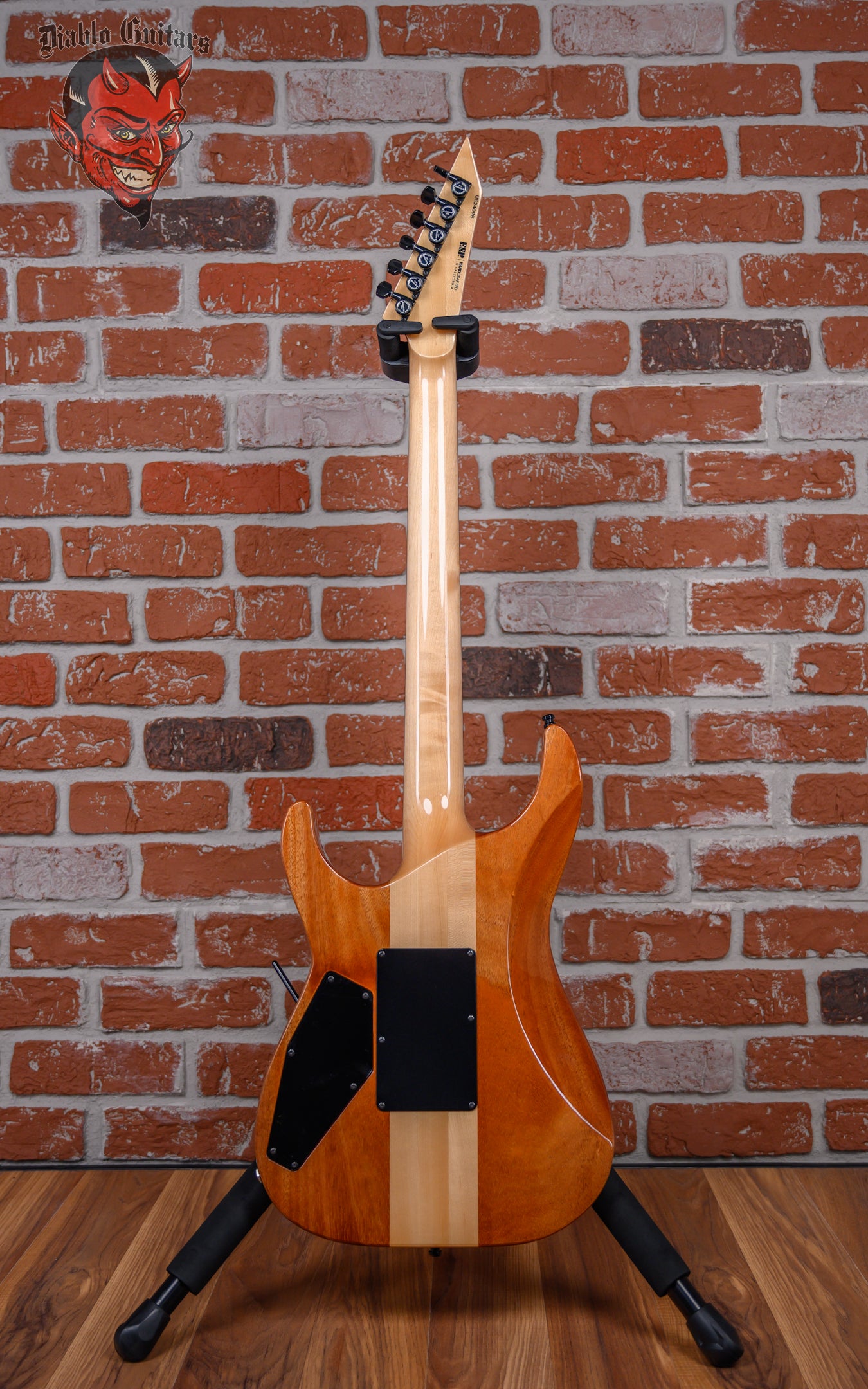 ESP USA Custom Shop M-II NTB FR in Hellfire finish made in 2024 with Original Hard Shell Case. This guitar features a solid mahogany body with a maple top, 3-Piece maple neck-thru and bound ebony fingerboard with a reverse, bound & color matched headstock. Equipped with a Seymour Duncan SH-1 '59 Model in the neck position and a Seymour Duncan Custom in the bridge position. Controlled by 1 volume, 1 tone pot with push/pull coil tap and a 3-Way blade switch. The 25.5" scale length neck has mother of pearl offset block inlays and white side markers with 24 extra jumbo stainless steel frets on a 305mm radius with a extra thin U profile. The hardware is comprised of black Gotoh Magnum Lock-Trad tuning machines with cloche heads, a Floyd Rose Locking nut, a Floyd Rose Original Double Locking Tremolo bridge and black knurled dome knobs.