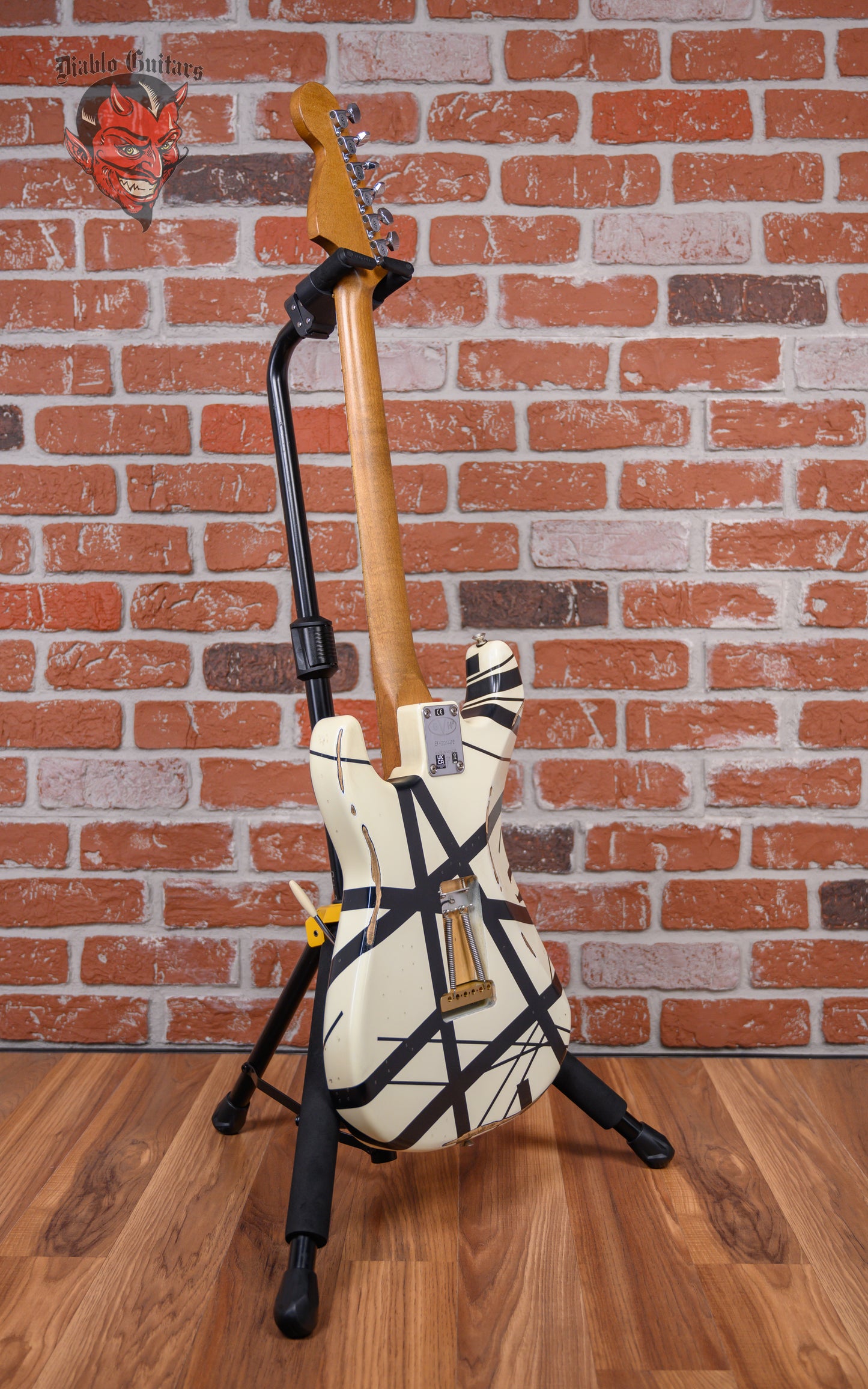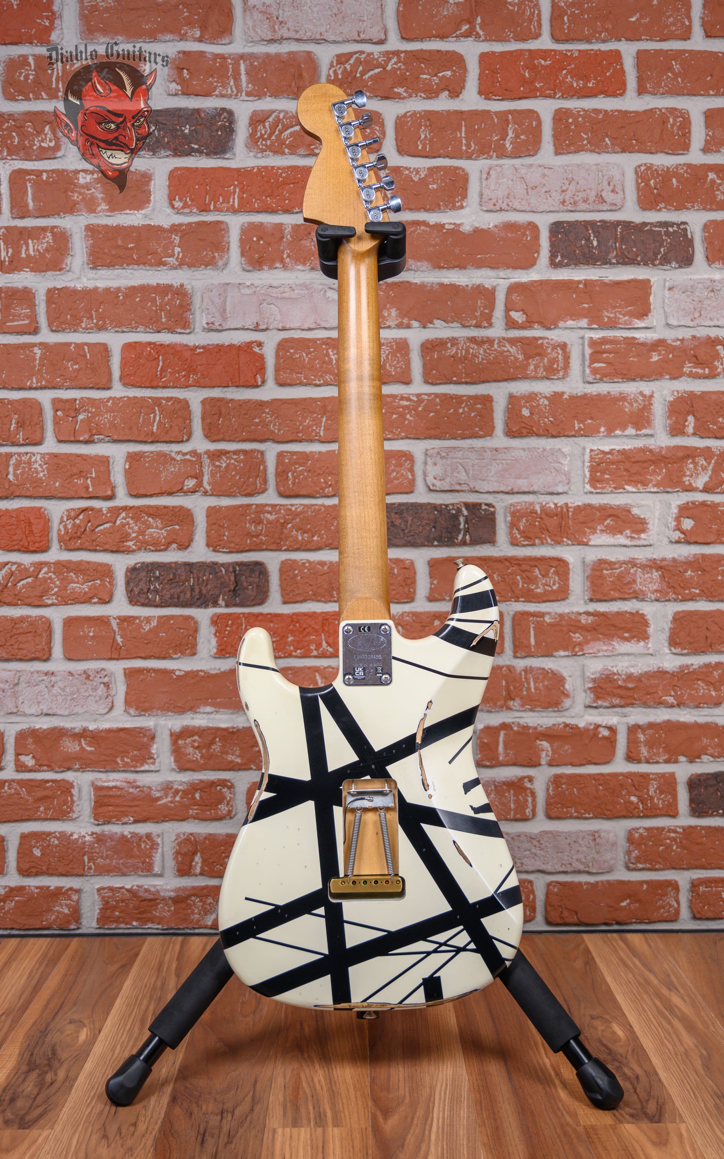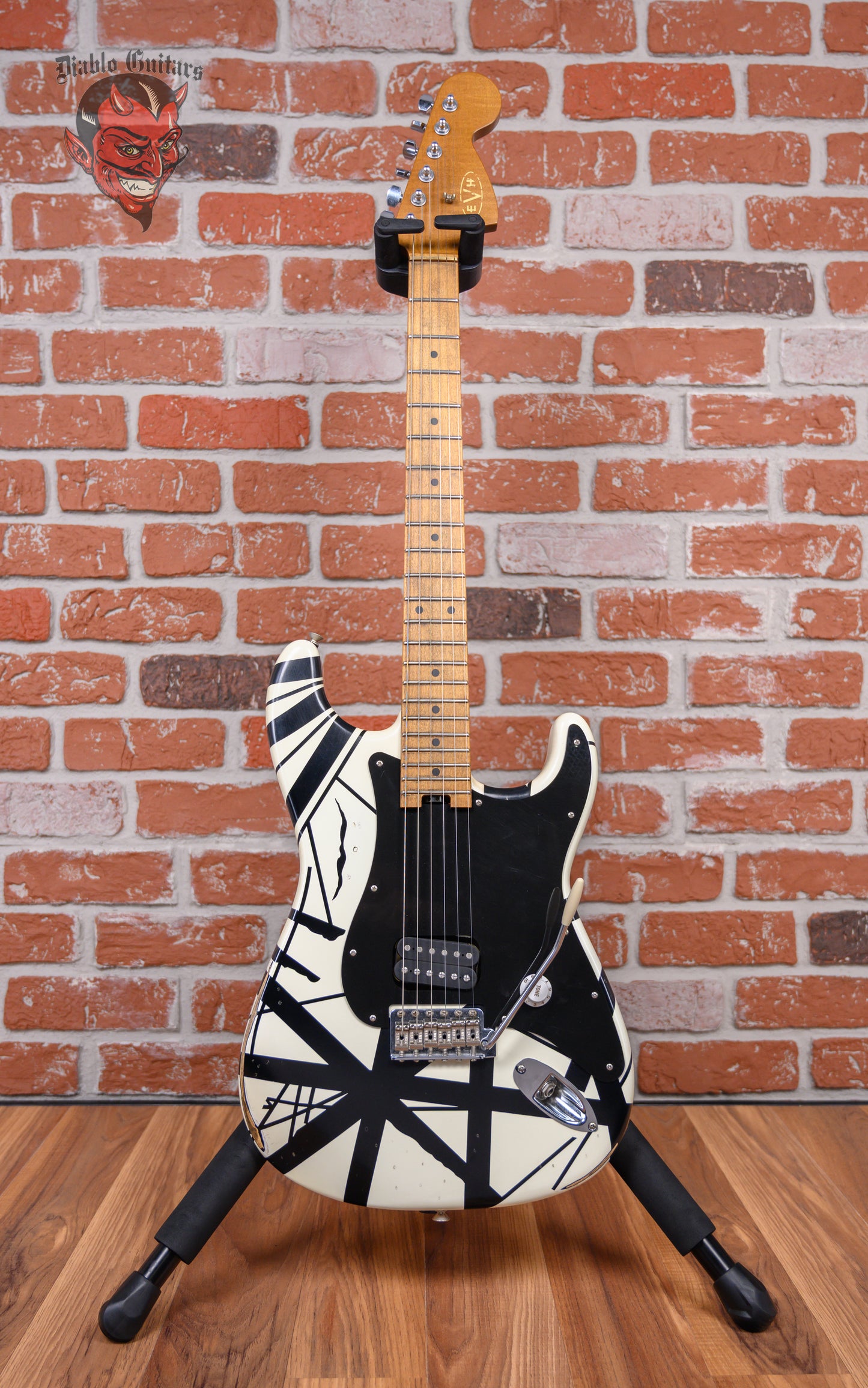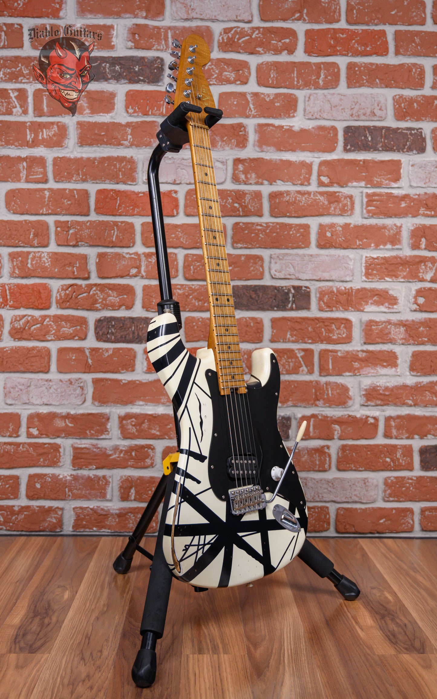EVH Striped Series '78 Eruption in White with Black Stripes Relic finish made in 2023 with Original Gigbag. This guitar features a solid basswood body, maple neck and maple fingerboard with a large '70s-Style Licensed Fender Strat headstock. Equipped with an EVH Wolfgang Humbucking pickup in the bridge position. Controlled by one master volume labeled "Tone" comprised of a 500K EVH Bourns Low Friction pot w/ Treble Bleed Circuit. The 25.5" scale length neck has black dot inlays and black side markers with 22 jumbo frets on a compound 12"-16" radius with a EVH Modified "C" Backshape profile. The hardware is comprised of chrome EVH-branded Gotoh sealed die-cast tuning machines with cloche heads, a brass nut, a Fender 6-Saddle Vintage Stratocaster Synchronized Tremolo bridge and white top hat knobs with a single ply black pickguard.