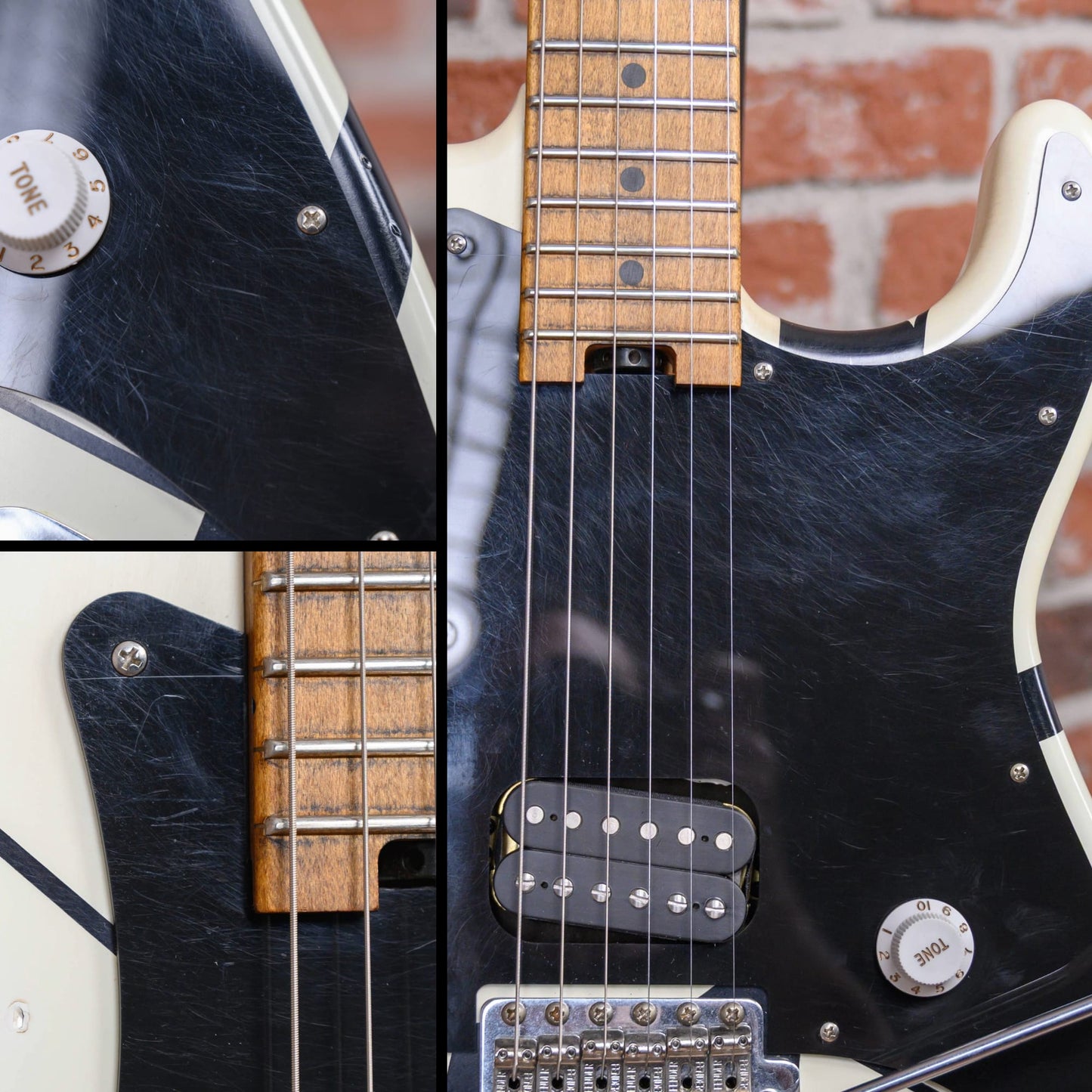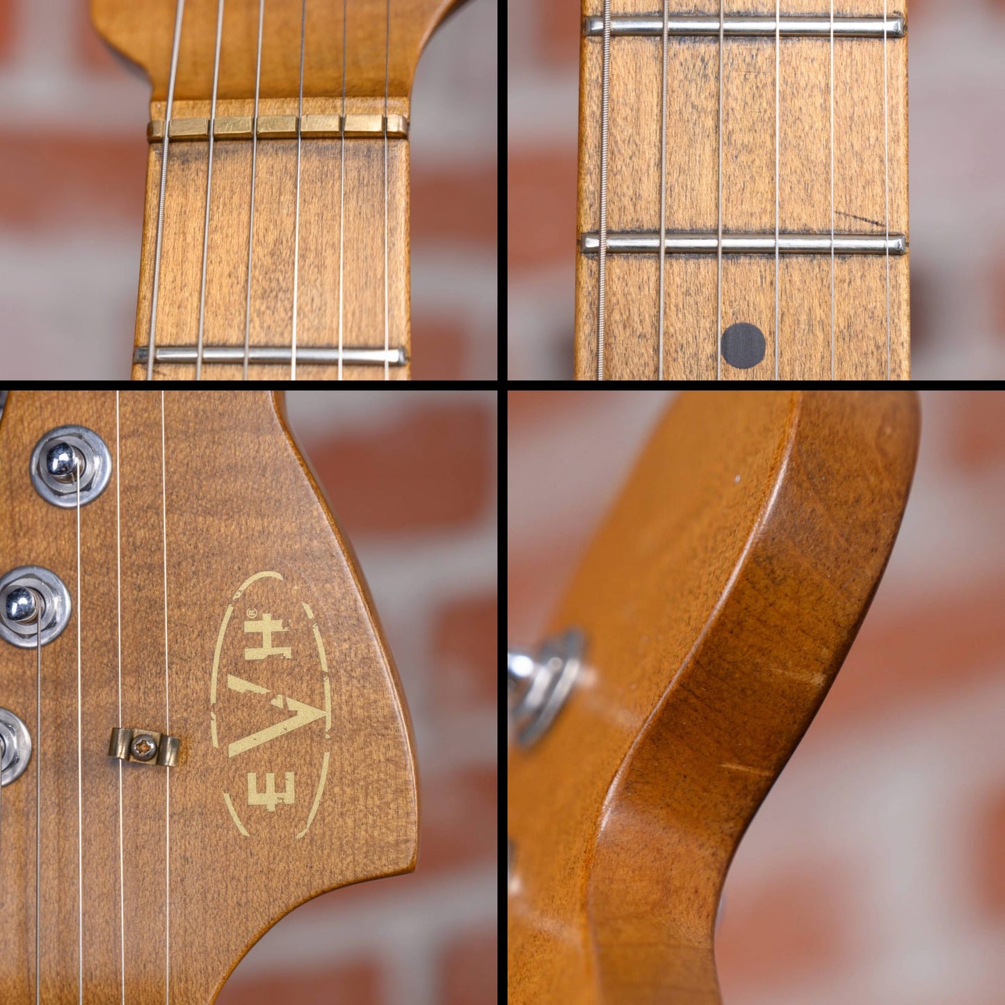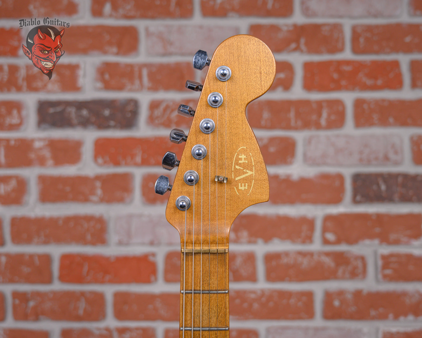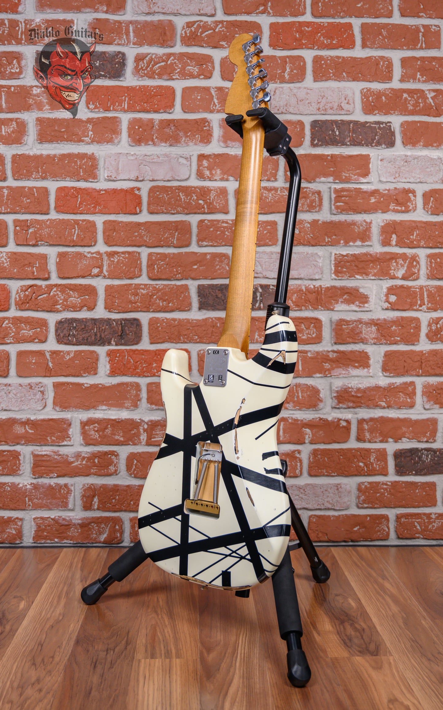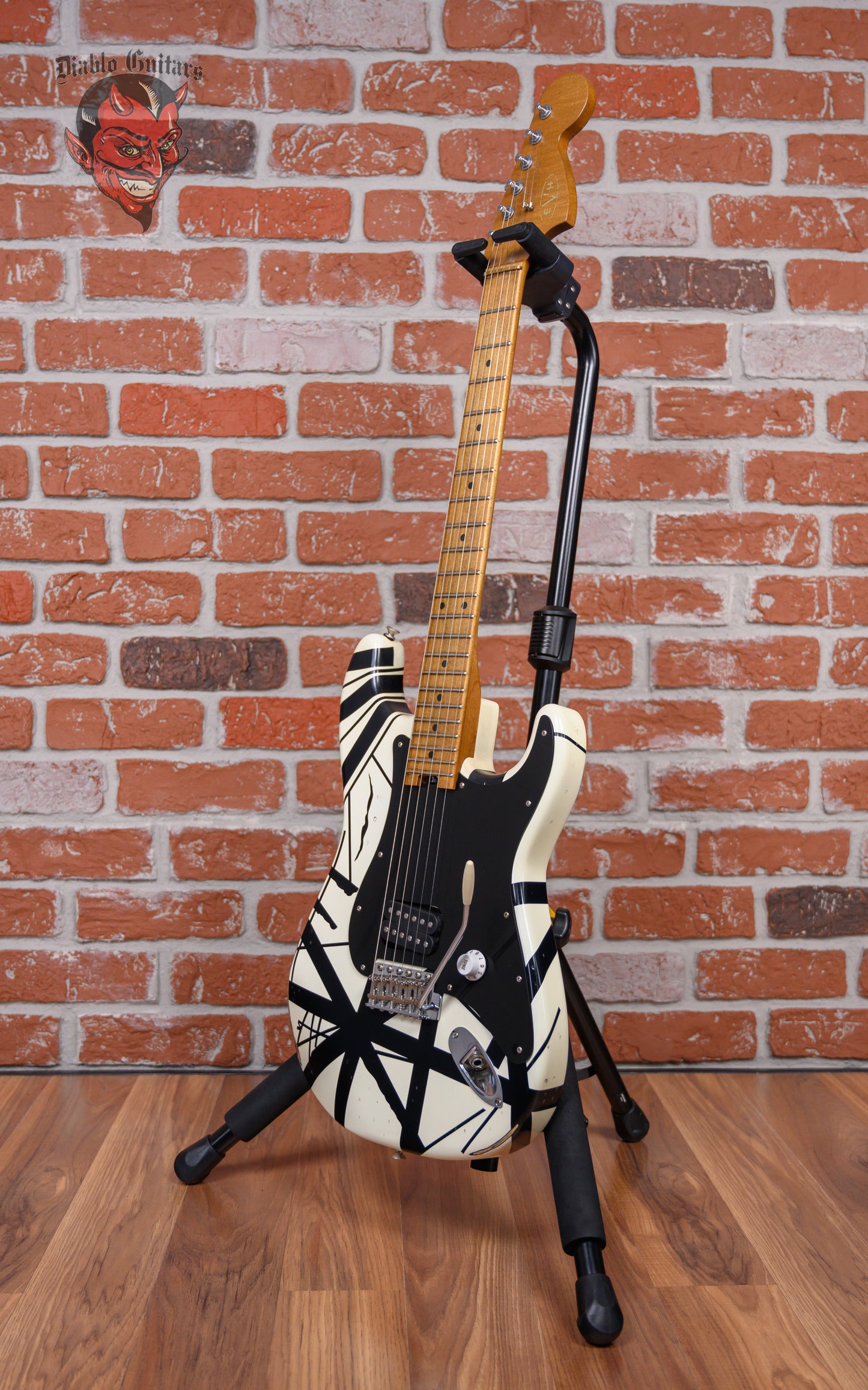 EVH Striped Series '78 Eruption in White with Black Stripes Relic finish made in 2023 with Original Gigbag. This guitar features a solid basswood body, maple neck and maple fingerboard with a large '70s-Style Licensed Fender Strat headstock. Equipped with an EVH Wolfgang Humbucking pickup in the bridge position. Controlled by one master volume labeled "Tone" comprised of a 500K EVH Bourns Low Friction pot w/ Treble Bleed Circuit. The 25.5" scale length neck has black dot inlays and black side markers with 22 jumbo frets on a compound 12"-16" radius with a EVH Modified "C" Backshape profile. The hardware is comprised of chrome EVH-branded Gotoh sealed die-cast tuning machines with cloche heads, a brass nut, a Fender 6-Saddle Vintage Stratocaster Synchronized Tremolo bridge and white top hat knobs with a single ply black pickguard.