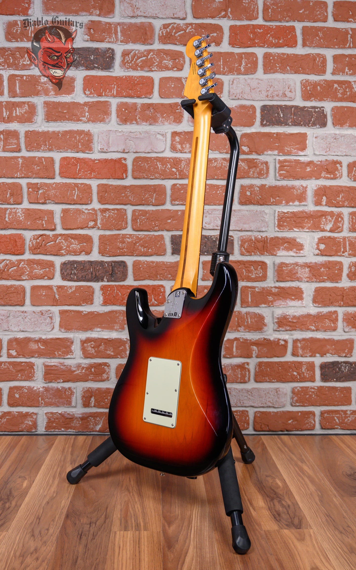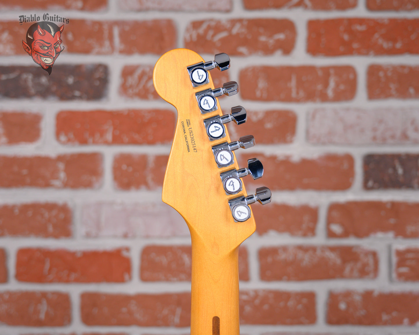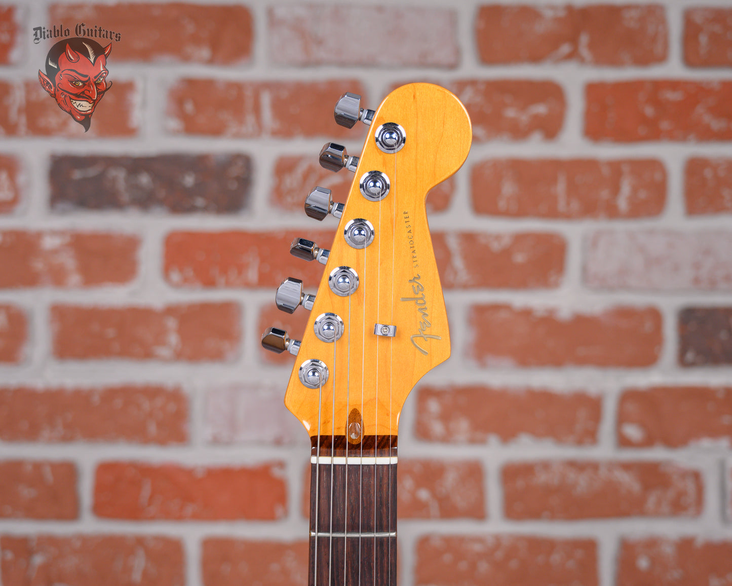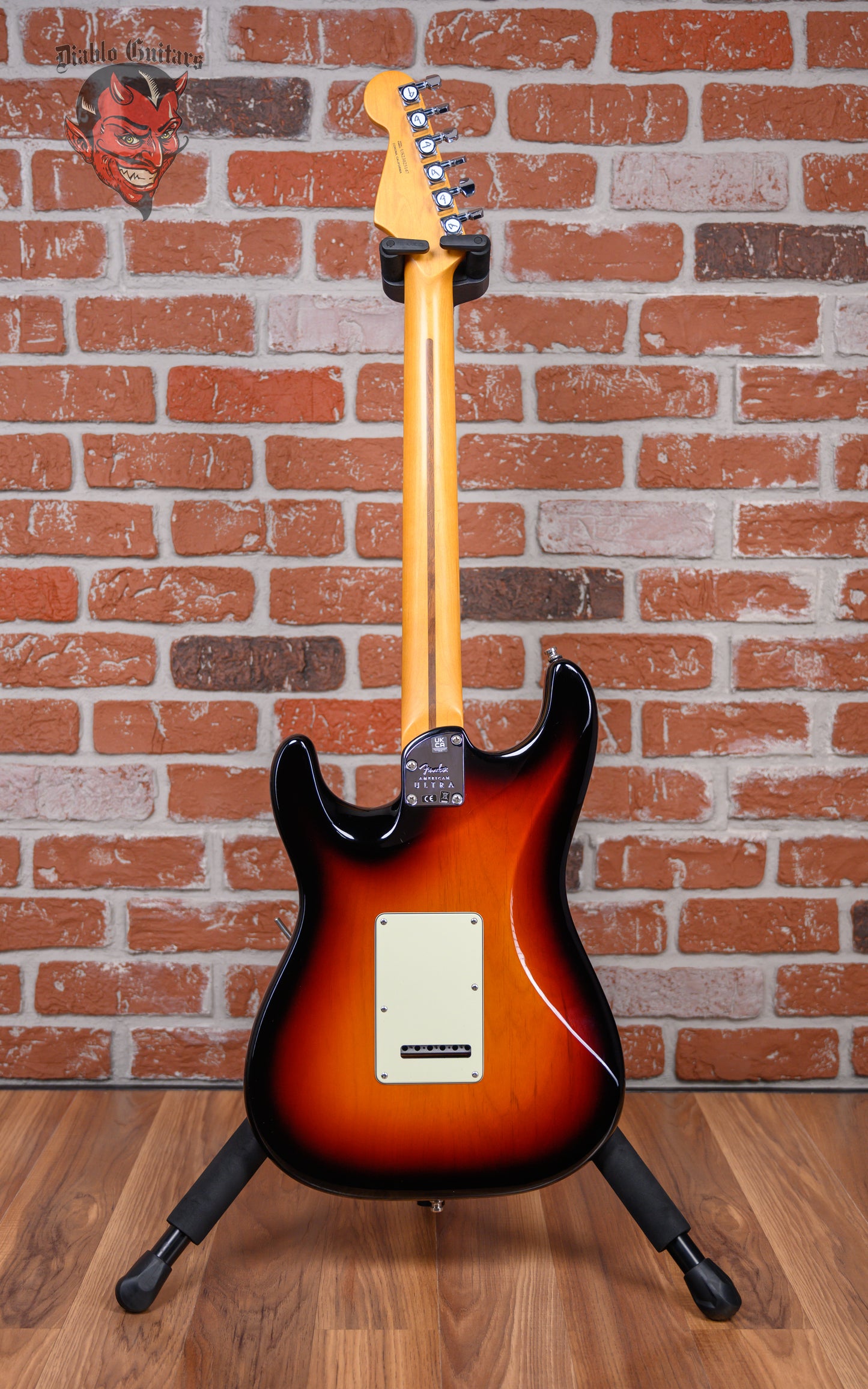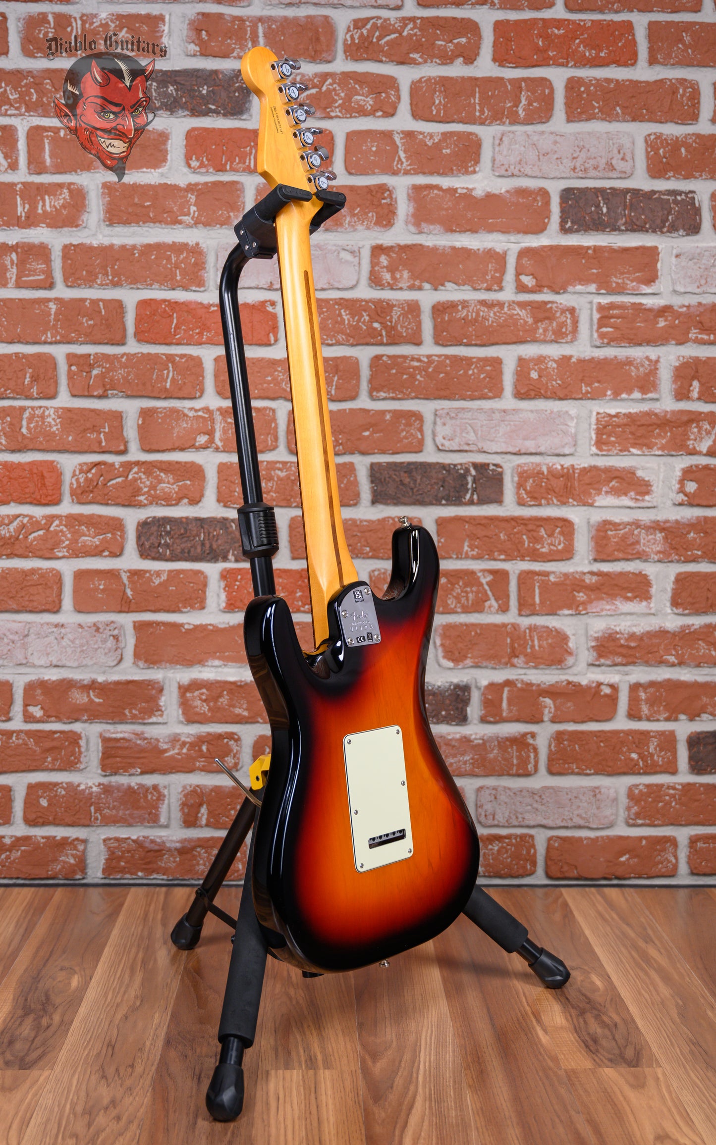 Fender American Ultra Stratocaster in Ultraburst finish made in 2023 with Original Hard Shell Case. This guitar features a solid alder body, maple neck and rosewood fingerboard. Equipped with a set of Fender Ultra Noiseless Vintage Strat single coils in the neck, middle, and bridge positions. Controlled by 1 volume pot w/ S-1 Switch, 2 tone pots and a 5-way blade switch. The 25.5" scale length neck has pearloid dot inlays and clay side markers with 22 medium jumbo frets on a compound 10"-14" radius with a modern D profile. The hardware is comprised of Fender Deluxe cast/sealed locking tuning machines with cloche heads, a bone nut, a Fender 2-Point Deluxe Synchronized Tremolo bridge w/ pop-in arm and aged white top hat knobs with a 3-ply mint pickguard.