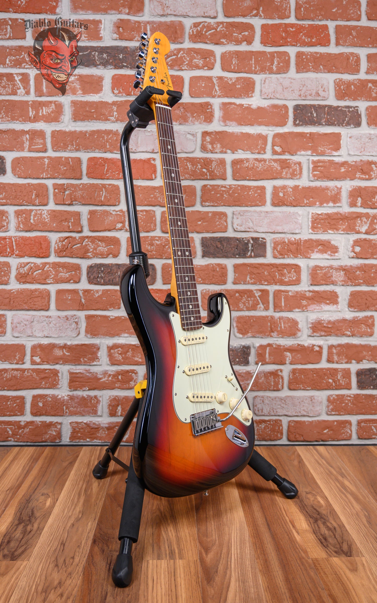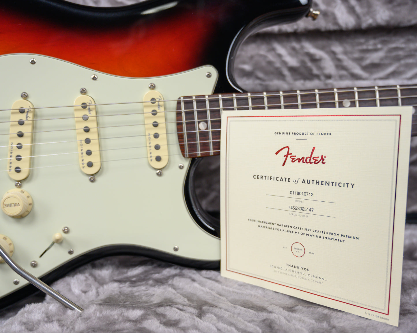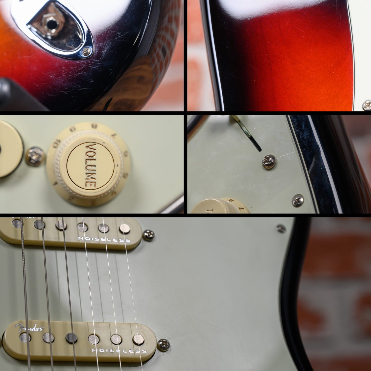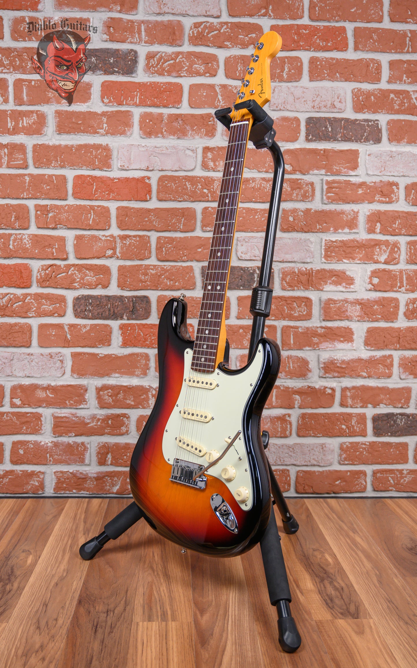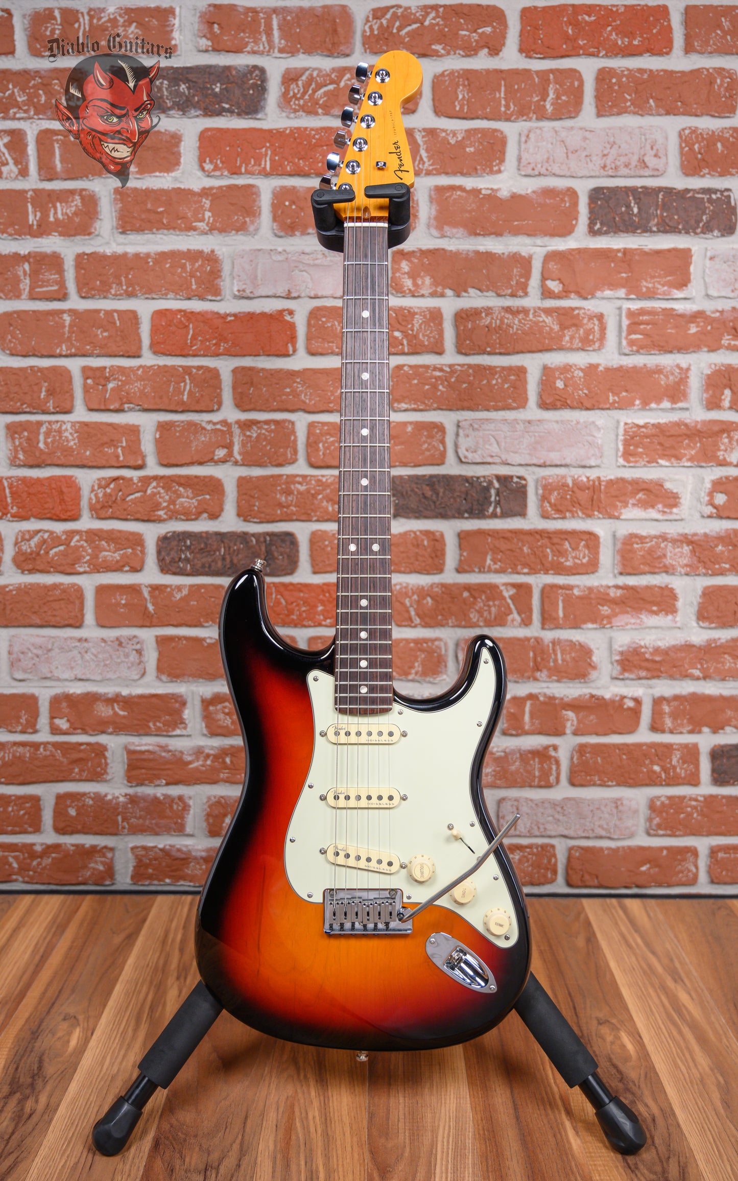 Fender American Ultra Stratocaster in Ultraburst finish made in 2023 with Original Hard Shell Case. This guitar features a solid alder body, maple neck and rosewood fingerboard. Equipped with a set of Fender Ultra Noiseless Vintage Strat single coils in the neck, middle, and bridge positions. Controlled by 1 volume pot w/ S-1 Switch, 2 tone pots and a 5-way blade switch. The 25.5" scale length neck has pearloid dot inlays and clay side markers with 22 medium jumbo frets on a compound 10"-14" radius with a modern D profile. The hardware is comprised of Fender Deluxe cast/sealed locking tuning machines with cloche heads, a bone nut, a Fender 2-Point Deluxe Synchronized Tremolo bridge w/ pop-in arm and aged white top hat knobs with a 3-ply mint pickguard.