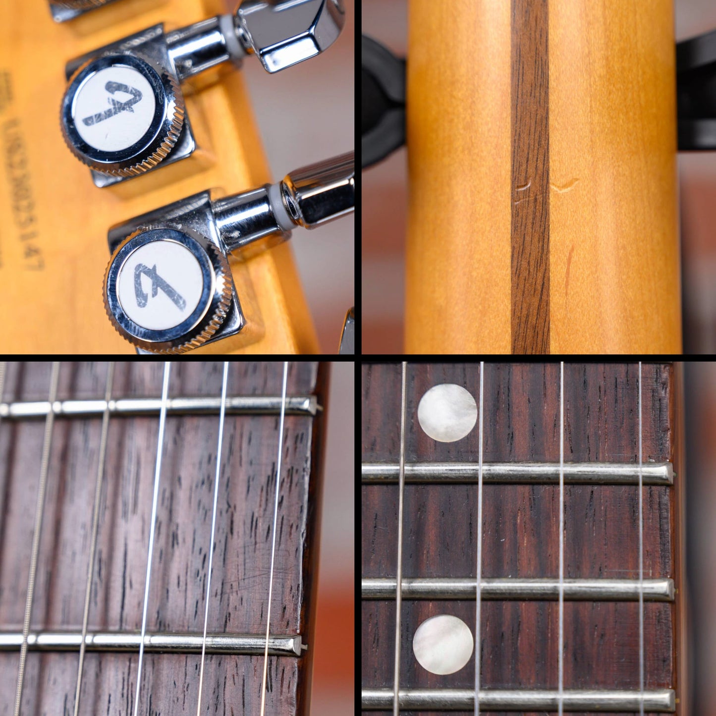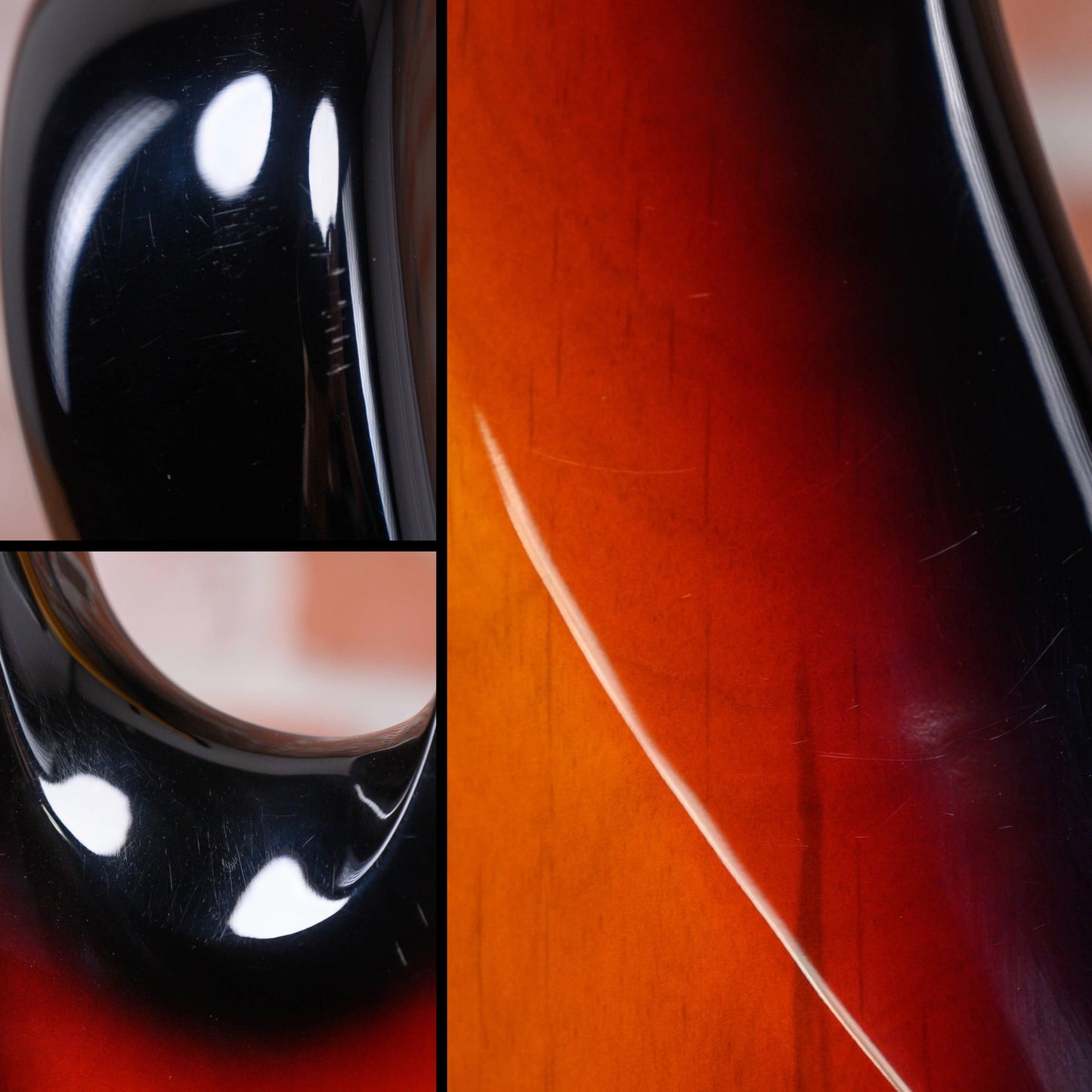 This guitar is in overall excellent condition. The tuning machines show some wear and there are some light marks on the fretboard. There are a couple of small dents on the back of the neck around the 6th & 7th frets. The body has some light surface marks that can be seen in direct light and the pickguard shows signs of play. (See pics)