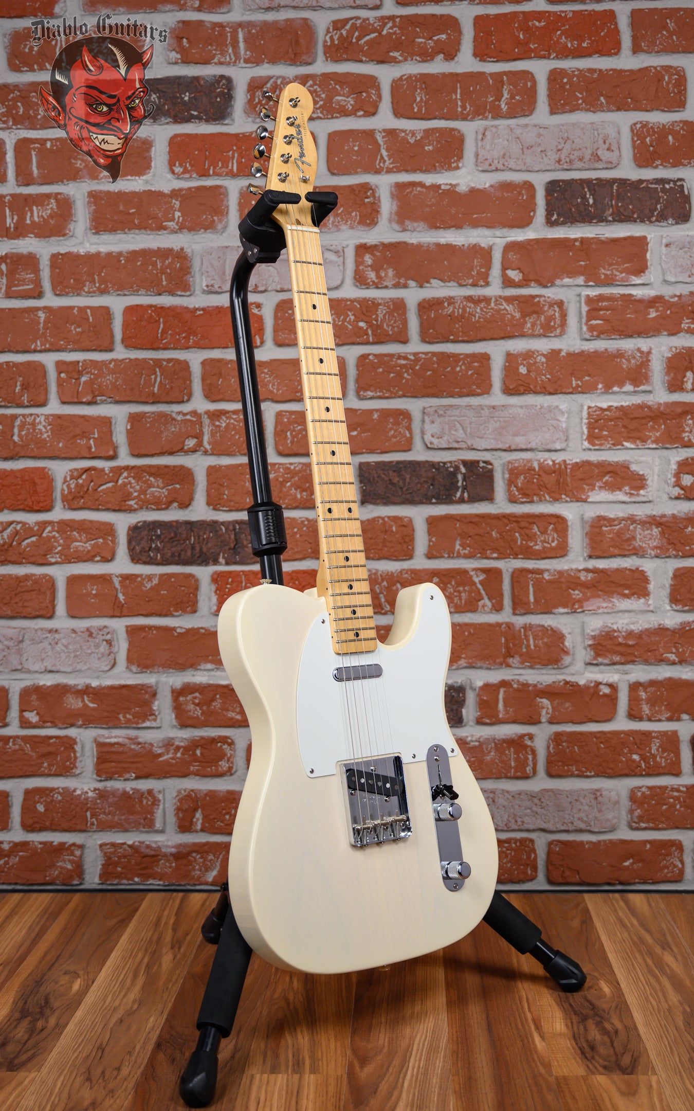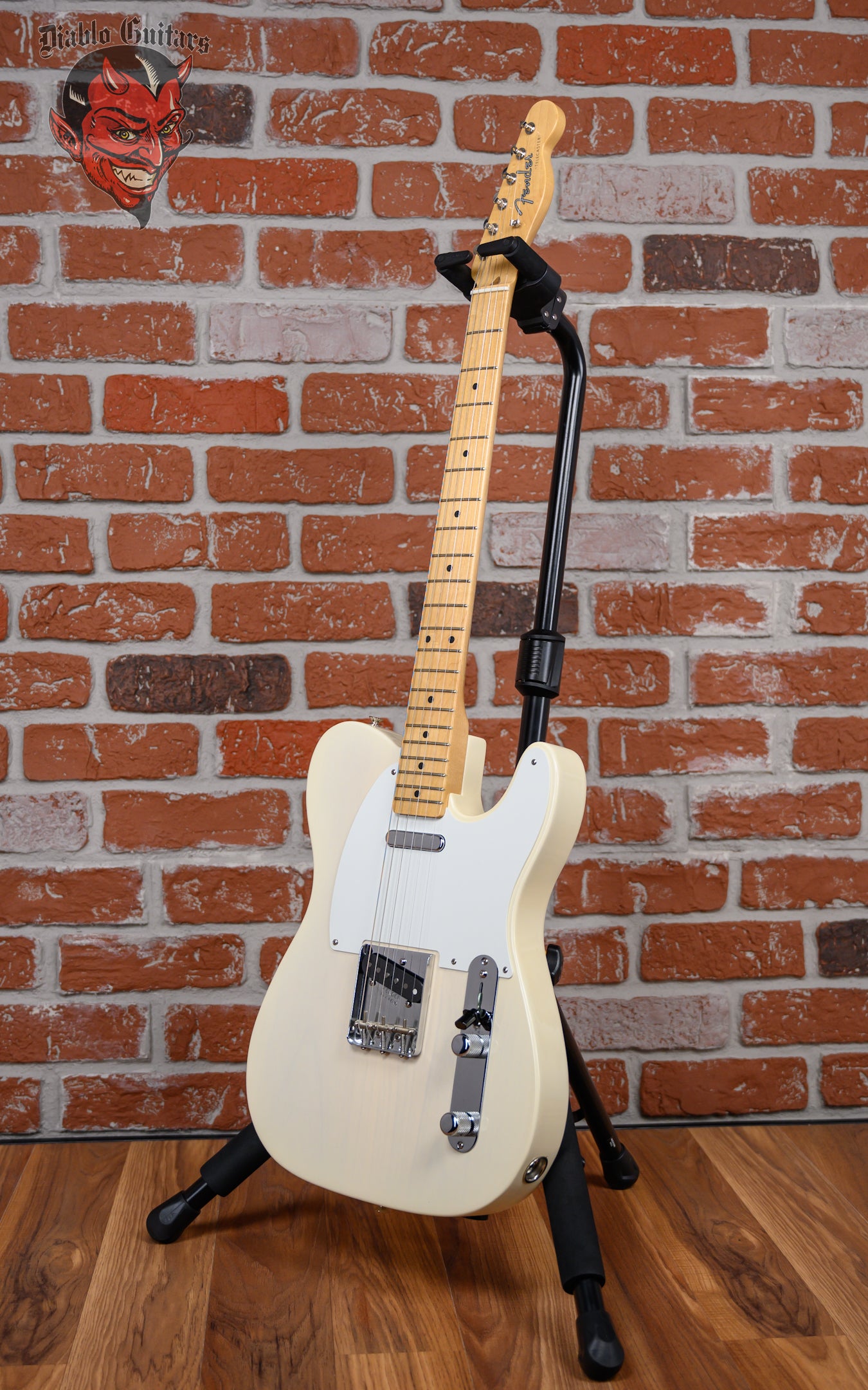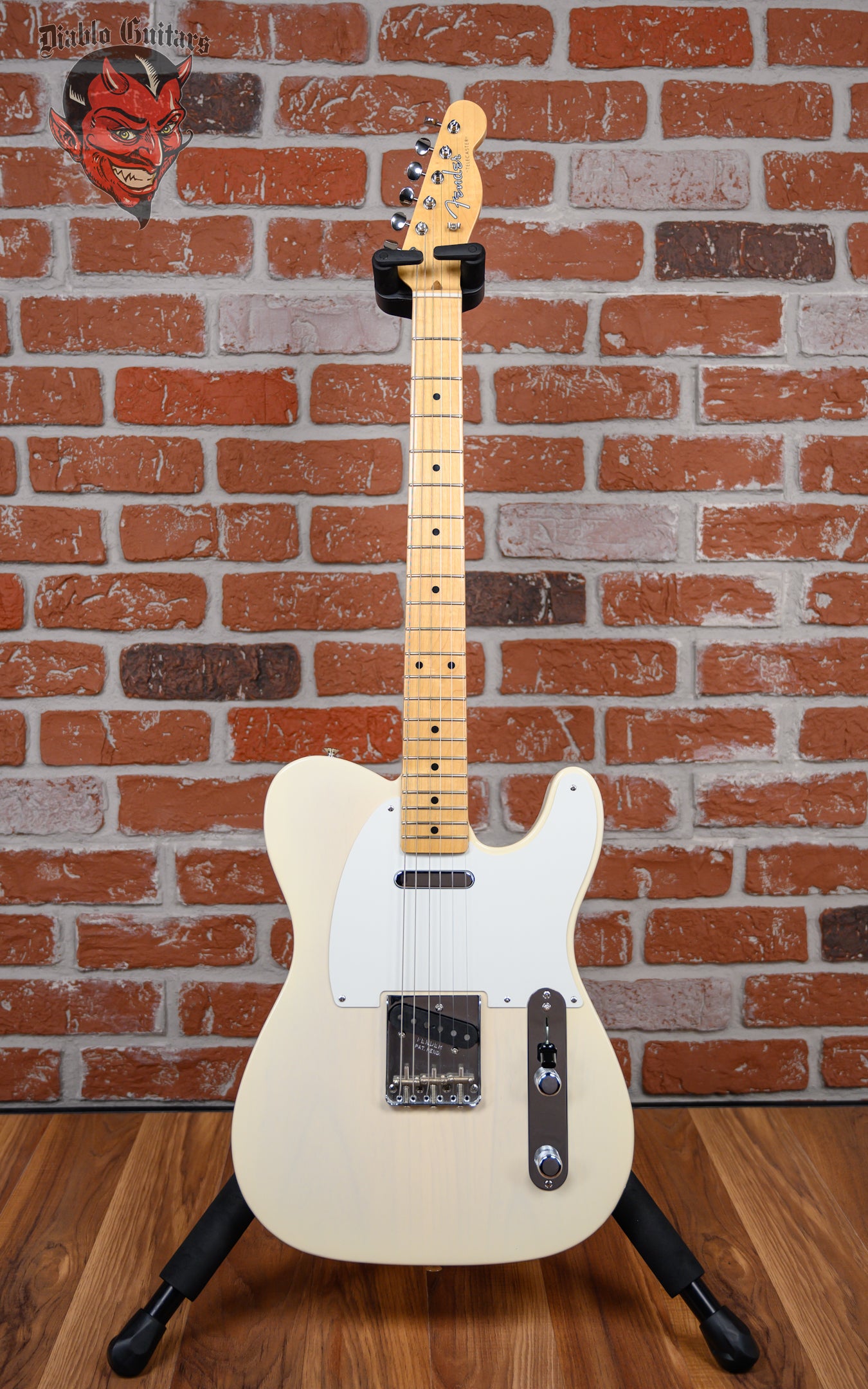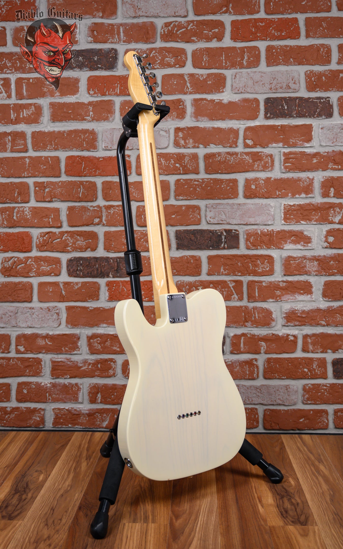 Fender American Vintage 1958 Telecaster in Aged White Blonde finish made in 2014 with Original Hard Shell Case. This guitar features a solid ash body, maple neck and maple fingerboard. Equipped with a Seymour Duncan STL-1 Vintage ‘54 single coil tele in the neck position and a Seymour Duncan STR-1 vintage ‘54 single coil tele in the bridge position. Controlled by 1 volume, 1 tone pot and a 3-Way blade switch. The 25.5" scale length neck has black dot inlays and black side markers with 21 vintage frets on a 7.25" radius with a medium C profile. The hardware is comprised of nickel/chrome Kluson deluxe single line tuning machines with oval heads, a bone nut, a Fender String-thru body tele bridge with threaded barrel saddles and chrome knurled flat top knobs with a single ply parchment pickguard.