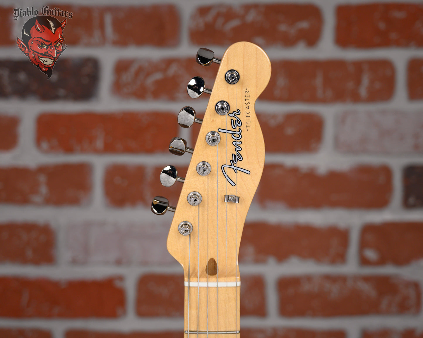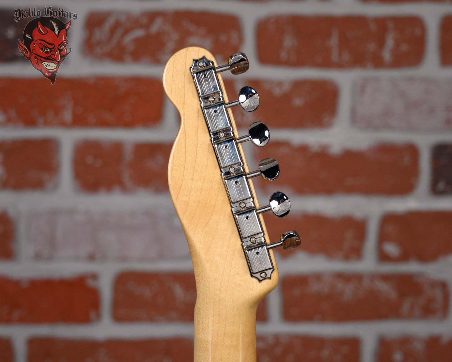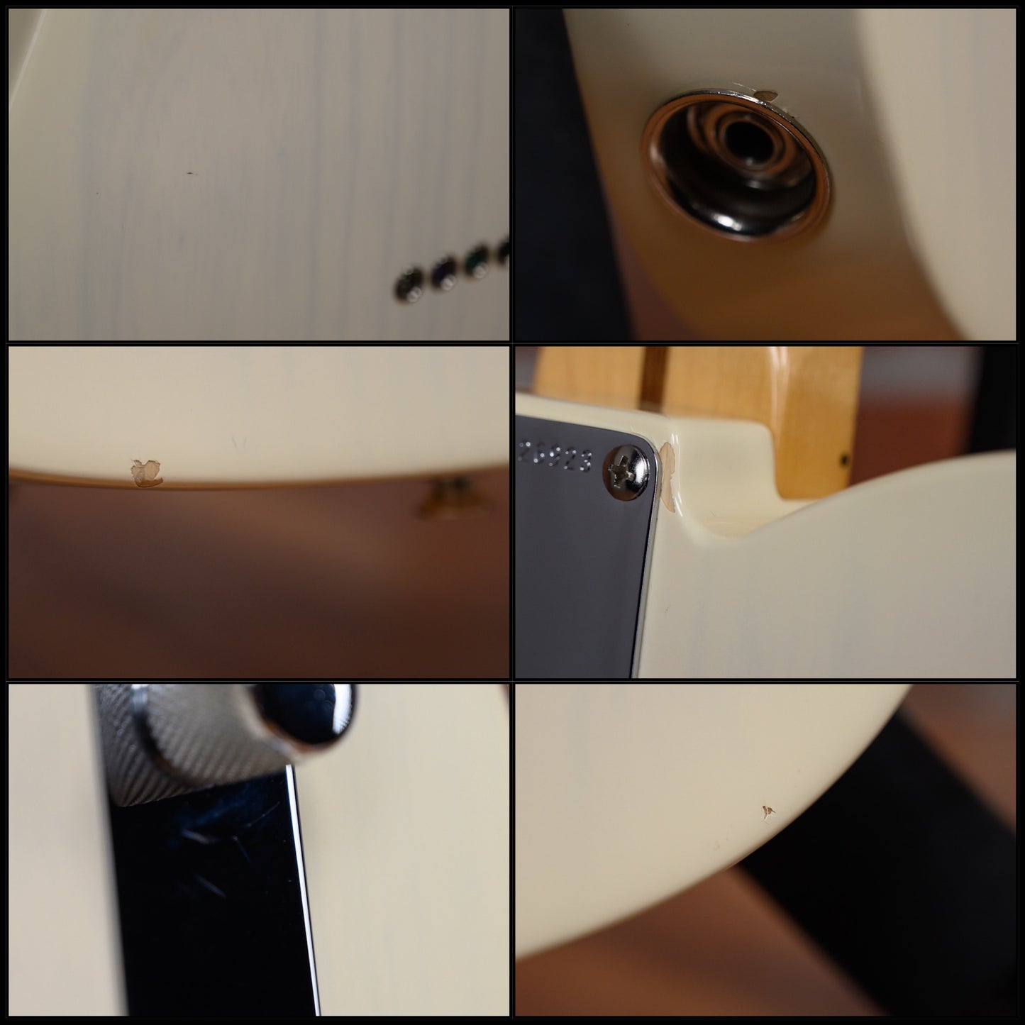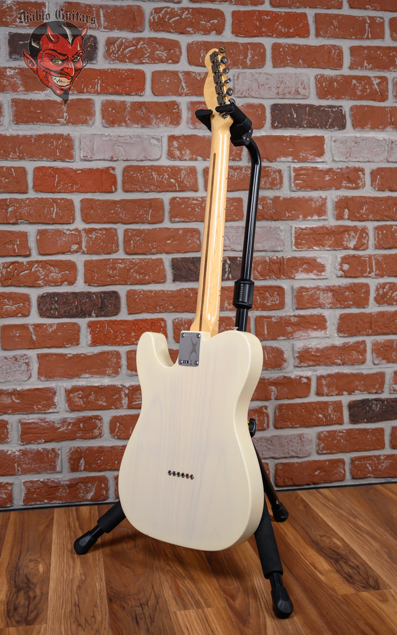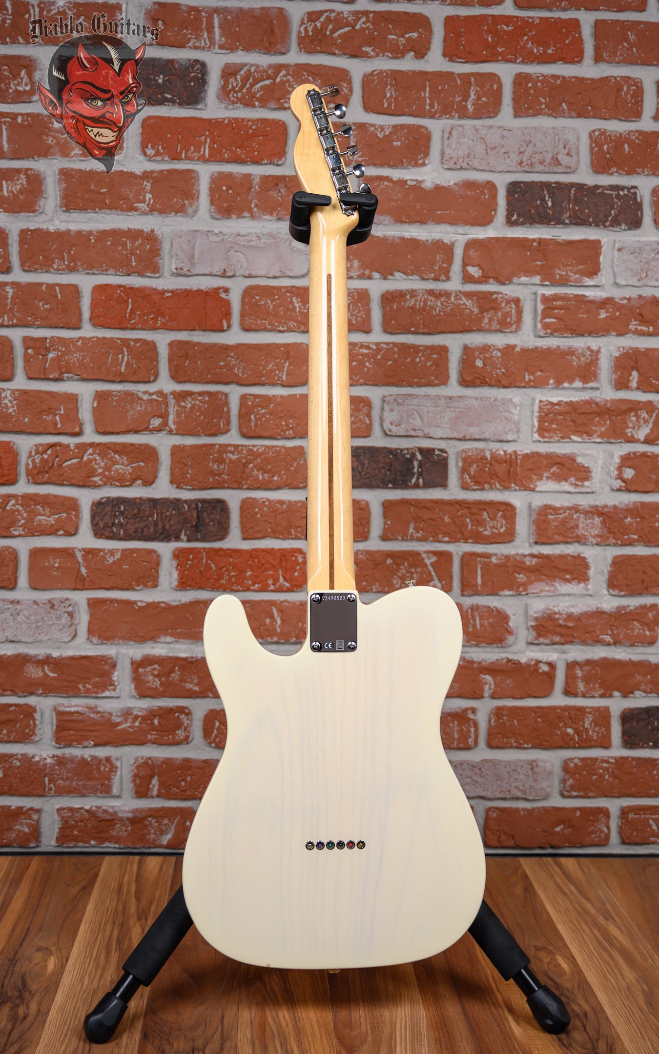 Fender American Vintage 1958 Telecaster in Aged White Blonde finish made in 2014 with Original Hard Shell Case. This guitar features a solid ash body, maple neck and maple fingerboard. Equipped with a Seymour Duncan STL-1 Vintage ‘54 single coil tele in the neck position and a Seymour Duncan STR-1 vintage ‘54 single coil tele in the bridge position. Controlled by 1 volume, 1 tone pot and a 3-Way blade switch. The 25.5" scale length neck has black dot inlays and black side markers with 21 vintage frets on a 7.25" radius with a medium C profile. The hardware is comprised of nickel/chrome Kluson deluxe single line tuning machines with oval heads, a bone nut, a Fender String-thru body tele bridge with threaded barrel saddles and chrome knurled flat top knobs with a single ply parchment pickguard.