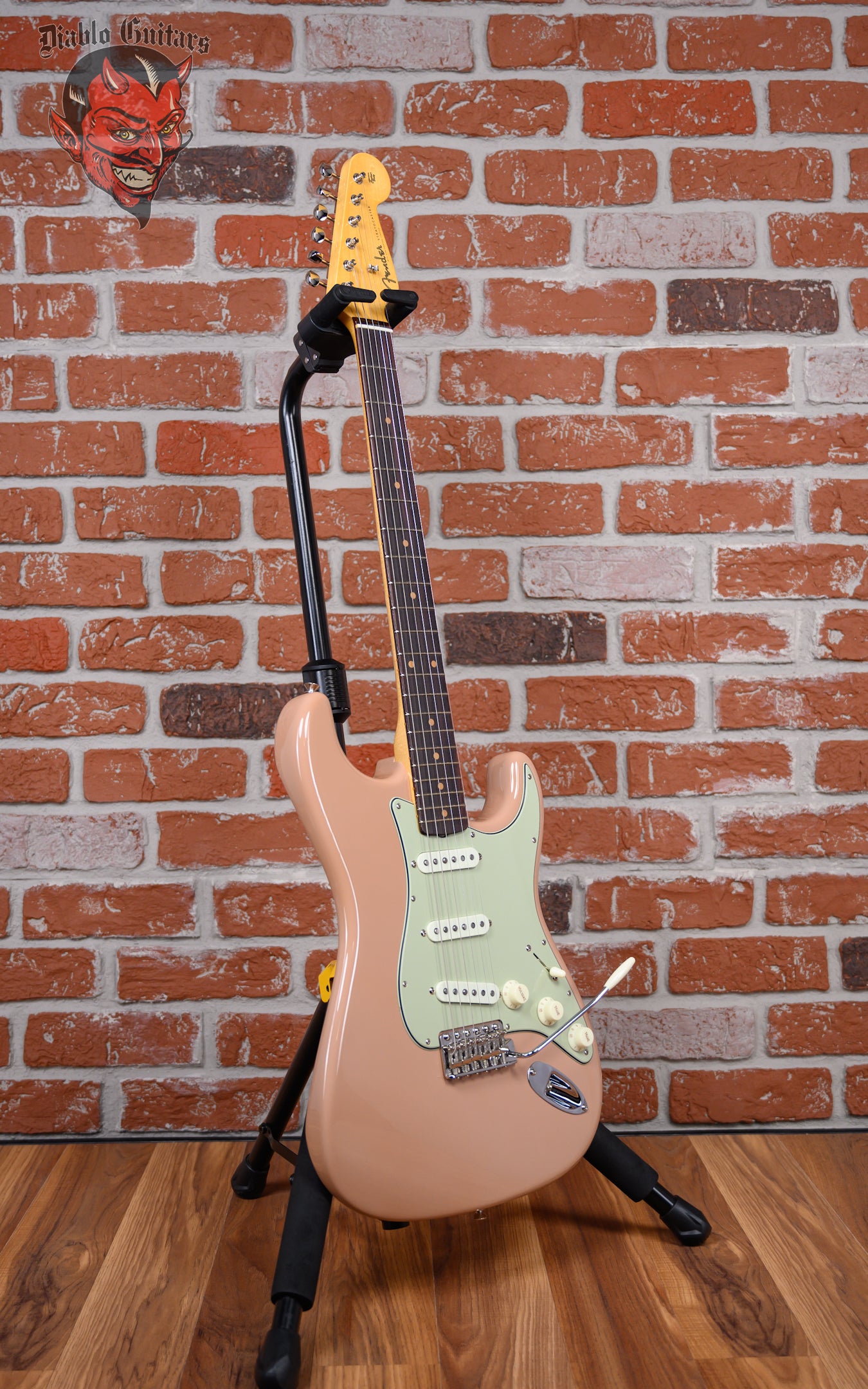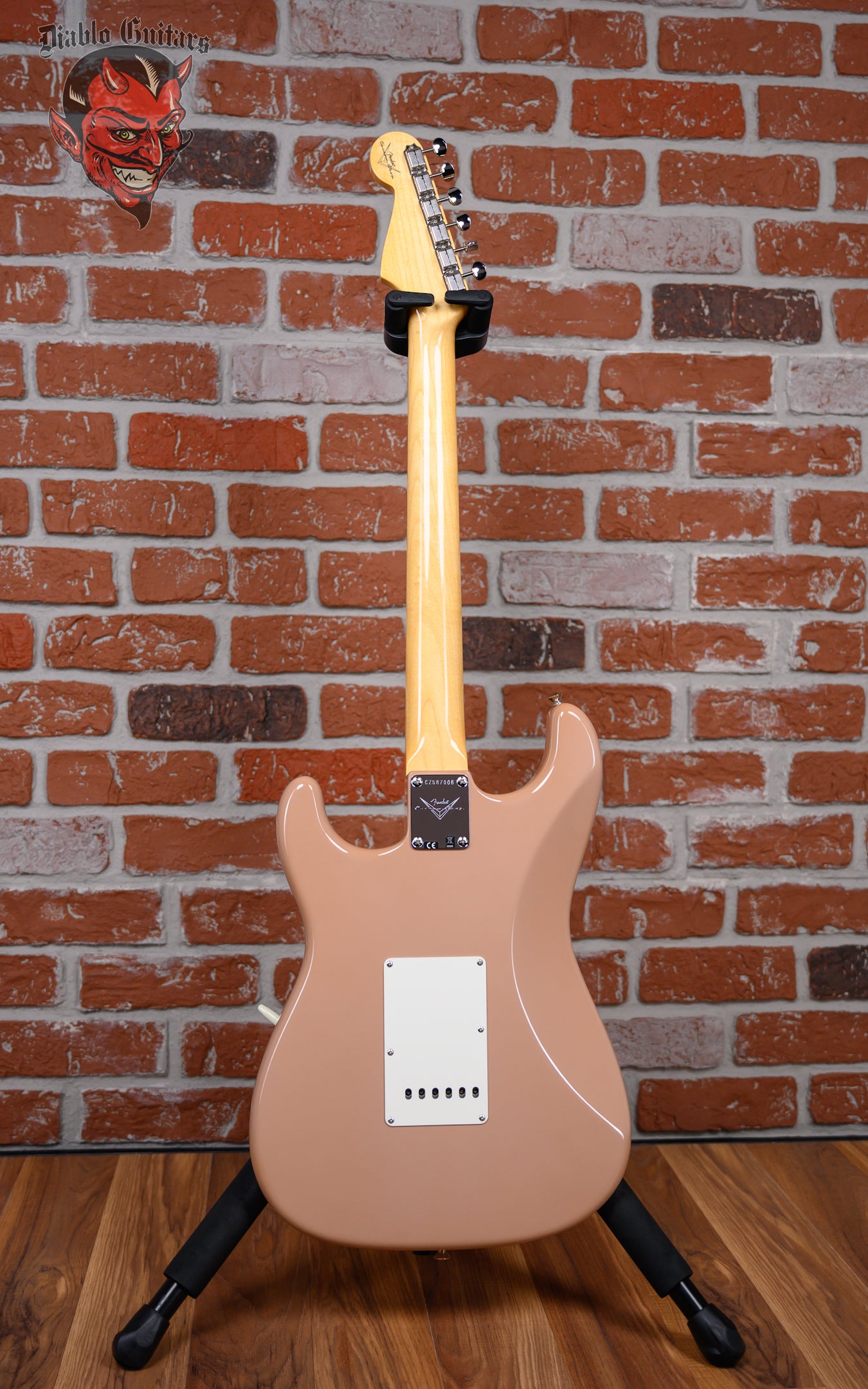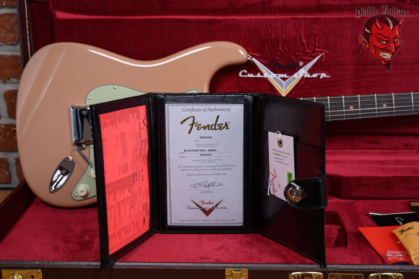 Fender Custom Shop B5 ‘62 Stratocaster NOS in Aged Dirty Shell Pink finish made in 2025 with Original Hard Shell Case. This guitar features a solid alder body, quartersawn maple neck and guitar cites 9mm AAA rosewood fingerboard. Equipped with a Fender handwound fat 60's strat in the neck position, a Fender handwound fat 60's strat RWRP in the middle position, and a Fender handwound fat 60's strat in the bridge position. Controlled by 1 volume, 2 tone pots and a 5-Way blade switch. The 25.5" scale length neck has vintage clay dot inlays and vintage clay side markers with 21 vintage 45085 frets on a 7.25"-9.50" compound radius with a 60s style oval "C" profile. The hardware is comprised of nickel/chrome Fender vintage style tuning machines with oval heads, a bone nut, a Fender custom shop vintage strat tremolo, and white top hat knobs with a 60 strat 3-ply mint nitro pickguard.