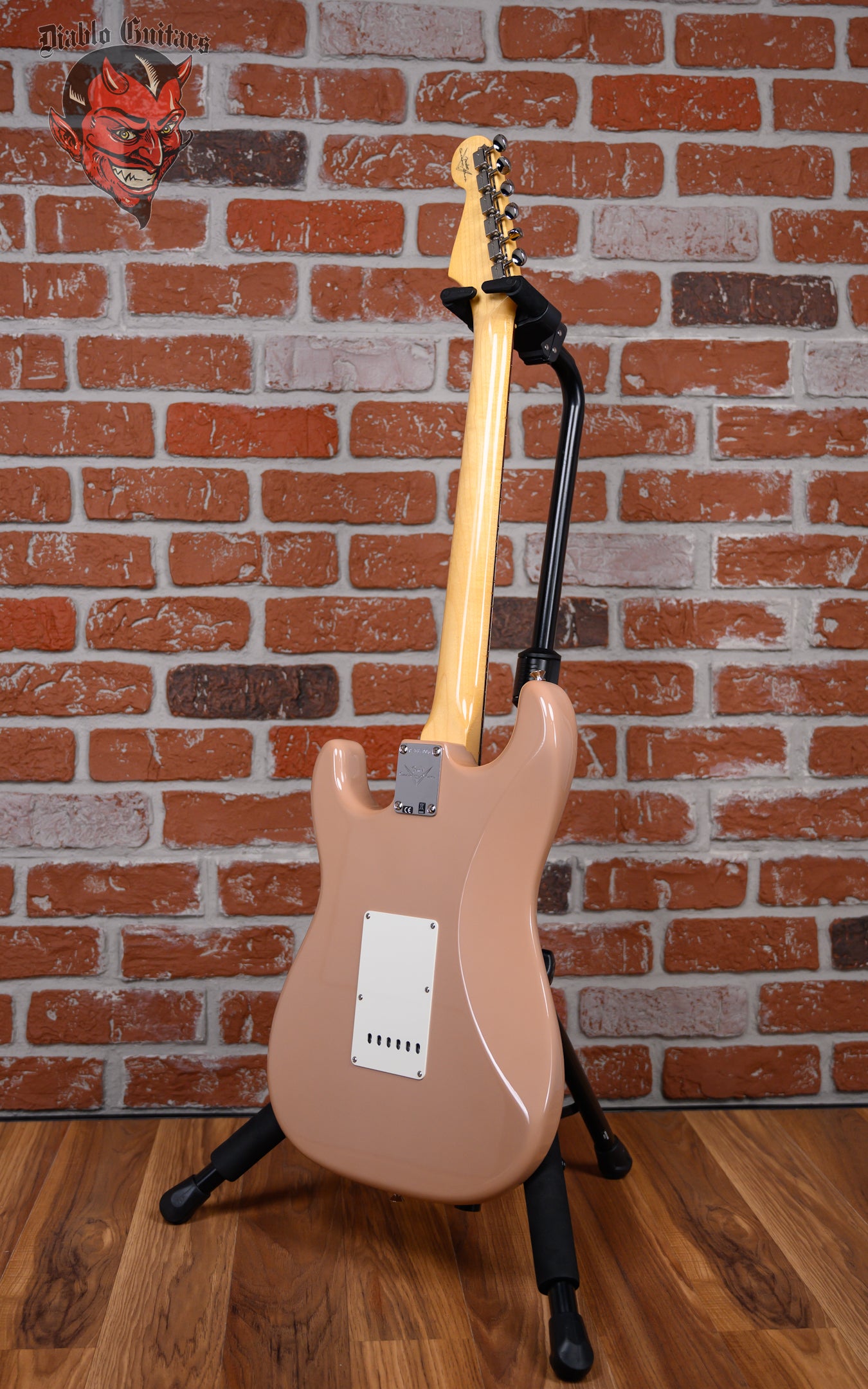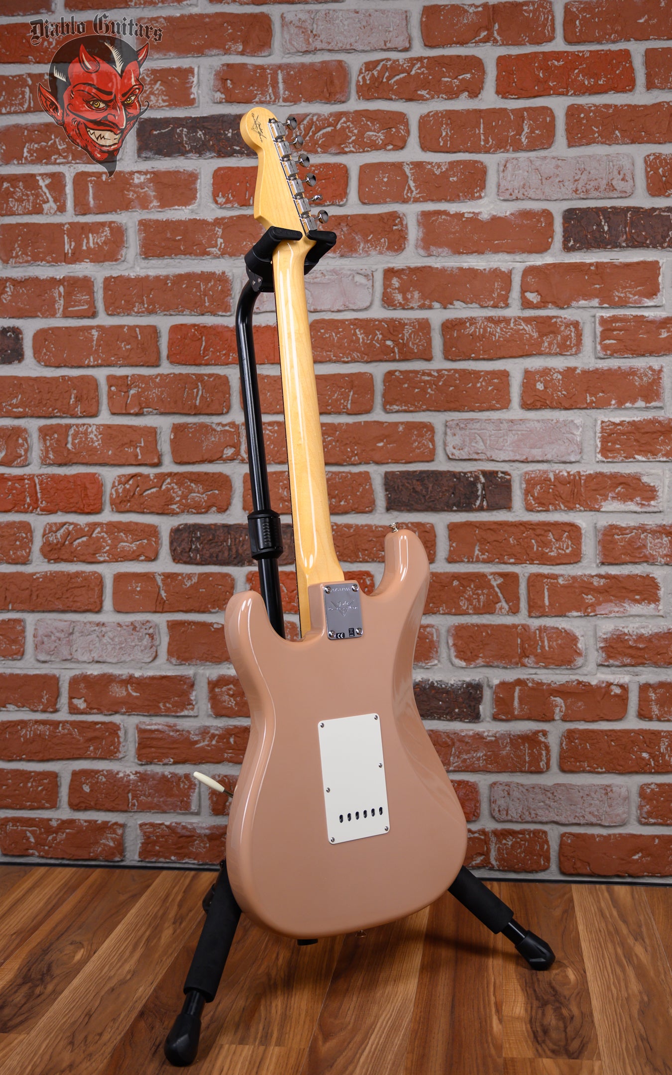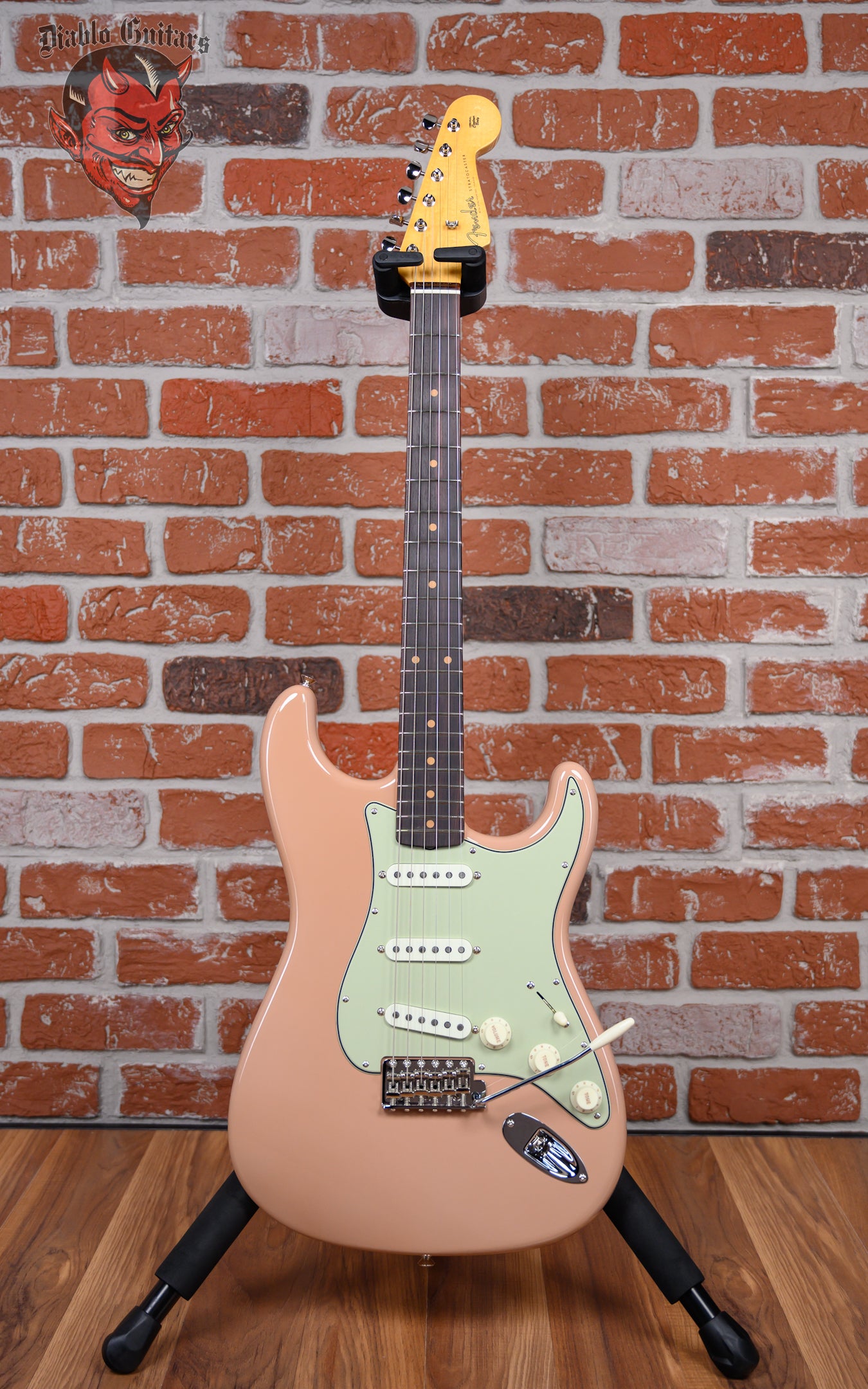 Fender Custom Shop B5 ‘62 Stratocaster NOS in Aged Dirty Shell Pink finish made in 2025 with Original Hard Shell Case. This guitar features a solid alder body, quartersawn maple neck and guitar cites 9mm AAA rosewood fingerboard. Equipped with a Fender handwound fat 60's strat in the neck position, a Fender handwound fat 60's strat RWRP in the middle position, and a Fender handwound fat 60's strat in the bridge position. Controlled by 1 volume, 2 tone pots and a 5-Way blade switch. The 25.5" scale length neck has vintage clay dot inlays and vintage clay side markers with 21 vintage 45085 frets on a 7.25"-9.50" compound radius with a 60s style oval "C" profile. The hardware is comprised of nickel/chrome Fender vintage style tuning machines with oval heads, a bone nut, a Fender custom shop vintage strat tremolo, and white top hat knobs with a 60 strat 3-ply mint nitro pickguard.