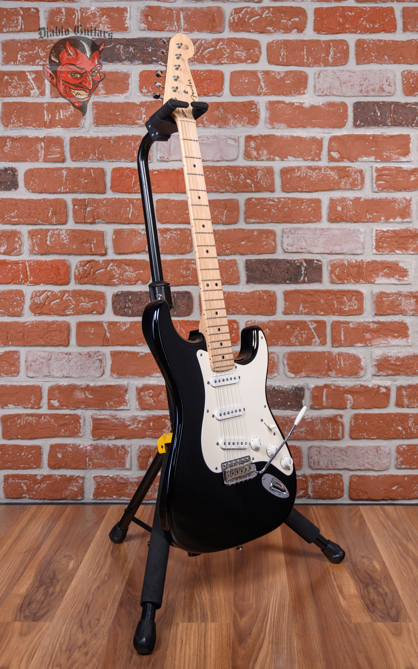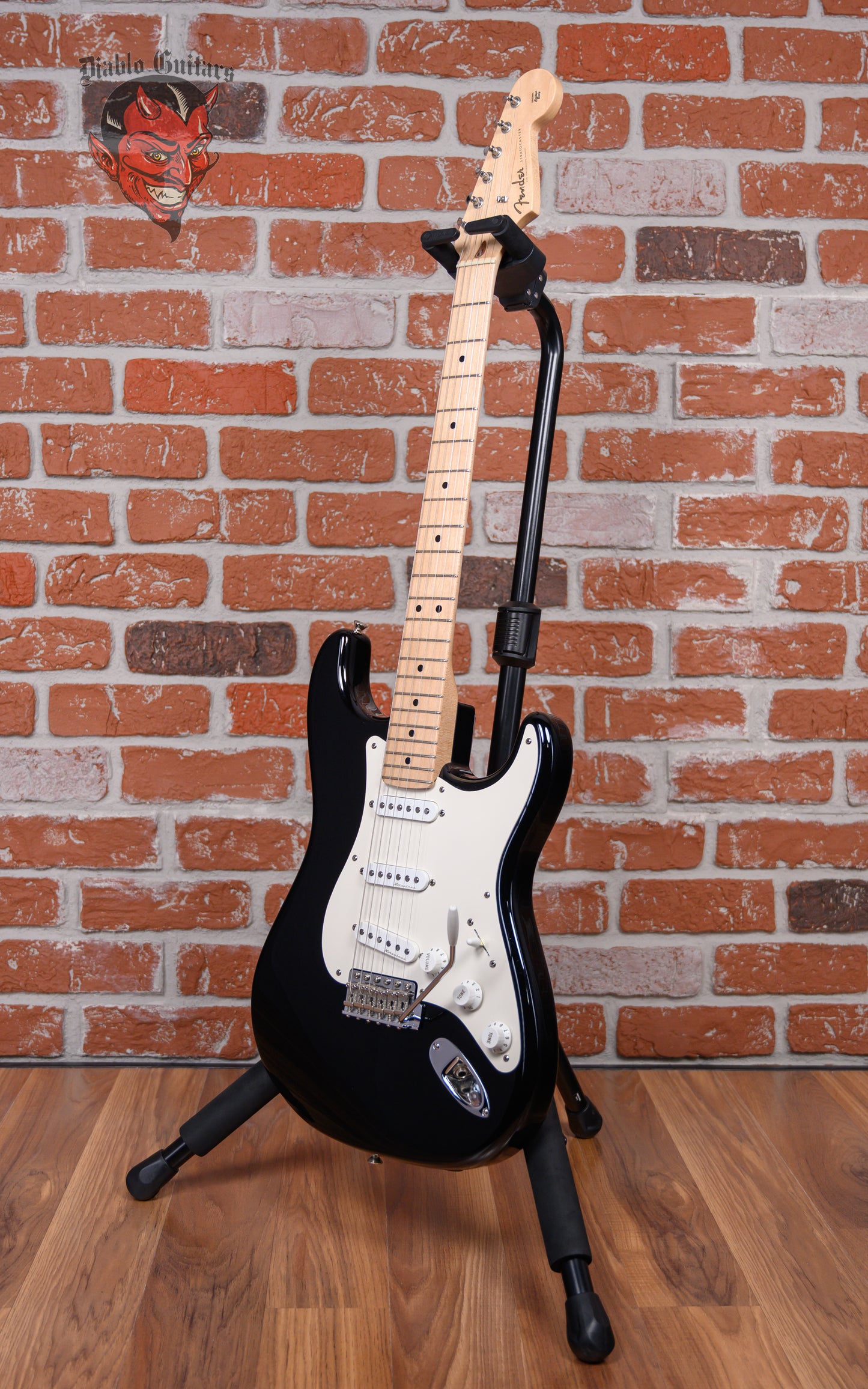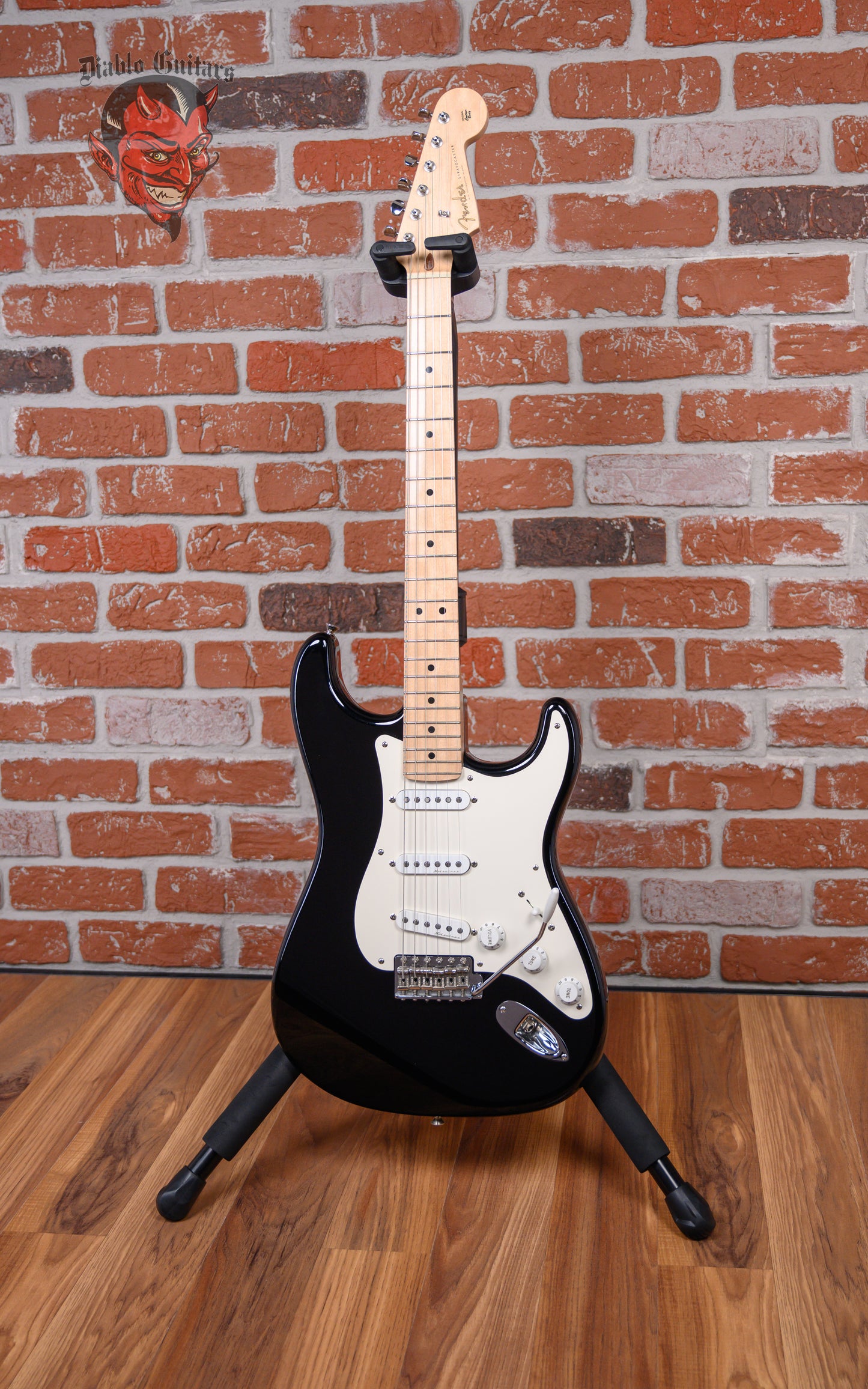 Fender Custom Shop Eric Clapton Signature "Blackie" Stratocaster in Black finish made in 2006 with Original Hard Shell Case. This guitar features a solid alder body, maple neck and maple fingerboard. Equipped with a set of Fender Vintage Noiseless Single-Coil Strat pickups in the neck, middle, and bridge positions. Controlled by 1 master volume, 1 TBX tone control, 1 master active mid boost and a 5-way blade switch. The 25.5" scale length neck has black dot inlays and black side markers with 22 vintage frets on a 9.5" radius with a soft V profile. The hardware is comprised of nickel/chrome Fender Vintage Style tuning machines with oval heads, a synthetic bone nut, a Fender American Vintage Synchronized Tremolo bridge with trem block, and white top hat knobs with a single ply white pickguard.