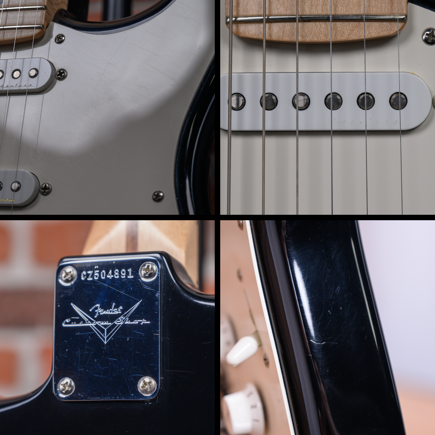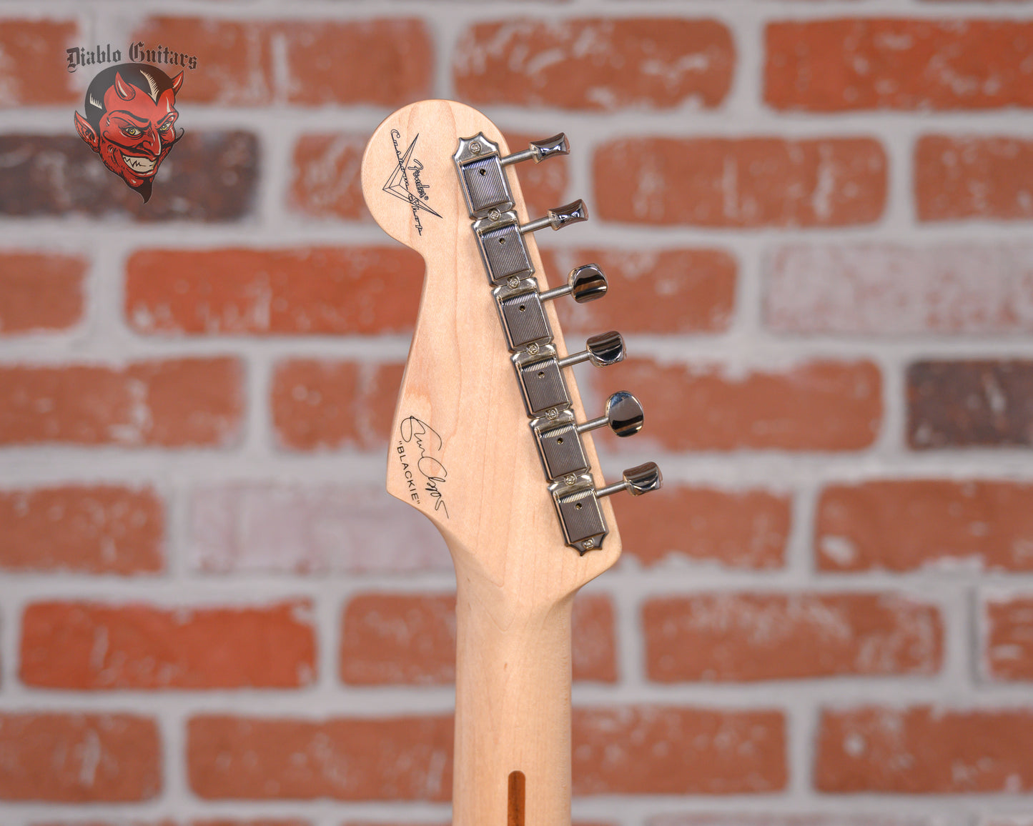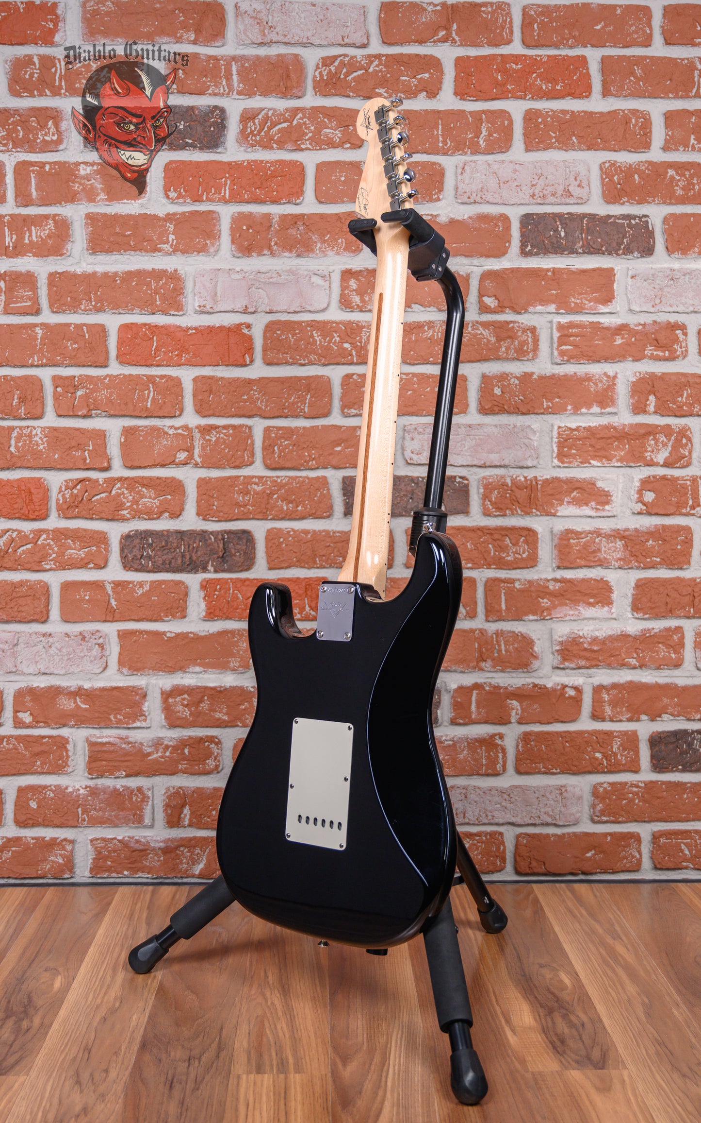 Fender Custom Shop Eric Clapton Signature "Blackie" Stratocaster in Black finish made in 2006 with Original Hard Shell Case. This guitar features a solid alder body, maple neck and maple fingerboard. Equipped with a set of Fender Vintage Noiseless Single-Coil Strat pickups in the neck, middle, and bridge positions. Controlled by 1 master volume, 1 TBX tone control, 1 master active mid boost and a 5-way blade switch. The 25.5" scale length neck has black dot inlays and black side markers with 22 vintage frets on a 9.5" radius with a soft V profile. The hardware is comprised of nickel/chrome Fender Vintage Style tuning machines with oval heads, a synthetic bone nut, a Fender American Vintage Synchronized Tremolo bridge with trem block, and white top hat knobs with a single ply white pickguard.