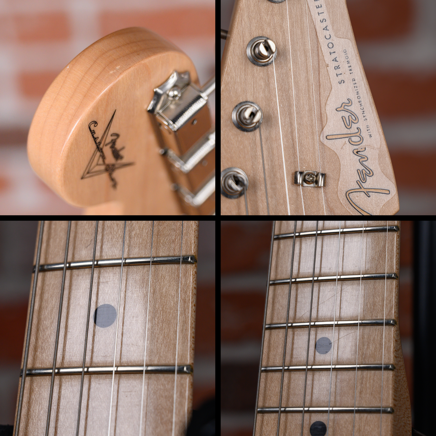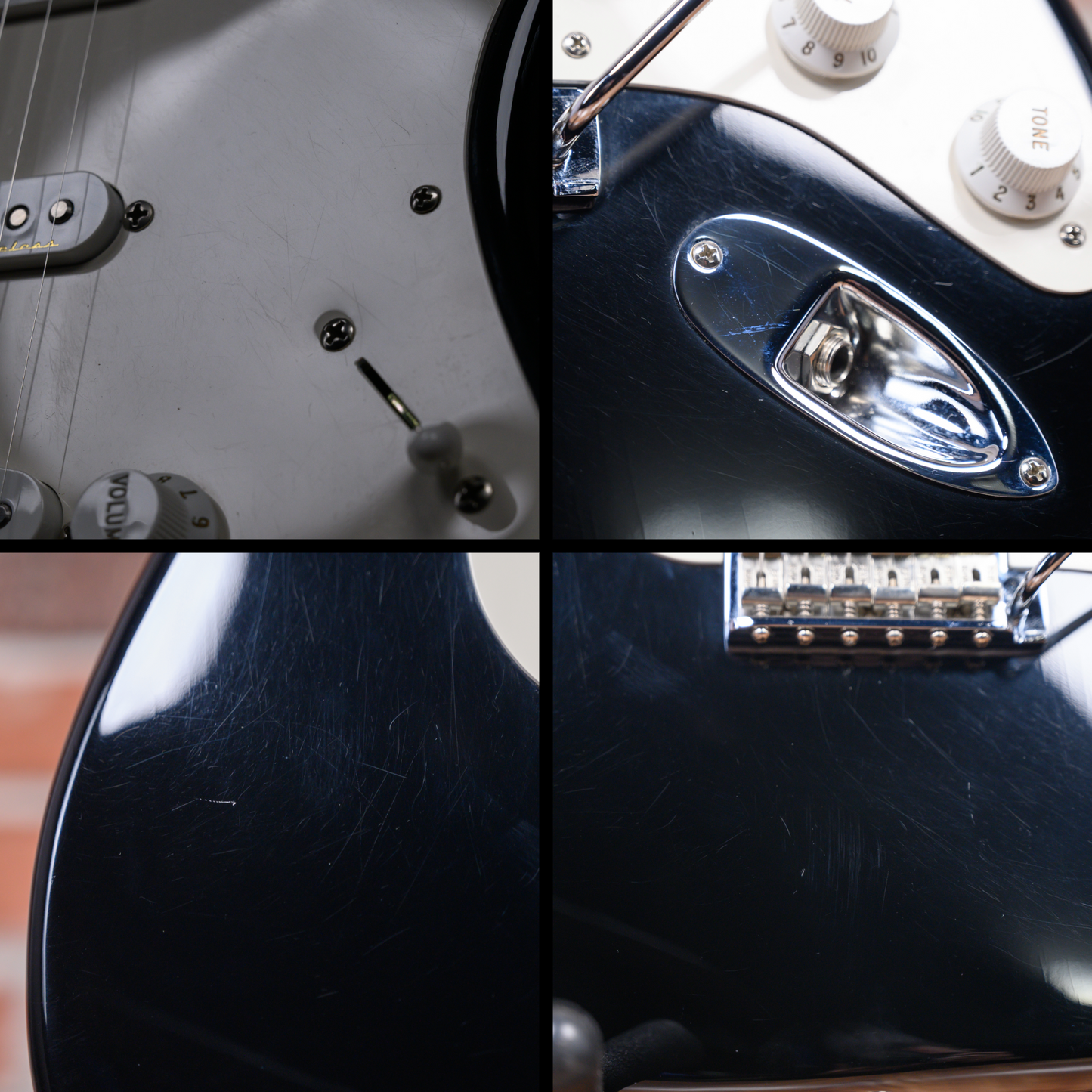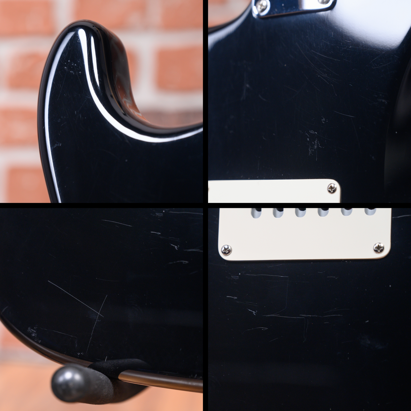 This guitar is in overall very good condition. There are light surface marks and scuffs throughout the finish. There are a few light marks on the fretboard. The headstock has a small ding on the tip and some of the decal has been scratched off. The logo has worn off of the neck pickup and there are signs of play on the pickguard. (See Pics)
