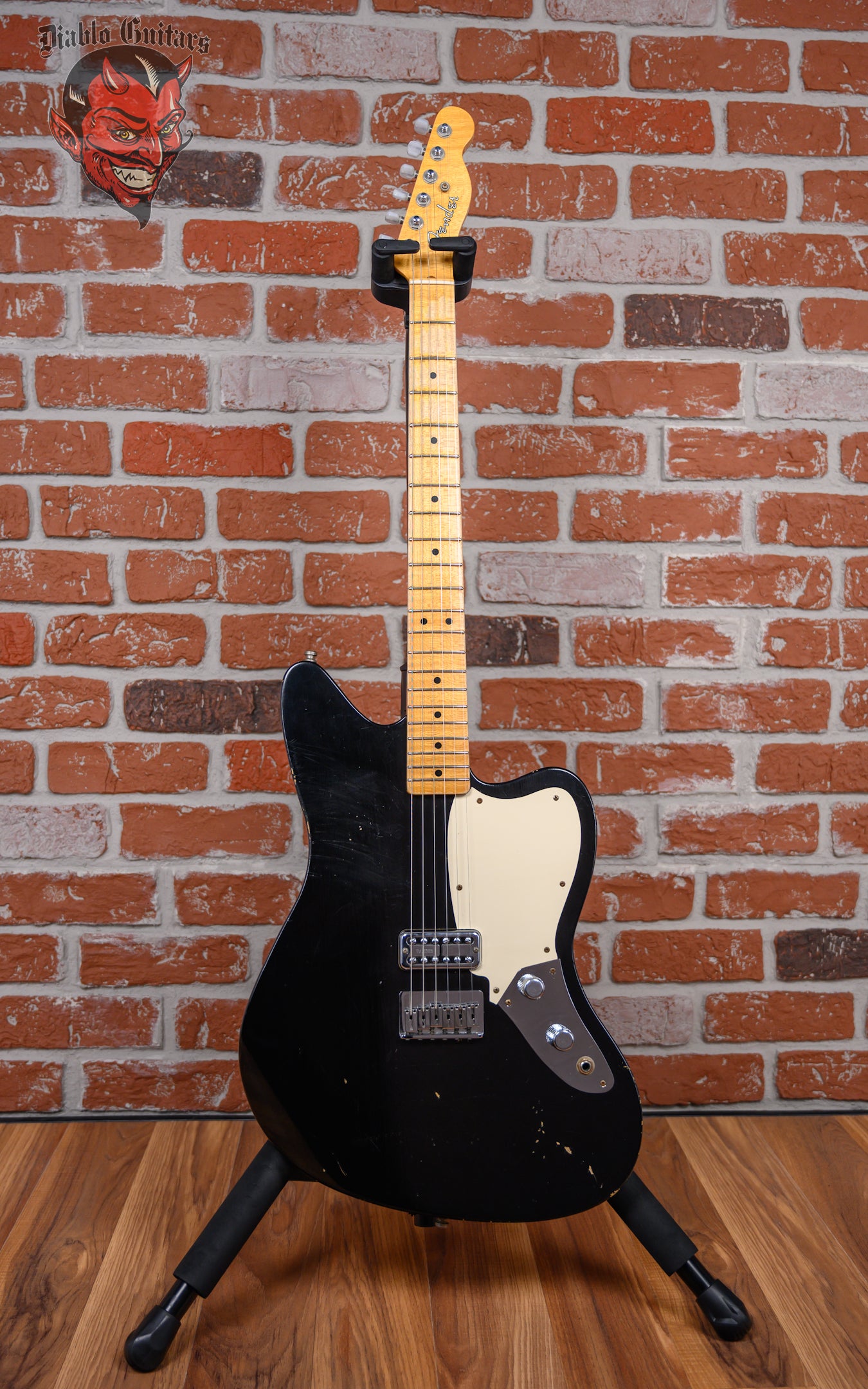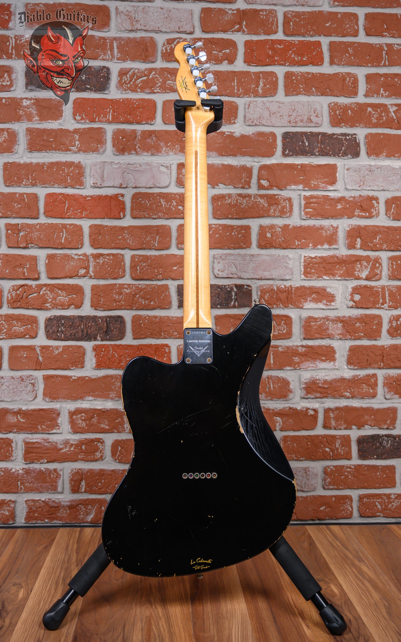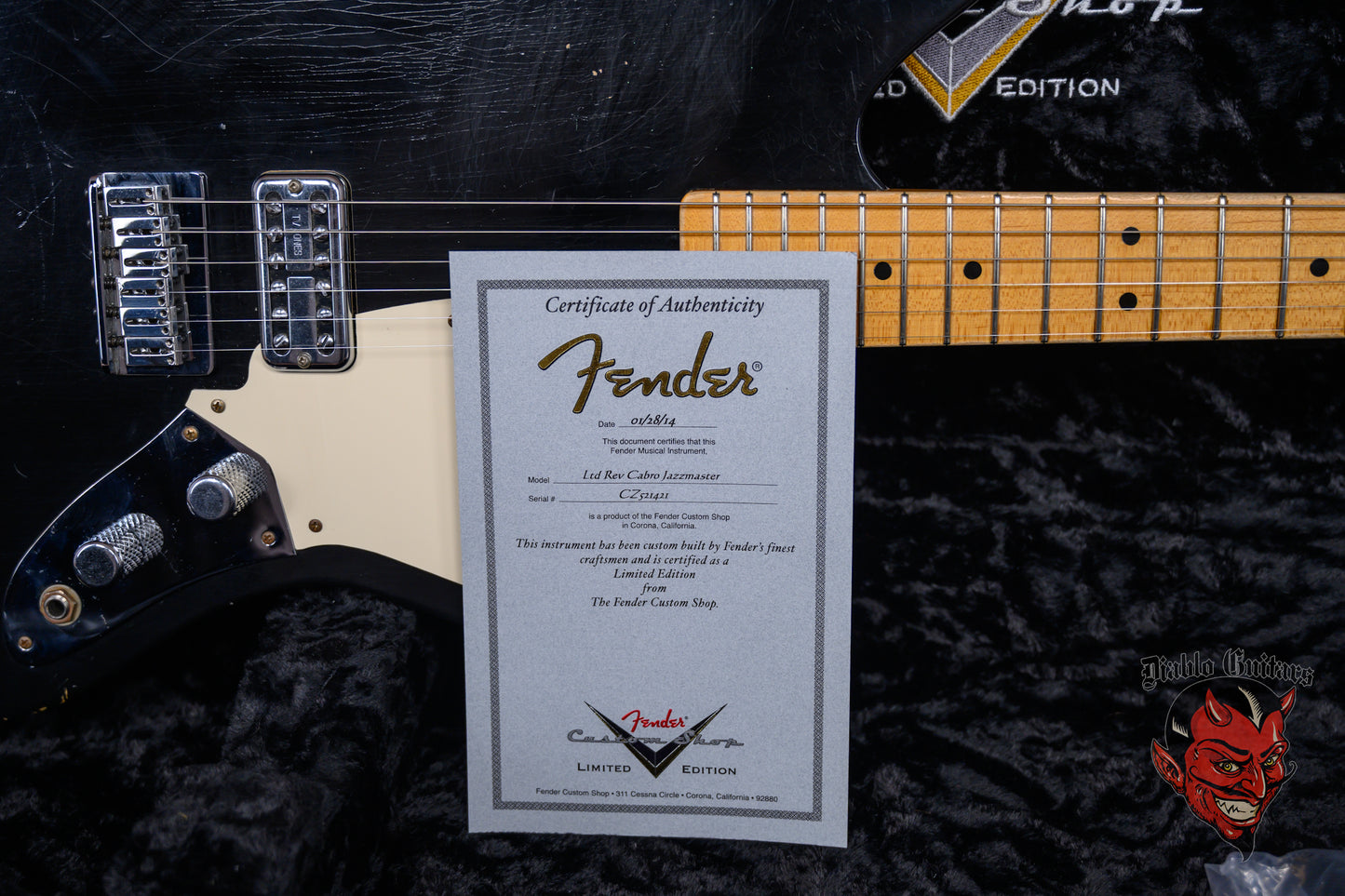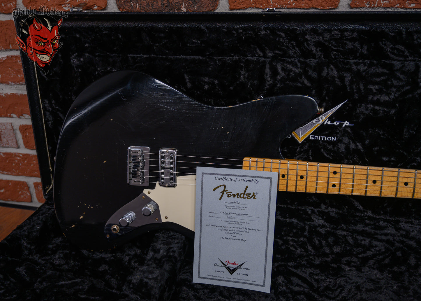 Fender Custom Shop Limited Edition La Cabronita Gato Gordo Jazzmaster Relic in Aged Black finish made in 2014 with Original Hard Shell Case. This guitar features a solid alder body, quartersawn maple neck and maple fingerboard with a telecaster headstock. Equipped with a single TV Jones Power ‘Tron in the bridge position, Controlled by 1 volume and 1 tone pot with grease Bucket tone circuit. The 25.5" scale length neck has Black dot inlays and Black side markers with 21 6105 narrow tall frets on a 9.5" radius with a large "C" profile. The hardware is comprised of Aged chrome Sperzel Sealed Die-Cast tuning machines with pearloid cloche heads, a bone nut, a Fender American Series Hardtail bridge with Stainless Steel Saddles and chrome knurled flat top knobs with a 1-Ply parchment relic pickguard.