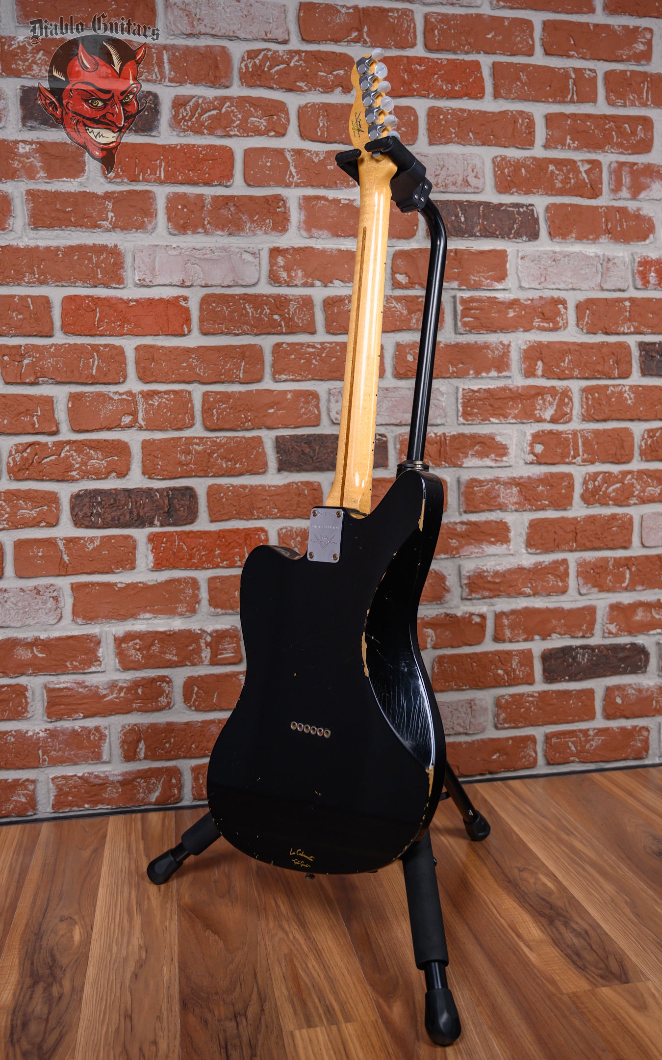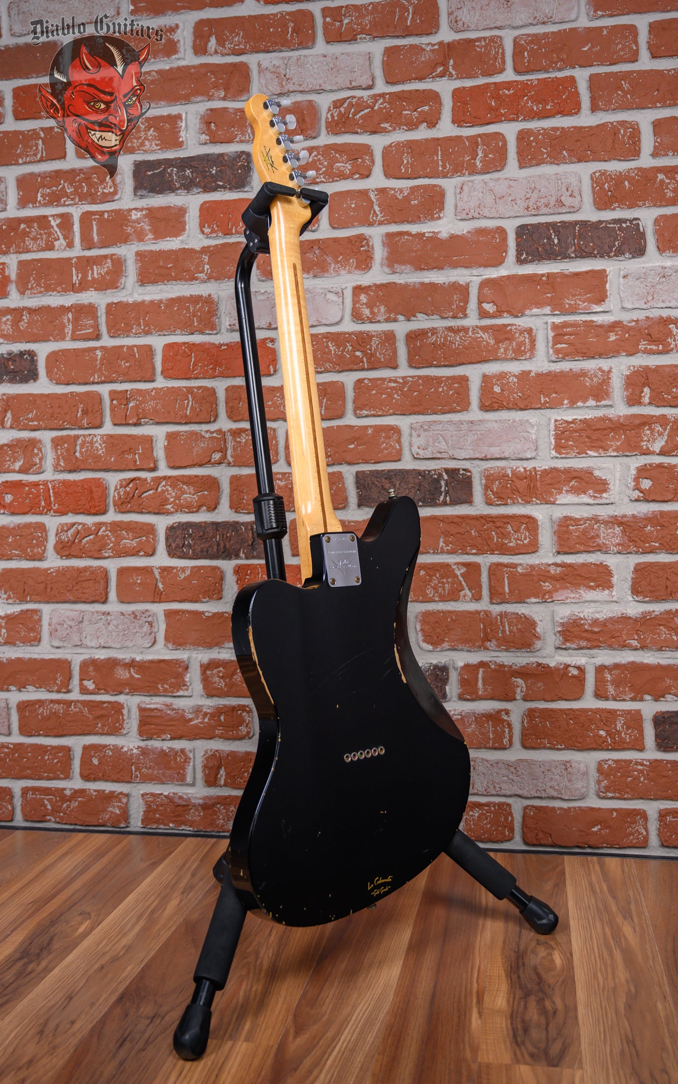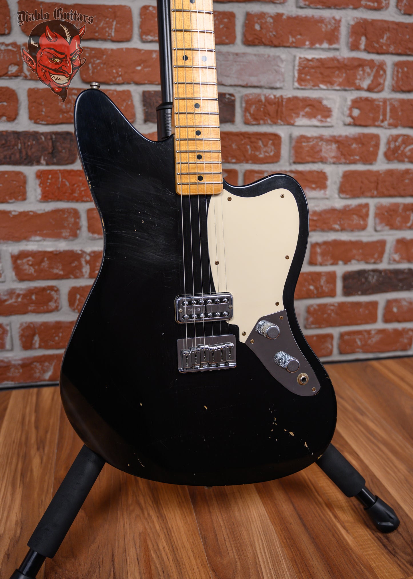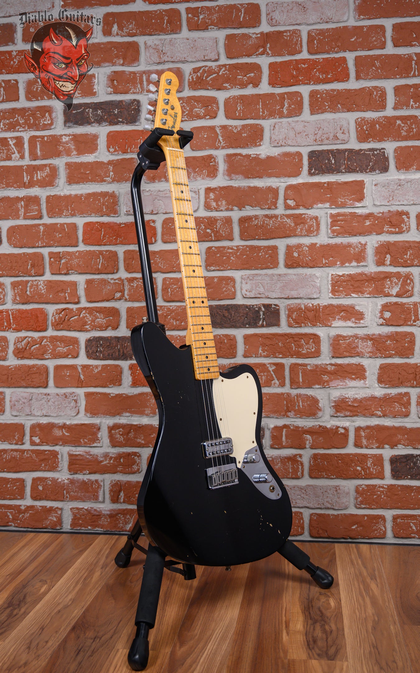 Fender Custom Shop Limited Edition La Cabronita Gato Gordo Jazzmaster Relic in Aged Black finish made in 2014 with Original Hard Shell Case. This guitar features a solid alder body, quartersawn maple neck and maple fingerboard with a telecaster headstock. Equipped with a single TV Jones Power ‘Tron in the bridge position, Controlled by 1 volume and 1 tone pot with grease Bucket tone circuit. The 25.5" scale length neck has Black dot inlays and Black side markers with 21 6105 narrow tall frets on a 9.5" radius with a large "C" profile. The hardware is comprised of Aged chrome Sperzel Sealed Die-Cast tuning machines with pearloid cloche heads, a bone nut, a Fender American Series Hardtail bridge with Stainless Steel Saddles and chrome knurled flat top knobs with a 1-Ply parchment relic pickguard.
