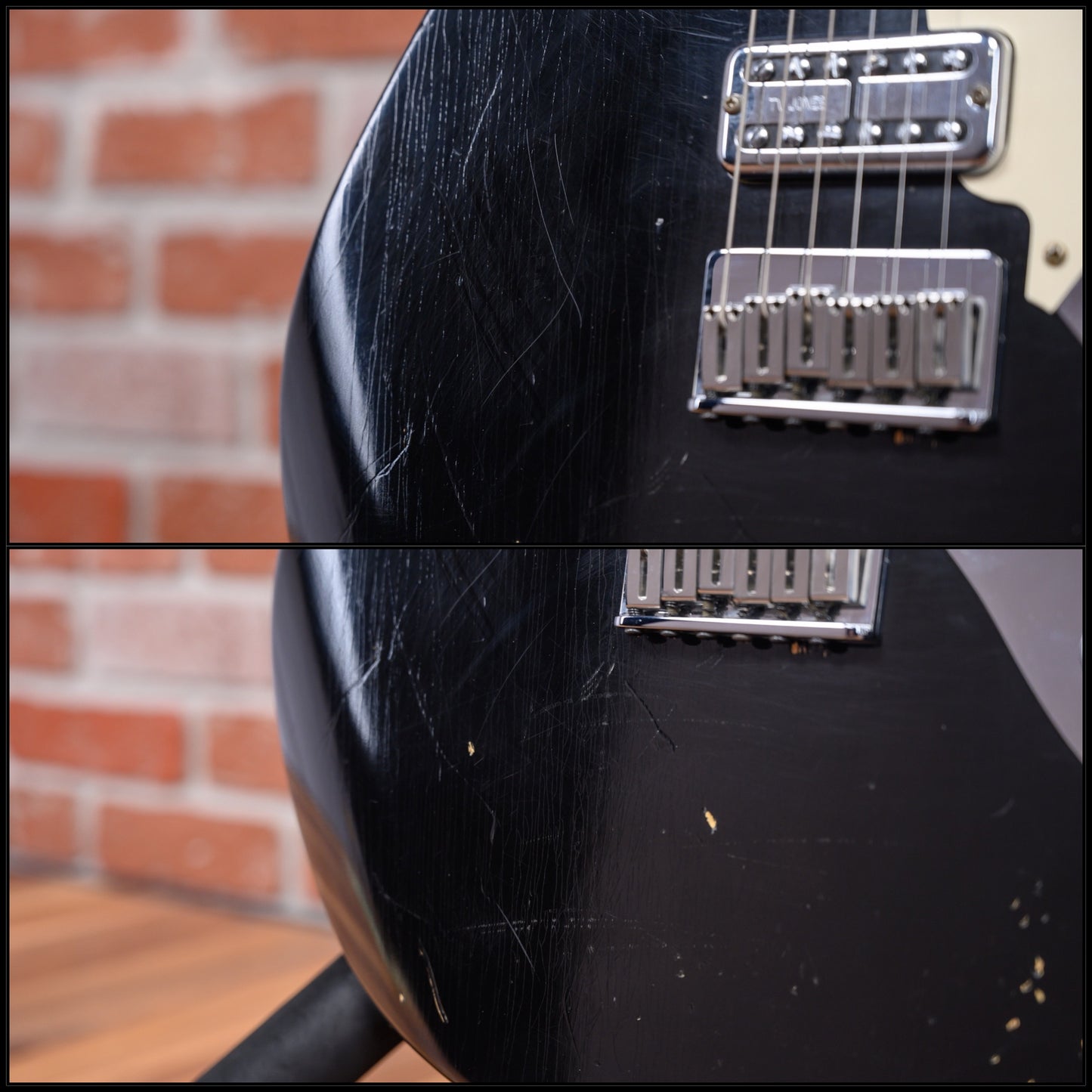 This guitar is in overall very good condition with some signs of play. This guitar isa factory relic but we believe the heavy picking marks on the upper body above the strings are not factory. One case latch is broken.(See Pics)