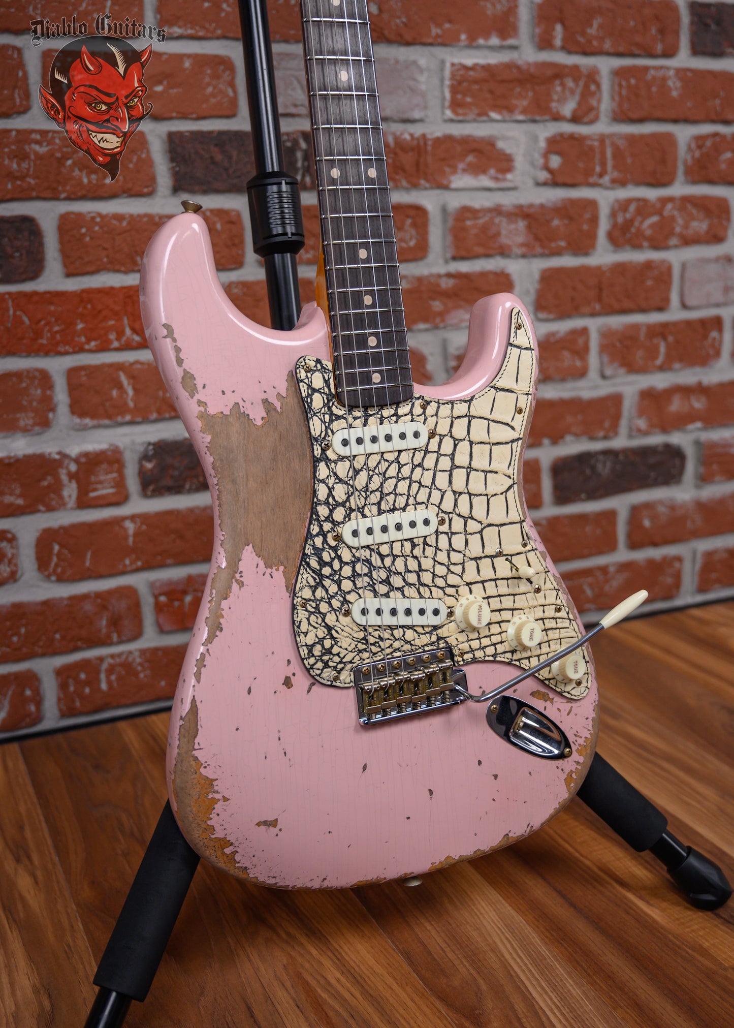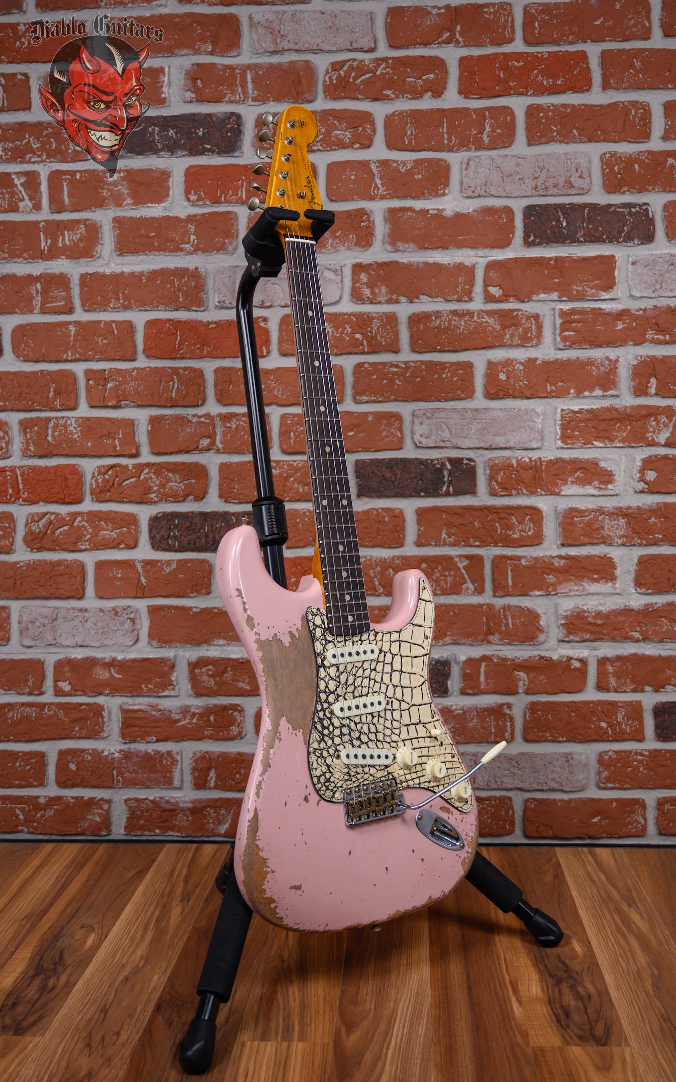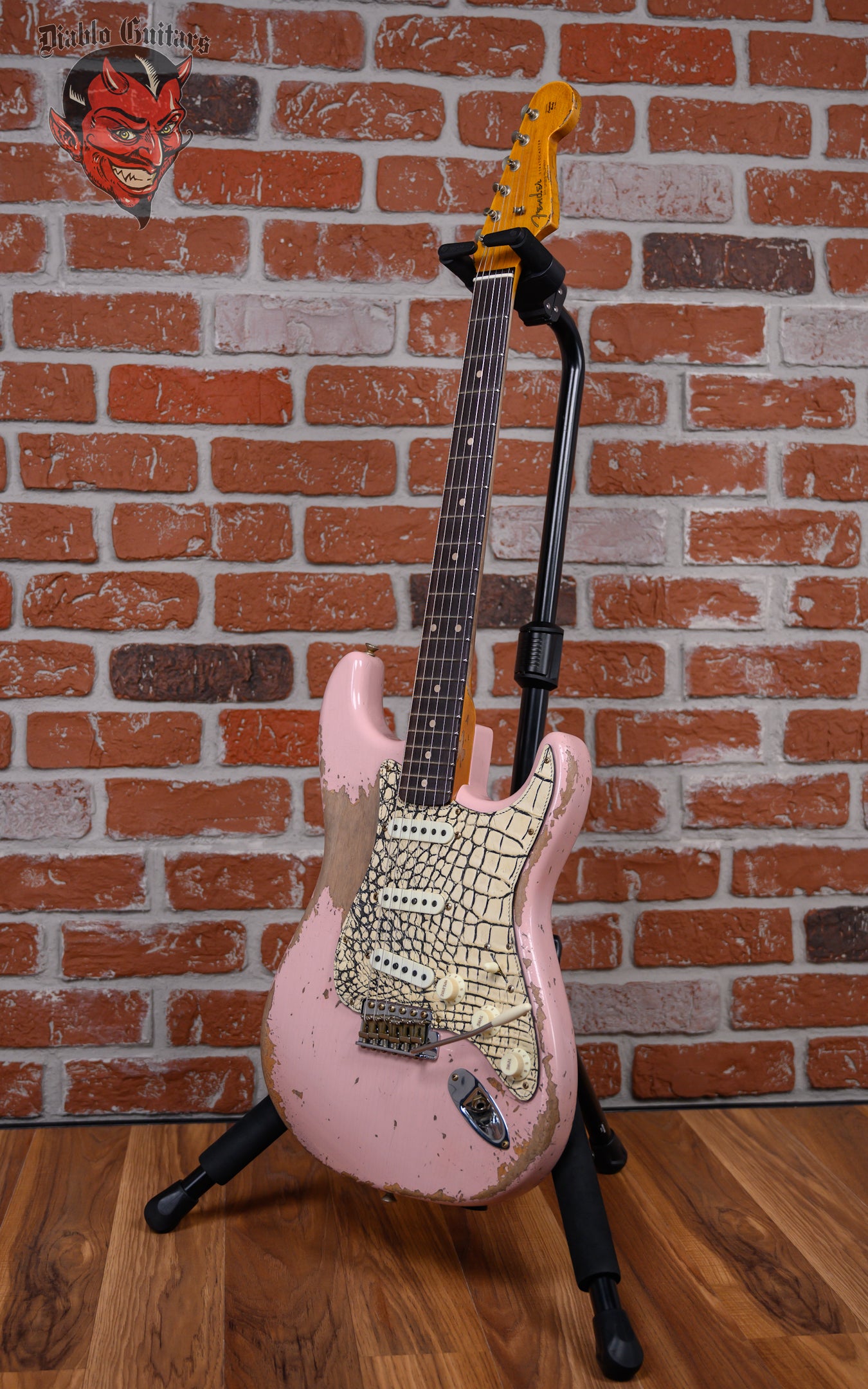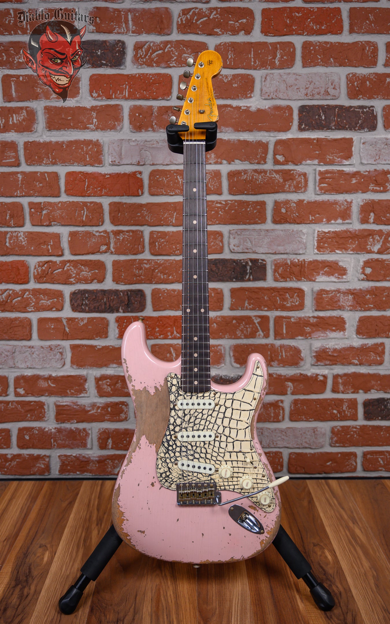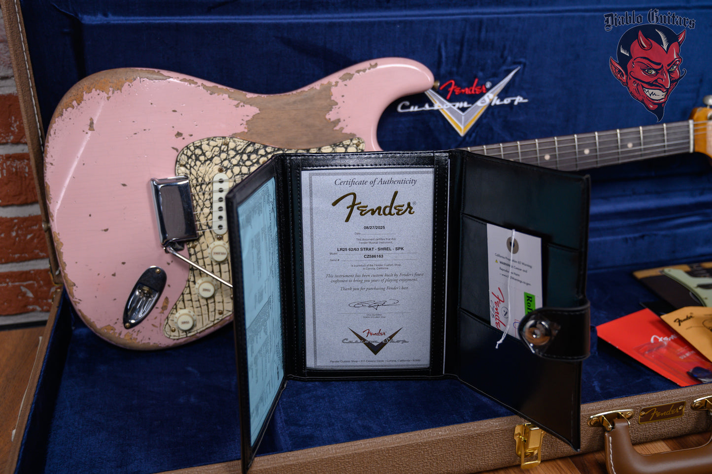 New Fender Custom Shop LR25 ‘62-‘63 Stratocaster Super Heavy Relic in Shell Pink finish made in 2025 with Original Hard Shell Case. This guitar features a solid alder body, quartersawn maple neck and guitar cited AAA 9mm rosewood fingerboard. Equipped with a Fender handwound 60/63 single coil strat relic in the neck position, a Fender handwound 60/63 single coil strat relic RWRP in the middle position, and a Fender handwound 60/63 single coil strat relic in the bridge position. Controlled by 1 volume, 2 tone pots and a 5-Way blade switch with vintage mod #2 wiring. The 25.5" scale length neck has white micarta dot inlays, micarta white side markers with 21 6105 narrow tall frets on a 9.5" radius with a ‘63 strat style "C" profile. The hardware is comprised of aged nickel Fender logo vintage style relic tuning machines with oval heads, a bone nut, a Fender american vintage strat tremolo bridge relic and vintage white top hat knobs with a Hand-made Boos Leather custom alligator skin leather pickguard with matching guitar pick-holder.