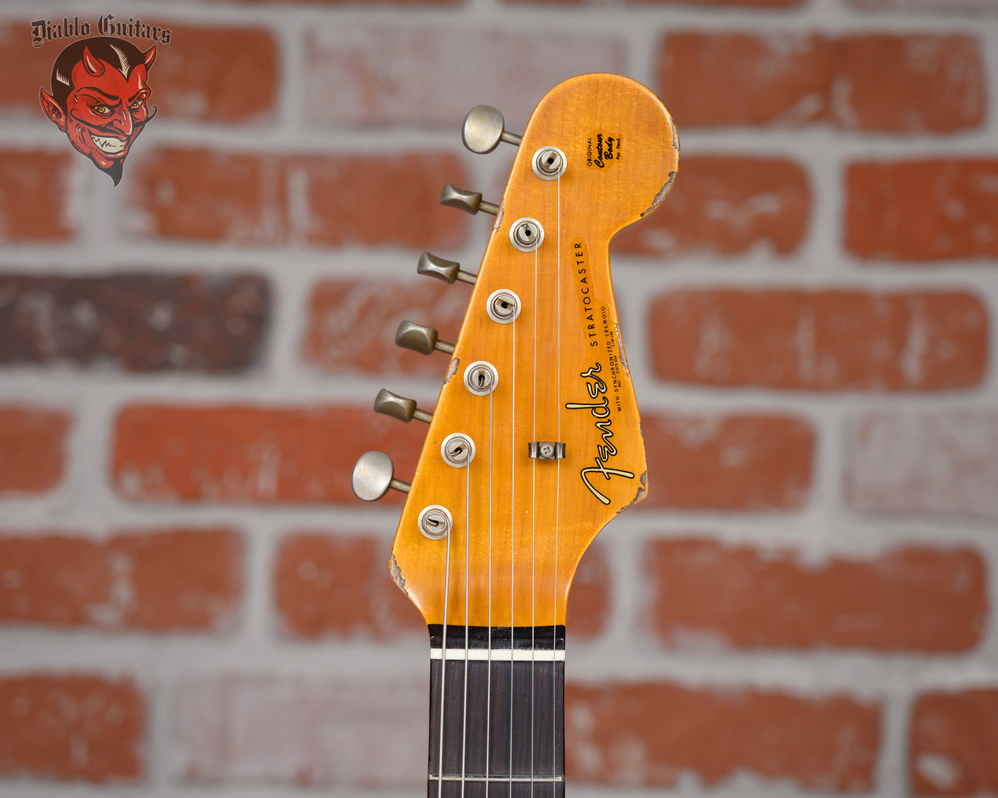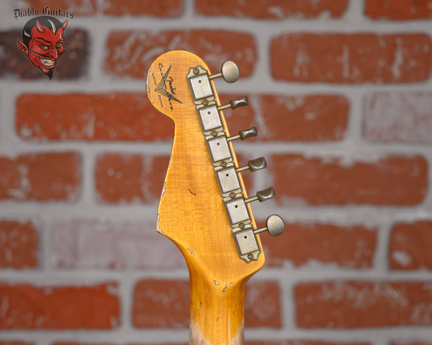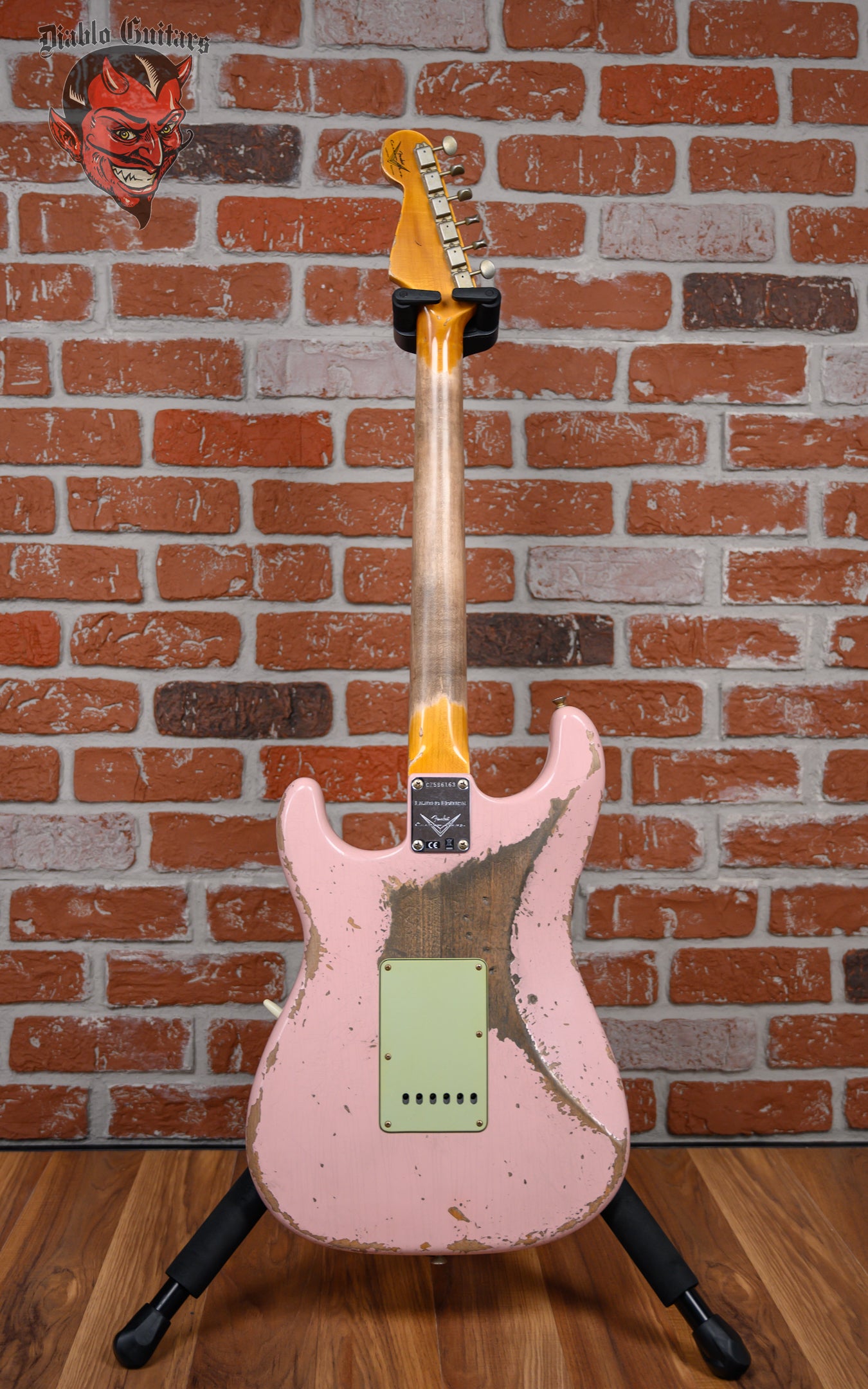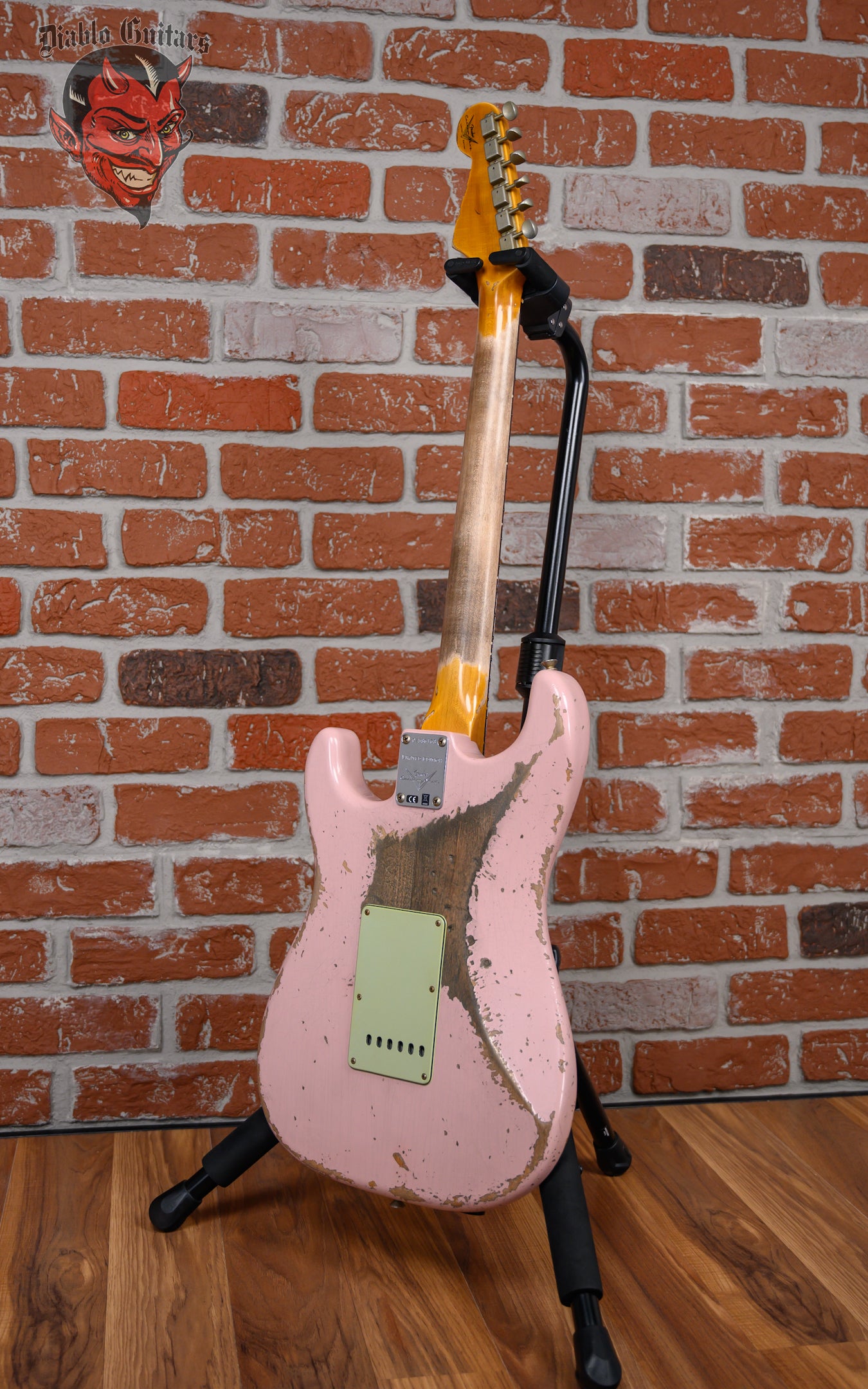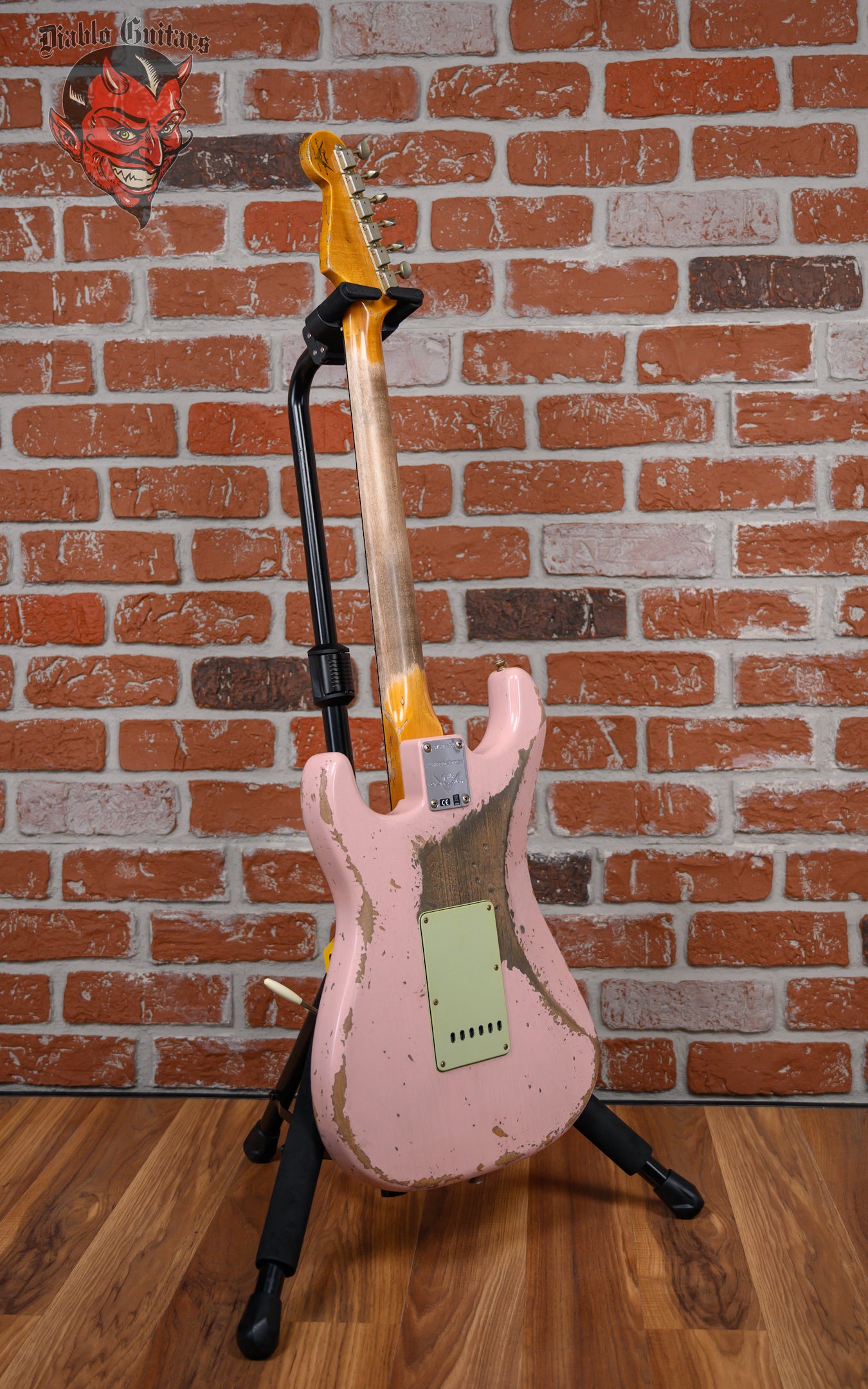 New Fender Custom Shop LR25 ‘62-‘63 Stratocaster Super Heavy Relic in Shell Pink finish made in 2025 with Original Hard Shell Case. This guitar features a solid alder body, quartersawn maple neck and guitar cited AAA 9mm rosewood fingerboard. Equipped with a Fender handwound 60/63 single coil strat relic in the neck position, a Fender handwound 60/63 single coil strat relic RWRP in the middle position, and a Fender handwound 60/63 single coil strat relic in the bridge position. Controlled by 1 volume, 2 tone pots and a 5-Way blade switch with vintage mod #2 wiring. The 25.5" scale length neck has white micarta dot inlays, micarta white side markers with 21 6105 narrow tall frets on a 9.5" radius with a ‘63 strat style "C" profile. The hardware is comprised of aged nickel Fender logo vintage style relic tuning machines with oval heads, a bone nut, a Fender american vintage strat tremolo bridge relic and vintage white top hat knobs with a Hand-made Boos Leather custom alligator skin leather pickguard with matching guitar pick-holder.