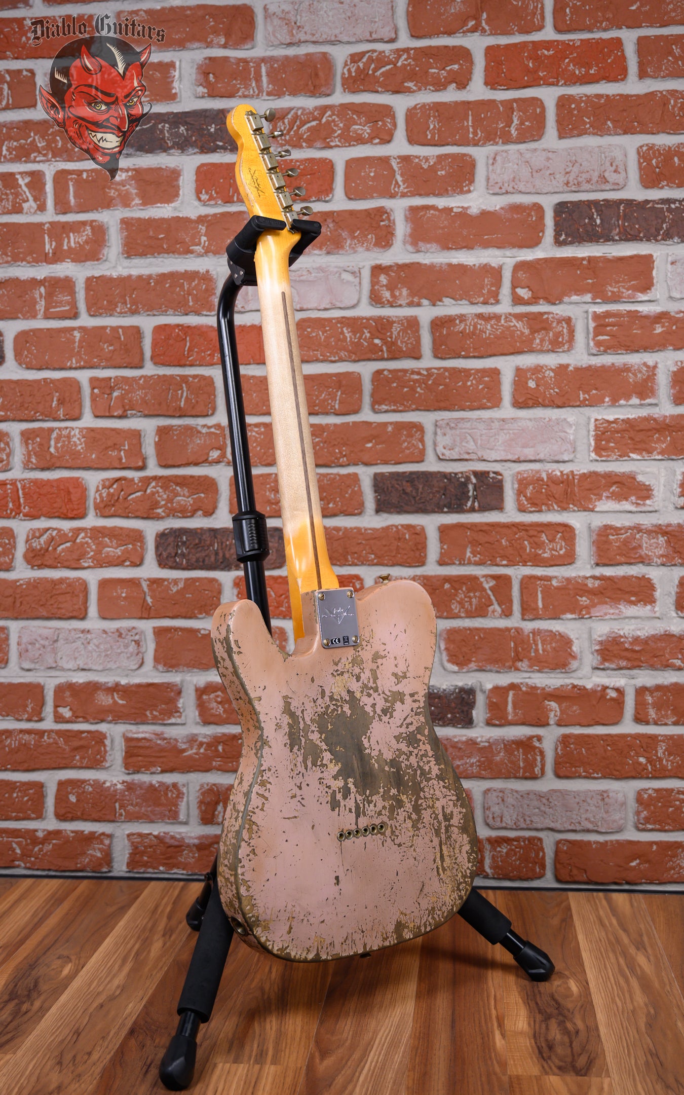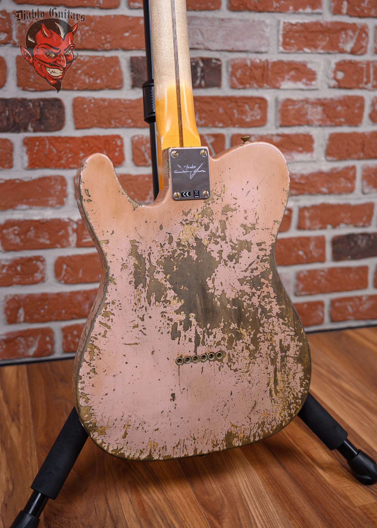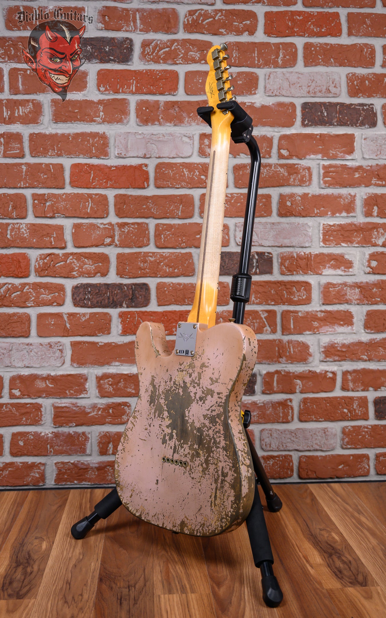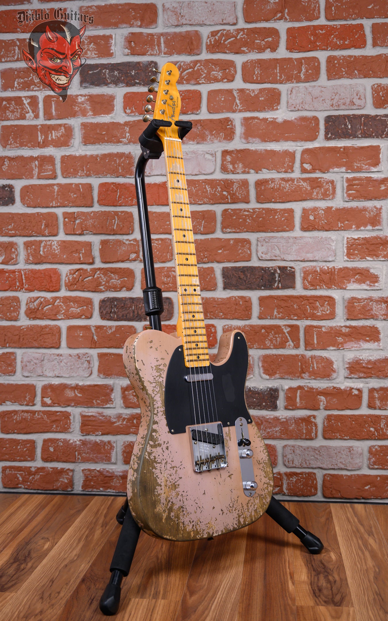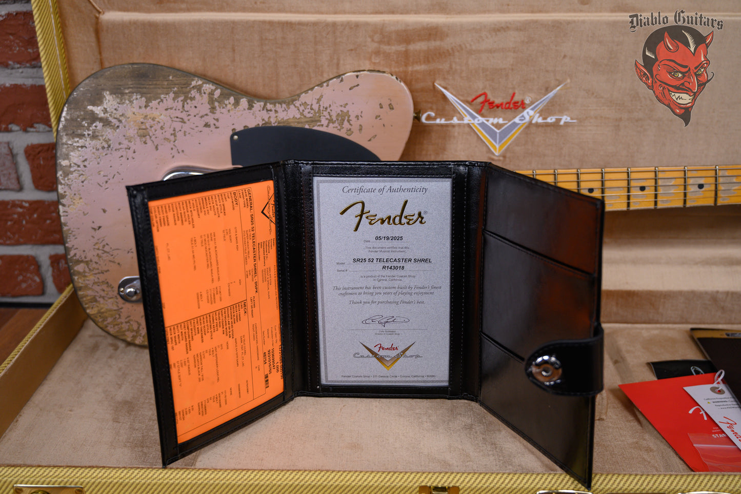 New Fender Custom Shop SR25 ‘52 Telecaster Super Heavy Relic in Aged Dirty Shell Pink finish made in 2025 with Original Hard Shell Case. This guitar features a solid ash body, quartersawn maple neck and maple fingerboard. Equipped with a pair of Fender custom shop Hand-Wound '50-'51 blackguard single coils in the neck position and bridge position. Controlled by 1 volume, 1 tone pot and a 3-Way blade switch in ‘51 mod Nocaster wiring. The 25.5" scale length neck has black micarta dot inlays and black micarta side markers with 21 narrow tall 6105 frets on a 9.5" radius with a soft ‘57 ‘V' profile. The hardware is comprised of aged nickel/chrome Fender Vintage-Style logo tuning machines with oval heads, a bone nut, a Fender 3-Saddle american vintage Strings-Through-Body tele bridge with brass saddles and chrome knurled dome knobs with a 1-Ply black 51 nocaster relic pickguard.