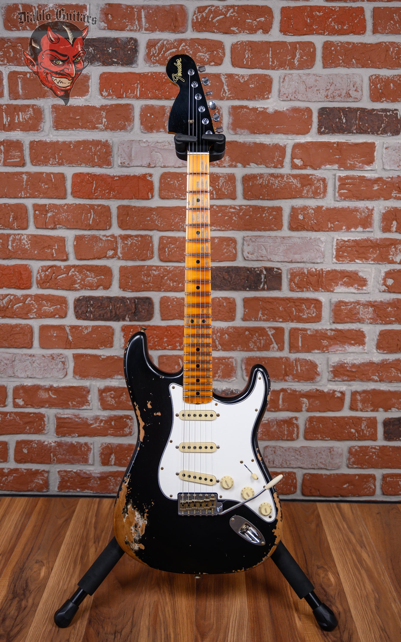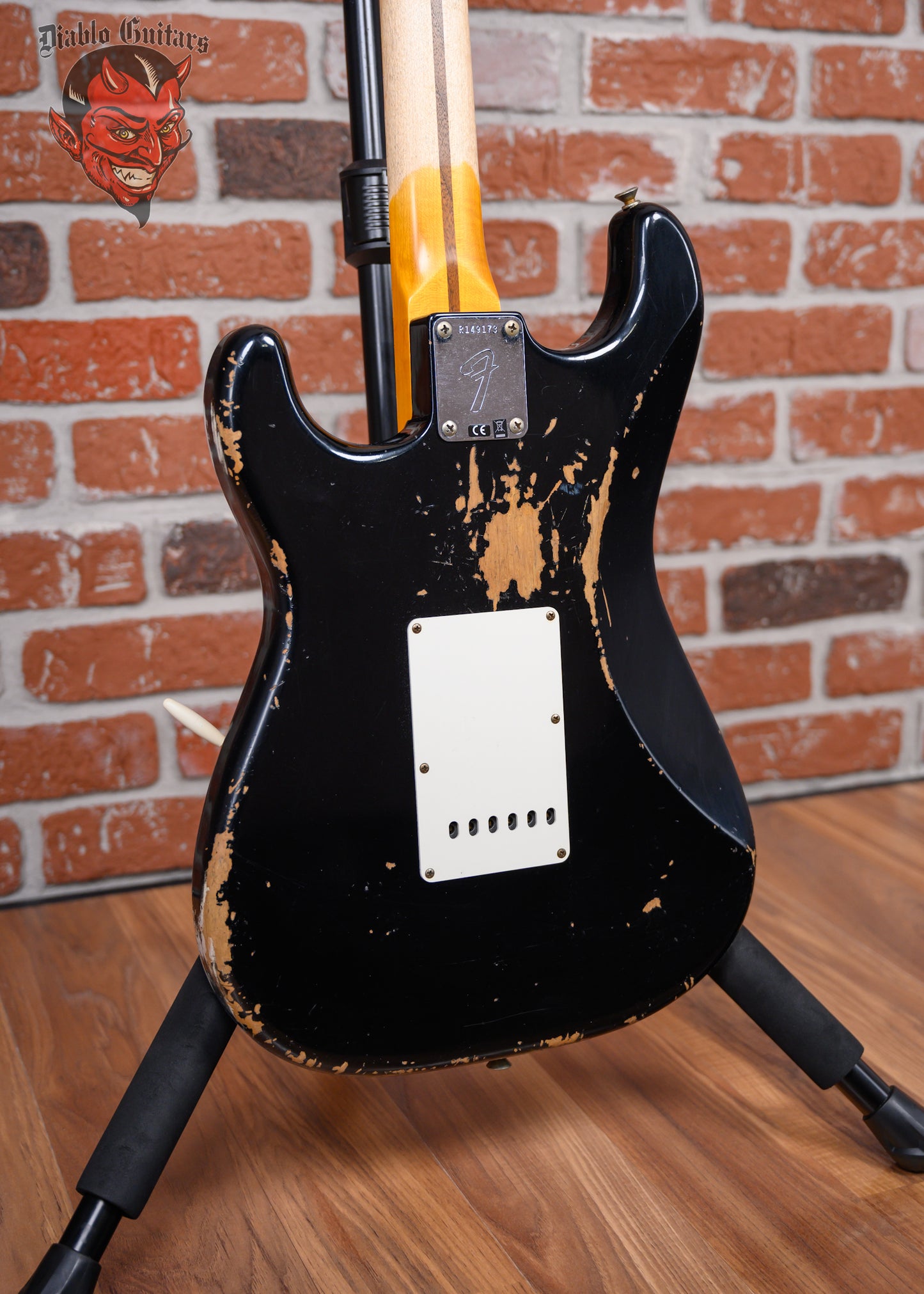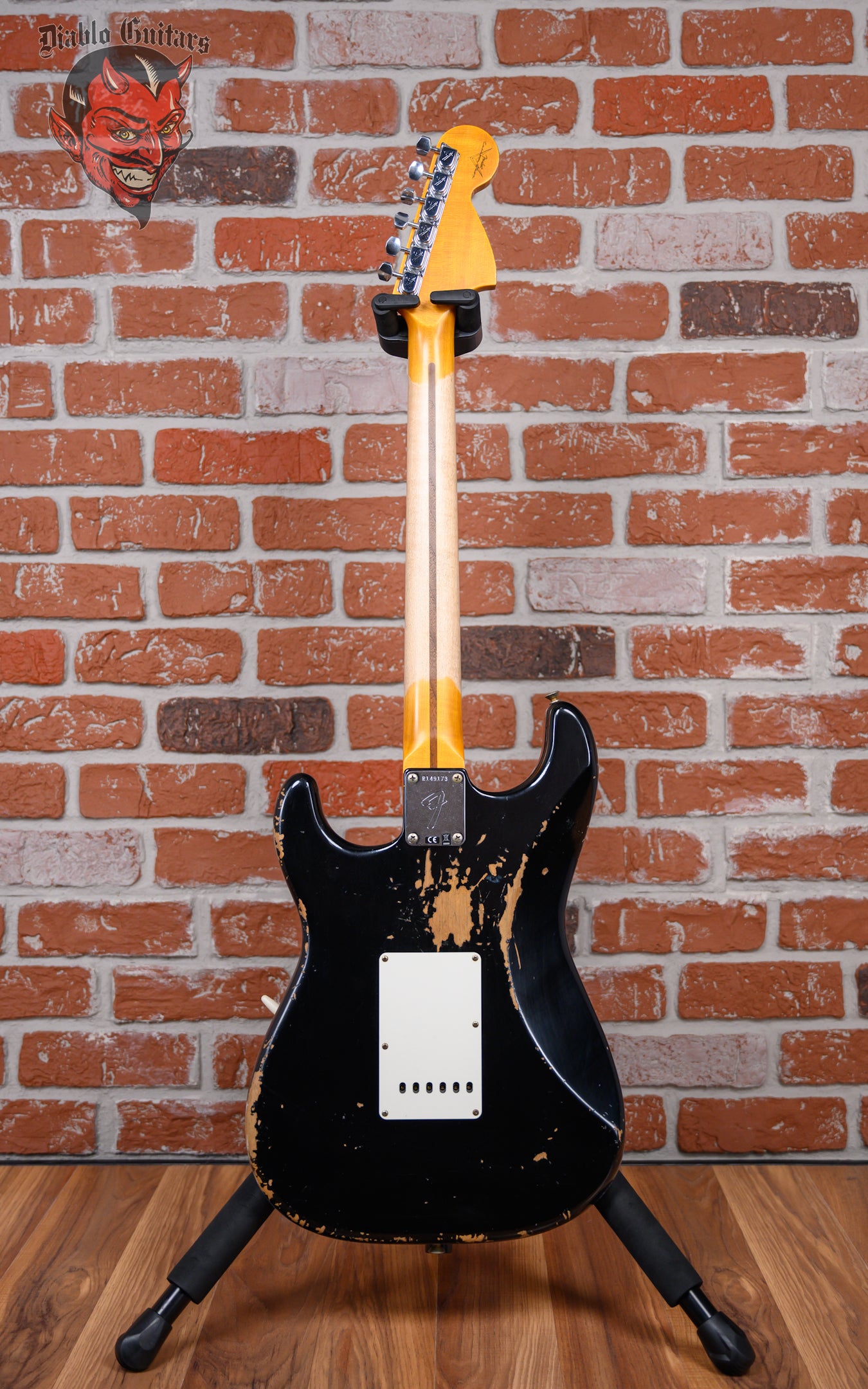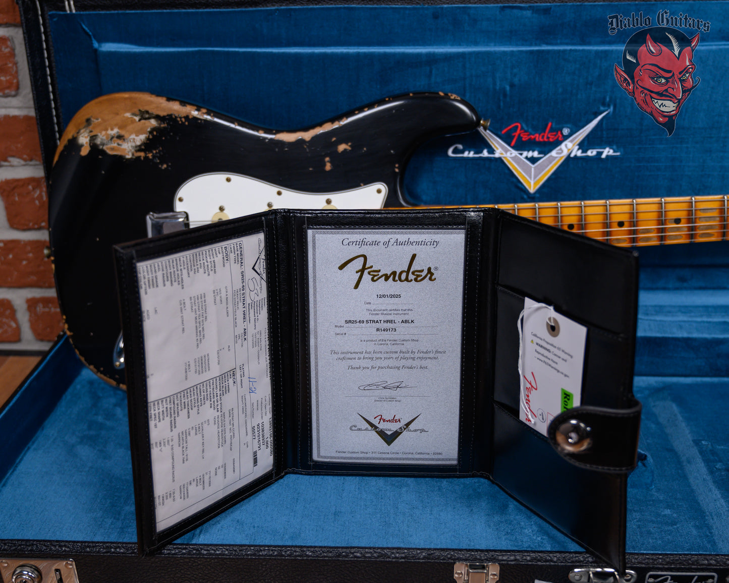 New Fender Custom Shop SR25-69 Stratocaster Heavy Relic in Black finish made in 2025 with Original Hard Shell Case. This guitar features a solid alder body, quartersawn maple neck and maple fingerboard with a reverse, color matched headstock. Equipped with a Fender Handwound 69 Strat in the neck position, a Fender Handwound Strat Fat 50's in the middle position and a Handwound Strat Texas Special in the bridge position. Controlled by 1 volume, 2 tone pots and a 5-Way blade switch with vintage mod wiring. The 25.5" scale length neck has black micarta dot inlays and black micarta side markers with 21 Dunlop 6105 narrow tall frets on a compound 7.25"-9.5" radius with a 1969 "U" profile. The hardware is comprised of aged nickel/chrome Fender "F" Stamp tuning machines with contemporary cloche heads, a bone nut, a Fender Custom Shop Vintage Strat Tremolo Relic bridge and vintage white top hat knobs with a 63-76 Strat 3-ply parchment nitro Relic pickguard.