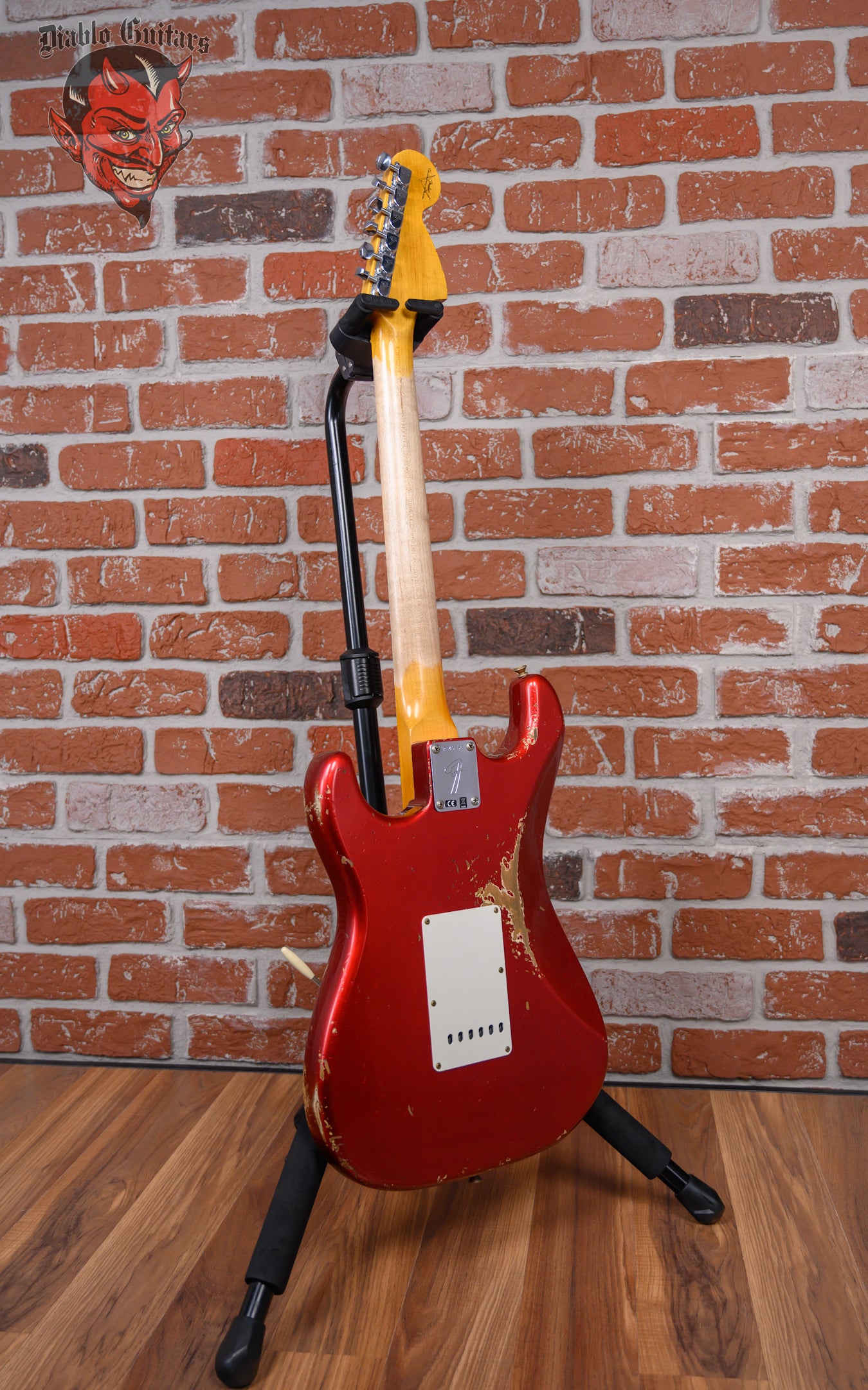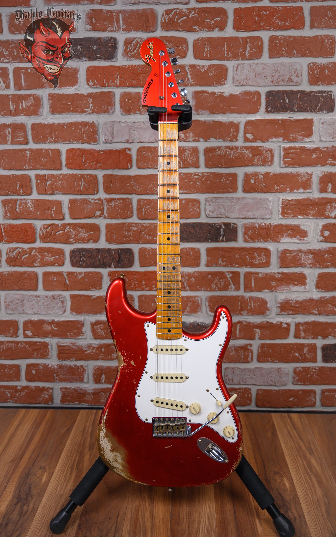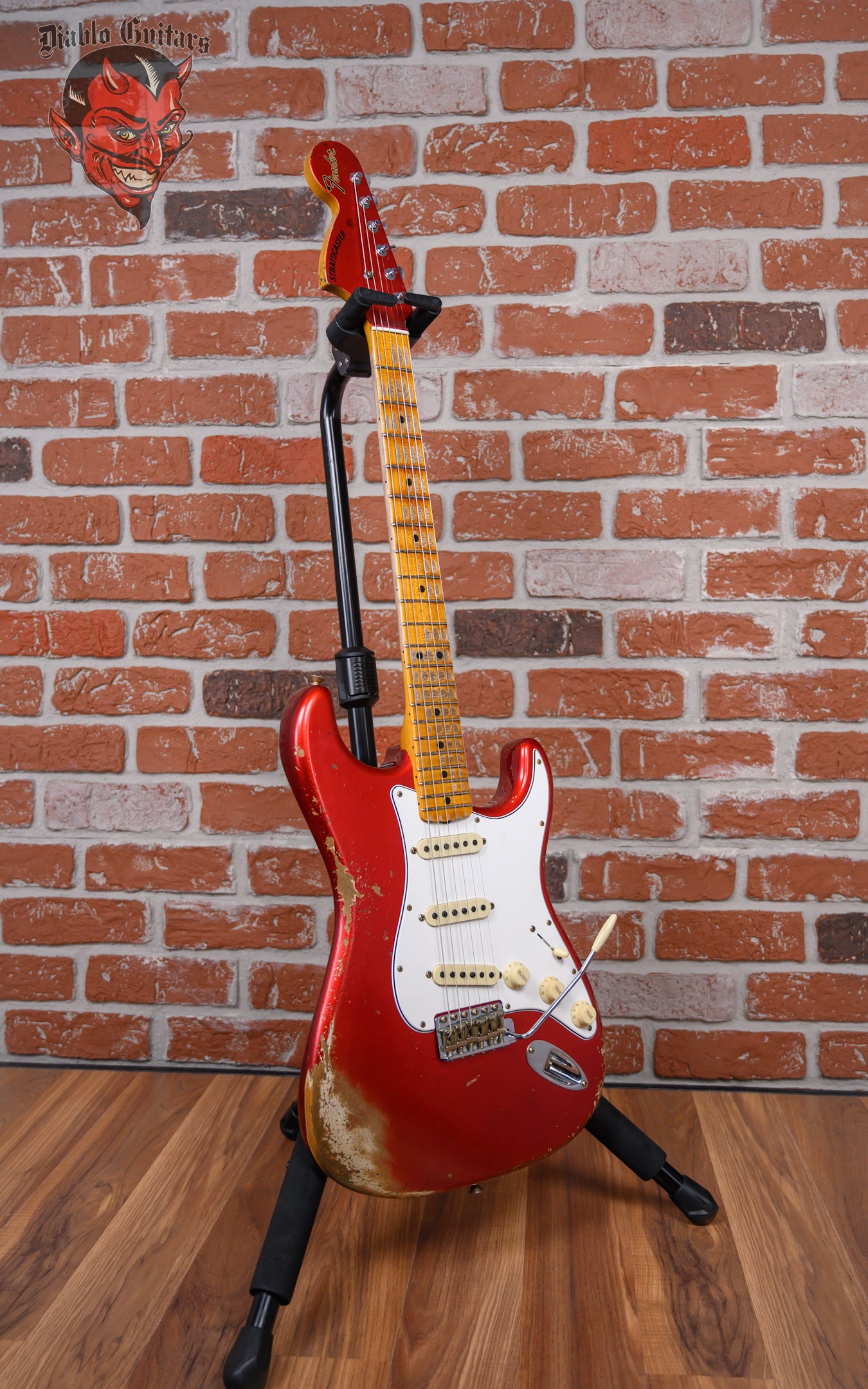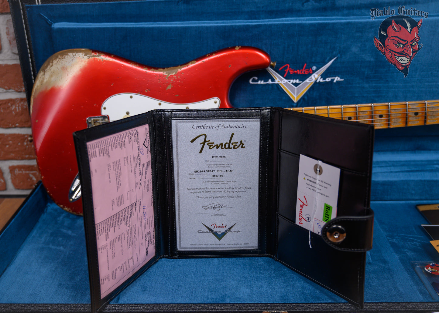 New Fender Custom Shop SR25-69 Stratocaster Heavy Relic in Candy Apple Red finish made in 2025 with Original Hard Shell Case. This guitar features a solid alder body, quartersawn maple neck and maple fingerboard with a reverse, color matched headstock. Equipped with a Fender Handwound 69 Strat in the neck position, a Fender Handwound Strat Fat 50's in the middle position and a Handwound Strat Texas Special in the bridge position. Controlled by 1 volume, 2 tone pots and a 5-Way blade switch with vintage mod wiring. The 25.5" scale length neck has black micarta dot inlays and black micarta side markers with 21 Dunlop 6105 narrow tall frets on a compound 7.25"-9.5" radius with a 1969 "U" profile. The hardware is comprised of aged nickel/chrome Fender "F" Stamp tuning machines with contemporary cloche heads, a bone nut, a Fender Custom Shop Vintage Strat Tremolo Relic bridge and vintage white top hat knobs with a 63-76 Strat 3-ply parchment nitro Relic pickguard.