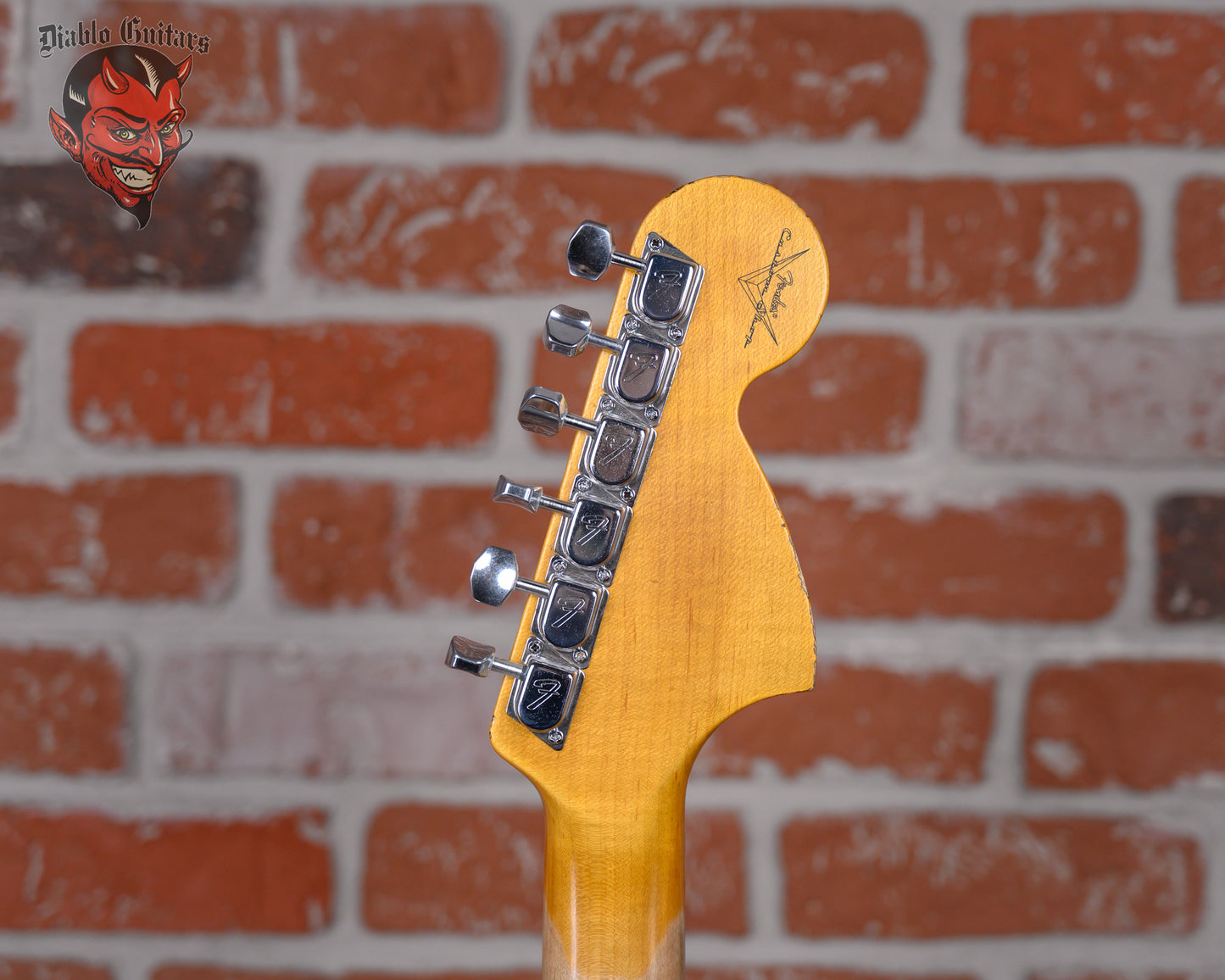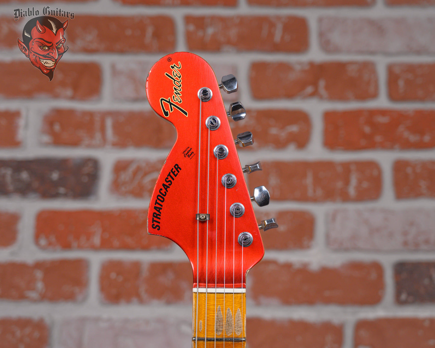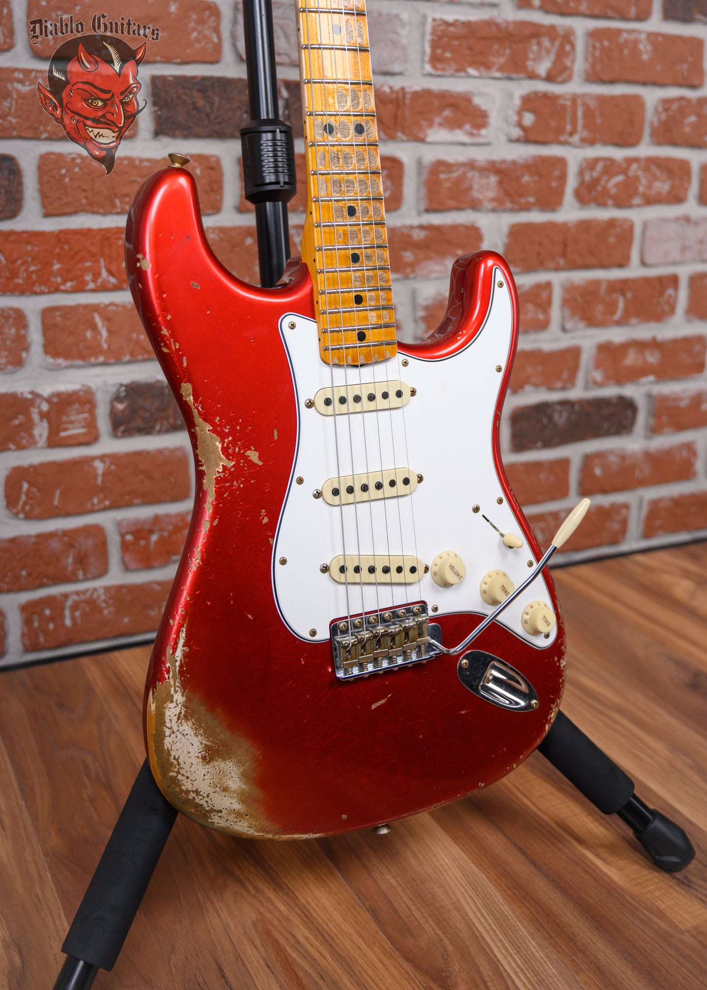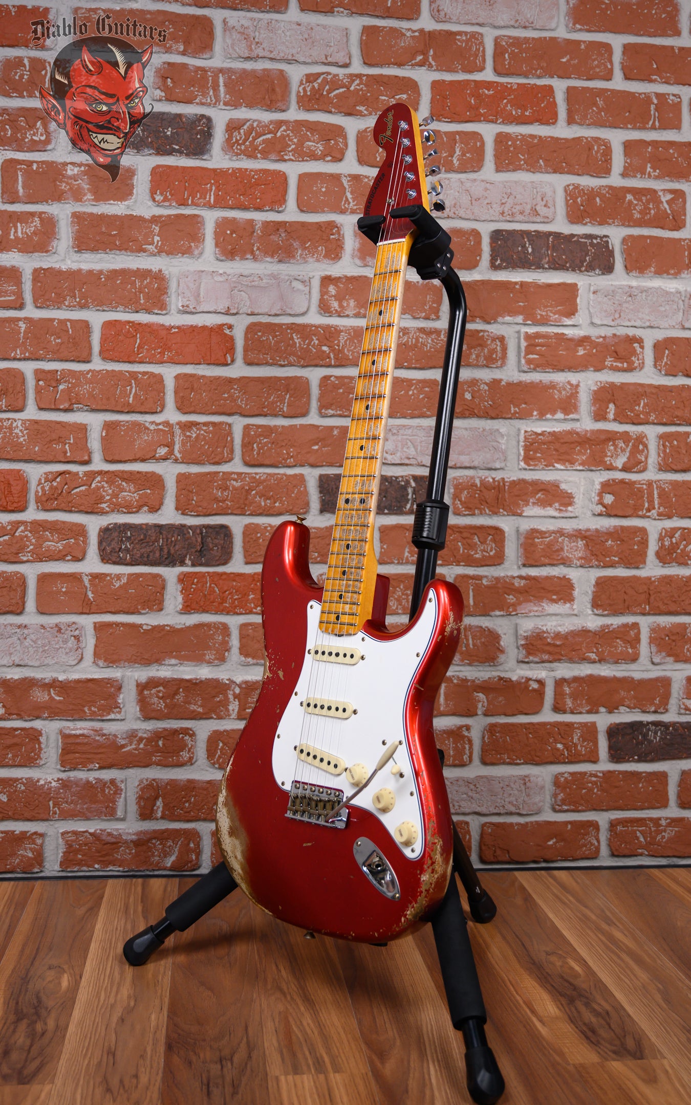 New Fender Custom Shop SR25-69 Stratocaster Heavy Relic in Candy Apple Red finish made in 2025 with Original Hard Shell Case. This guitar features a solid alder body, quartersawn maple neck and maple fingerboard with a reverse, color matched headstock. Equipped with a Fender Handwound 69 Strat in the neck position, a Fender Handwound Strat Fat 50's in the middle position and a Handwound Strat Texas Special in the bridge position. Controlled by 1 volume, 2 tone pots and a 5-Way blade switch with vintage mod wiring. The 25.5" scale length neck has black micarta dot inlays and black micarta side markers with 21 Dunlop 6105 narrow tall frets on a compound 7.25"-9.5" radius with a 1969 "U" profile. The hardware is comprised of aged nickel/chrome Fender "F" Stamp tuning machines with contemporary cloche heads, a bone nut, a Fender Custom Shop Vintage Strat Tremolo Relic bridge and vintage white top hat knobs with a 63-76 Strat 3-ply parchment nitro Relic pickguard.