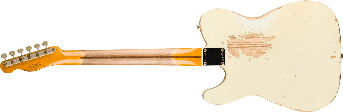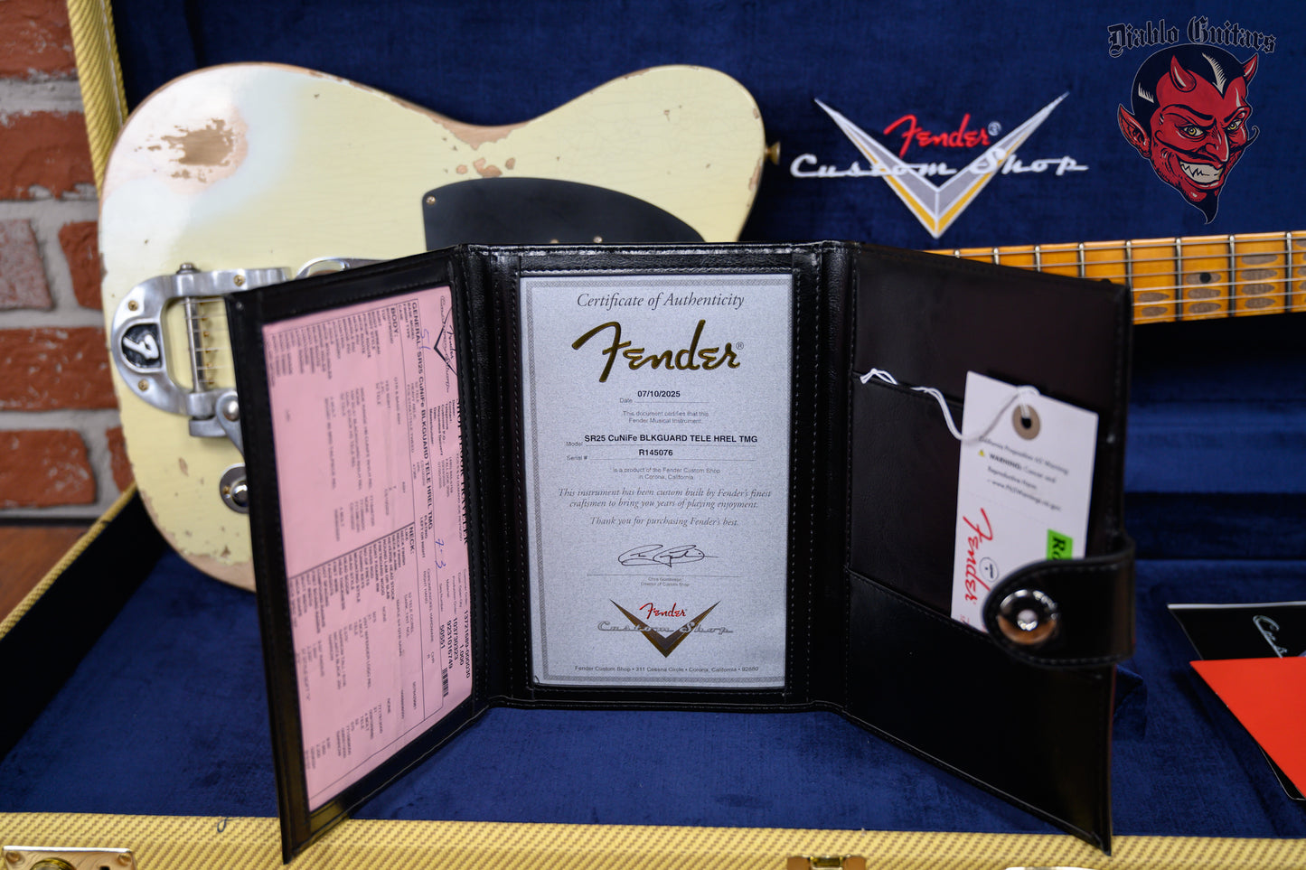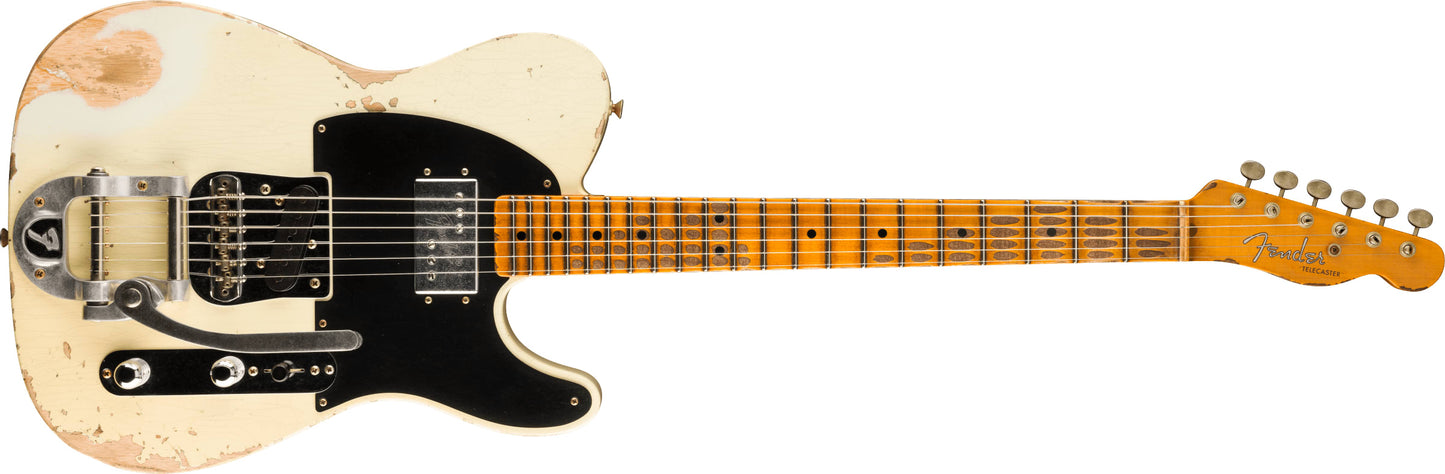 New Fender Custom Shop SR25 CuNiFe Blackguard Telecaster Heavy Relic in Tomatillo Green finish made in 2025 with Original Hard Shell Case. This guitar features a solid ash body, quartersawn maple neck and maple fingerboard. Equipped with a Fender Wide-Range cunife® humbucking in the neck position and a Fender custom shop Hand-Wound '50-'51 blackguard in the bridge position. Controlled by 1 volume, 1 tone pot and a 3-Way blade switch in tele dual stack hs wiring. The 25.5" scale length neck has black micarta dot inlays and black micarta side markers with 21 narrow tall 6105 frets on a 9.5" radius with a 57 soft style "V" profile. The hardware is comprised of aged relic nickel/chrome Fender vintage style tuning machines with oval heads, a bone nut, a Bigsby B5 bridge/vibrato tailpiece and chrome knurled dome knobs with a 51 nocaster 1-ply black w/cunife relic pickguard.