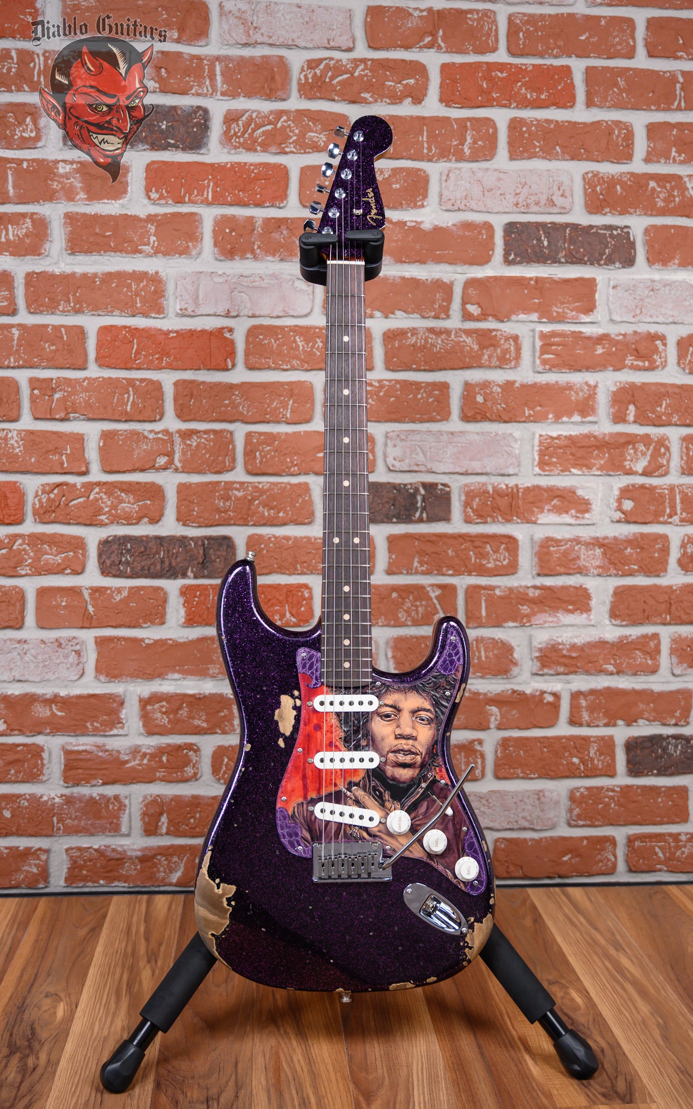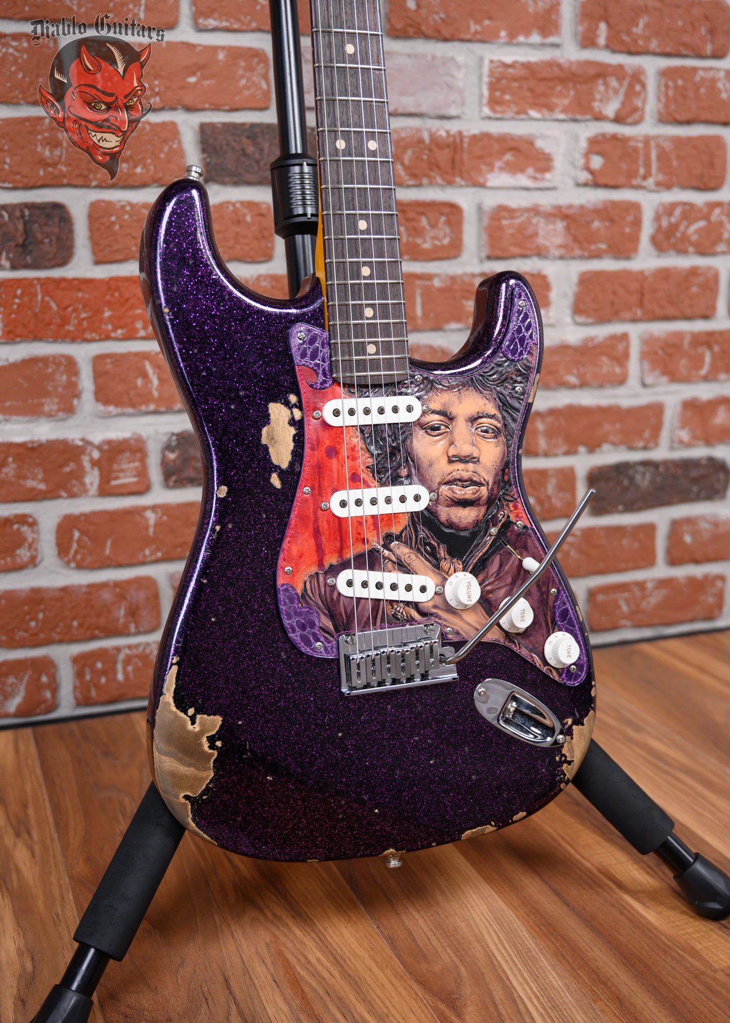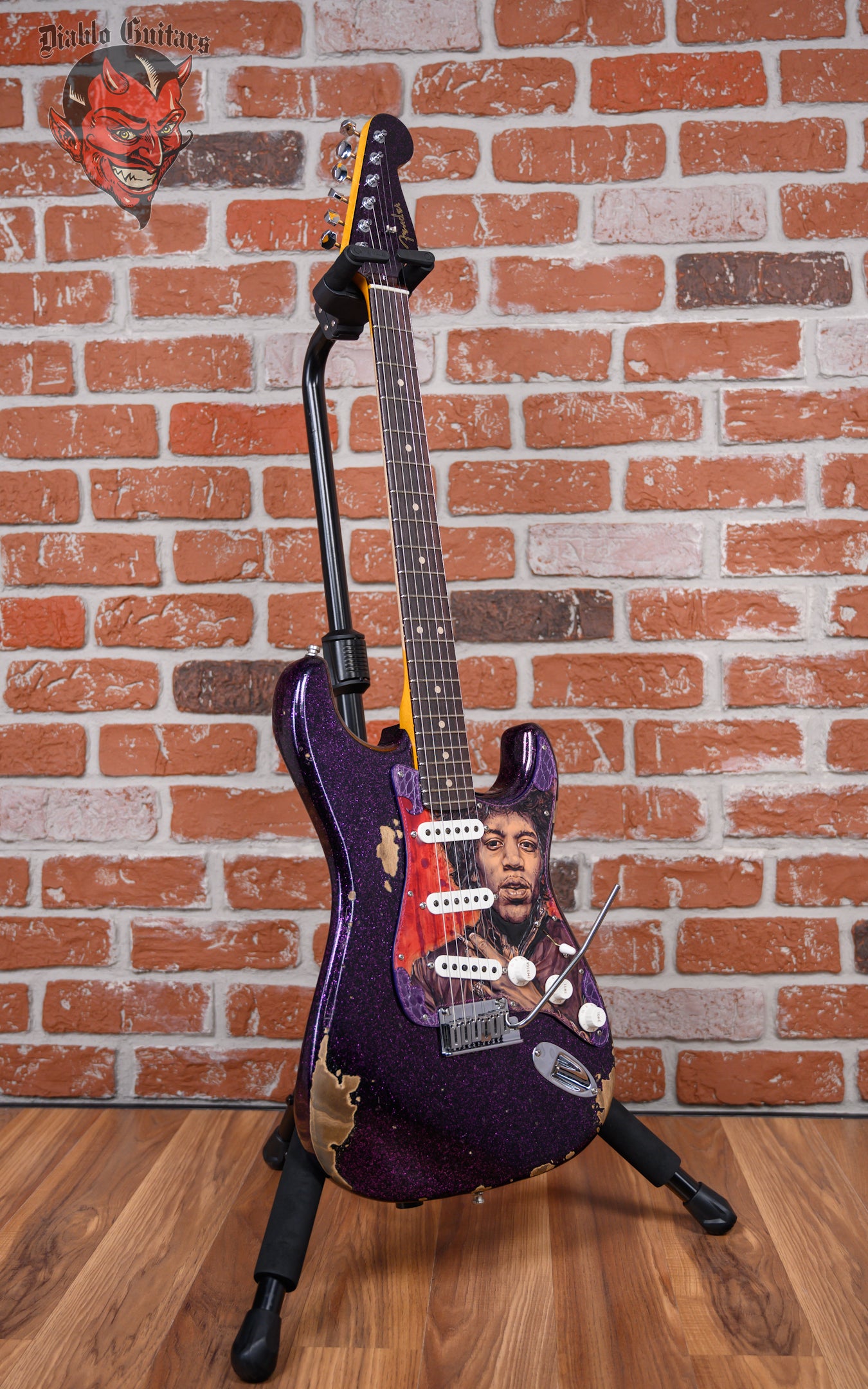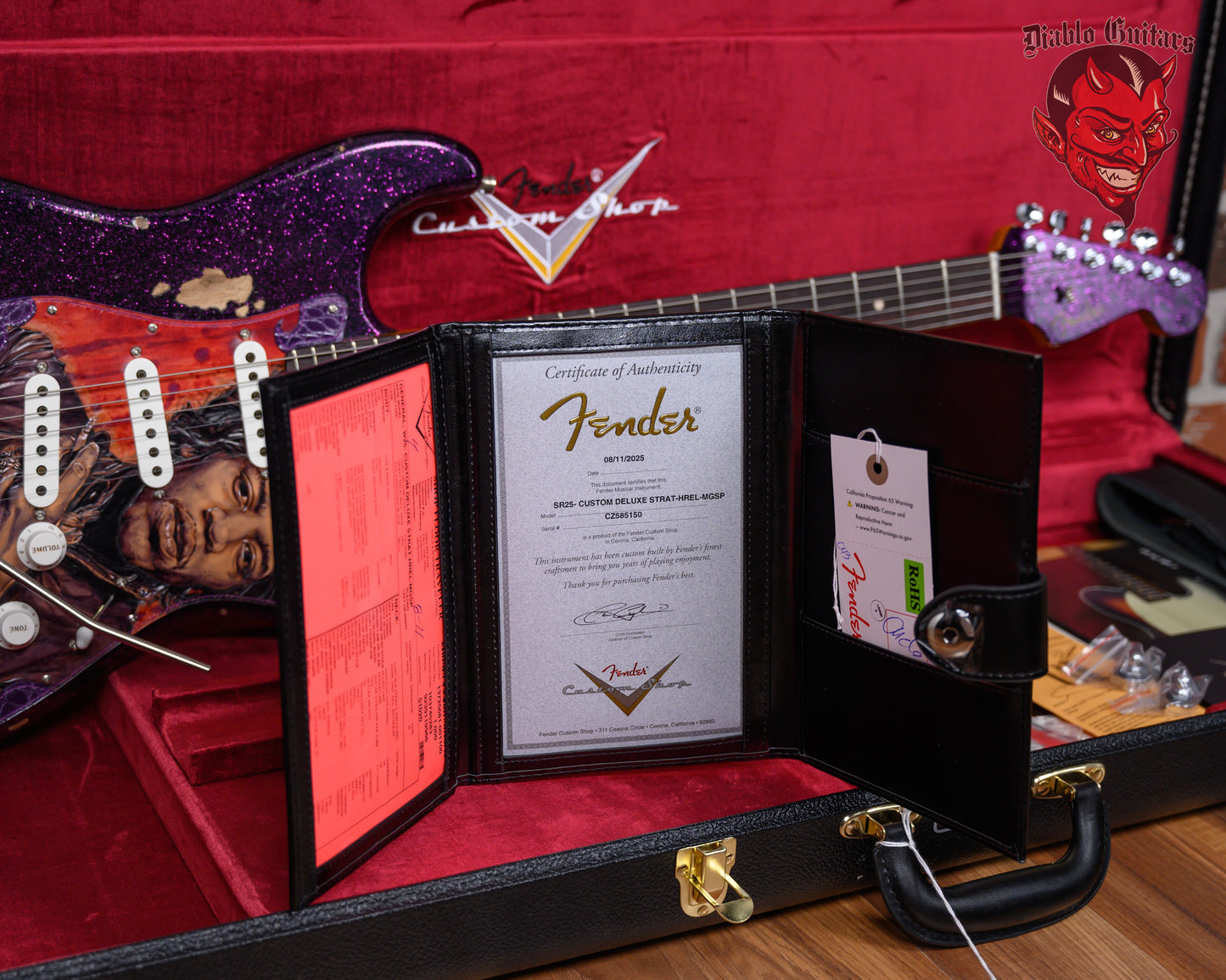 New Fender Custom Shop SR25 Custom Deluxe Stratocaster Heavy Relic in Magenta Sparkle finish made in 2025 with Original Hard Shell Case. This guitar features a solid ash body, quartersawn maple neck and guitar cites 9mm AAA rosewood fingerboard with a color matched headstock. Equipped with a Fender handwound fat 60's strat CC in the neck position, a Fender handwound fat 60's strat RWRP CC in the middle position, and a Fender handwound fat 60's strat CC in the bridge position. Controlled by 1 volume, 2 tone pots and a 5-Way blade switch in vintage mod wiring #2. The 25.5" scale length neck has white micarta dot inlays and micarta white side markers with 22 narrow tall 6105 frets on a 9.5" radius with a 60 style oval C profile. The hardware is comprised of chrome closet classic Fender /Schaller "F" stamp tuning machines with contemporary cloche heads, a bone nut, a Fender 2-Point custom classic tremolo bridge and parchment top hat knobs with a Boos Leather custom pickguard, hand-tooled and painted portrait of Jimi Hendrix with alligator skin accents..
