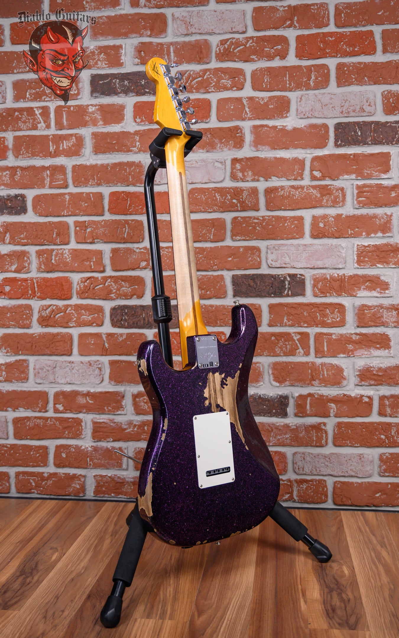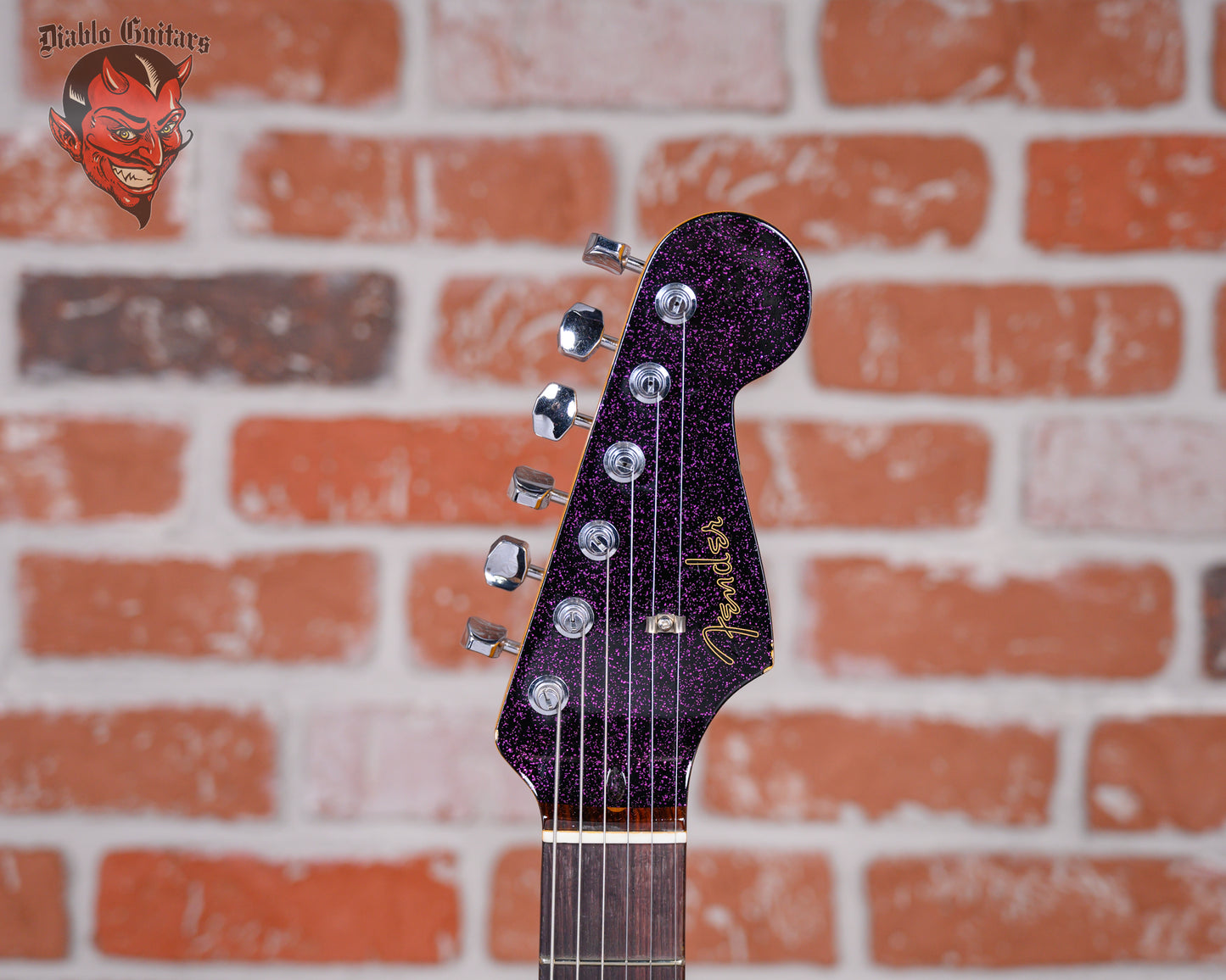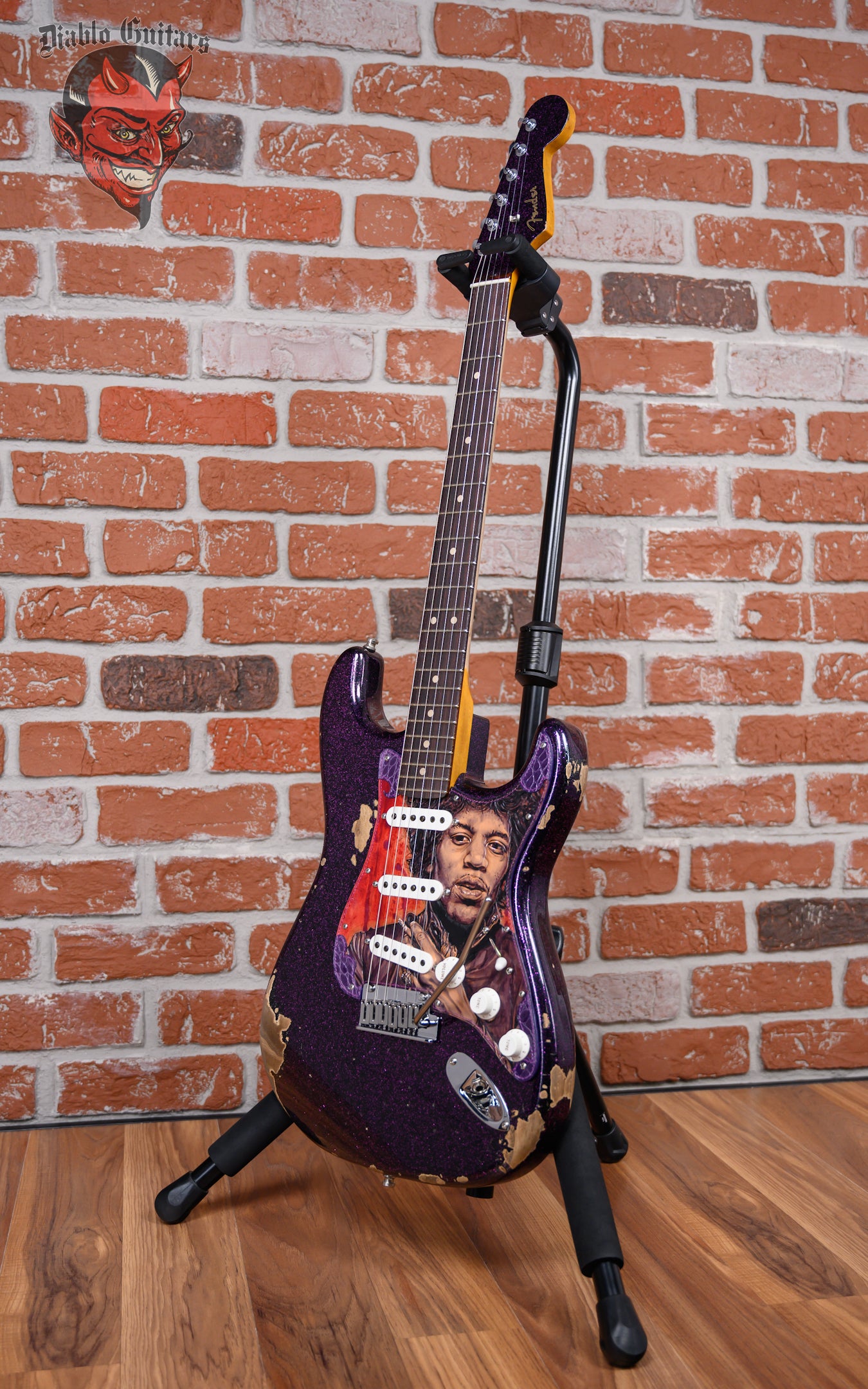 New Fender Custom Shop SR25 Custom Deluxe Stratocaster Heavy Relic in Magenta Sparkle finish made in 2025 with Original Hard Shell Case. This guitar features a solid ash body, quartersawn maple neck and guitar cites 9mm AAA rosewood fingerboard with a color matched headstock. Equipped with a Fender handwound fat 60's strat CC in the neck position, a Fender handwound fat 60's strat RWRP CC in the middle position, and a Fender handwound fat 60's strat CC in the bridge position. Controlled by 1 volume, 2 tone pots and a 5-Way blade switch in vintage mod wiring #2. The 25.5" scale length neck has white micarta dot inlays and micarta white side markers with 22 narrow tall 6105 frets on a 9.5" radius with a 60 style oval C profile. The hardware is comprised of chrome closet classic Fender /Schaller "F" stamp tuning machines with contemporary cloche heads, a bone nut, a Fender 2-Point custom classic tremolo bridge and parchment top hat knobs with a Boos Leather custom pickguard, hand-tooled and painted portrait of Jimi Hendrix with alligator skin accents..