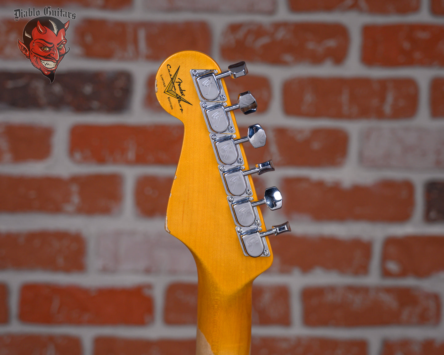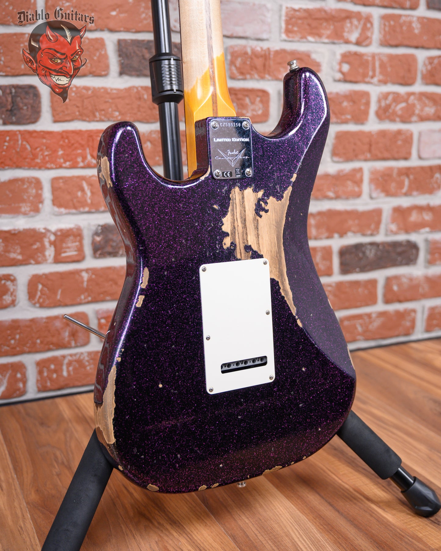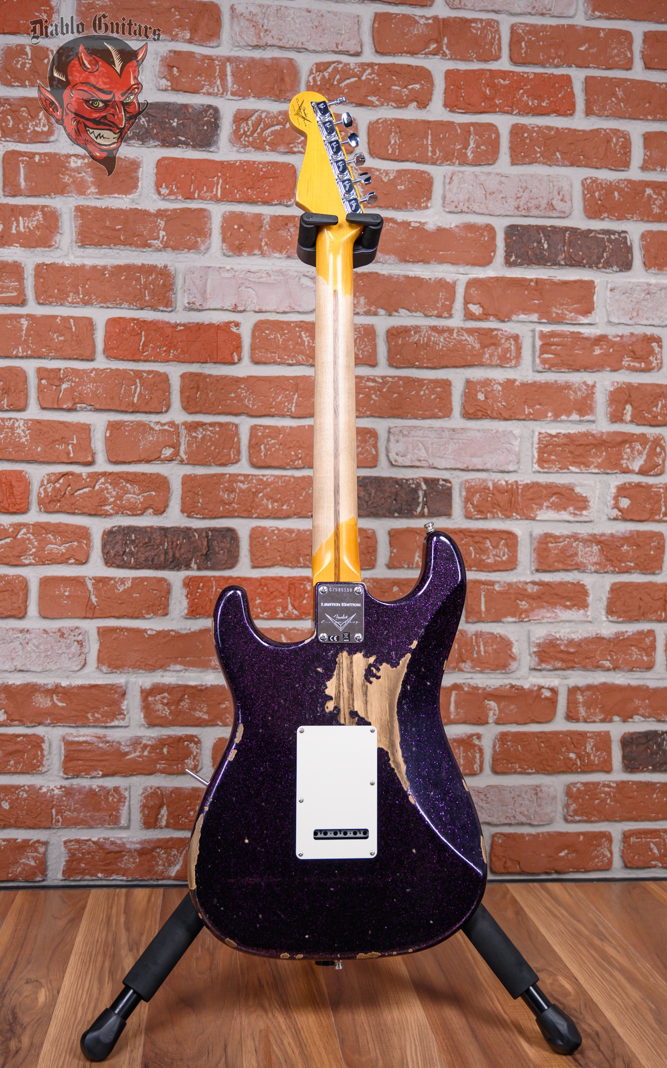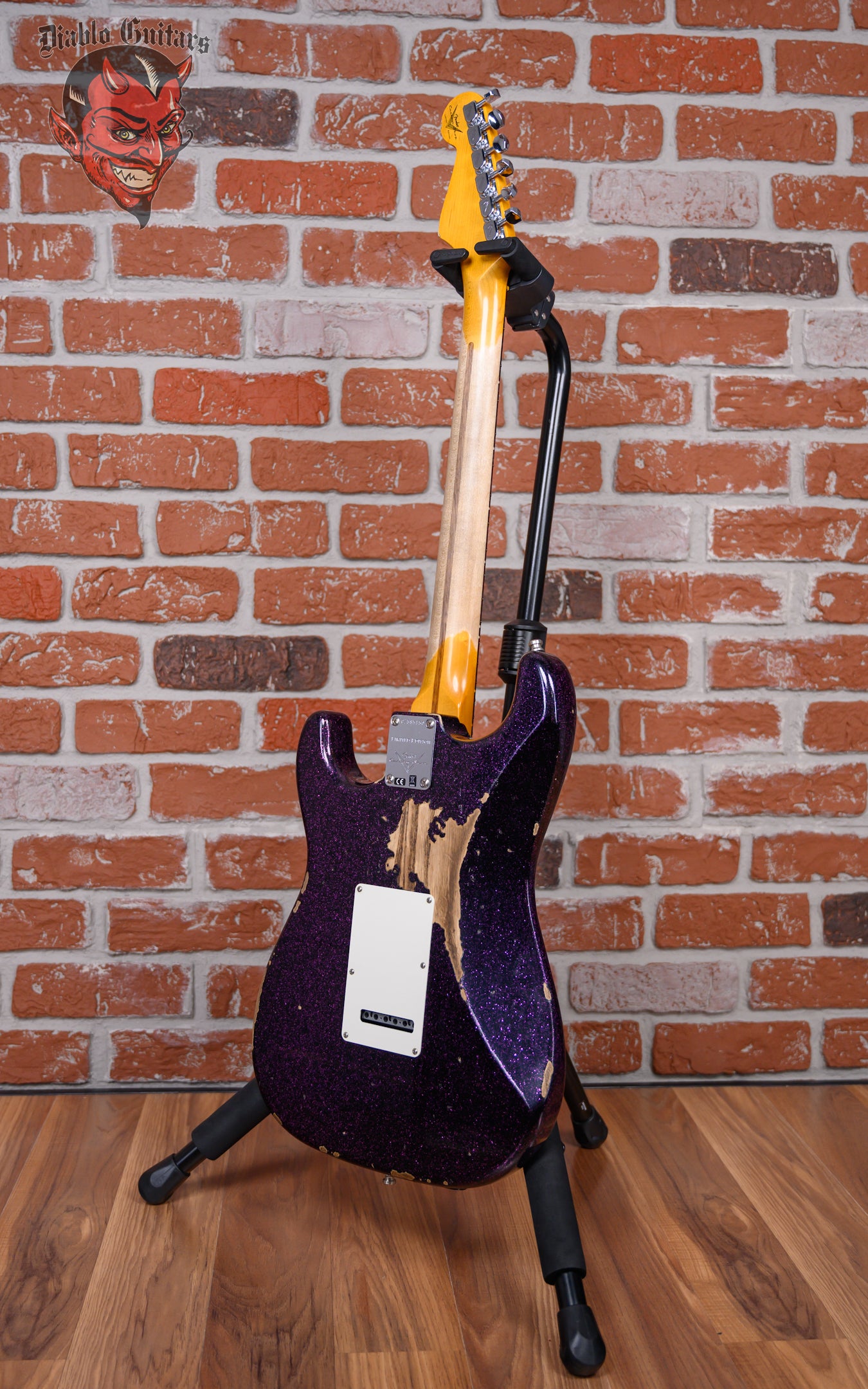 New Fender Custom Shop SR25 Custom Deluxe Stratocaster Heavy Relic in Magenta Sparkle finish made in 2025 with Original Hard Shell Case. This guitar features a solid ash body, quartersawn maple neck and guitar cites 9mm AAA rosewood fingerboard with a color matched headstock. Equipped with a Fender handwound fat 60's strat CC in the neck position, a Fender handwound fat 60's strat RWRP CC in the middle position, and a Fender handwound fat 60's strat CC in the bridge position. Controlled by 1 volume, 2 tone pots and a 5-Way blade switch in vintage mod wiring #2. The 25.5" scale length neck has white micarta dot inlays and micarta white side markers with 22 narrow tall 6105 frets on a 9.5" radius with a 60 style oval C profile. The hardware is comprised of chrome closet classic Fender /Schaller "F" stamp tuning machines with contemporary cloche heads, a bone nut, a Fender 2-Point custom classic tremolo bridge and parchment top hat knobs with a Boos Leather custom pickguard, hand-tooled and painted portrait of Jimi Hendrix with alligator skin accents..
