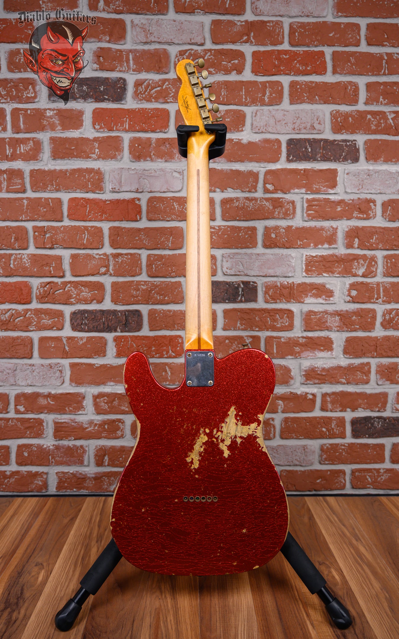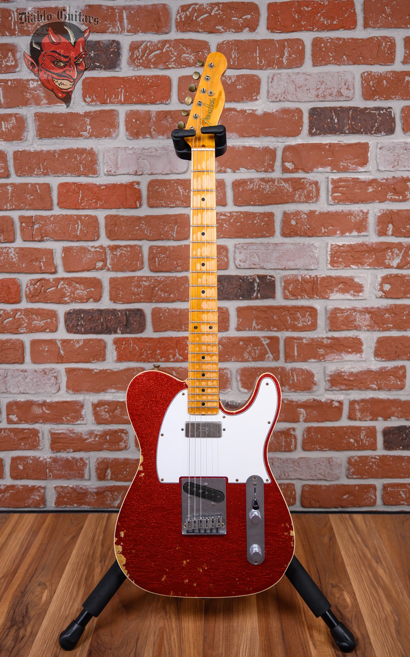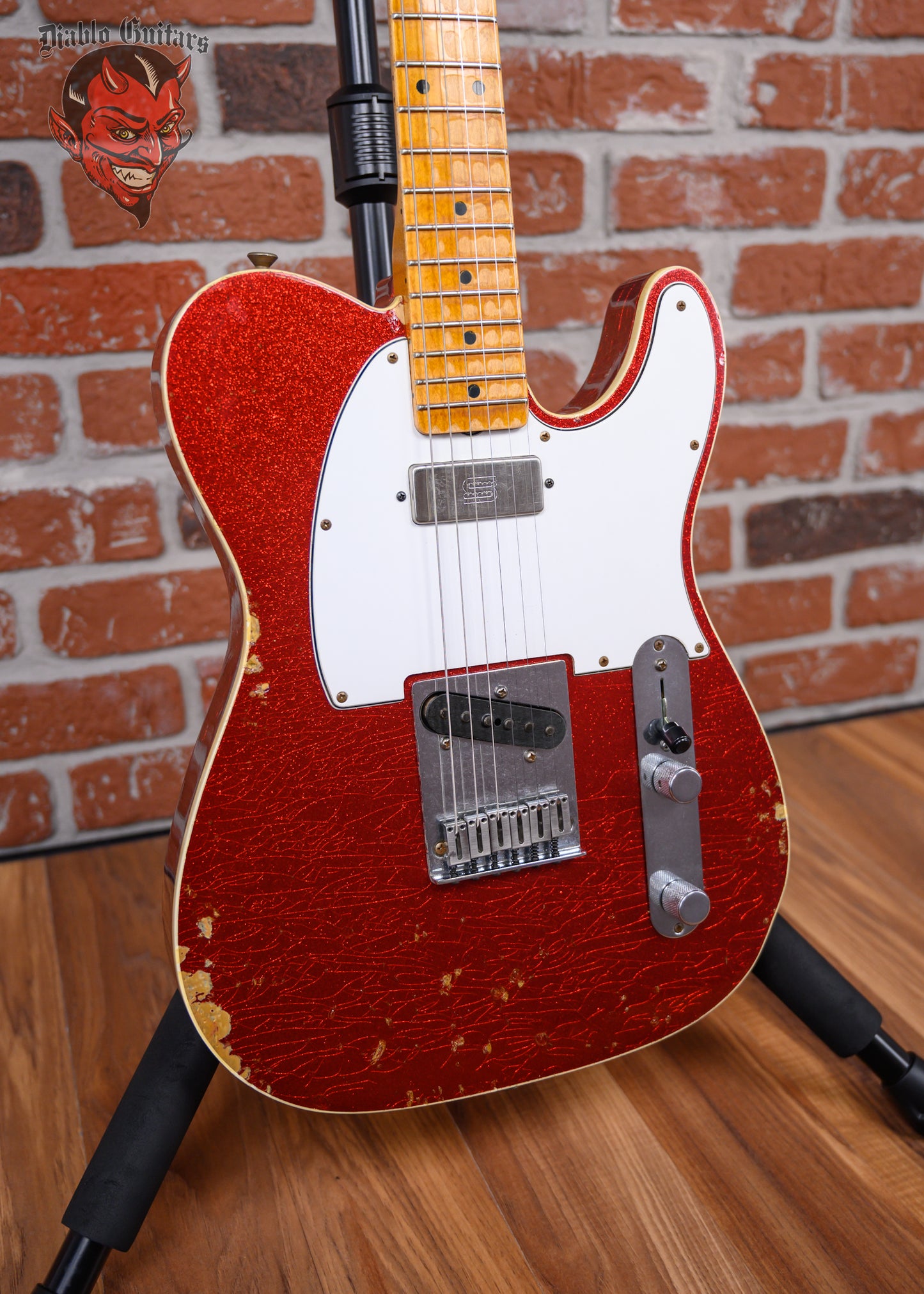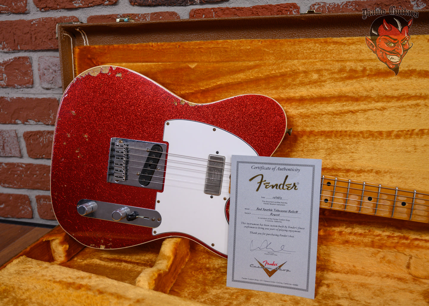 Fender Custom Shop Telecaster Relic in Red Sparkle finish made in 2013 with Original Hard Shell Case. This guitar features a bound solid ash body, quartersawn maple neck and maple fingerboard. Equipped with a Seymour Duncan SM-1N Vintage Mini Humbucker in the neck position and a Fender Handwound ‘63 Telecaster single coil in the bridge position. Controlled by 1 volume, 1 tone pot and a 3-Way blade switch. The 25.5" scale length neck has micarta black dot inlays and black side markers with 21 6105 narrow tall frets on a 9.5" radius with a 52 Style "U" profile. The hardware is comprised of aged nickel/ Aged chrome Fender Vintage Style tuning machines with oval heads, a bone nut, a Fender Custom Deluxe Tele bridge and chrome knurled flat top knobs with a 3-Ply white pickguard.