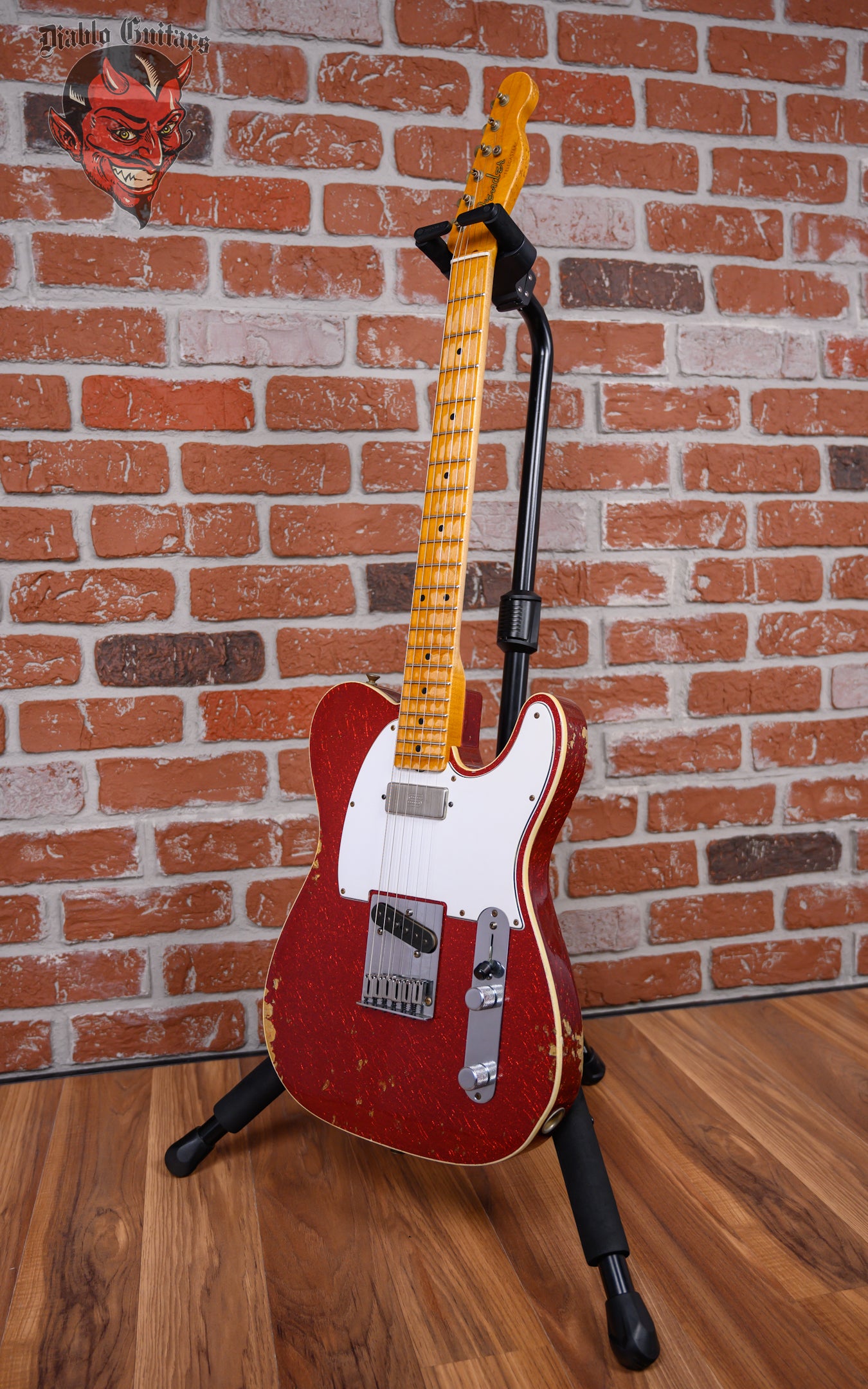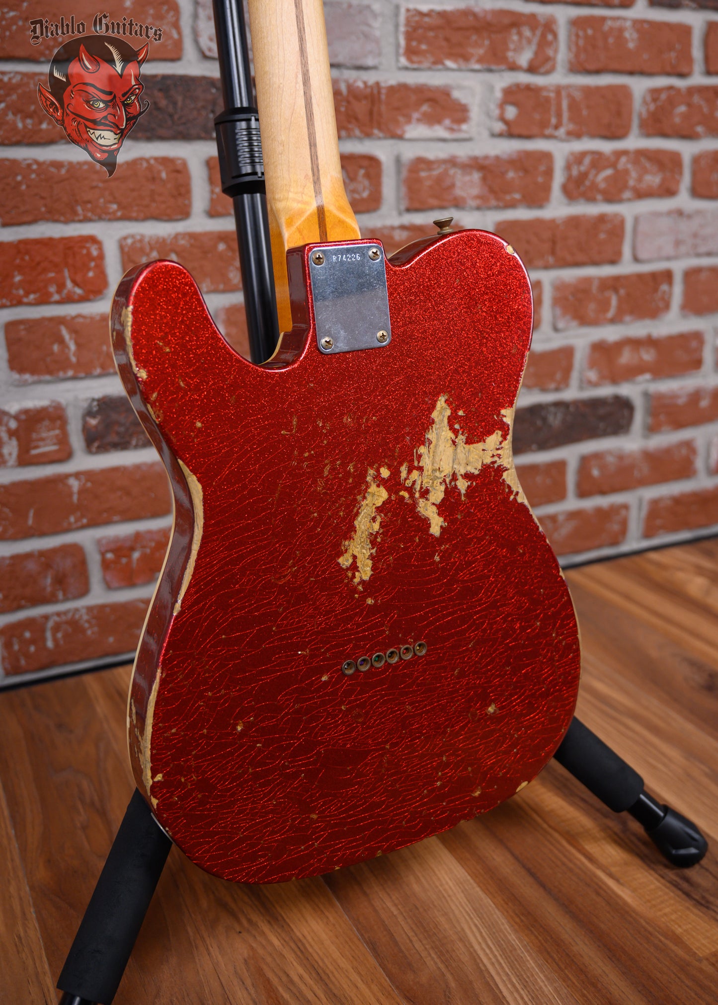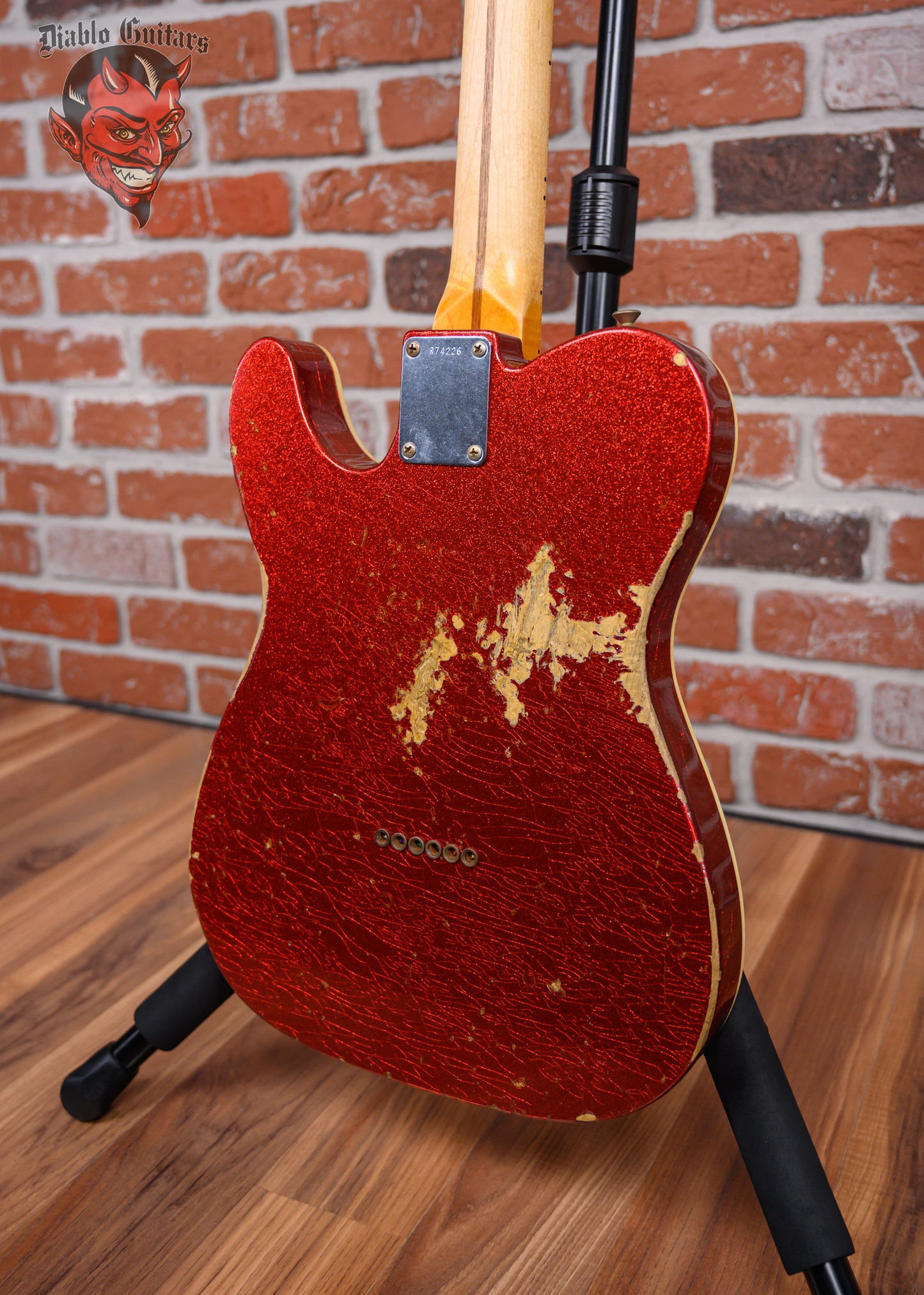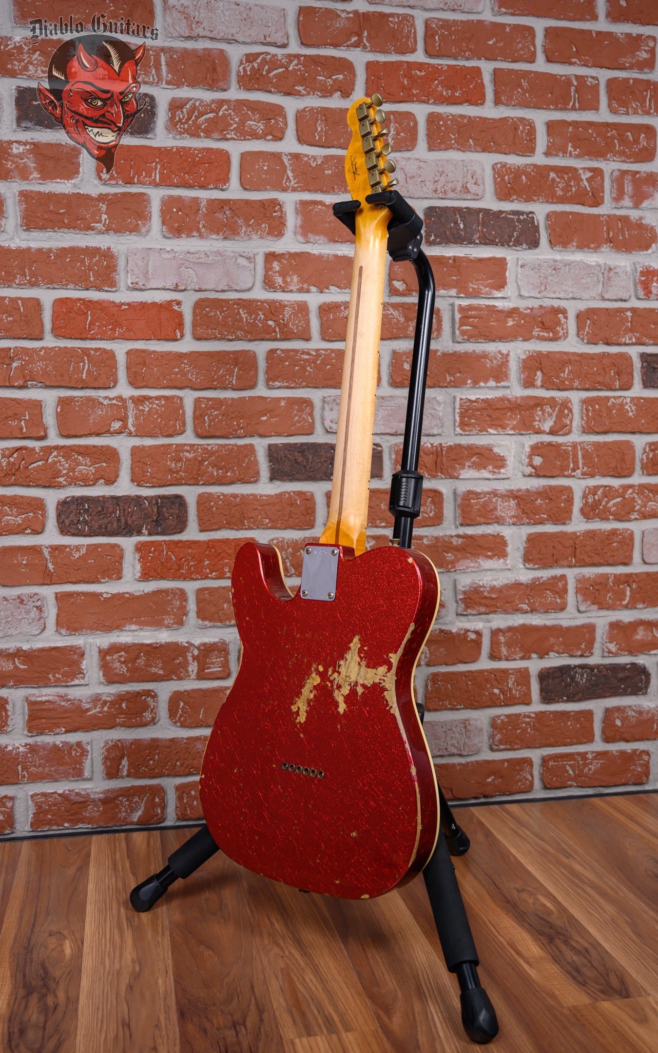 Fender Custom Shop Telecaster Relic in Red Sparkle finish made in 2013 with Original Hard Shell Case. This guitar features a bound solid ash body, quartersawn maple neck and maple fingerboard. Equipped with a Seymour Duncan SM-1N Vintage Mini Humbucker in the neck position and a Fender Handwound ‘63 Telecaster single coil in the bridge position. Controlled by 1 volume, 1 tone pot and a 3-Way blade switch. The 25.5" scale length neck has micarta black dot inlays and black side markers with 21 6105 narrow tall frets on a 9.5" radius with a 52 Style "U" profile. The hardware is comprised of aged nickel/ Aged chrome Fender Vintage Style tuning machines with oval heads, a bone nut, a Fender Custom Deluxe Tele bridge and chrome knurled flat top knobs with a 3-Ply white pickguard.