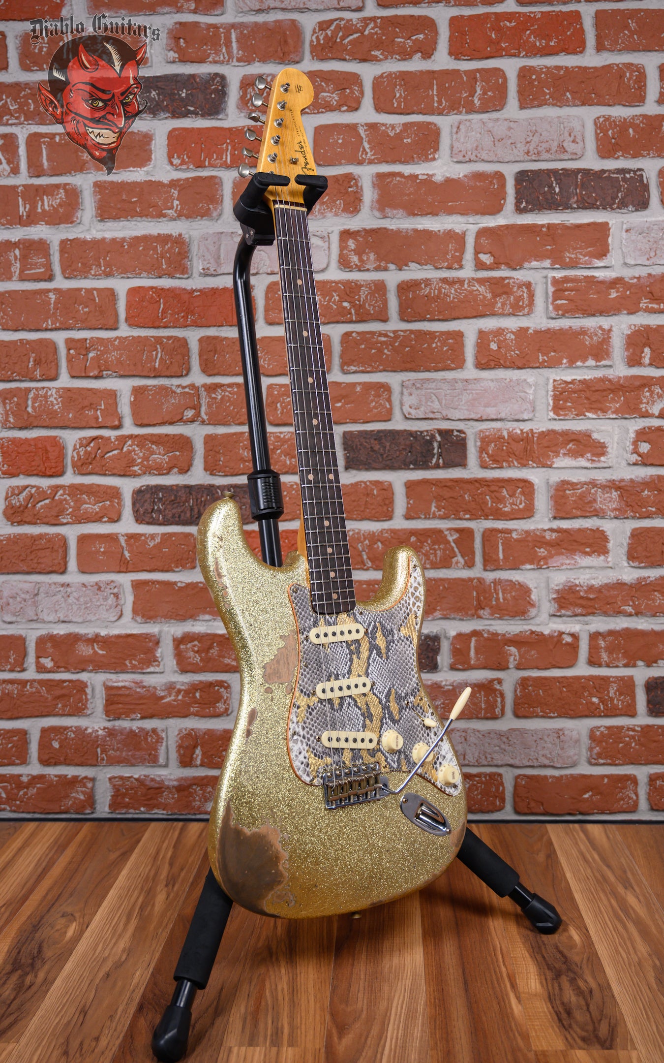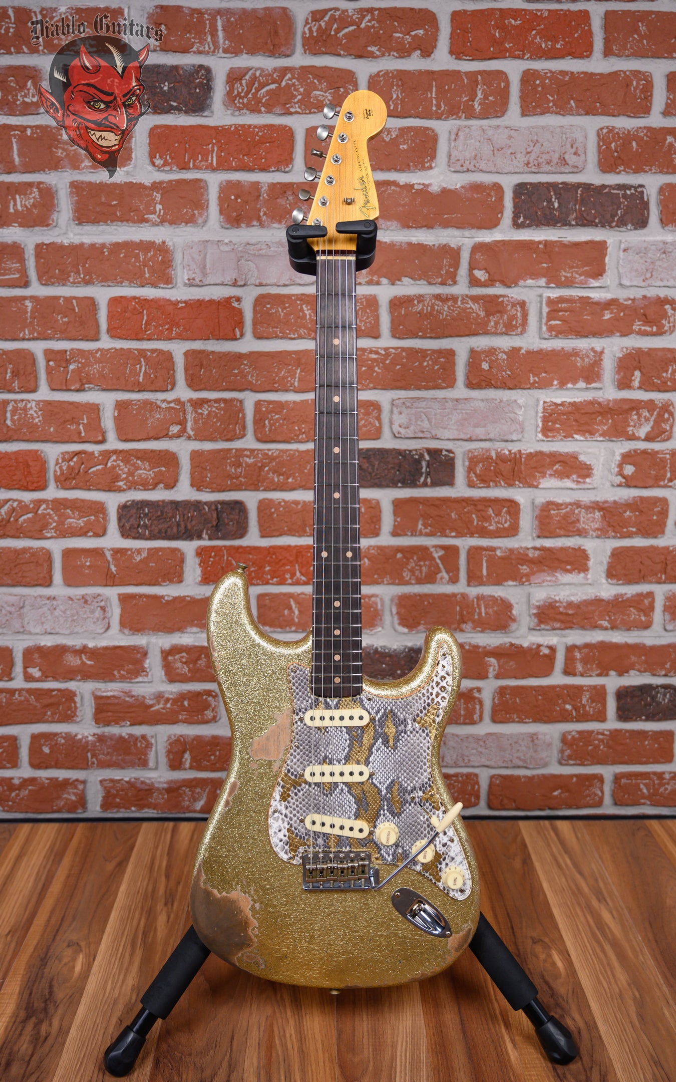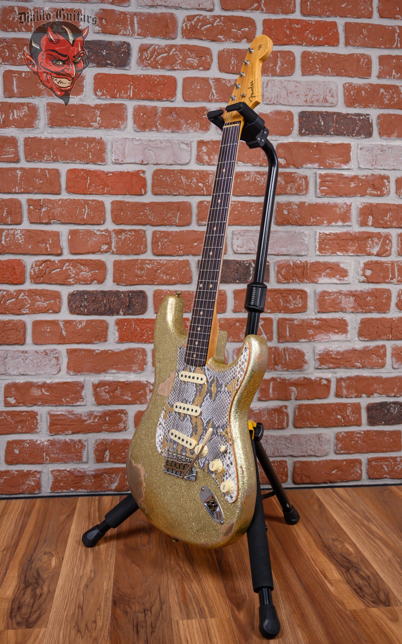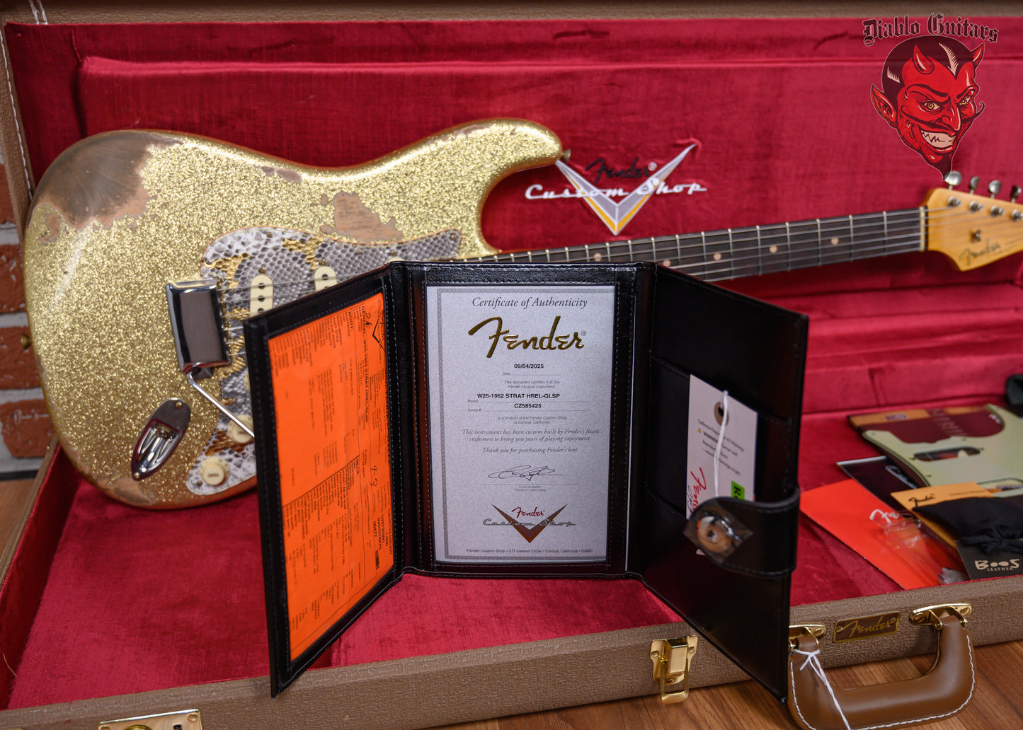 New Fender Custom Shop W25 Limited Edition 1962 Stratocaster Heavy Relic in Gold Sparkle finish made in 2025 with Original Hard Shell Case. This guitar features a solid alder body, quartersawn maple neck and guitar cites AAA 9mm rosewood fingerboard. Equipped with a Fender handwound 60/63 strat relic in the neck position, a Fender handwound 60/63 strat relic RWRP in the middle position and a Fender handwound 60/63 strat relic in the bridge position. Controlled by 1 volume, 2 tone pots and a 5-Way blade switch in vintage mod #2 wiring. The 25.5" scale length neck has micarta white dot inlays and micarta white side markers with 21 6105 narrow tall frets on a 9.5" radius with a 60's style oval "C" profile. The hardware is comprised of aged nickel/chrome Fender logo vintage style tuning machines with oval heads, a bone nut, a Fender american vintage tremolo bridge and vintage white top hat knobs with a Hand-made Boos Leather custom reticulated python skin leather pickguard.