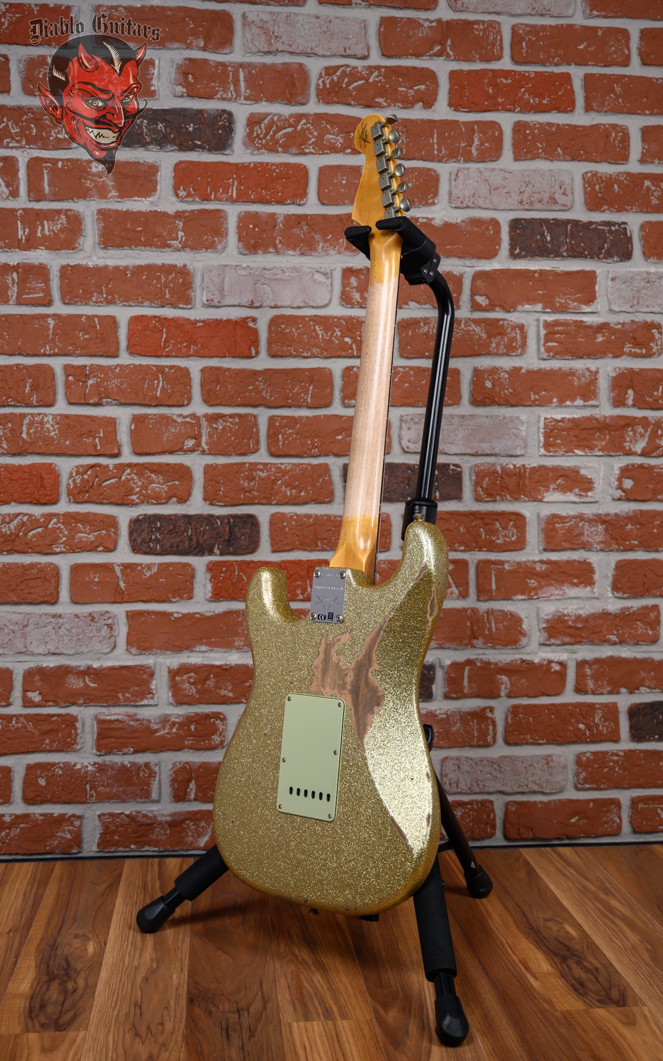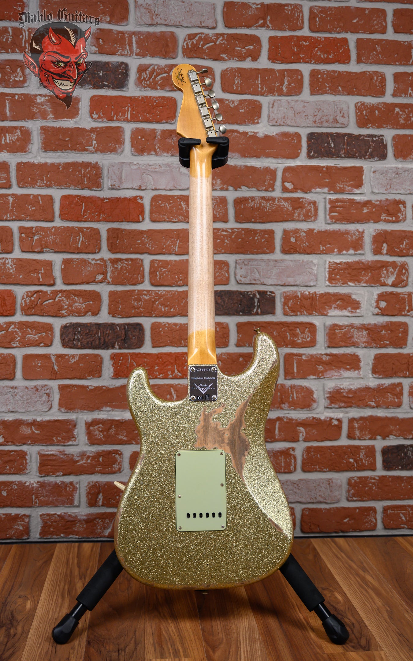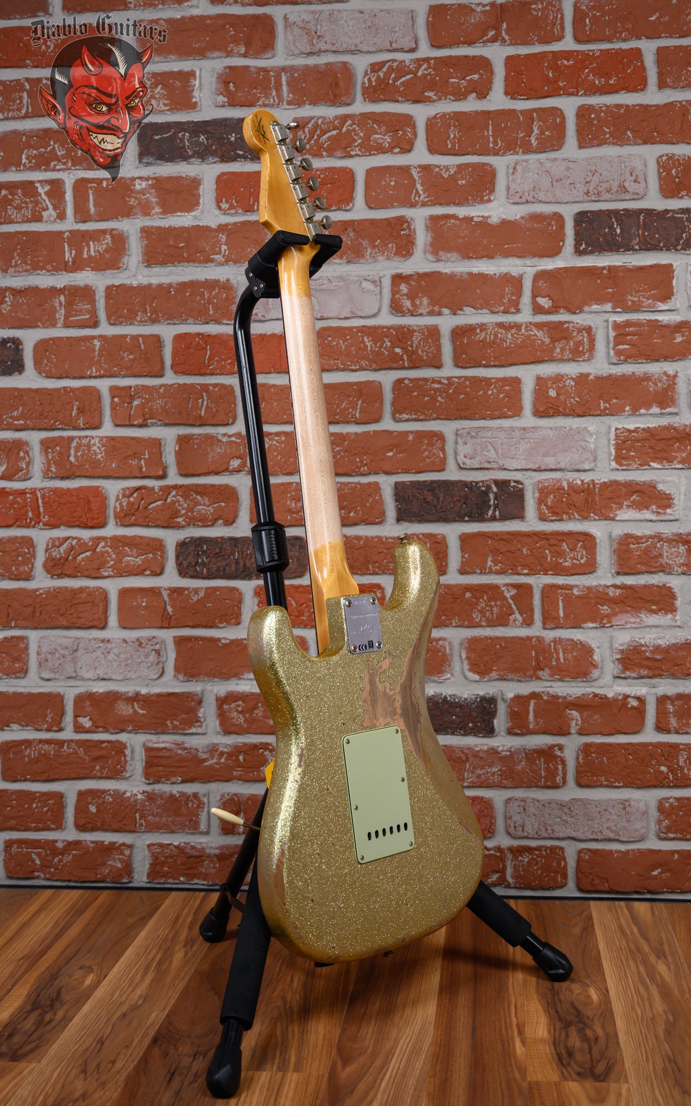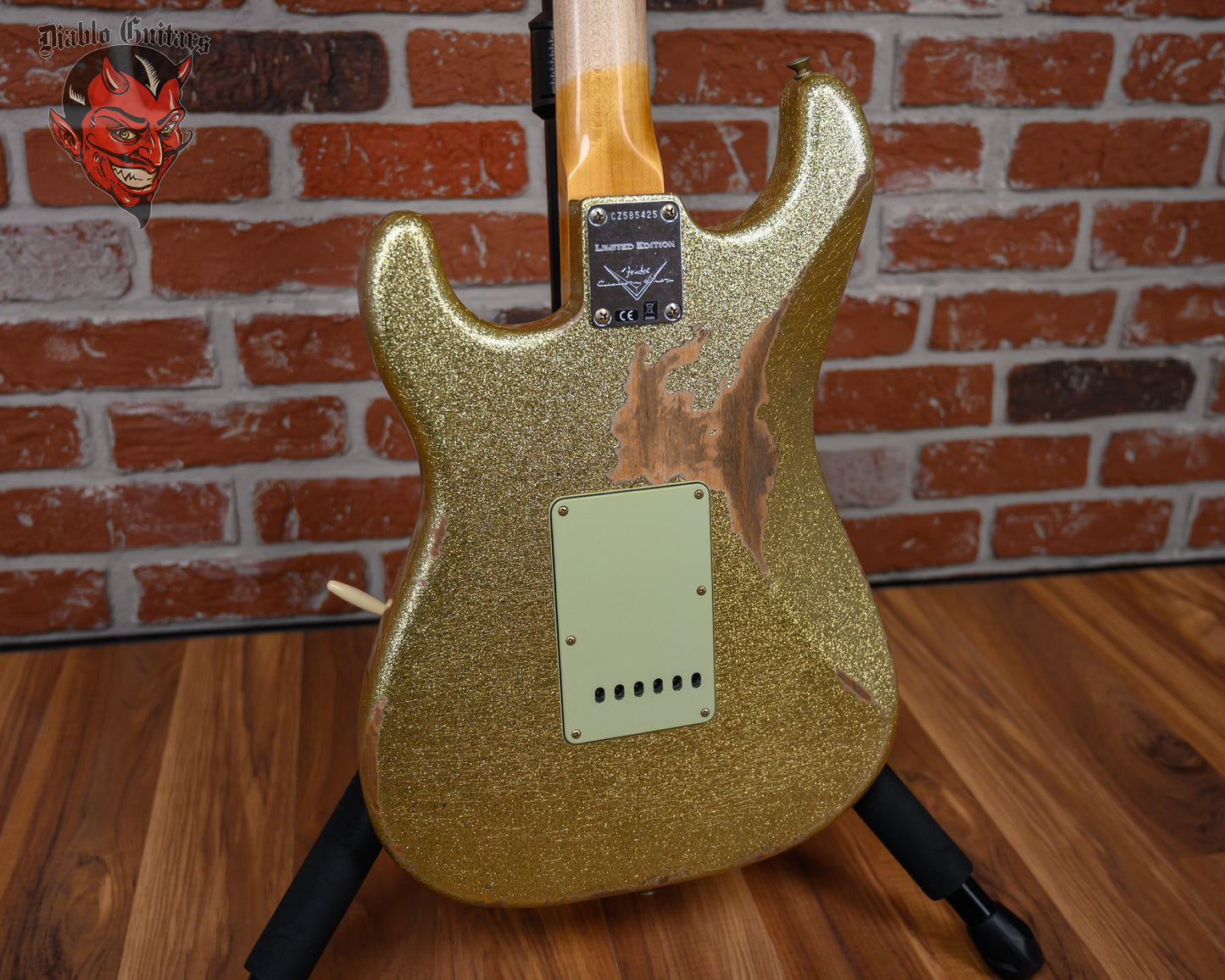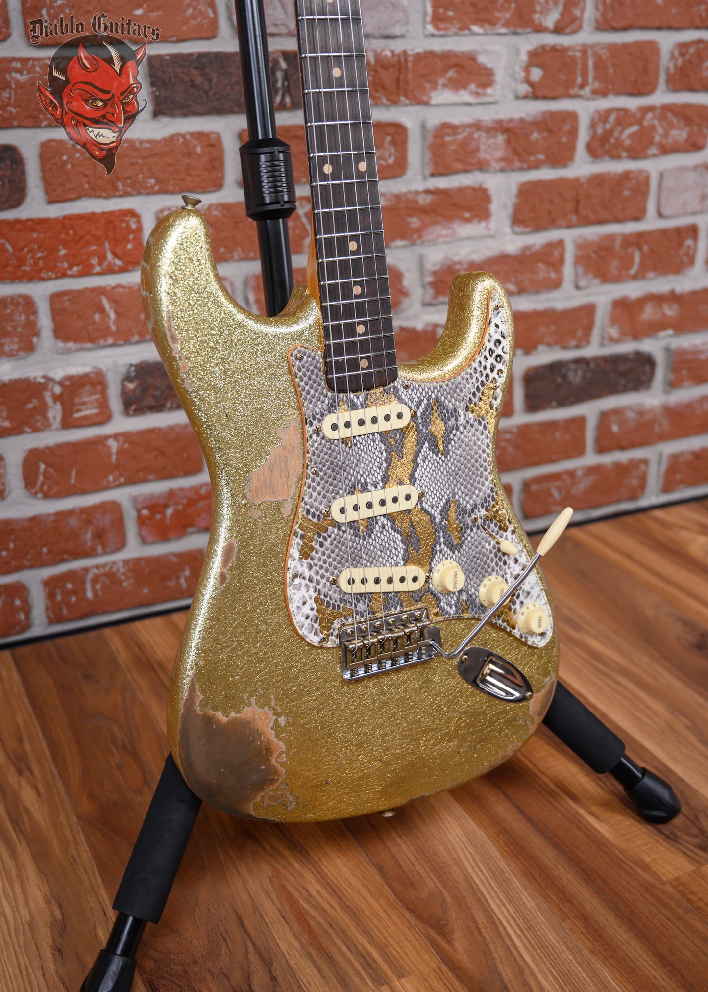 New Fender Custom Shop W25 Limited Edition 1962 Stratocaster Heavy Relic in Gold Sparkle finish made in 2025 with Original Hard Shell Case. This guitar features a solid alder body, quartersawn maple neck and guitar cites AAA 9mm rosewood fingerboard. Equipped with a Fender handwound 60/63 strat relic in the neck position, a Fender handwound 60/63 strat relic RWRP in the middle position and a Fender handwound 60/63 strat relic in the bridge position. Controlled by 1 volume, 2 tone pots and a 5-Way blade switch in vintage mod #2 wiring. The 25.5" scale length neck has micarta white dot inlays and micarta white side markers with 21 6105 narrow tall frets on a 9.5" radius with a 60's style oval "C" profile. The hardware is comprised of aged nickel/chrome Fender logo vintage style tuning machines with oval heads, a bone nut, a Fender american vintage tremolo bridge and vintage white top hat knobs with a Hand-made Boos Leather custom reticulated python skin leather pickguard.