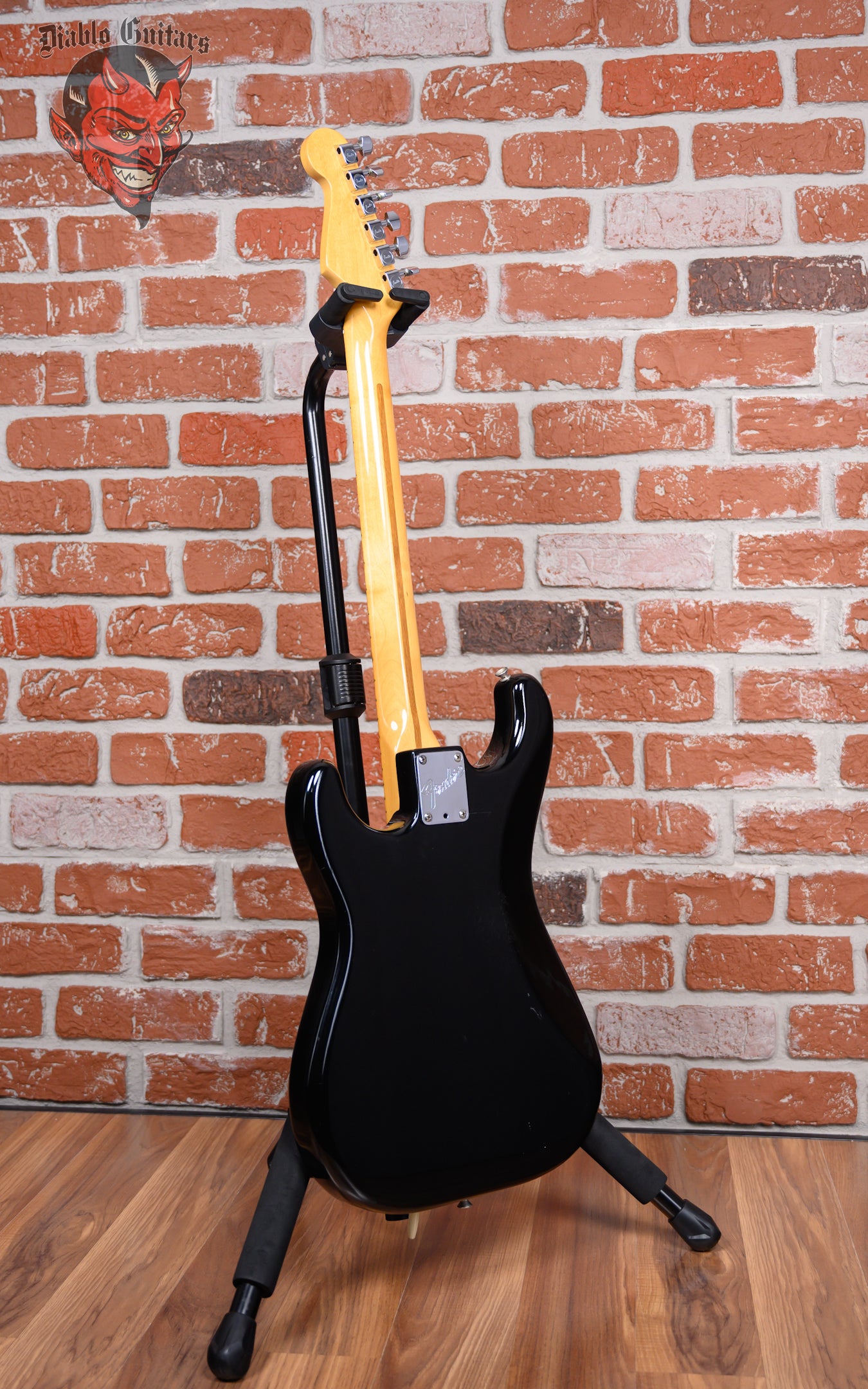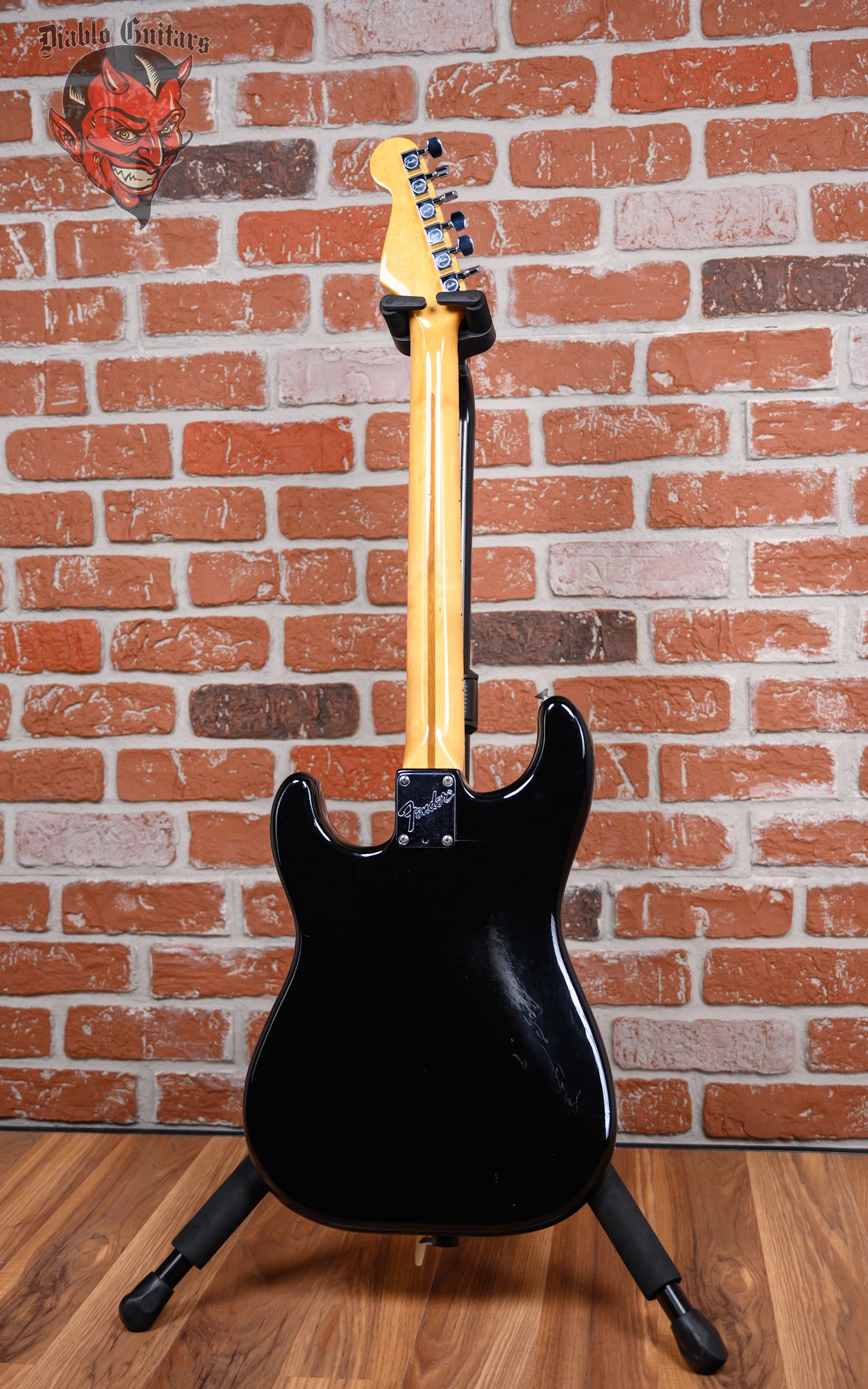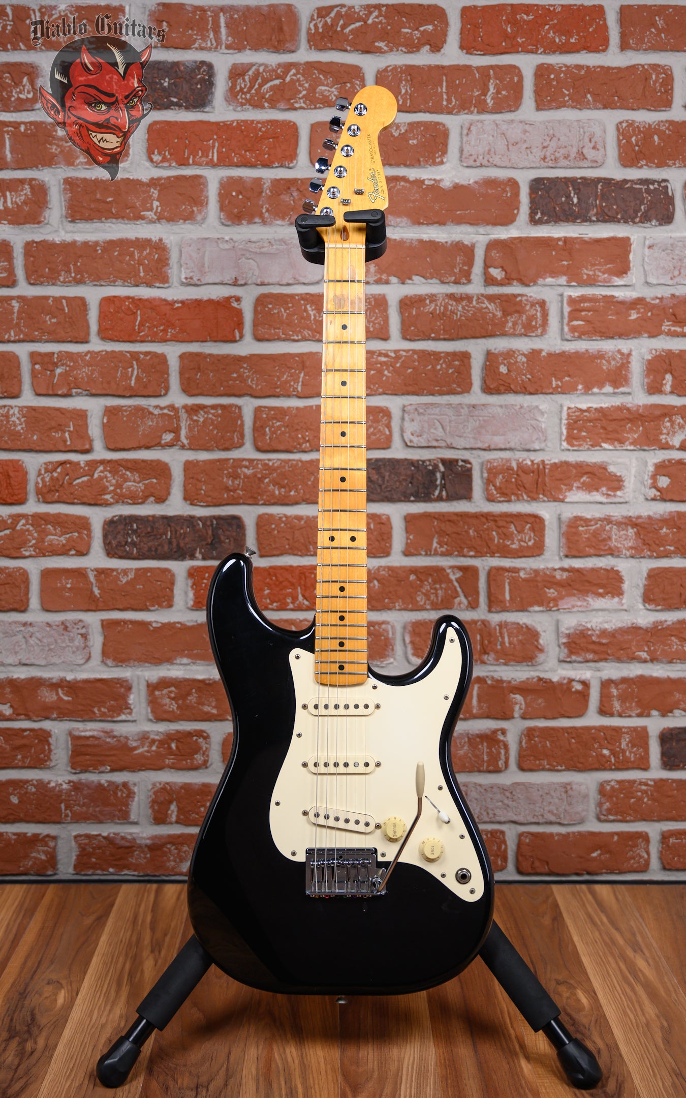 Vintage Fender Dan Smith Era Stratocaster Standard 2-Knob in Black finish made in 1983 with Original Hard Shell Case. This guitar features a Solid Alder body, Maple neck and Maple fingerboard. Equipped with a Fender Staggered Strat in the neck position, a Fender Staggered Strat in the middle position and a Seymour Duncan Antiquity II Surfer Strat in the bridge position. Controlled by 1 Volume, 1 Tone pot and a 5-Way Blade Switch. The 25.5" scale length neck has Black Dot inlays and Black side markers with 21 Jumbo frets on a 12" radius with a Medium "C" profile. The hardware is comprised of Chrome Fender Deluxe Sealed Diecast tuning machines with Cloche heads, a Bone nut, a Fender Freeflyte Tremolo with pop in arm bridge, and White Top Hat knobs with a Single Ply White pickguard.