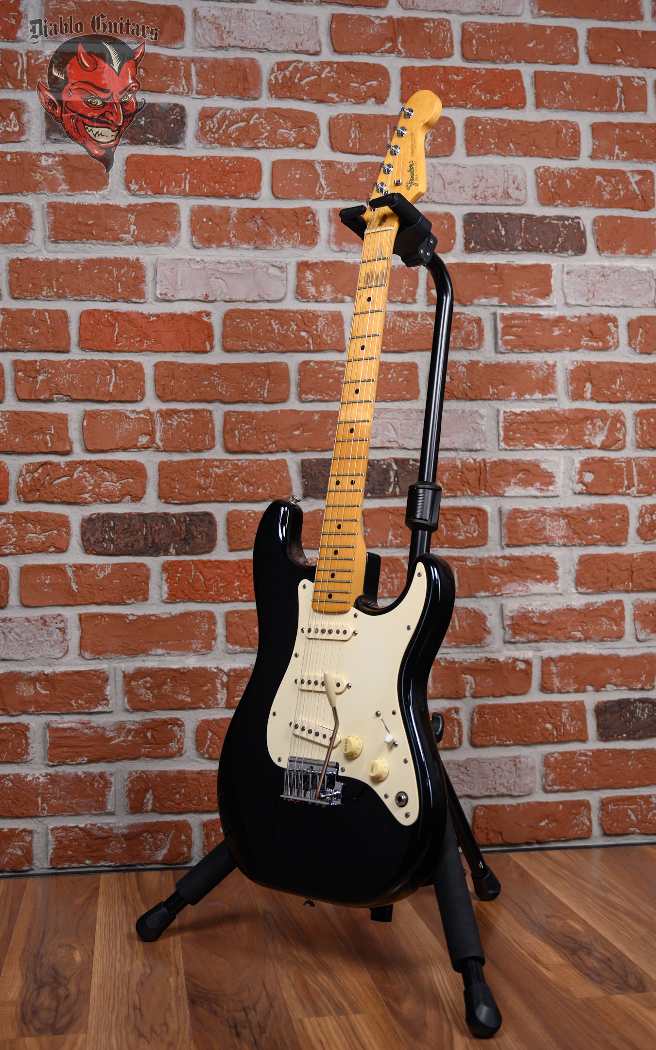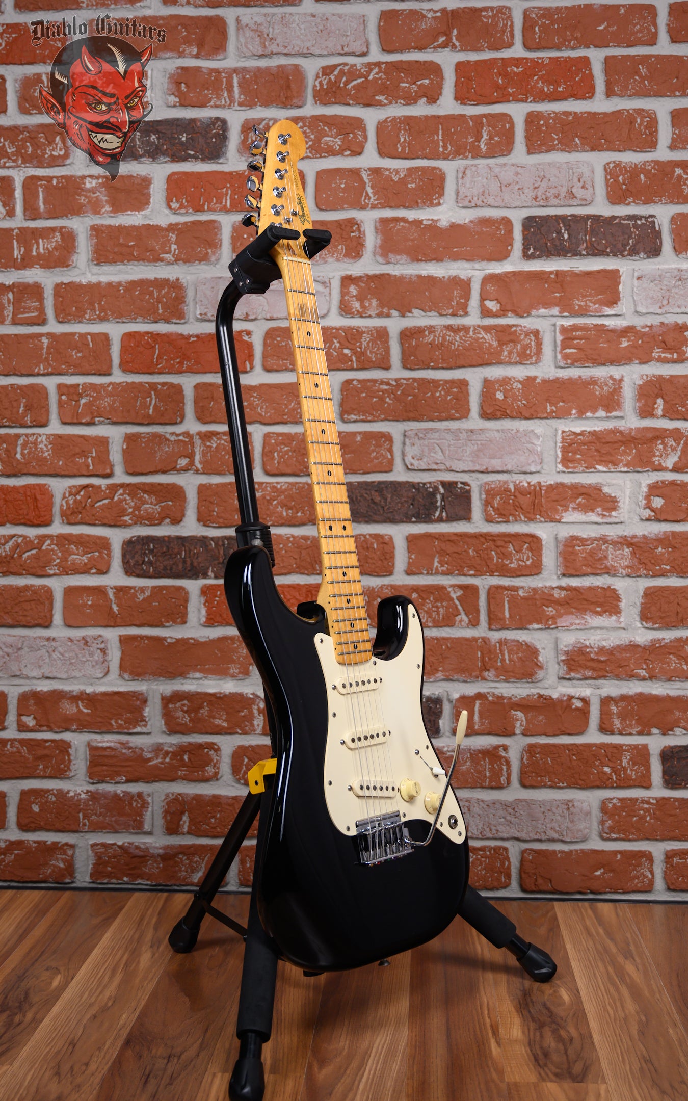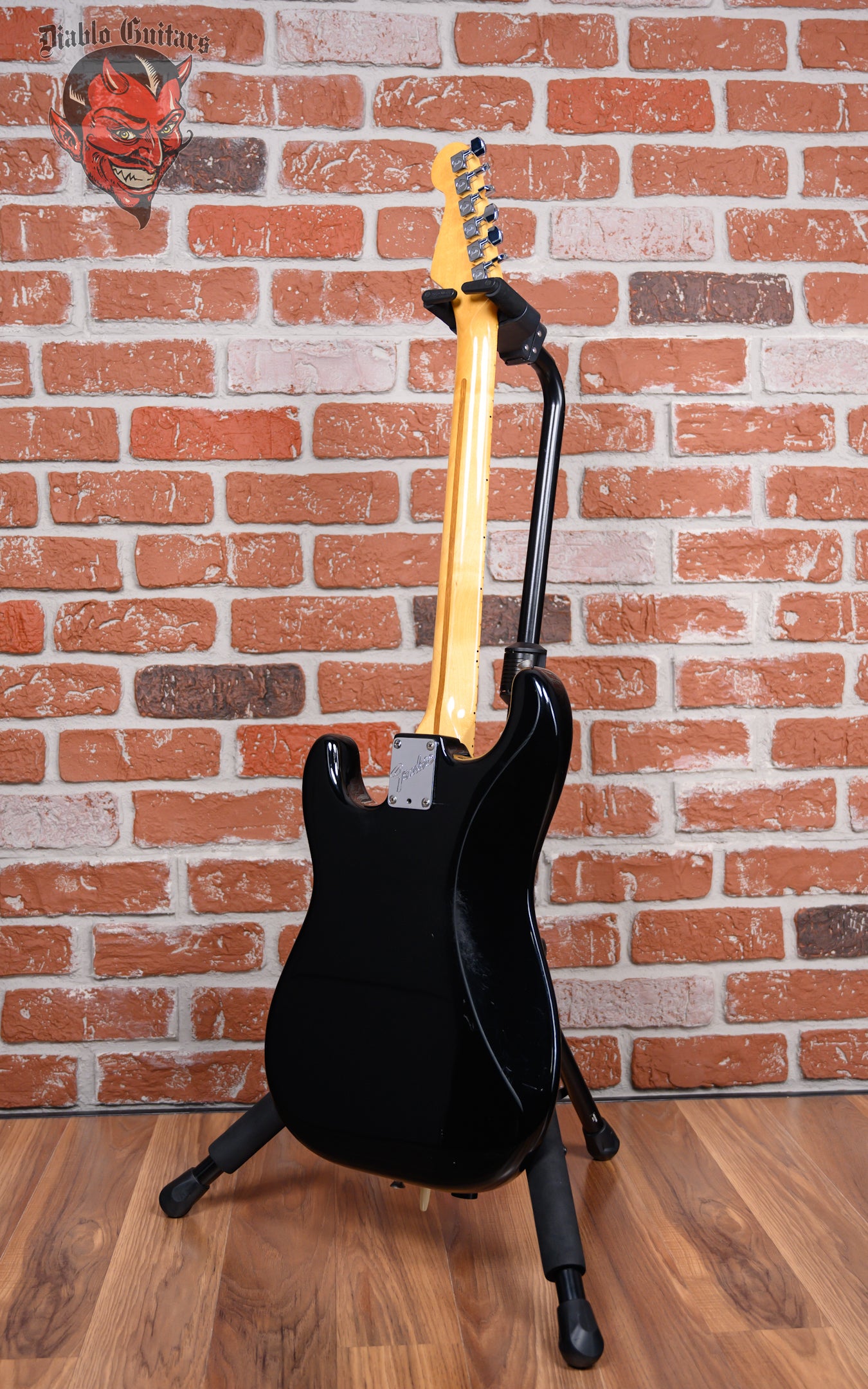 Vintage Fender Dan Smith Era Stratocaster Standard 2-Knob in Black finish made in 1983 with Original Hard Shell Case. This guitar features a Solid Alder body, Maple neck and Maple fingerboard. Equipped with a Fender Staggered Strat in the neck position, a Fender Staggered Strat in the middle position and a Seymour Duncan Antiquity II Surfer Strat in the bridge position. Controlled by 1 Volume, 1 Tone pot and a 5-Way Blade Switch. The 25.5" scale length neck has Black Dot inlays and Black side markers with 21 Jumbo frets on a 12" radius with a Medium "C" profile. The hardware is comprised of Chrome Fender Deluxe Sealed Diecast tuning machines with Cloche heads, a Bone nut, a Fender Freeflyte Tremolo with pop in arm bridge, and White Top Hat knobs with a Single Ply White pickguard.