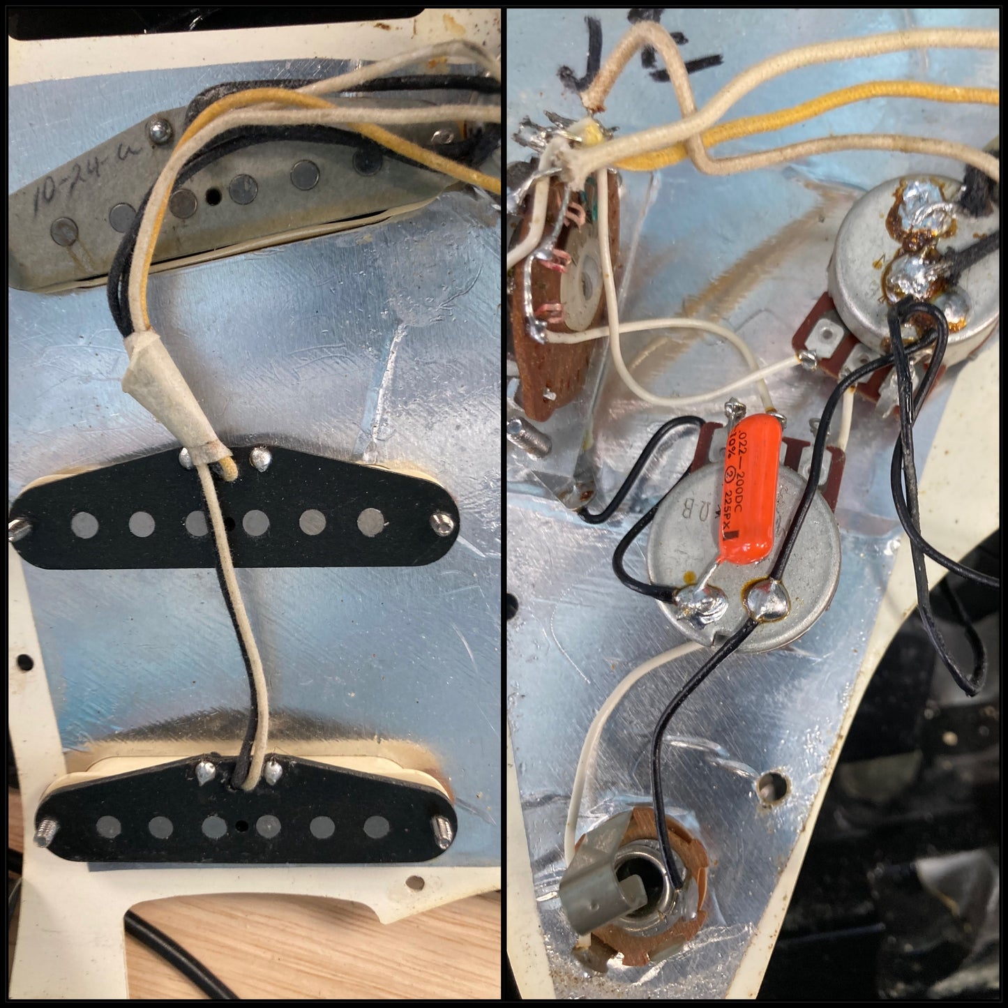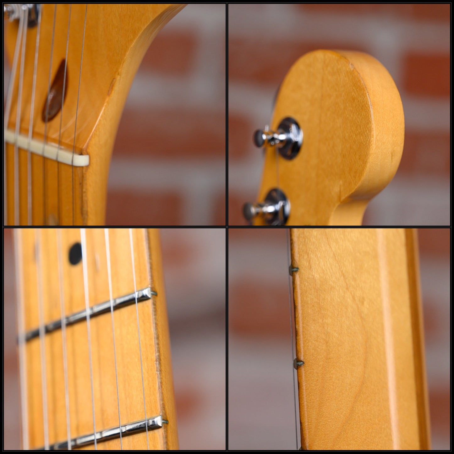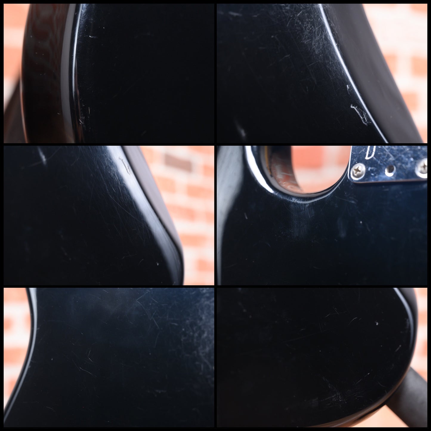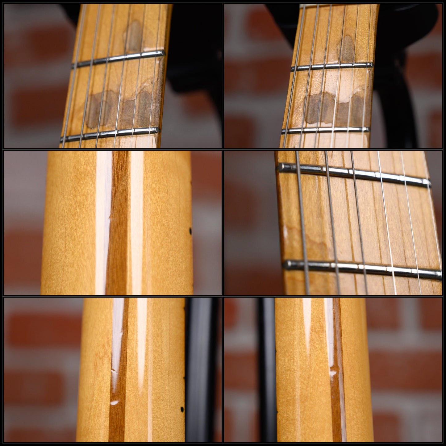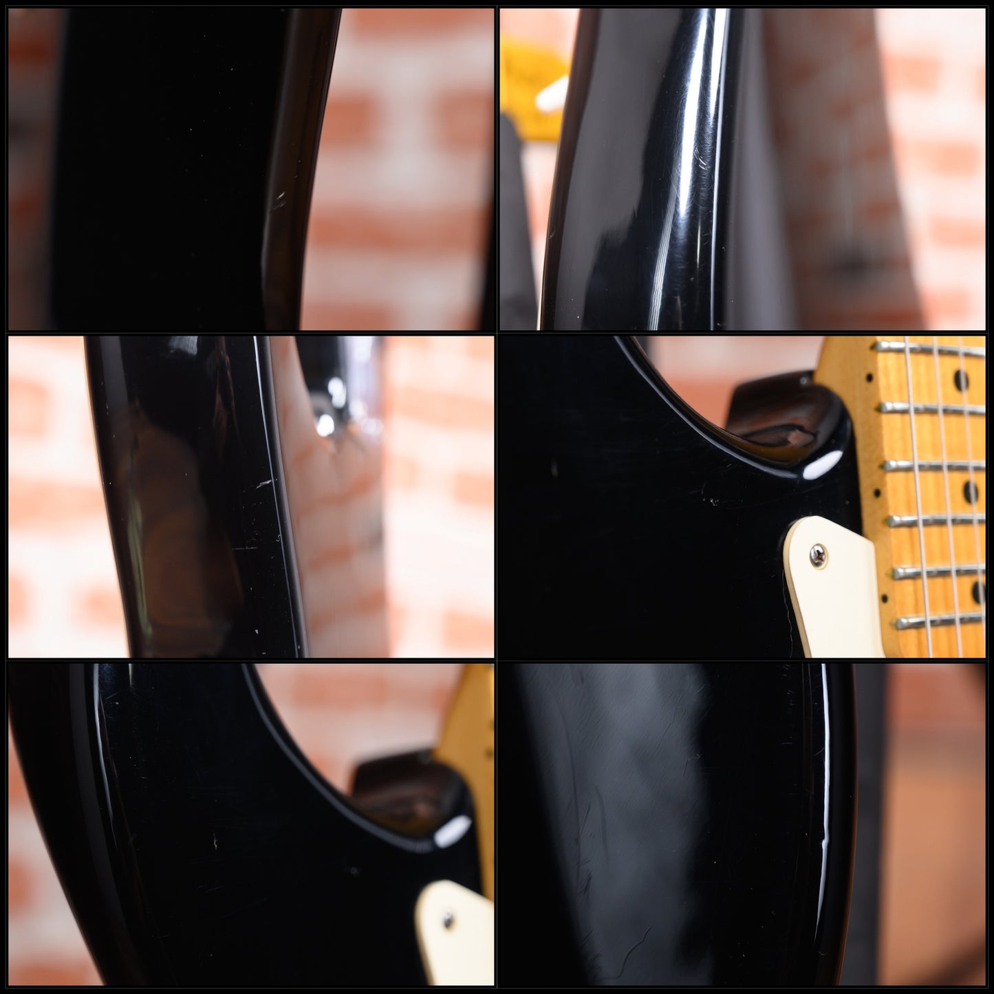 This guitar is in overall good condition with visible signs of play. It has surface marks, scuffs, scratches, some dings/ dents, a small paint touch up spot on its top. The finish on the fretboard is worn off in large spot on the 1st-2nd frets. The trem bar is not original, it's a modern fender pop in which fits and works but has a little play. (See Pics)