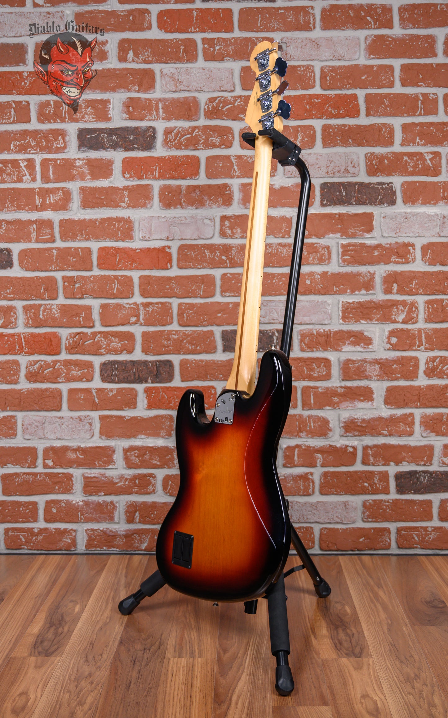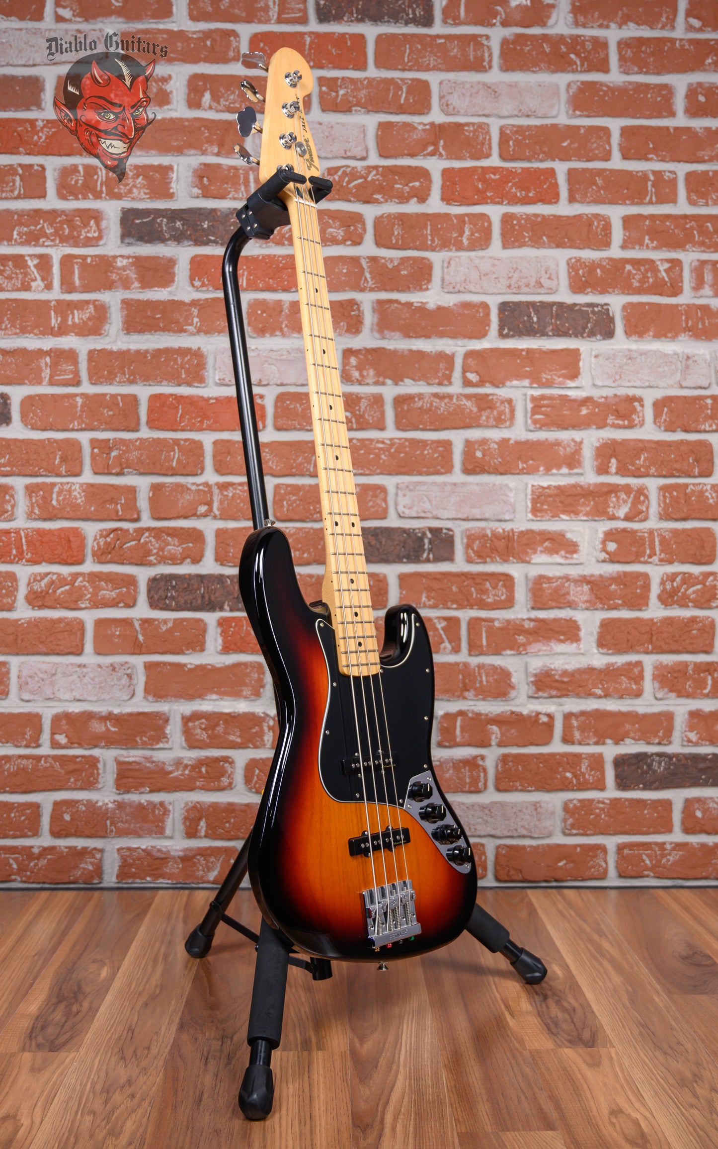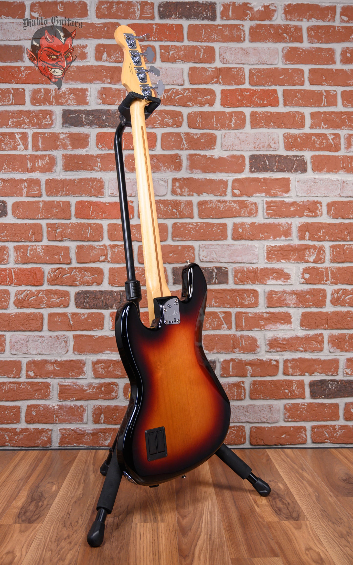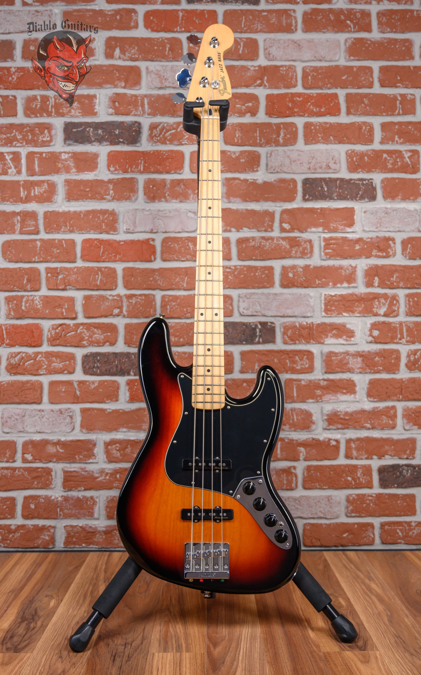 Fender Deluxe Active Jazz Bass in 3 Color Sunburst finish made in 2018 with Gigbag. This guitar features a solid alder body, maple neck and maple fingerboard. Equipped with a set of Fender Dual-Coil Ceramic Noiseless Jazz Bass single coils in the middle and bridge positions. Controlled by one master volume, pan pot (pickup selector), treble boost/cut, midrange boost/cut, bass boost/cut, active/passive mini toggle pot and a pan pot. The 34" scale length neck has black dot inlays and black side markers with 20 medium jumbo frets on a 12" radius with a medium C profile. The hardware is comprised of chrome Fender Standard Open Gear tuning machines with clover heads, a bone nut, a Fender 4-Saddle HiMass (Top Loaded) bridge and black grip knobs with a 3 ply black on white pickguard.