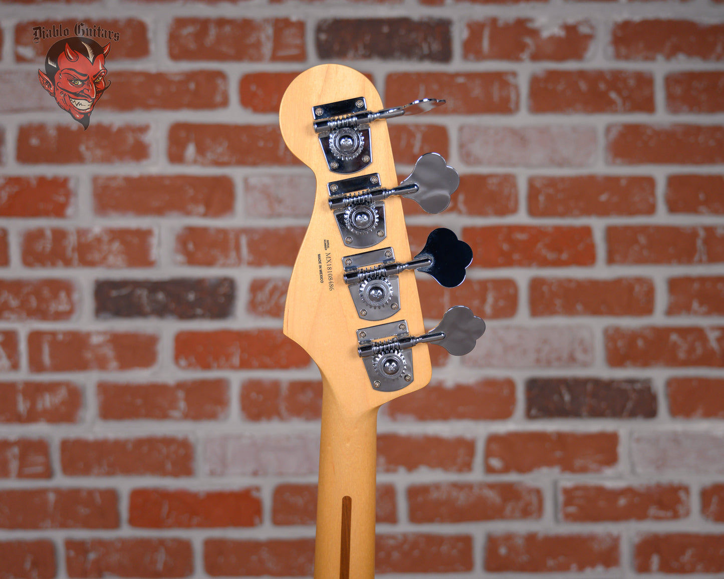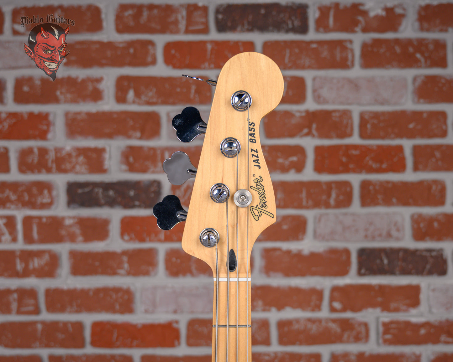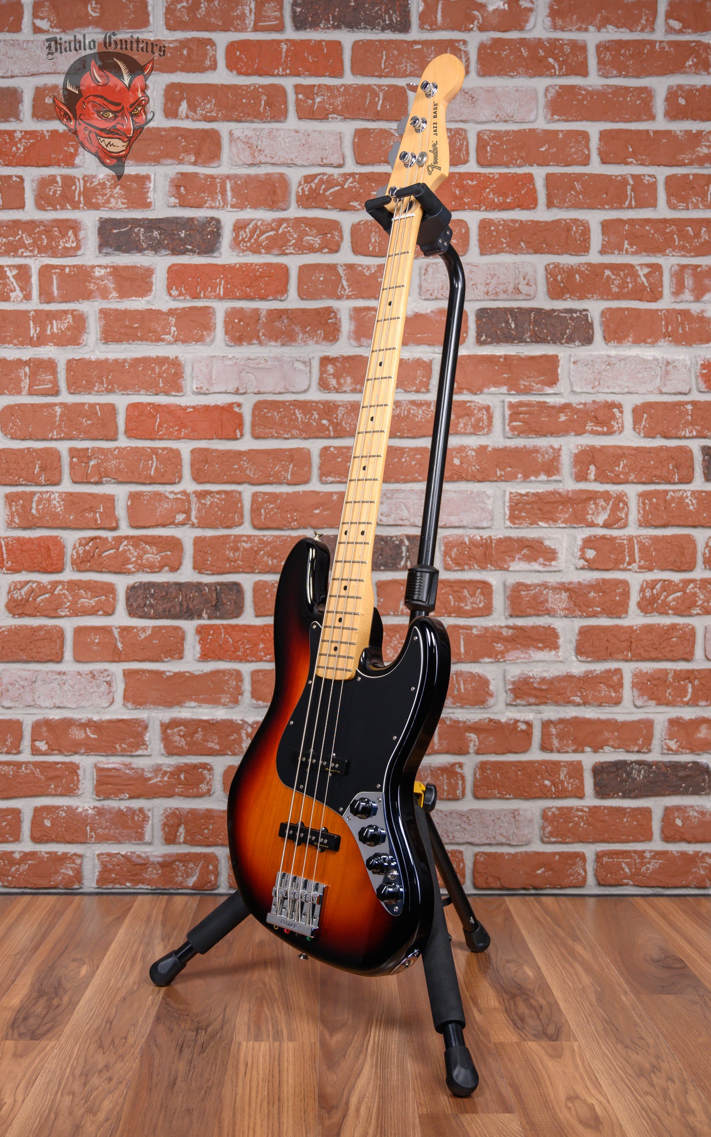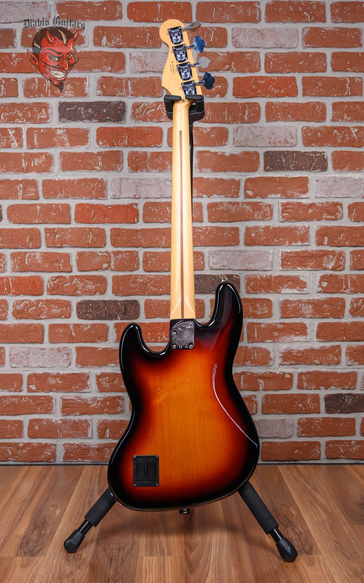 Fender Deluxe Active Jazz Bass in 3 Color Sunburst finish made in 2018 with Gigbag. This guitar features a solid alder body, maple neck and maple fingerboard. Equipped with a set of Fender Dual-Coil Ceramic Noiseless Jazz Bass single coils in the middle and bridge positions. Controlled by one master volume, pan pot (pickup selector), treble boost/cut, midrange boost/cut, bass boost/cut, active/passive mini toggle pot and a pan pot. The 34" scale length neck has black dot inlays and black side markers with 20 medium jumbo frets on a 12" radius with a medium C profile. The hardware is comprised of chrome Fender Standard Open Gear tuning machines with clover heads, a bone nut, a Fender 4-Saddle HiMass (Top Loaded) bridge and black grip knobs with a 3 ply black on white pickguard.