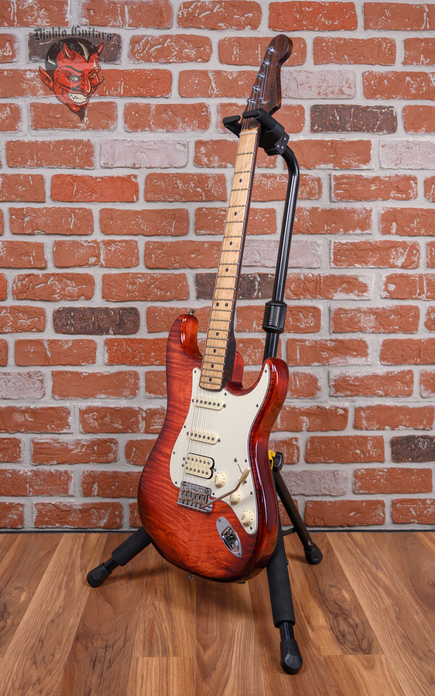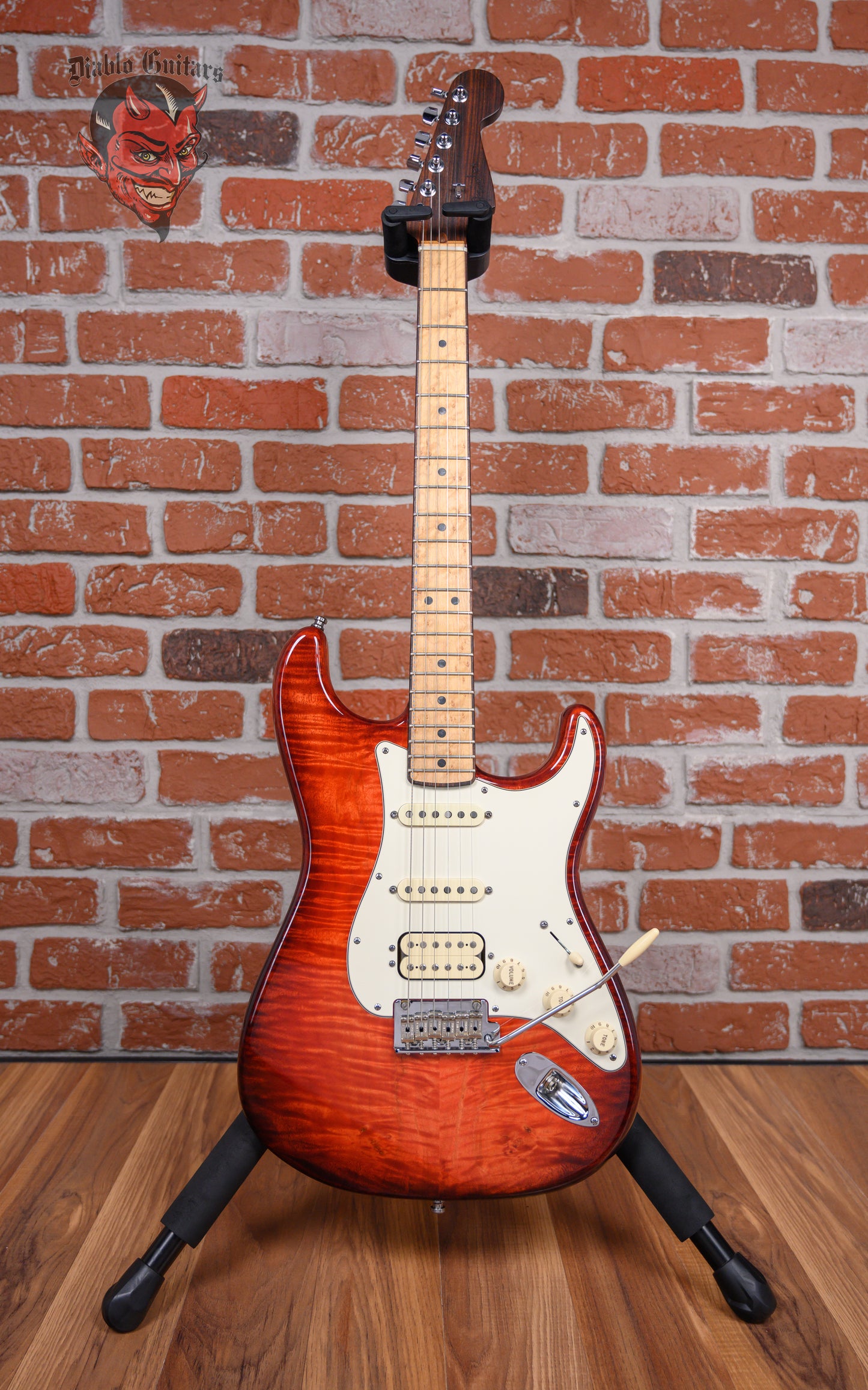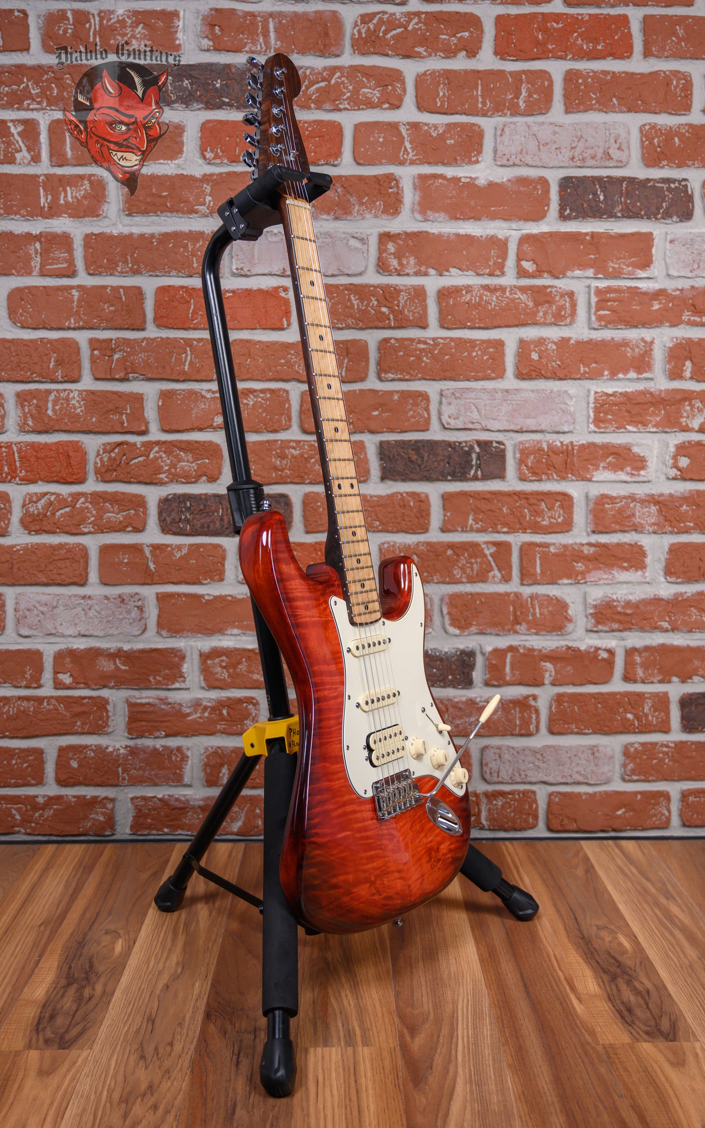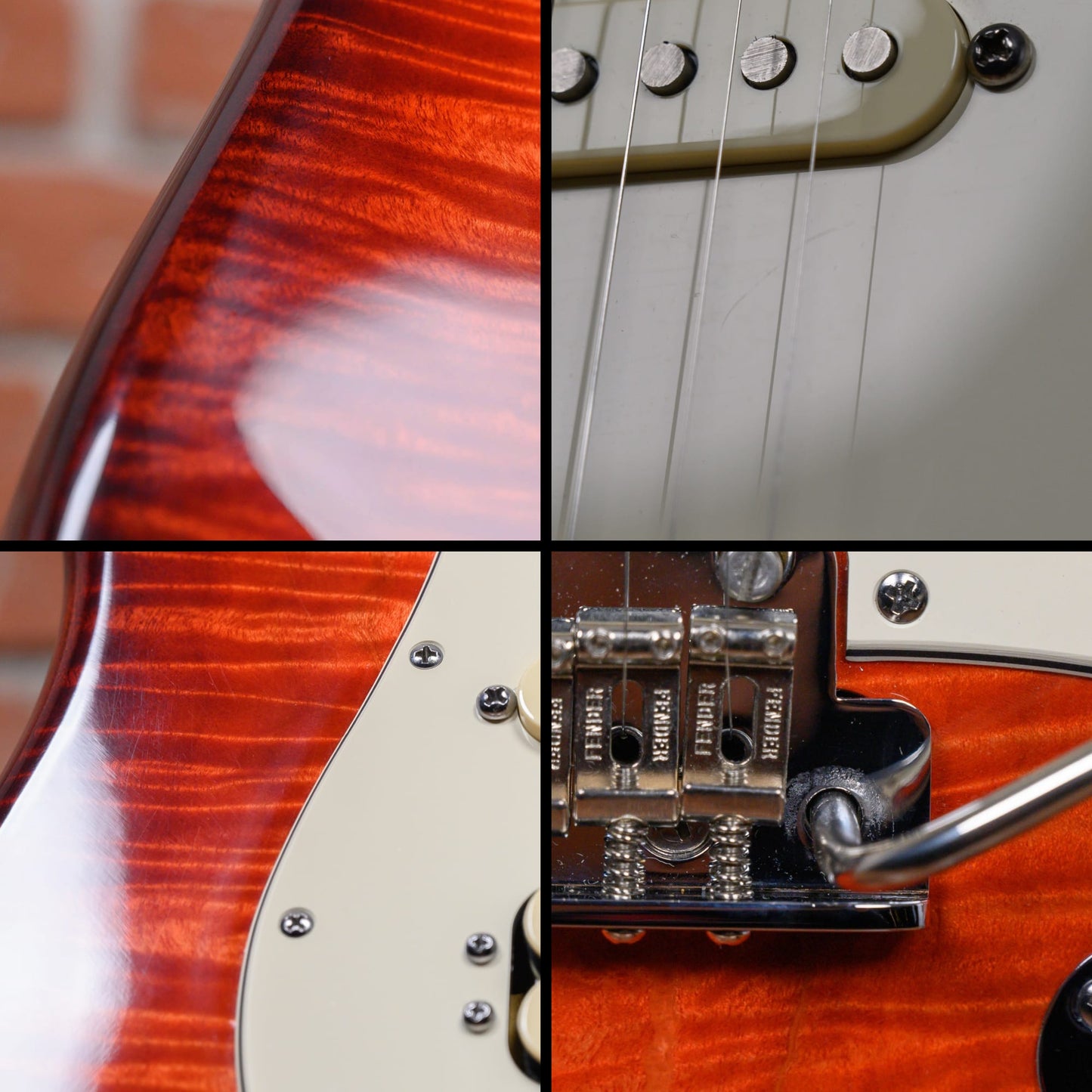 Fender Select Stratocaster HSS Exotic Flame in Bing Cherry Burst finish made in 2014 with Original Hard Shell Case. This guitar features a solid alder body with a AAA flame maple top, rosewood neck and channel-bound birdseye maple fingerboard with a laser engraved Fender logo headstock with Fender Select Medallion. Equipped with a set of Fender Select Single-Coils in the neck/middle positions and a Fender Twin Head Humbucker in the bridge position. Controlled by 1 volume pot, 2 tone pots and a 5-way blade switch. The 25.5" scale length neck has black pearloid dot inlays and pearloid side markers with 21 medium jumbo frets on a compound 9.5" to 14" radius with a medium C profile. The hardware is comprised of nickel/chrome Fender Deluxe Staggered Cast/Sealed Locking tuning machines with Cloche heads, a synthetic bone nut, a Fender 2-Point Synchronized Tremolo bridge with Bent Steel saddles and aged white top hat knobs with a 3-ply parchment pickguard.