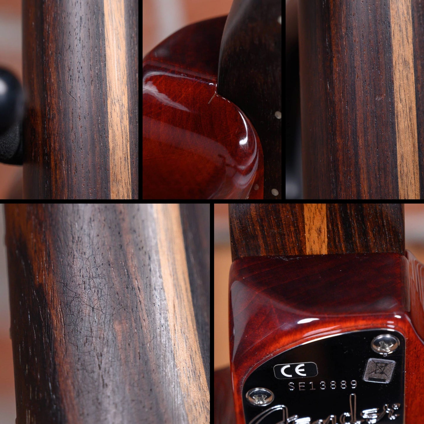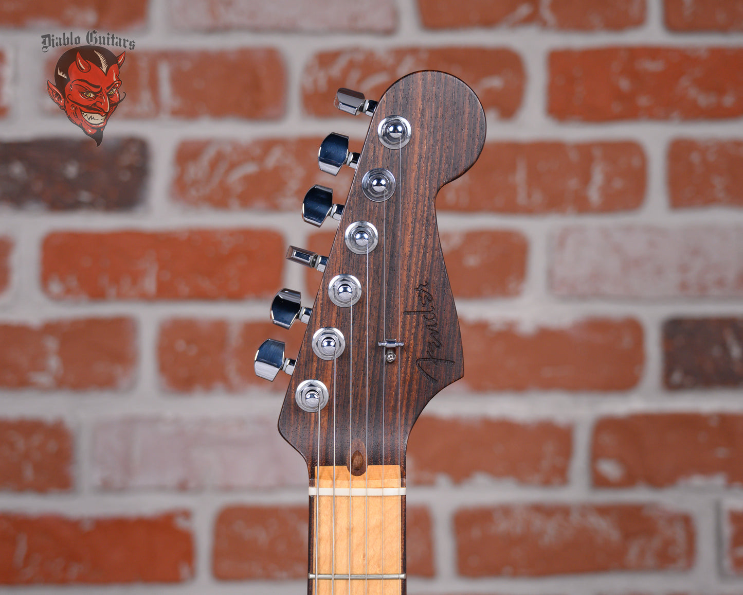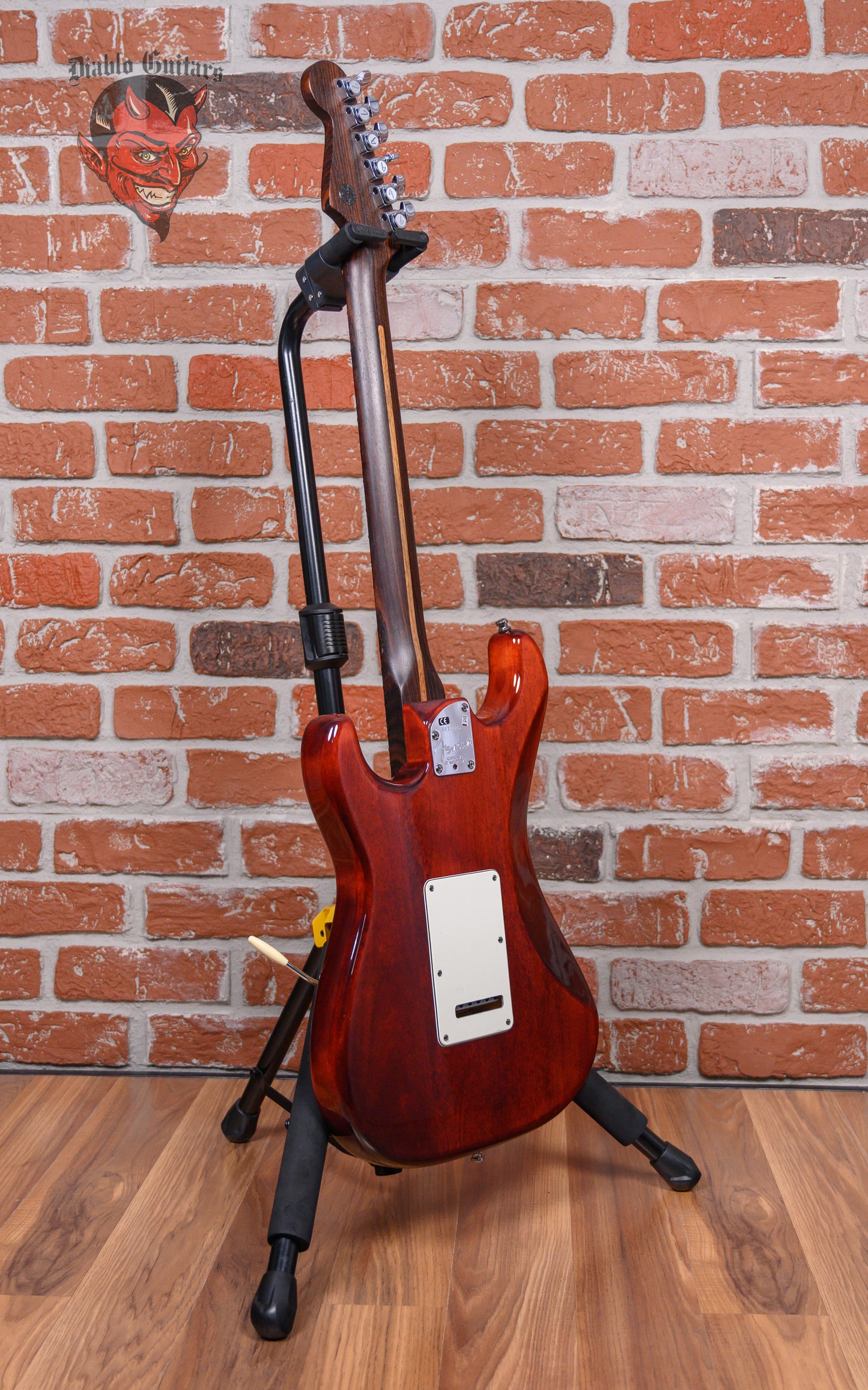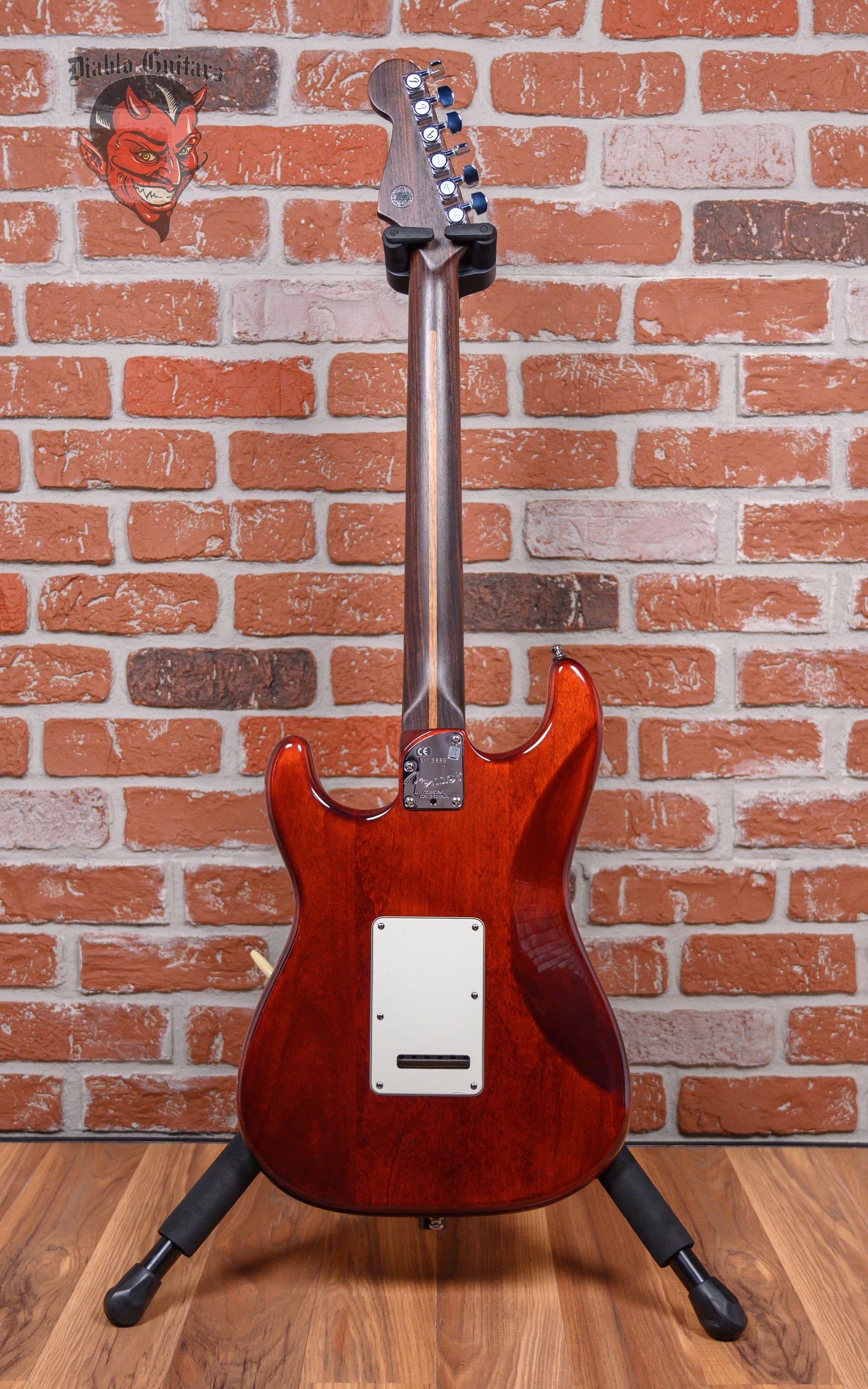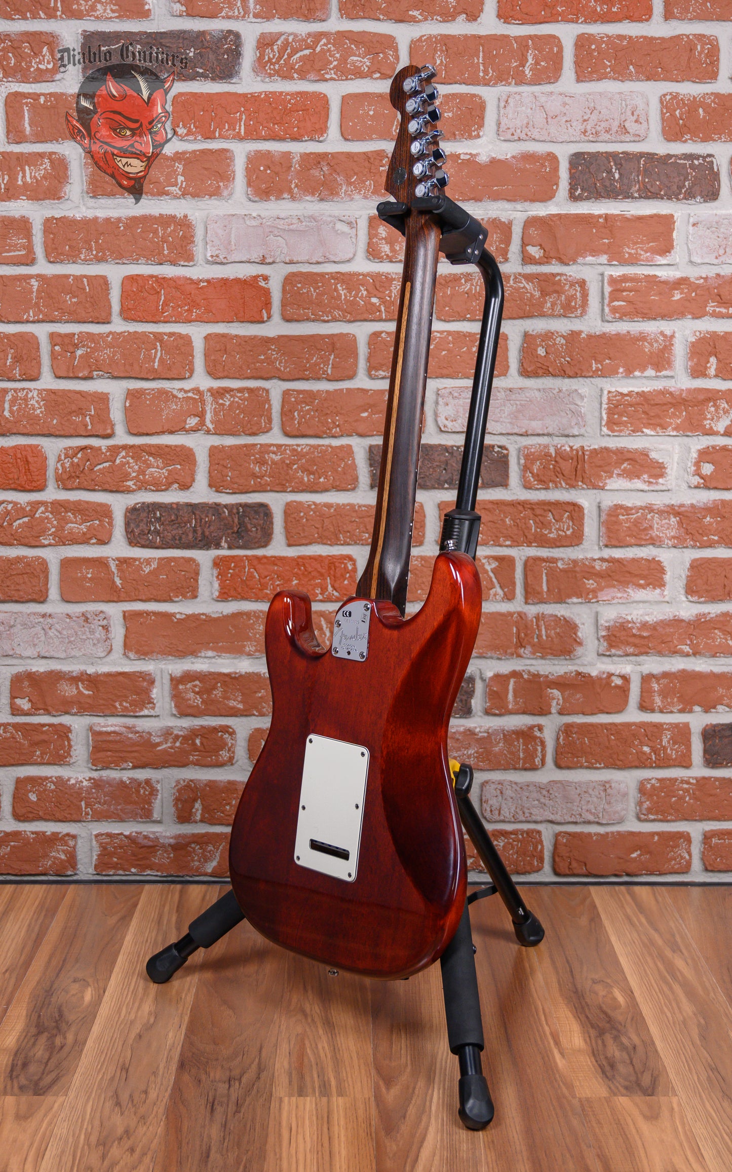 Fender Select Stratocaster HSS Exotic Flame in Bing Cherry Burst finish made in 2014 with Original Hard Shell Case. This guitar features a solid alder body with a AAA flame maple top, rosewood neck and channel-bound birdseye maple fingerboard with a laser engraved Fender logo headstock with Fender Select Medallion. Equipped with a set of Fender Select Single-Coils in the neck/middle positions and a Fender Twin Head Humbucker in the bridge position. Controlled by 1 volume pot, 2 tone pots and a 5-way blade switch. The 25.5" scale length neck has black pearloid dot inlays and pearloid side markers with 21 medium jumbo frets on a compound 9.5" to 14" radius with a medium C profile. The hardware is comprised of nickel/chrome Fender Deluxe Staggered Cast/Sealed Locking tuning machines with Cloche heads, a synthetic bone nut, a Fender 2-Point Synchronized Tremolo bridge with Bent Steel saddles and aged white top hat knobs with a 3-ply parchment pickguard.