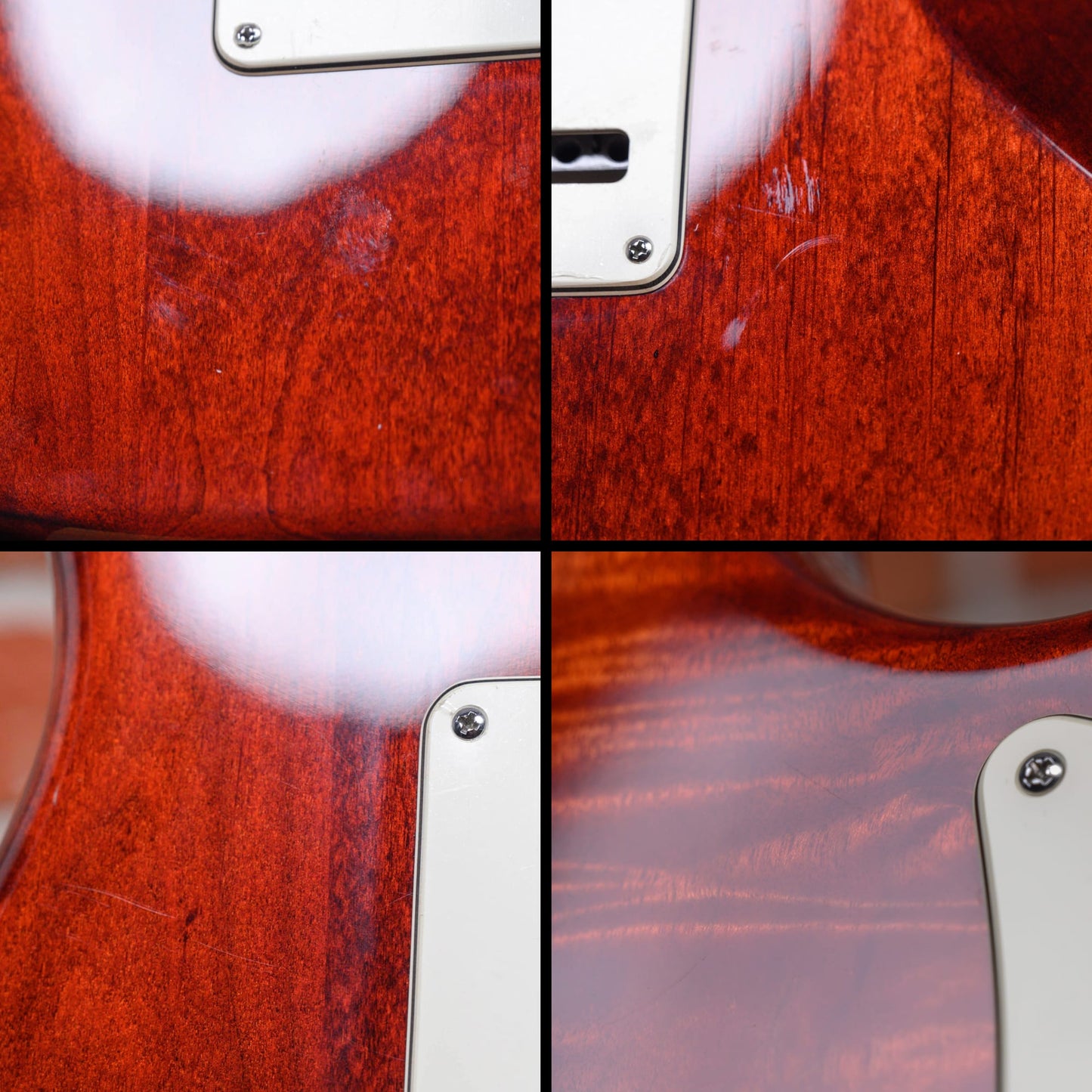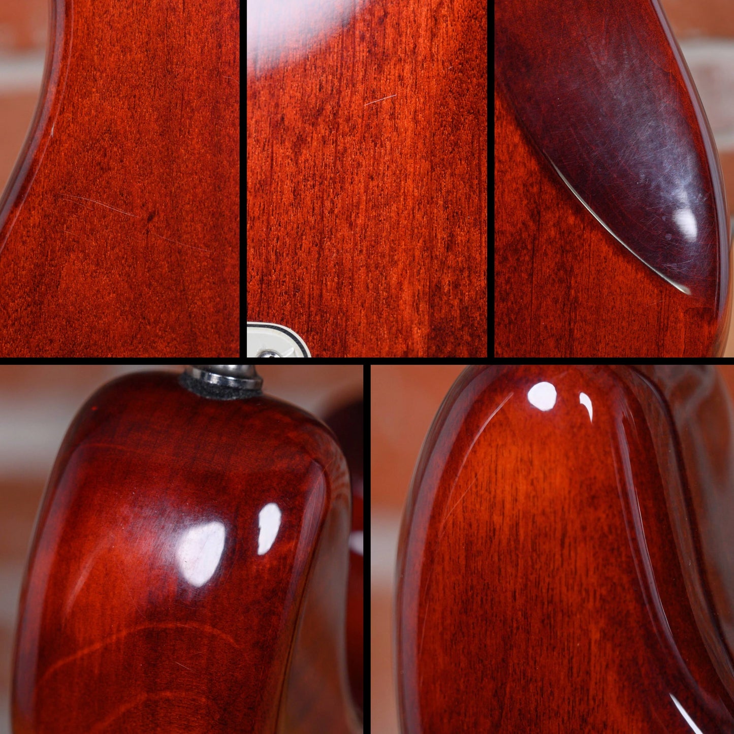 This guitar is in overall excellent condition. The back of the neck has some light circular surface marks on the headstock down to the neck joint. There are a couple of light dings as well. There are areas of the finish on the body that have a cloudy appearance. The body also has some light surface marks and signs of play around the pickguard/bridge. There is a small finish split in the neck joint. (See Pics)
