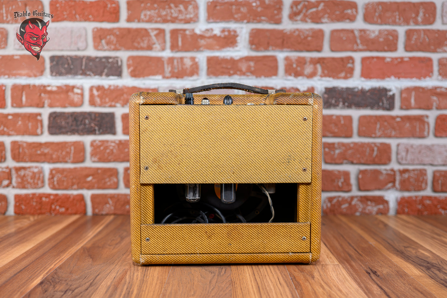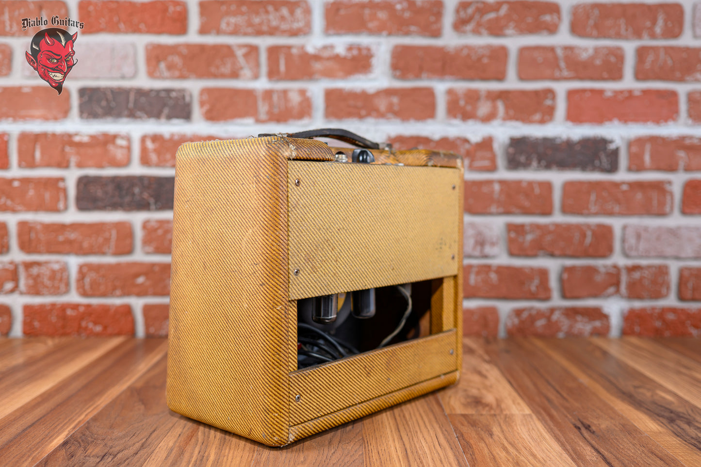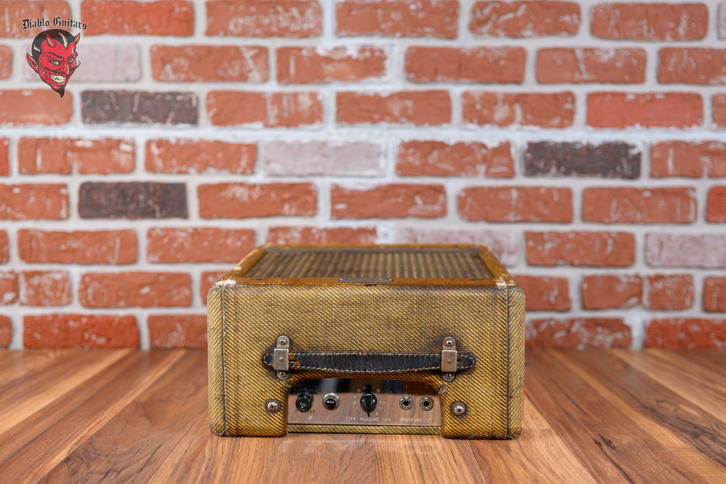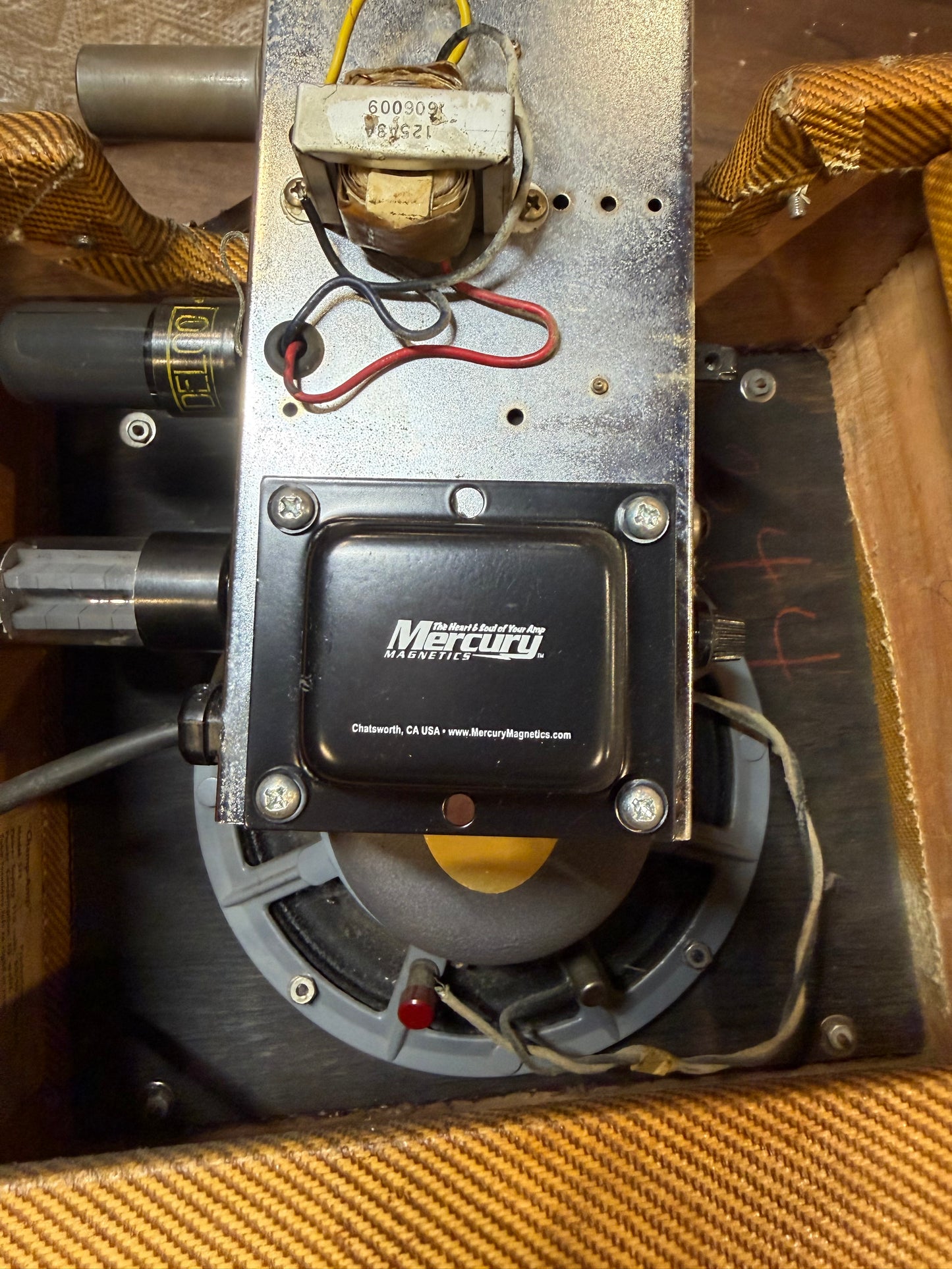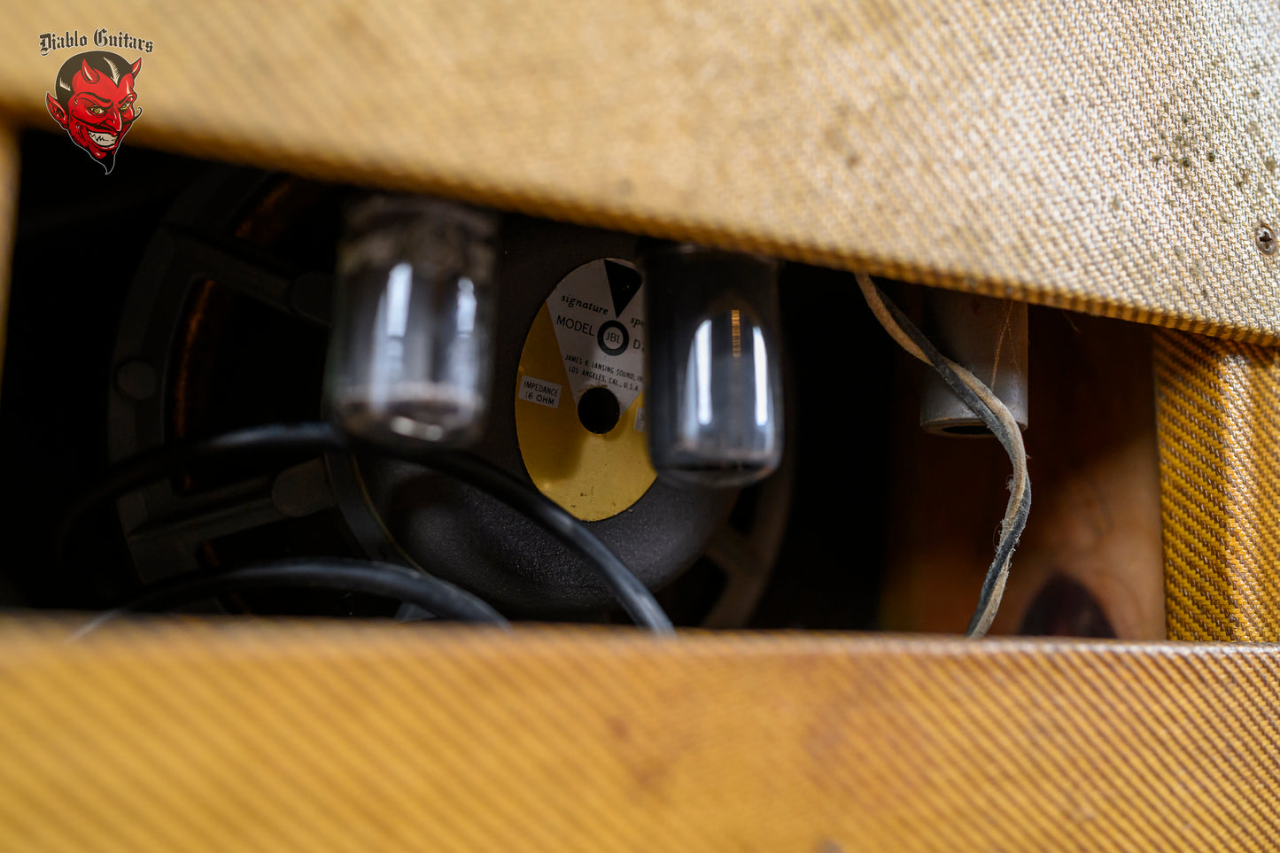 This 1960 example is in good vintage condition with visible stains and tears in the tweed exterior, while the aluminum control panel remains in notably clean shape. It has been recapped for reliability, fitted with a Mercury Magnetics power transformer, and currently runs through a JBL D216 speaker.