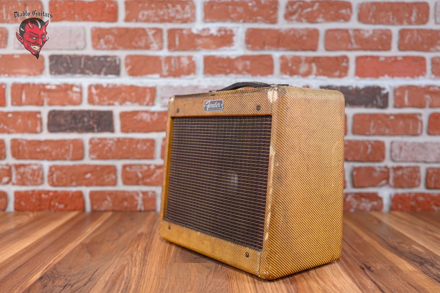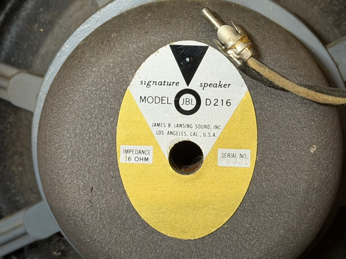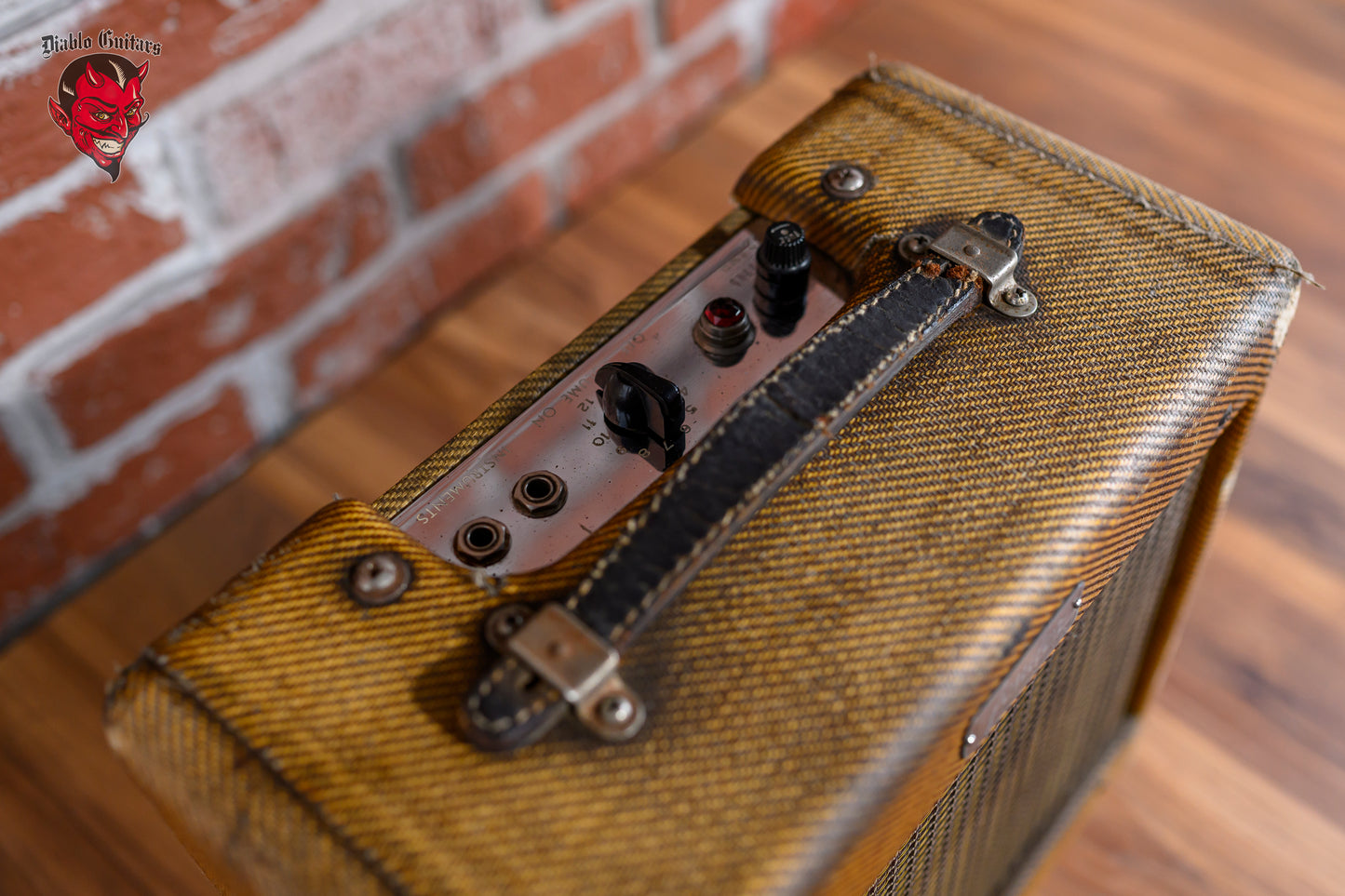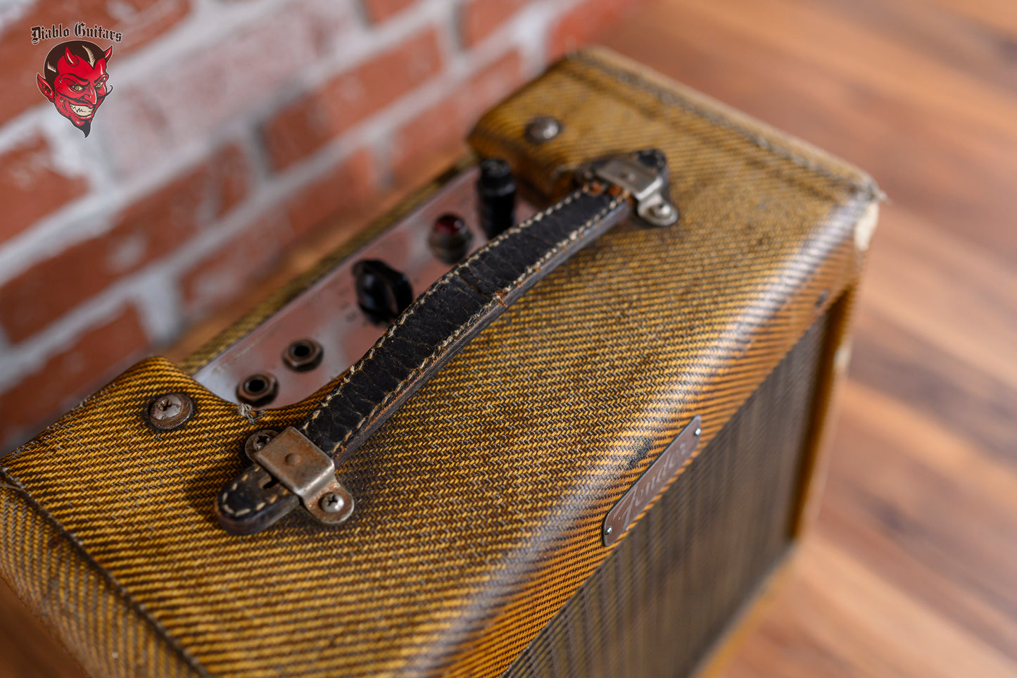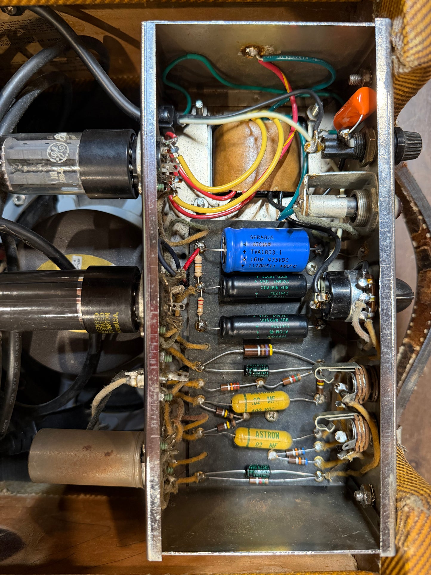 This 1960 example is in good vintage condition with visible stains and tears in the tweed exterior, while the aluminum control panel remains in notably clean shape. It has been recapped for reliability, fitted with a Mercury Magnetics power transformer, and currently runs through a JBL D216 speaker.