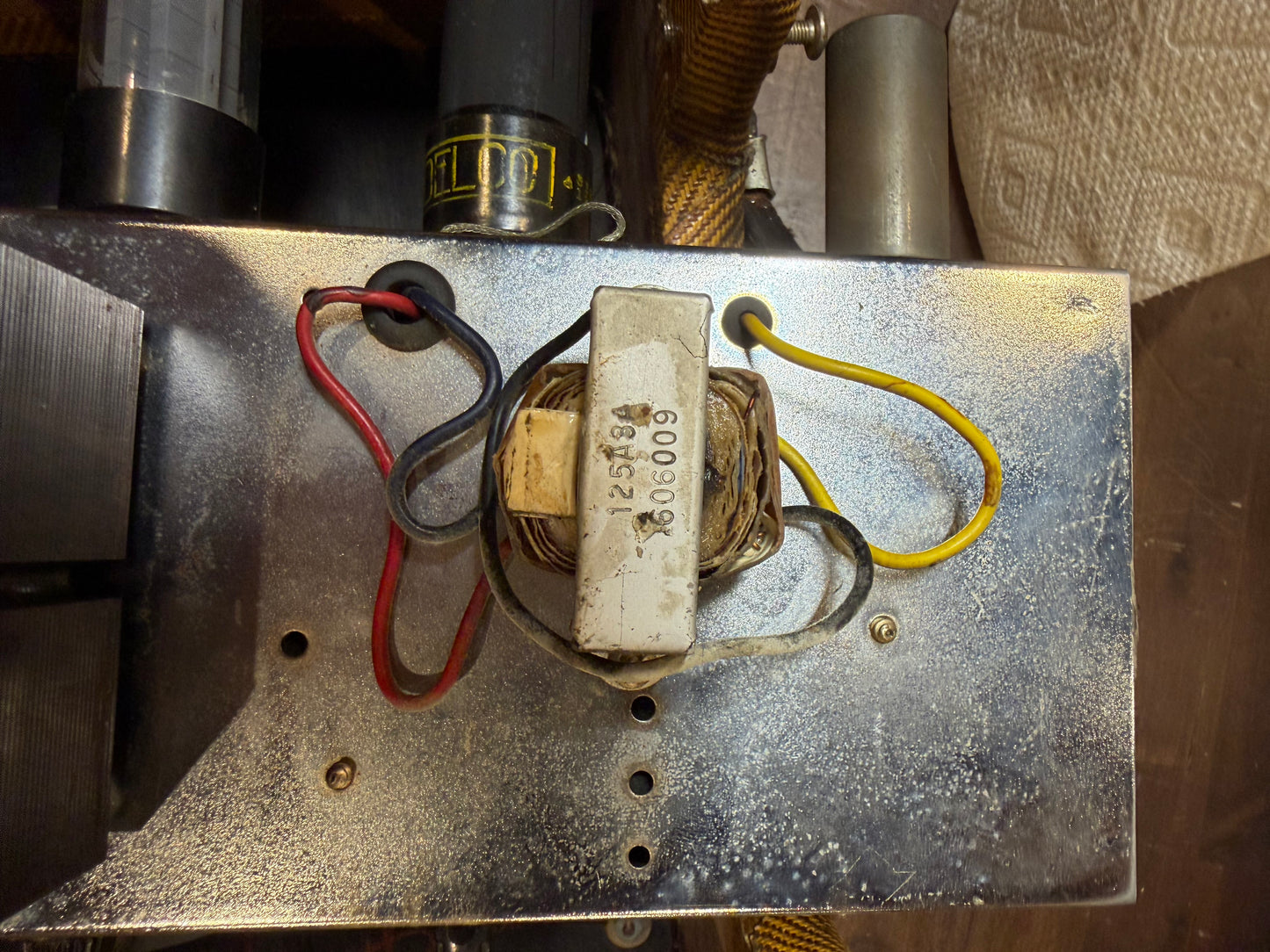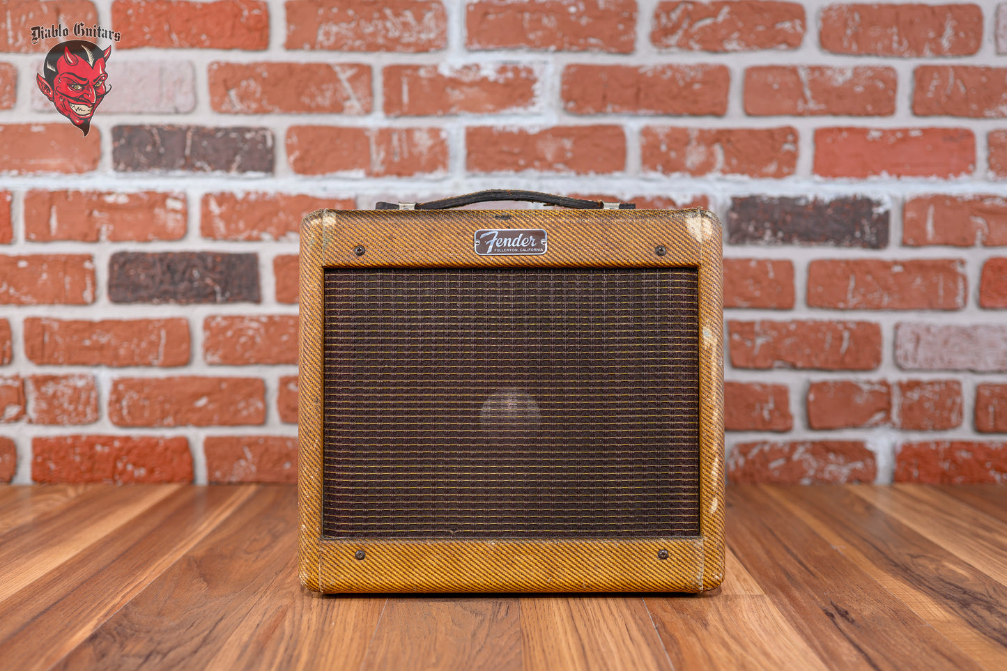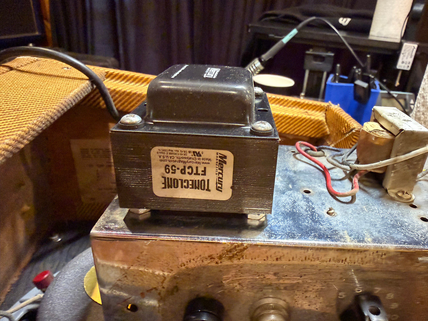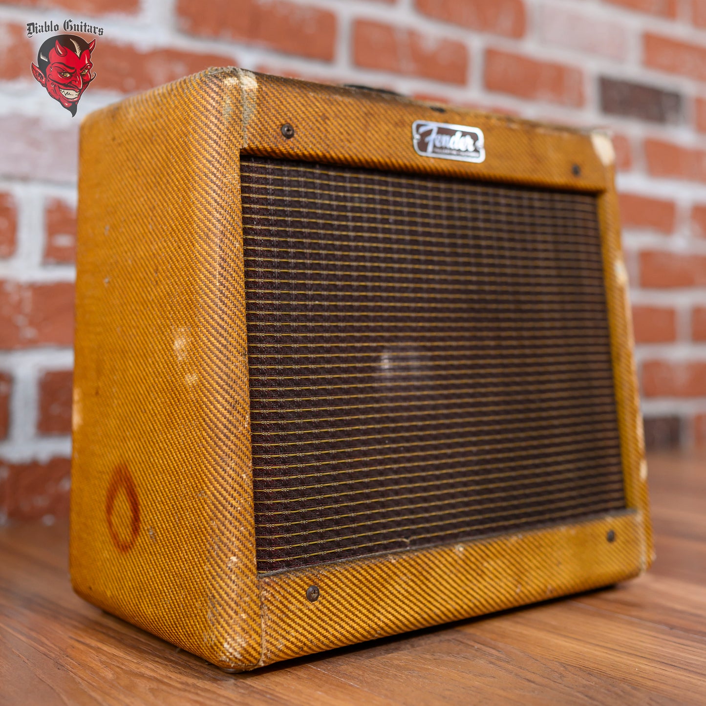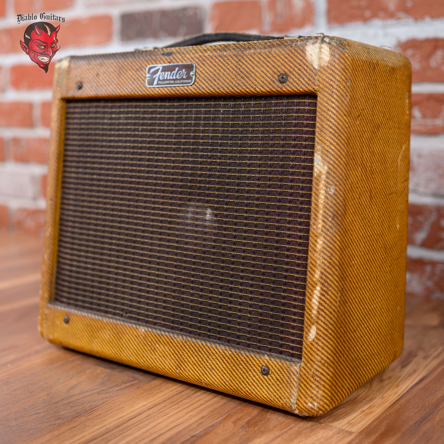 This 1960 example is in good vintage condition with visible stains and tears in the tweed exterior, while the aluminum control panel remains in notably clean shape. It has been recapped for reliability, fitted with a Mercury Magnetics power transformer, and currently runs through a JBL D216 speaker.