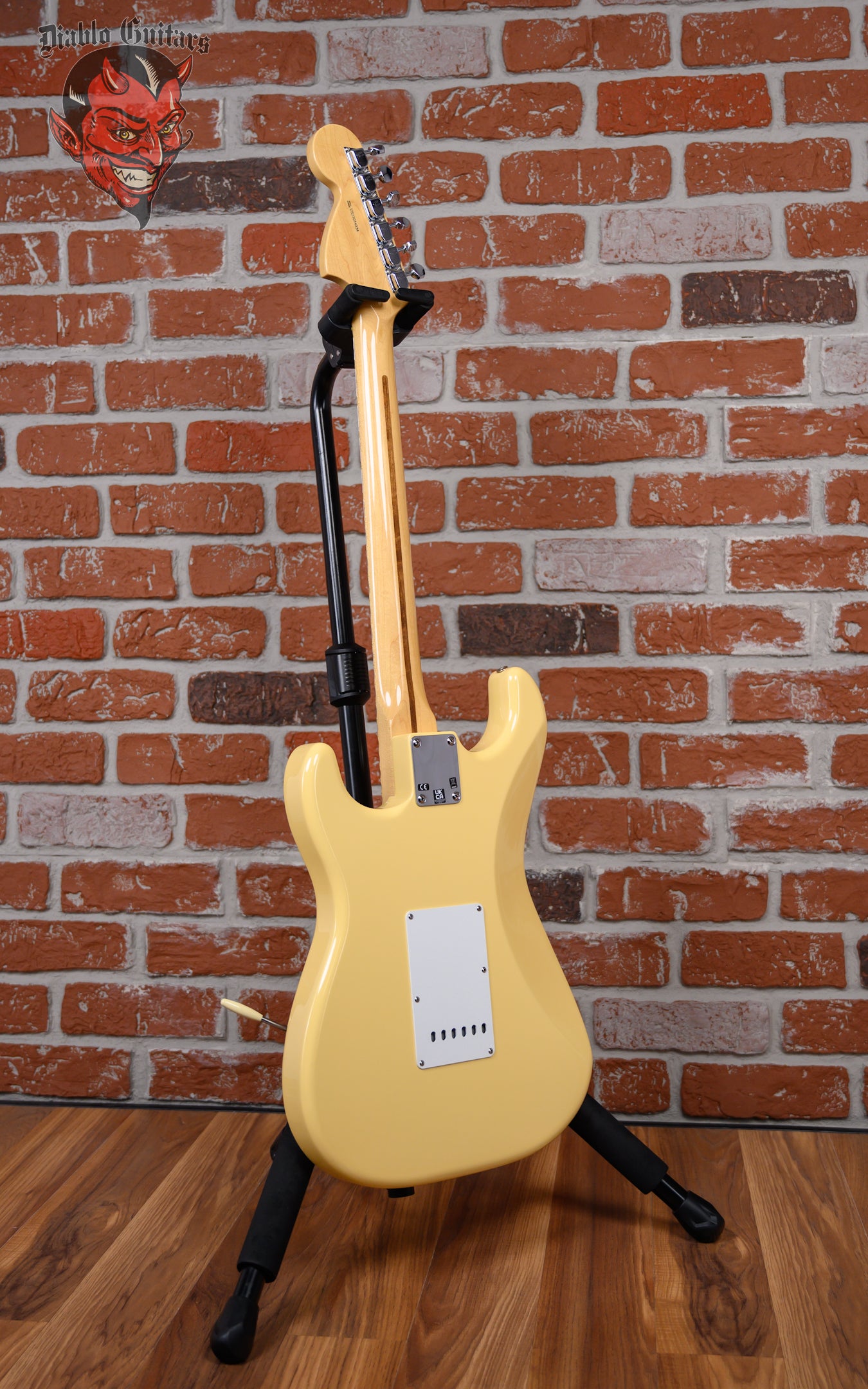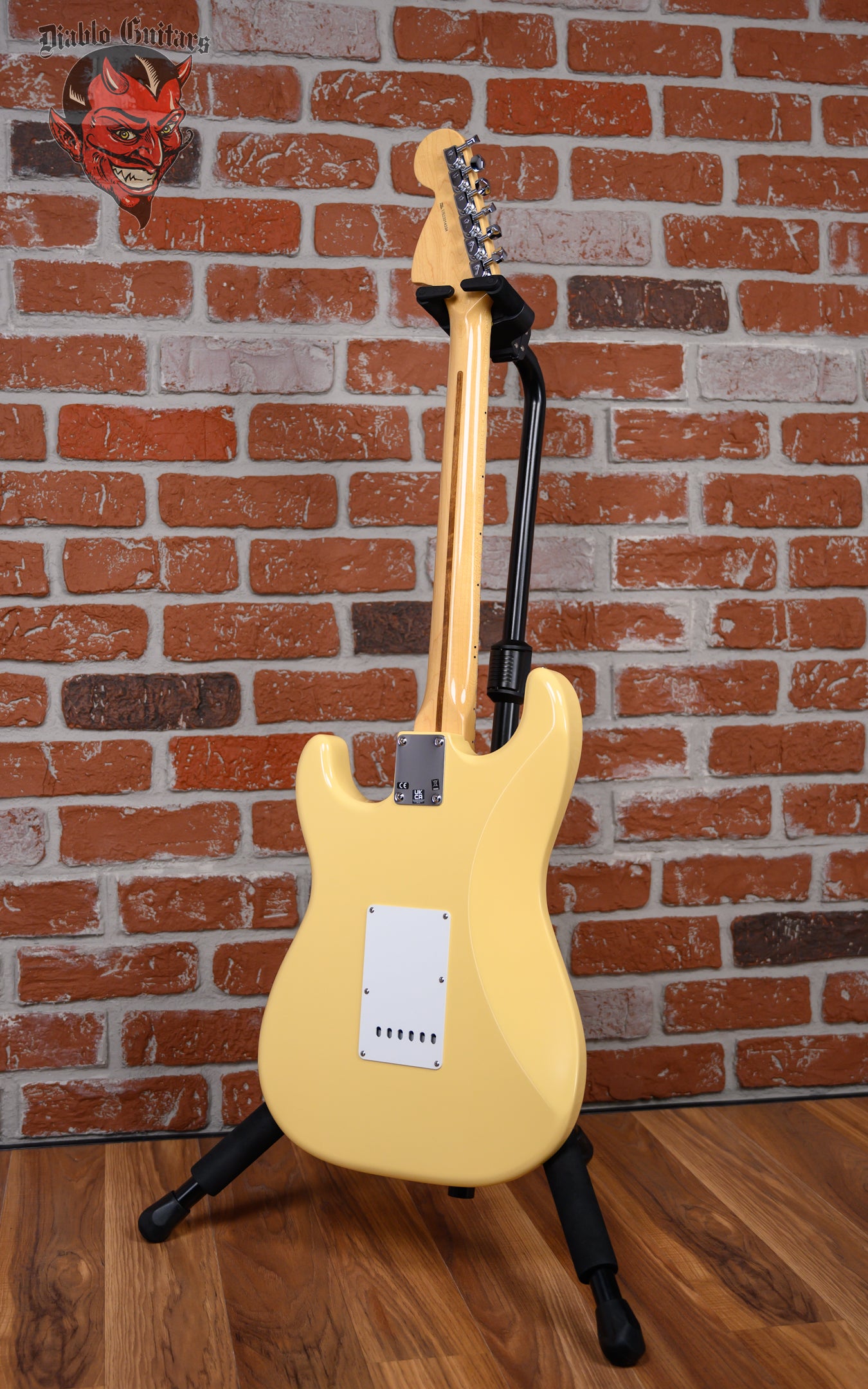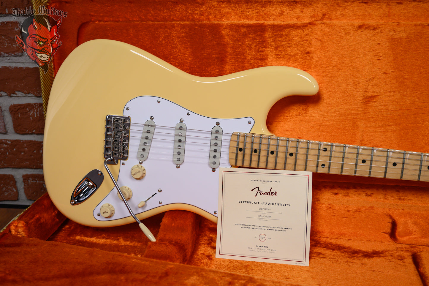 Fender Yngwie Malmsteen Stratocaster in Vintage White finish made in 2023 with Original Hard Shell Case. This guitar features a solid alder body, maple neck and scalloped maple fingerboard with large 70s headstock. Equipped with a Seymour Duncan YJM fury™ strat® STK-S10N in the neck / middle position and a Seymour Duncan YJM fury™ strat® STK-S10B in the bridge position. Controlled by 1 volume, 2 tone pots and a 3-Way blade switch. The 25.5" scale length neck has white dot inlays and white side markers with 21 super jumbo frets on a scalloped 9.5" radius with a modern "C" profile. The hardware is comprised of chrome Fender vintage "F" stamped tuning machines with contemporary cloche heads, a brass nut, a Fender 6-Saddle american vintage synchronized tremolo bridge and aged white top hat knobs with a 3-Ply white pickguard.