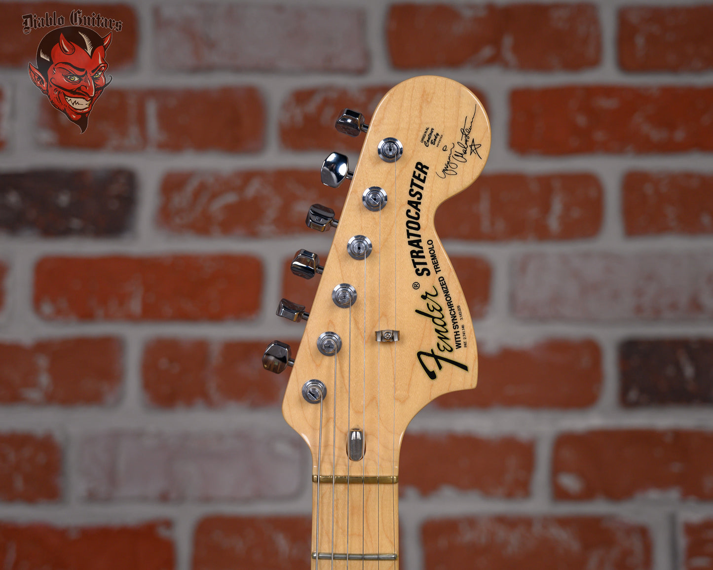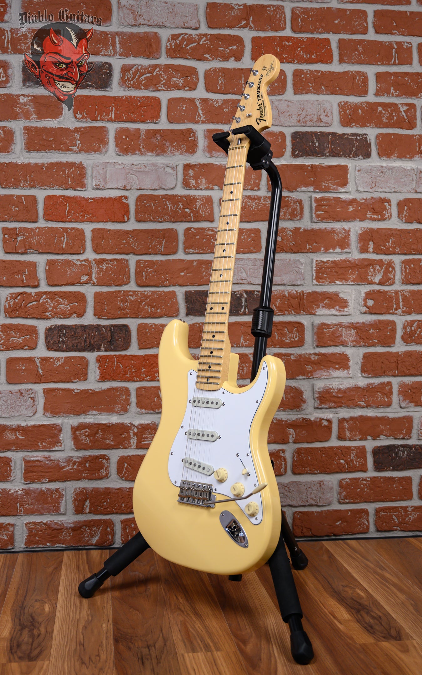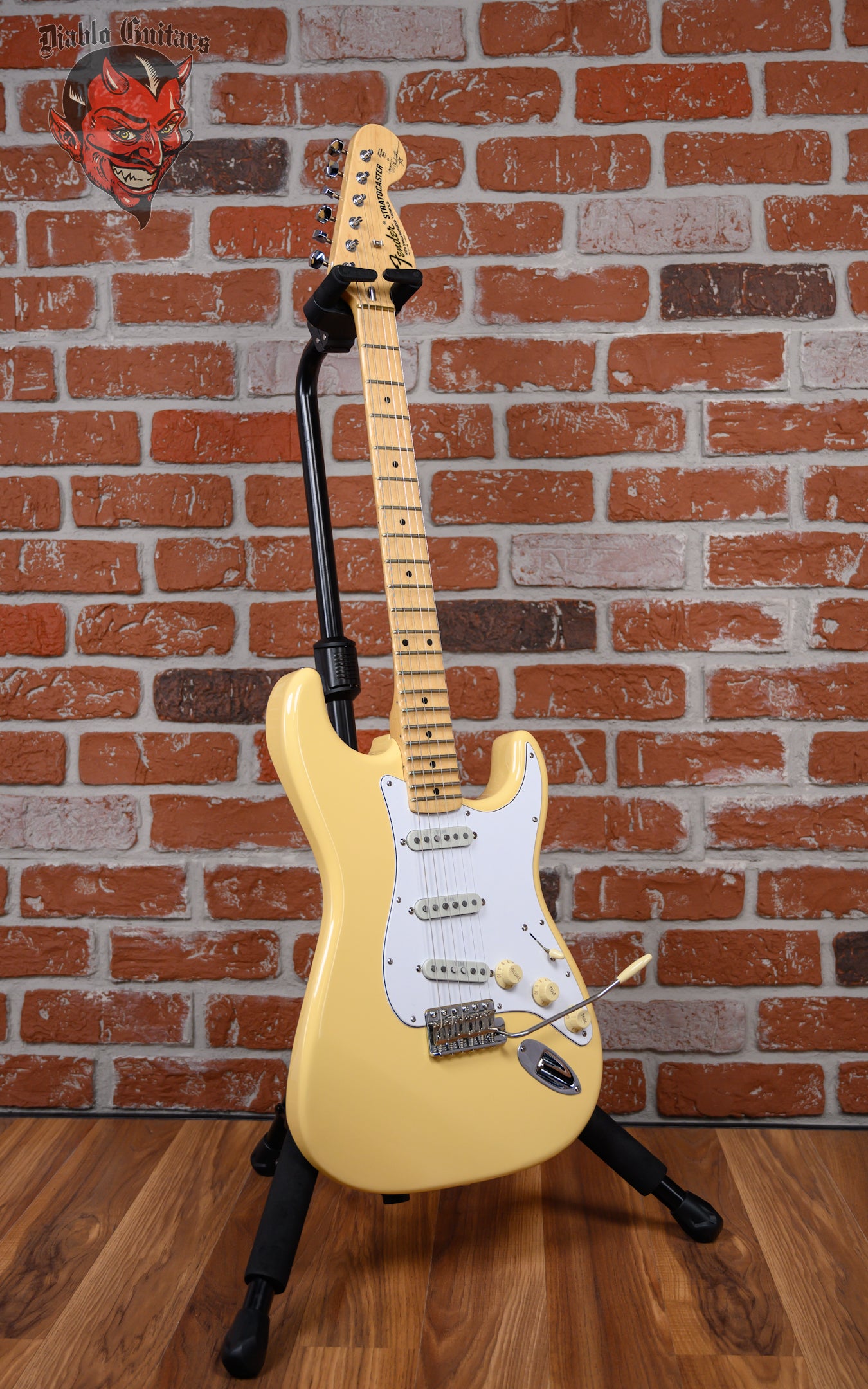 Fender Yngwie Malmsteen Stratocaster in Vintage White finish made in 2023 with Original Hard Shell Case. This guitar features a solid alder body, maple neck and scalloped maple fingerboard with large 70s headstock. Equipped with a Seymour Duncan YJM fury™ strat® STK-S10N in the neck / middle position and a Seymour Duncan YJM fury™ strat® STK-S10B in the bridge position. Controlled by 1 volume, 2 tone pots and a 3-Way blade switch. The 25.5" scale length neck has white dot inlays and white side markers with 21 super jumbo frets on a scalloped 9.5" radius with a modern "C" profile. The hardware is comprised of chrome Fender vintage "F" stamped tuning machines with contemporary cloche heads, a brass nut, a Fender 6-Saddle american vintage synchronized tremolo bridge and aged white top hat knobs with a 3-Ply white pickguard.