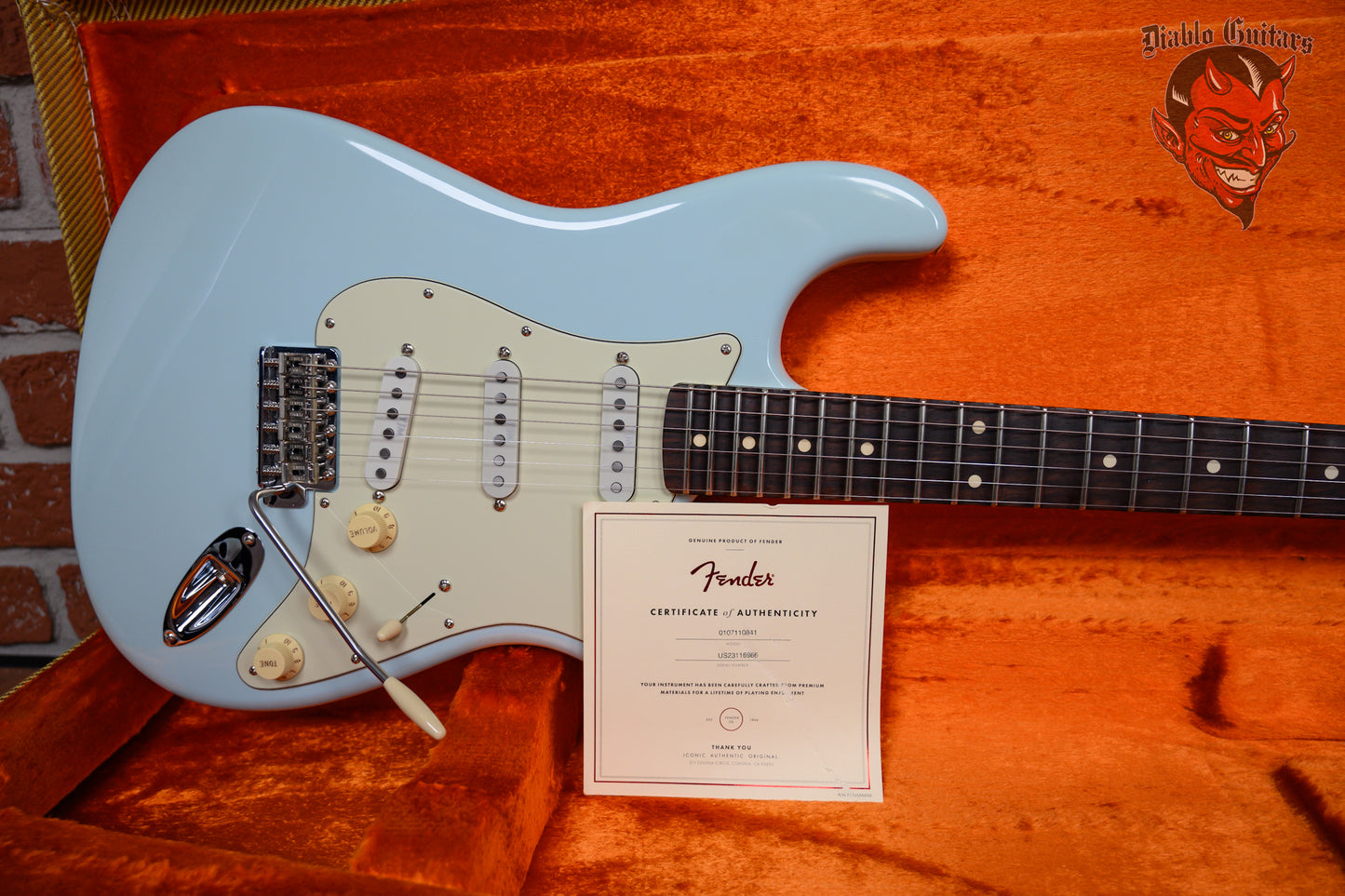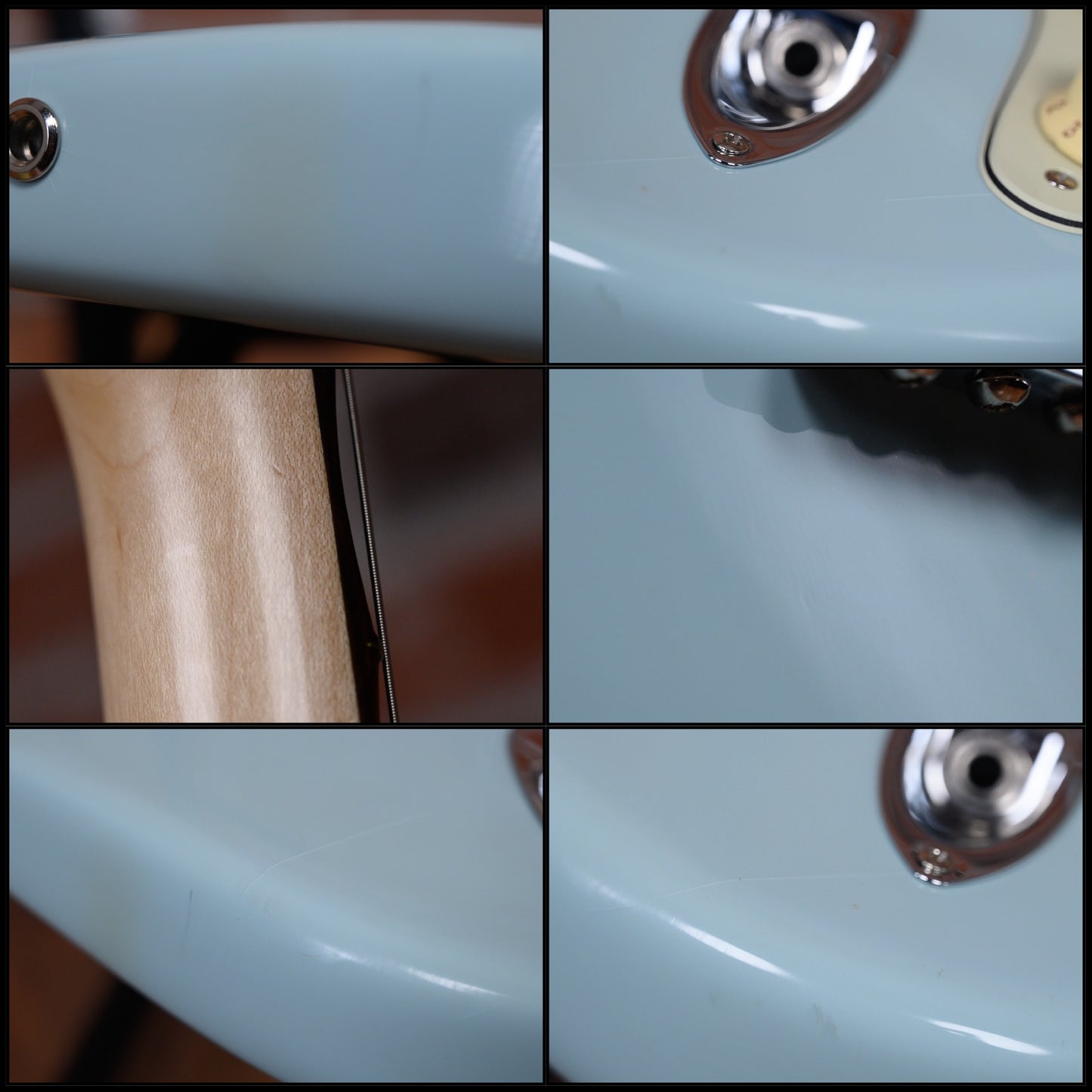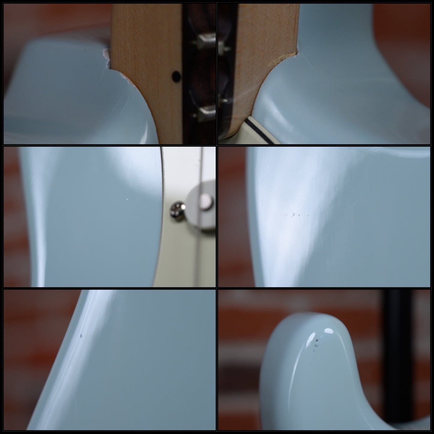 This guitar is in overall excellent condition. This was refinished sonic blue. the finish has a few hairline splits on the body and some light chipping at he neck pocket edges. It has a few light marks and some light discoloration on the body's lower edge. (See Pics)
