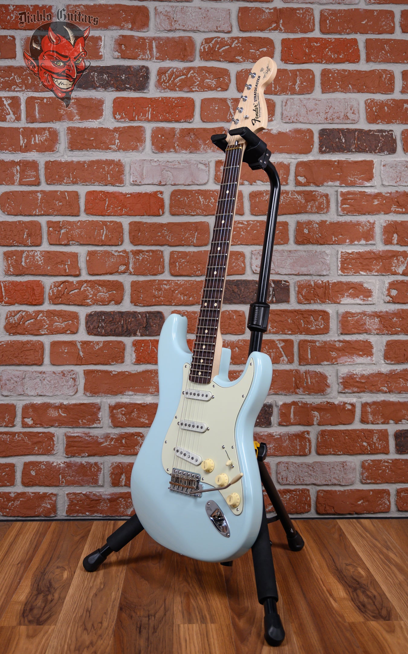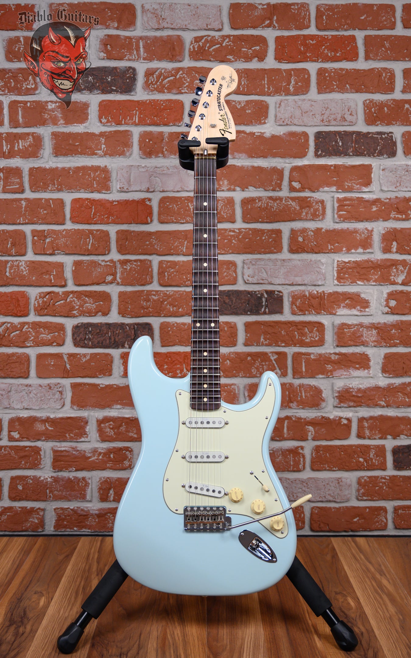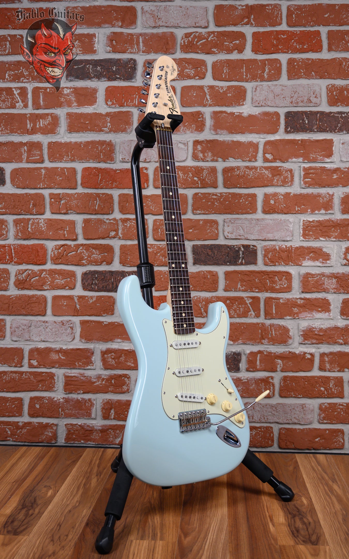 Fender Yngwie Malmsteen Stratocaster in Sonic Blue finish made in 2024 with Original Hard Shell Case (Refin). This guitar features a solid alder body, maple neck and scalloped rosewood fingerboard with a large 70's headstock. Equipped with a Seymour Duncan YJM fury™ strat® STK-S10N in the neck position, a Seymour Duncan YJM fury™ strat® STK-S10N in the middle position, and a Seymour Duncan YJM fury™ strat® STK-S10B in the bridge position. Controlled by 1 volume, 2 tone pots and a 3-Way blade switch. The 25.5" scale length neck has white dot inlays and white side markers with 21 super jumbo frets on a 9.5" radius with a modern "C" profile. The hardware is comprised of chrome Fender vintage "F" stamped tuning machines with contemporary cloche heads, a brass nut, a Fender 6-Saddle american vintage synchronized tremolo and aged white top hat knobs with a 3 ply mint on black pickguard.