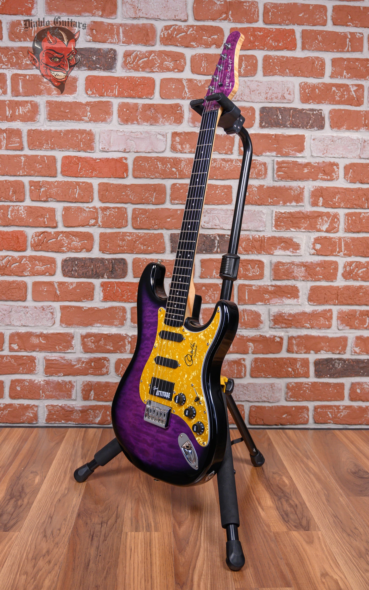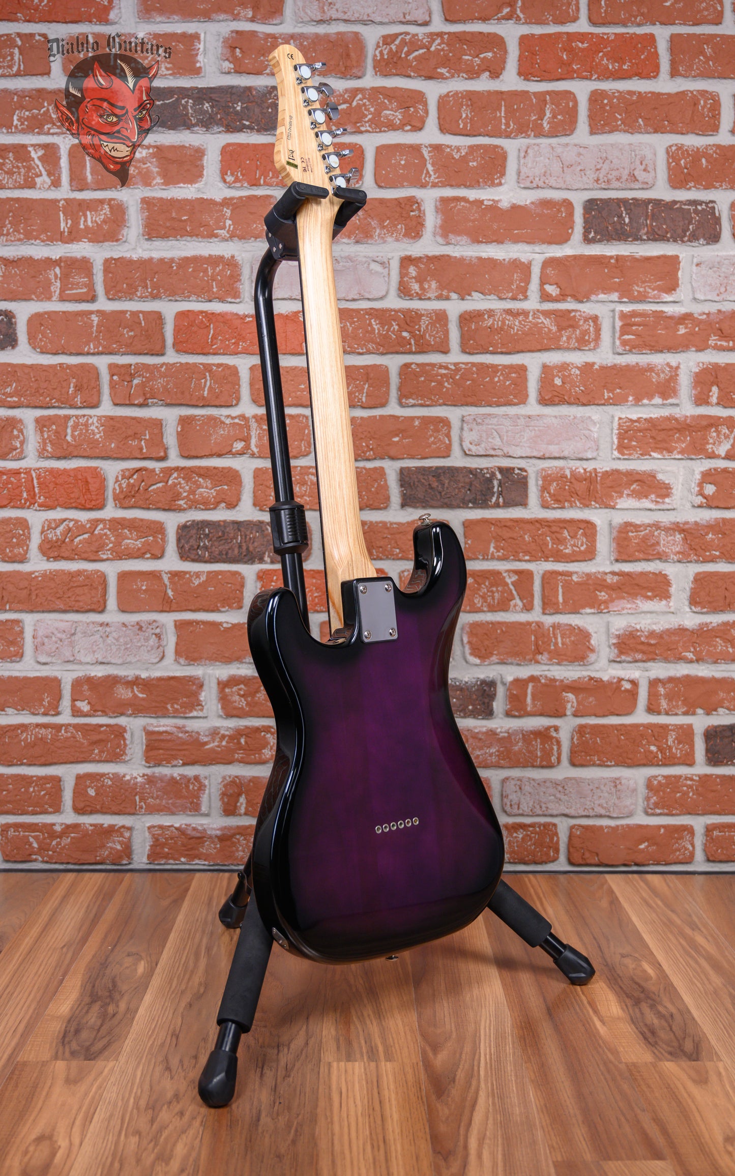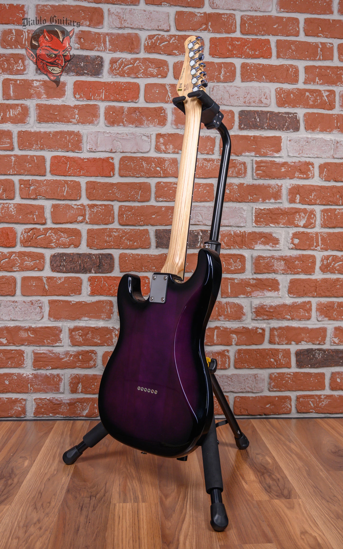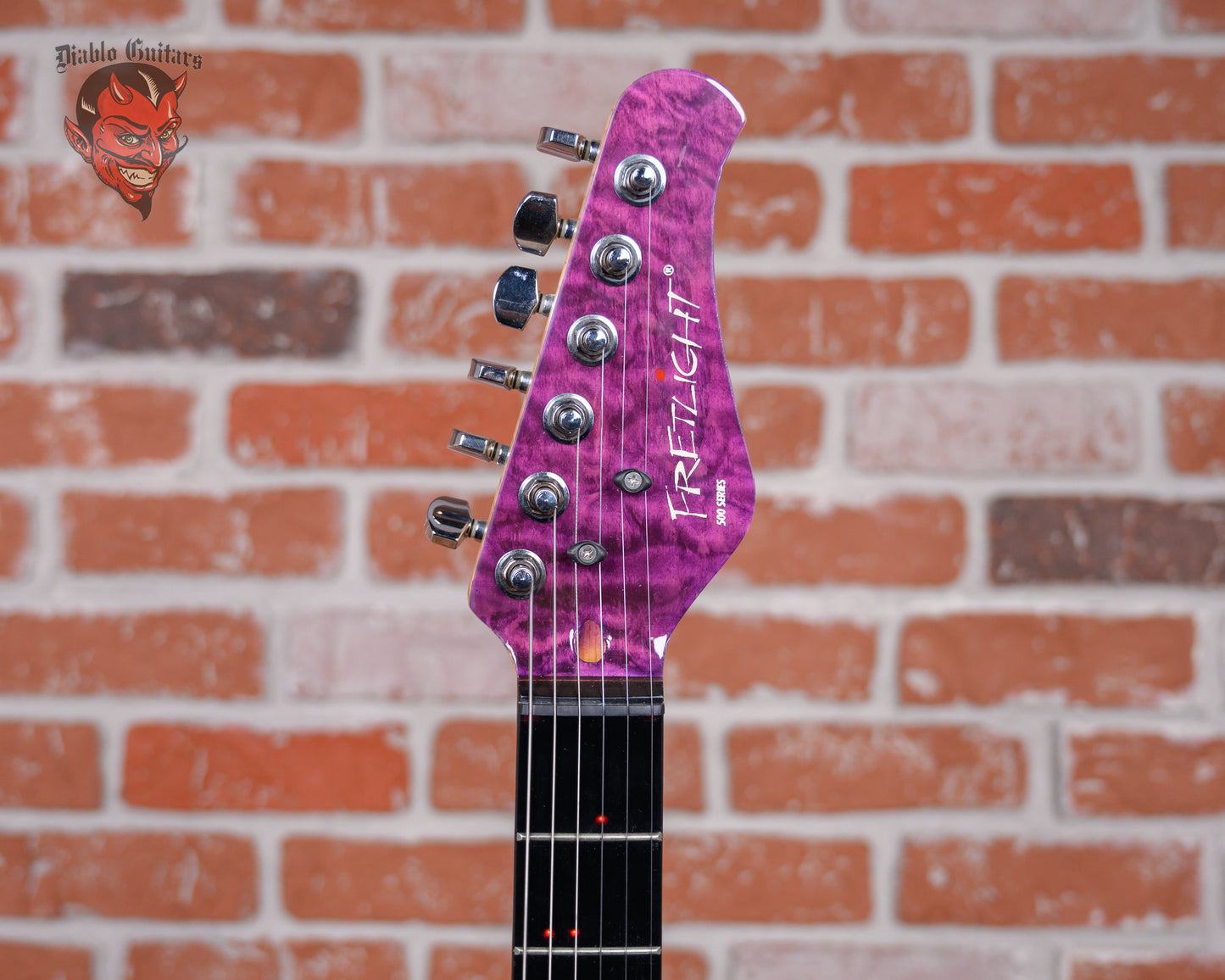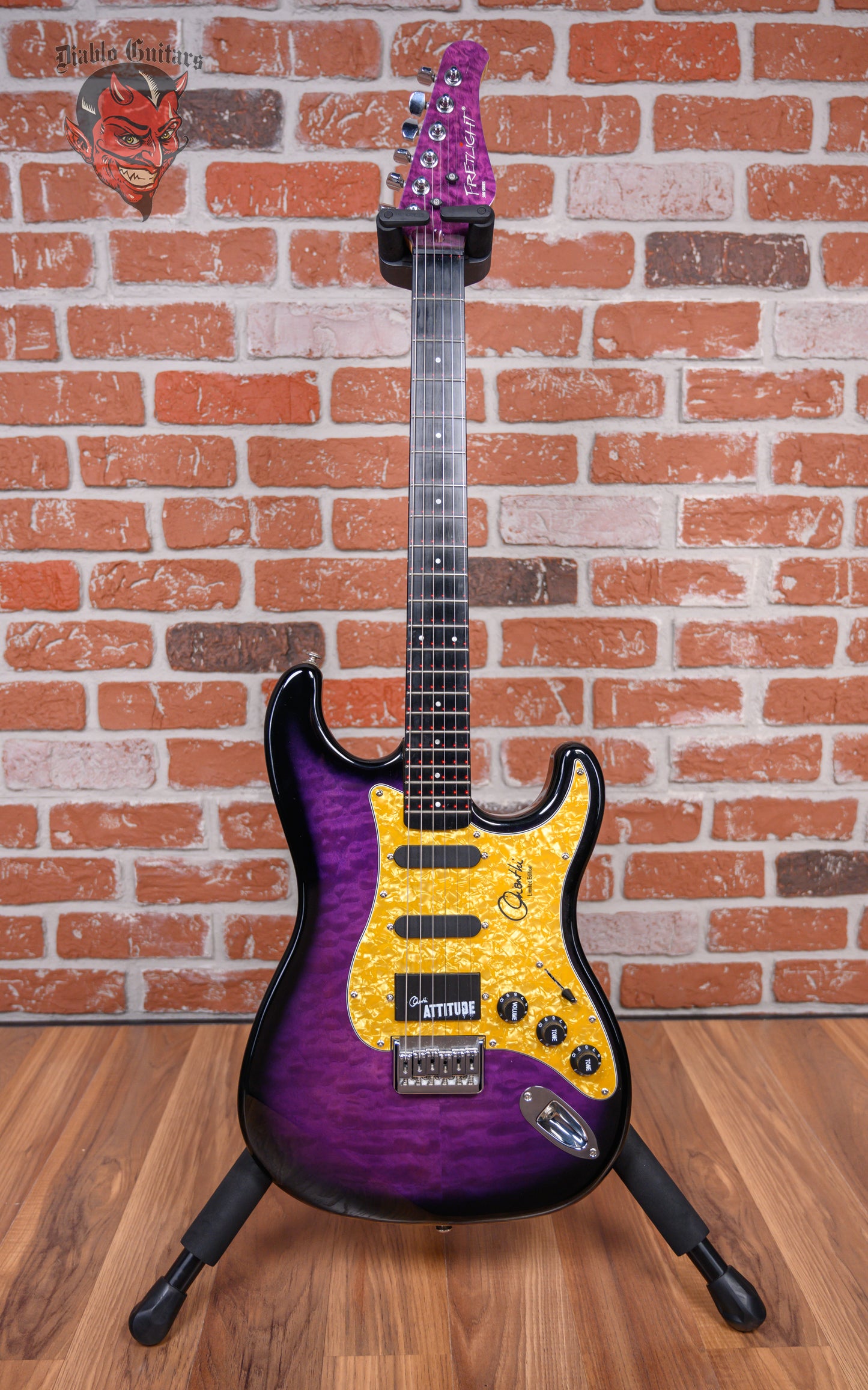 Fretlight FG-551 Ltd. Edition Orianthi Signature in transparent purple finish made in 2015 with gigbag. This guitar features a solid alder body with a quilted maple top, Stratabond neck, an Advanced Polymer fingerboard with red LEDs and a color matched headstock. Equipped with a set of Orianthi Attitude single coils in the neck and middle positions and an Orianthi Attitude humbucker in the bridge position. Controlled by 1 volume pot, 2 tone pots and a 5-Way blade switch. The 25.5" scale length neck has white dot inlays and white side markers with 21 medium jumbo frets on a 12" radius with a rounded profile. The hardware is comprised of chrome sealed die-cast tuning machines with cloche heads, a synthetic nut, a 6-saddle adjustable bridge and black top hat knobs with a gold pearloid pickguard.