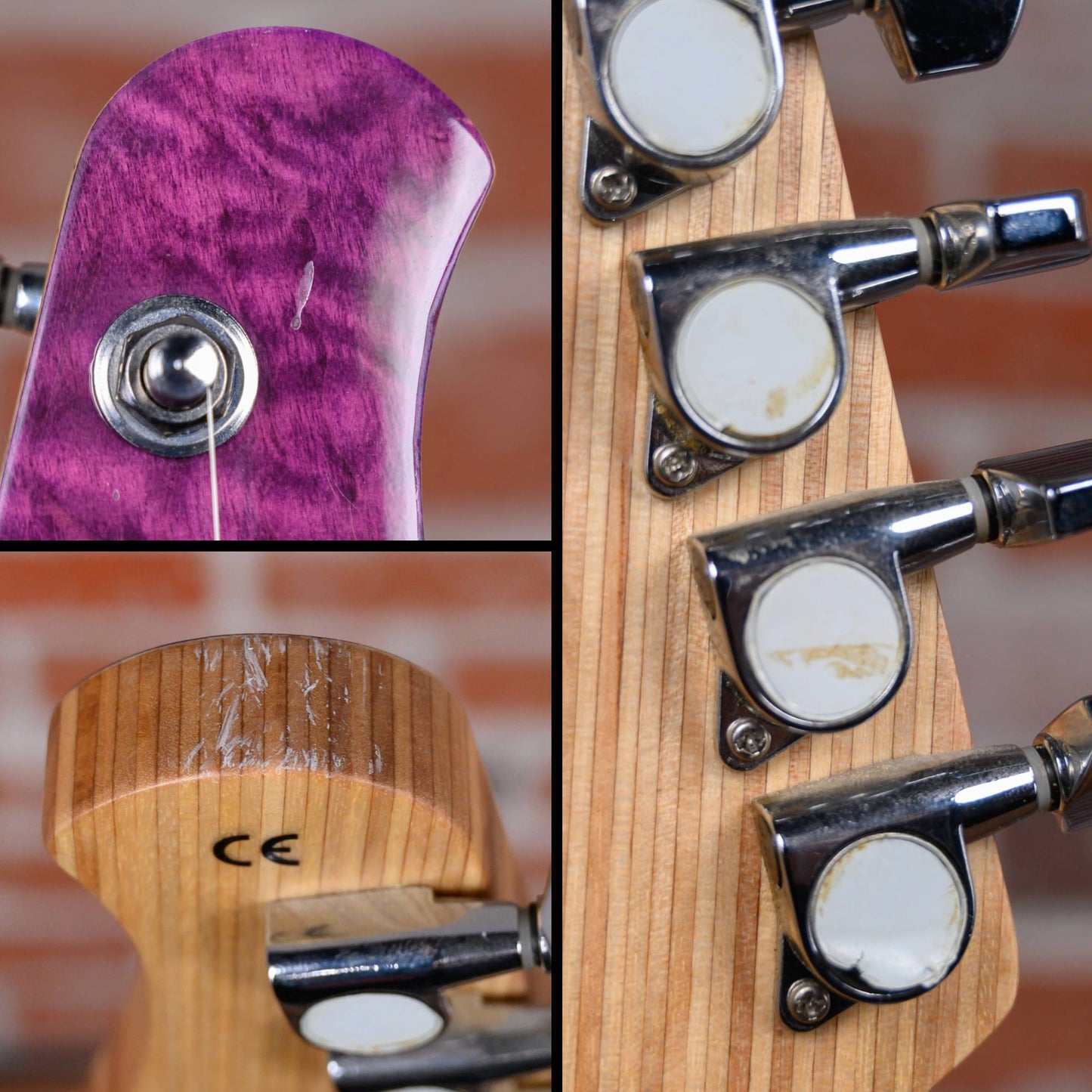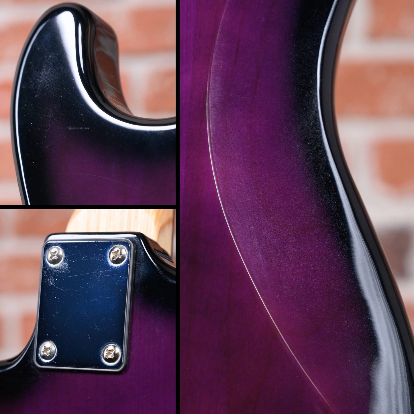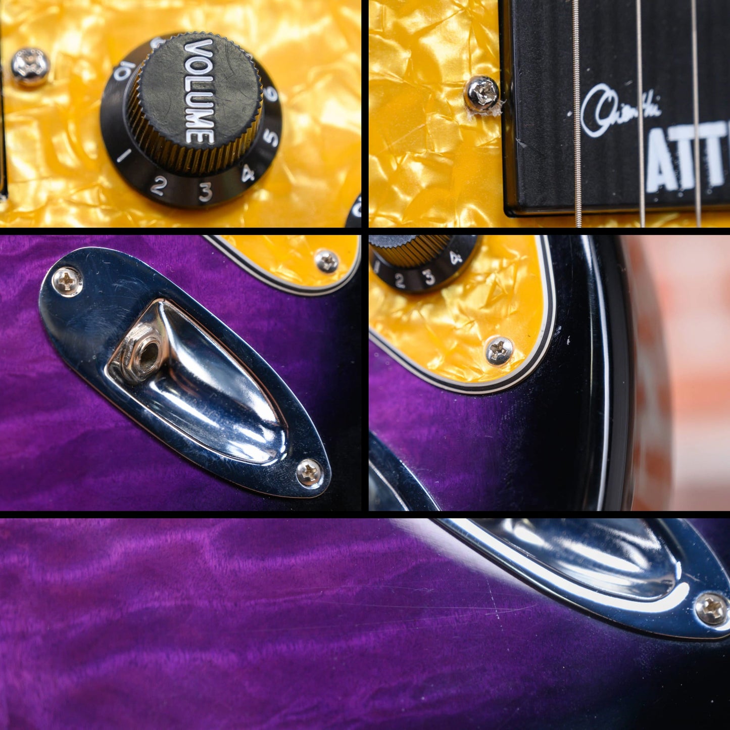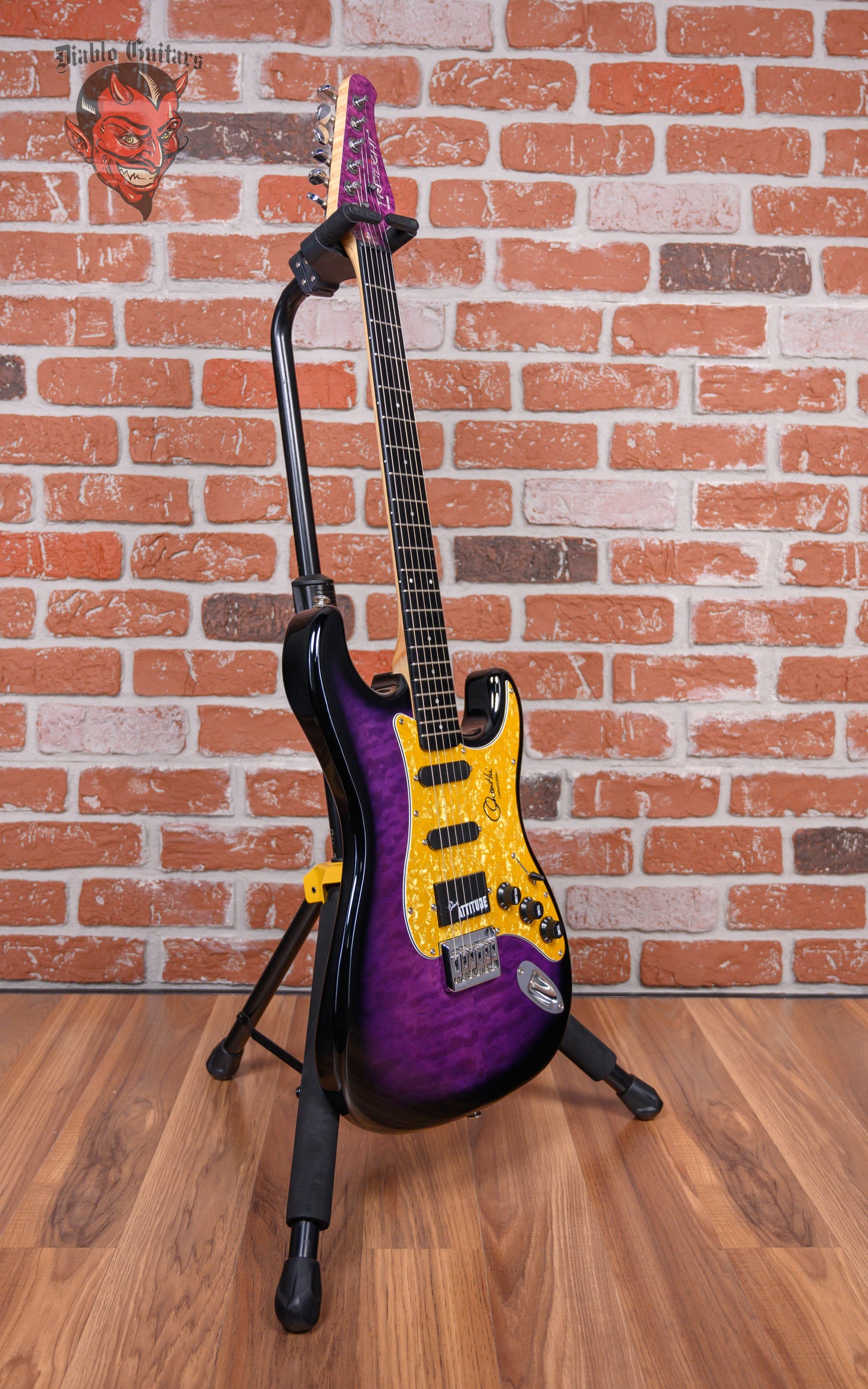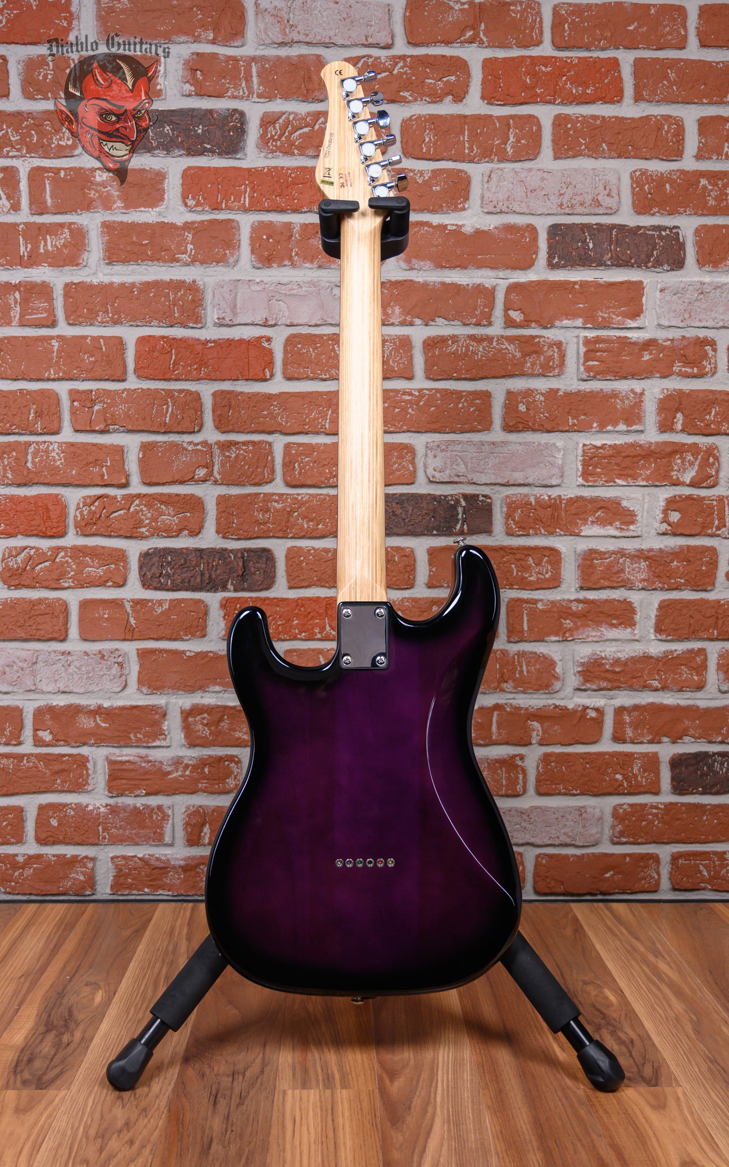 Fretlight FG-551 Ltd. Edition Orianthi Signature in transparent purple finish made in 2015 with gigbag. This guitar features a solid alder body with a quilted maple top, Stratabond neck, an Advanced Polymer fingerboard with red LEDs and a color matched headstock. Equipped with a set of Orianthi Attitude single coils in the neck and middle positions and an Orianthi Attitude humbucker in the bridge position. Controlled by 1 volume pot, 2 tone pots and a 5-Way blade switch. The 25.5" scale length neck has white dot inlays and white side markers with 21 medium jumbo frets on a 12" radius with a rounded profile. The hardware is comprised of chrome sealed die-cast tuning machines with cloche heads, a synthetic nut, a 6-saddle adjustable bridge and black top hat knobs with a gold pearloid pickguard.