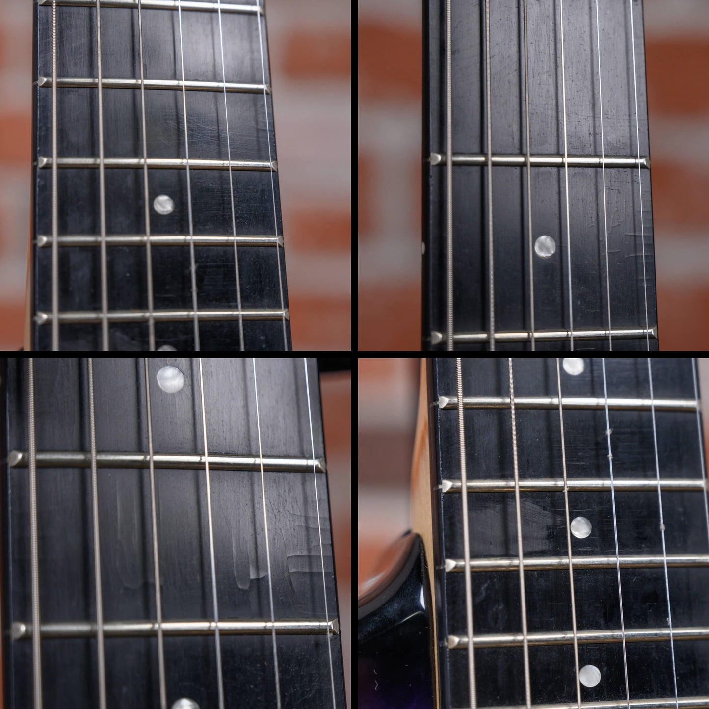 This guitar is in overall excellent condition. There are some white marks on the tip of the headstock and a small ding on the face. The tuners show signs of age. The fretboard has some light scratches and surface marks. The chrome hardware shows pitting and discoloration of the plating. There are light surface marks and some areas of lighter finish on the body. The gigbag is in overall good condition but the back straps are well worn. (See pics)