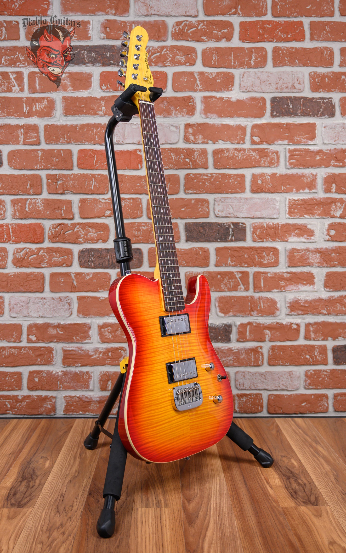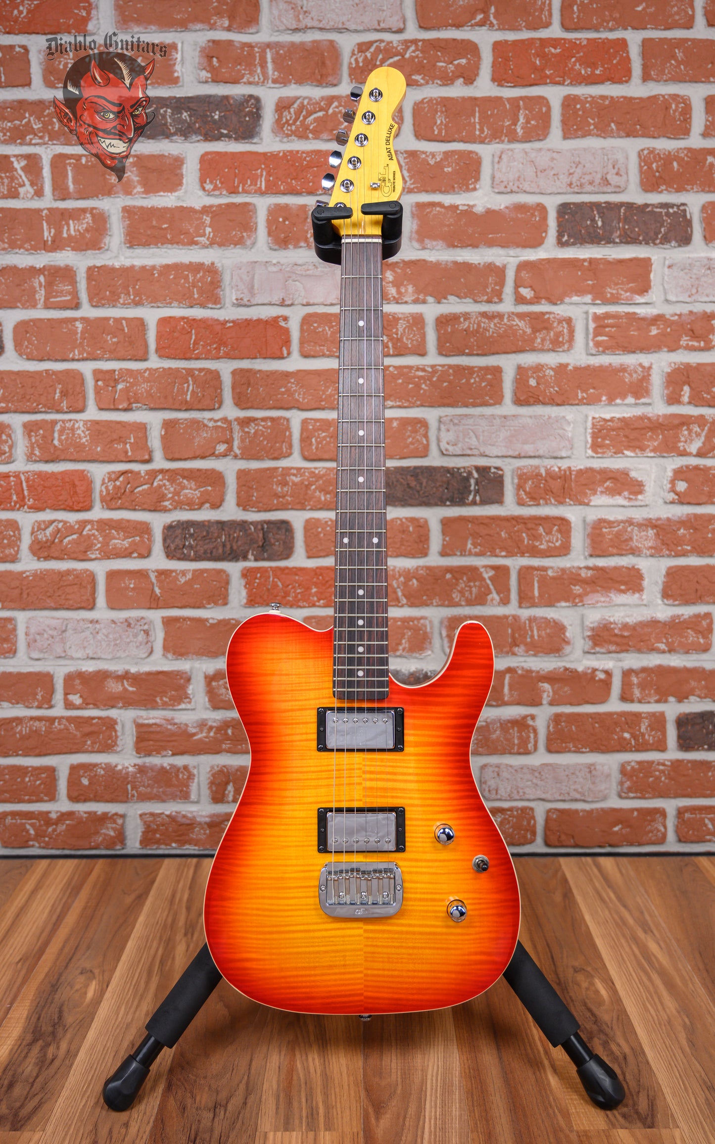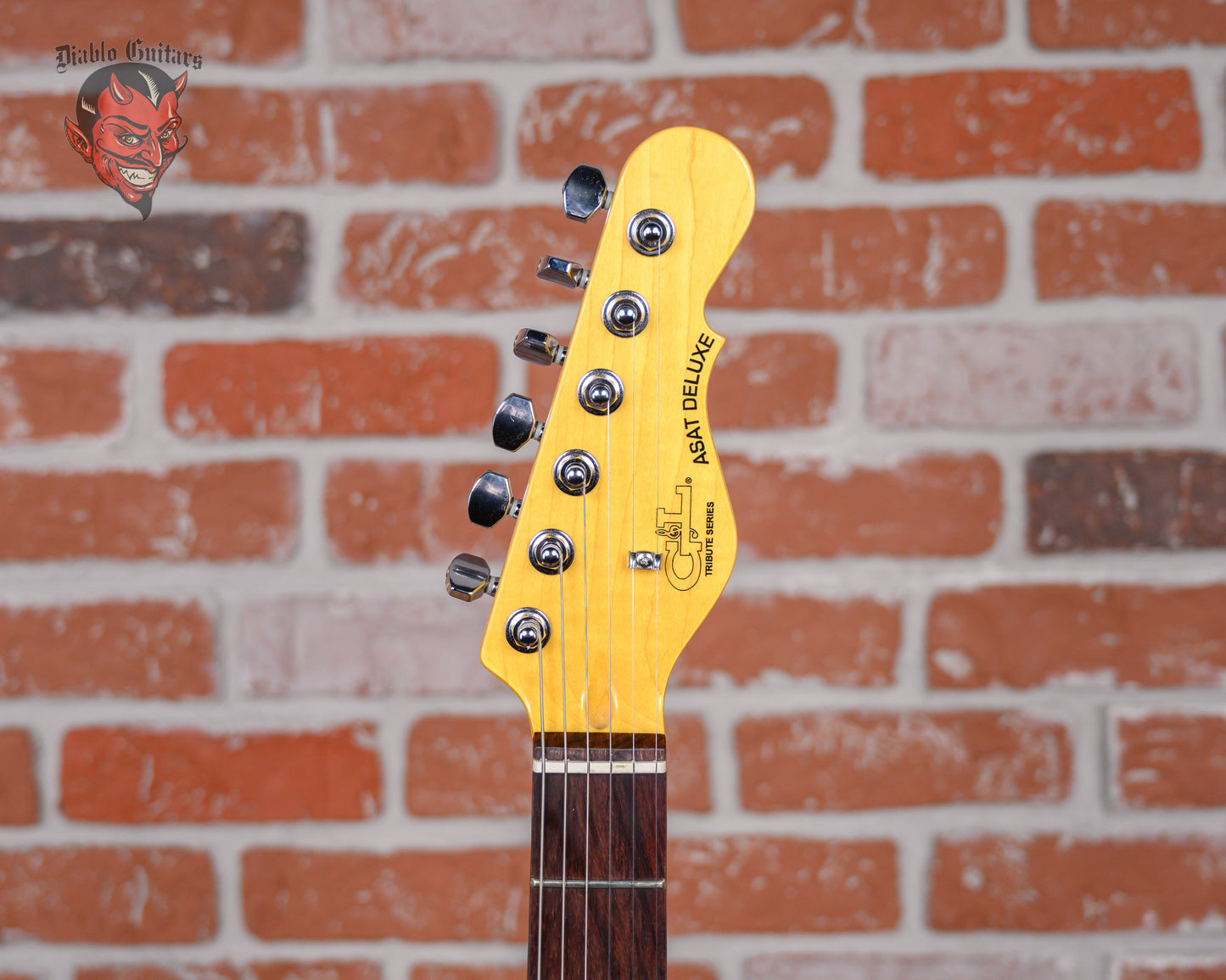 G&L Tribute ASAT Deluxe Carved Top in Cherry Sunburst finish made in 2014 with Gigbag. This guitar features a solid mahogany body with a bound flamed maple top, hard rock maple neck and rosewood fingerboard. Equipped with a G&L PTP6042 in the neck position and a G&L PTP6043 in the bridge position. Controlled by 1 volume pot, 1 tone pot with push/pull coil tap and a 3-Way toggle switch. The 25.5" scale length neck has white dot inlays and white side markers with 22 medium frets on a 12" radius with a Classic C profile. The hardware is comprised of chrome sealed die-cast tuning machines with cloche heads, a synthetic nut, a G&L Saddle Lock bridge and chrome knurled dome knobs.